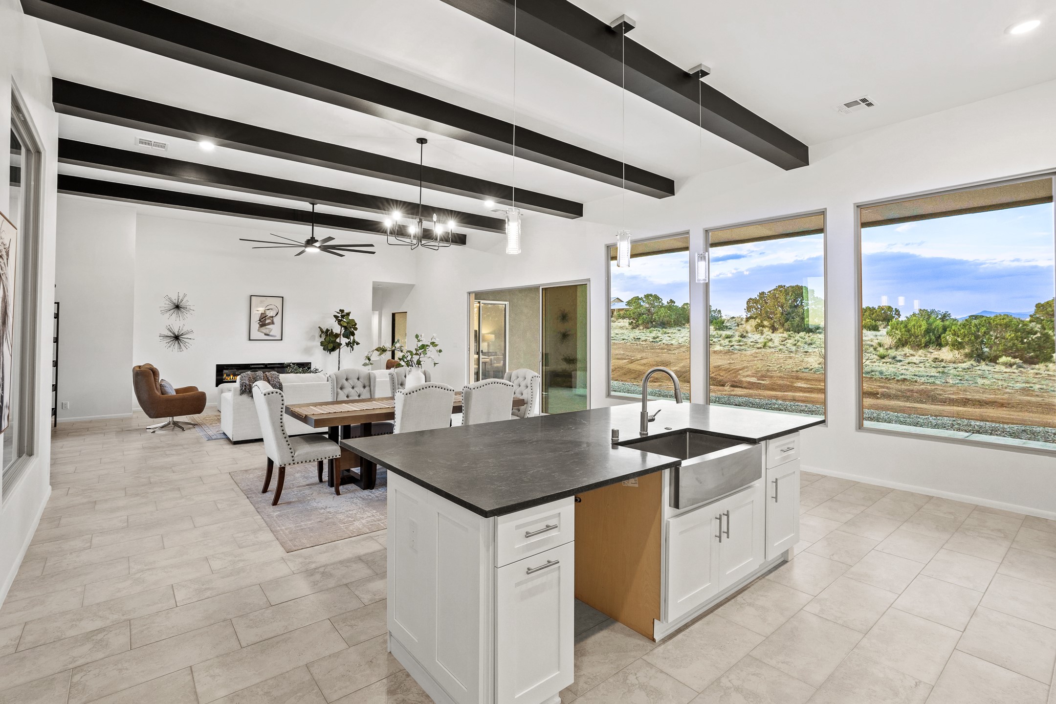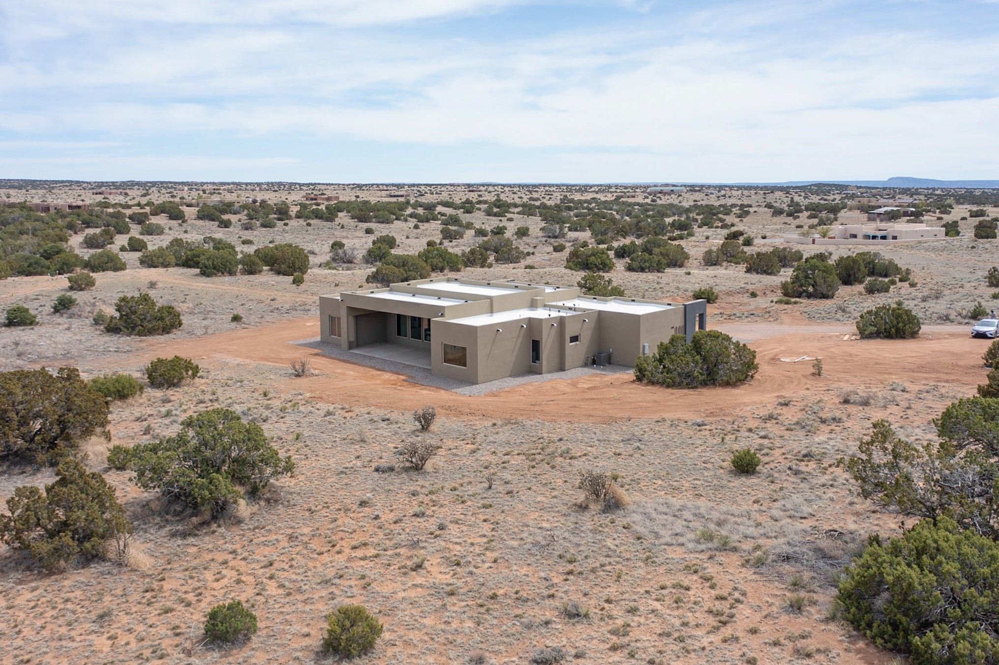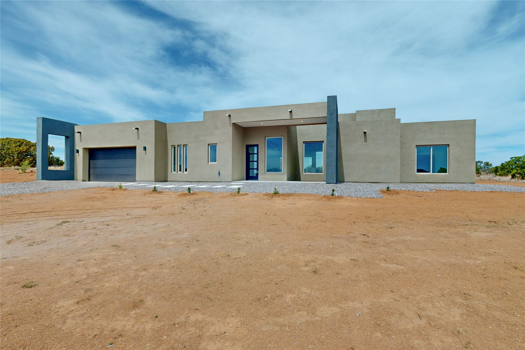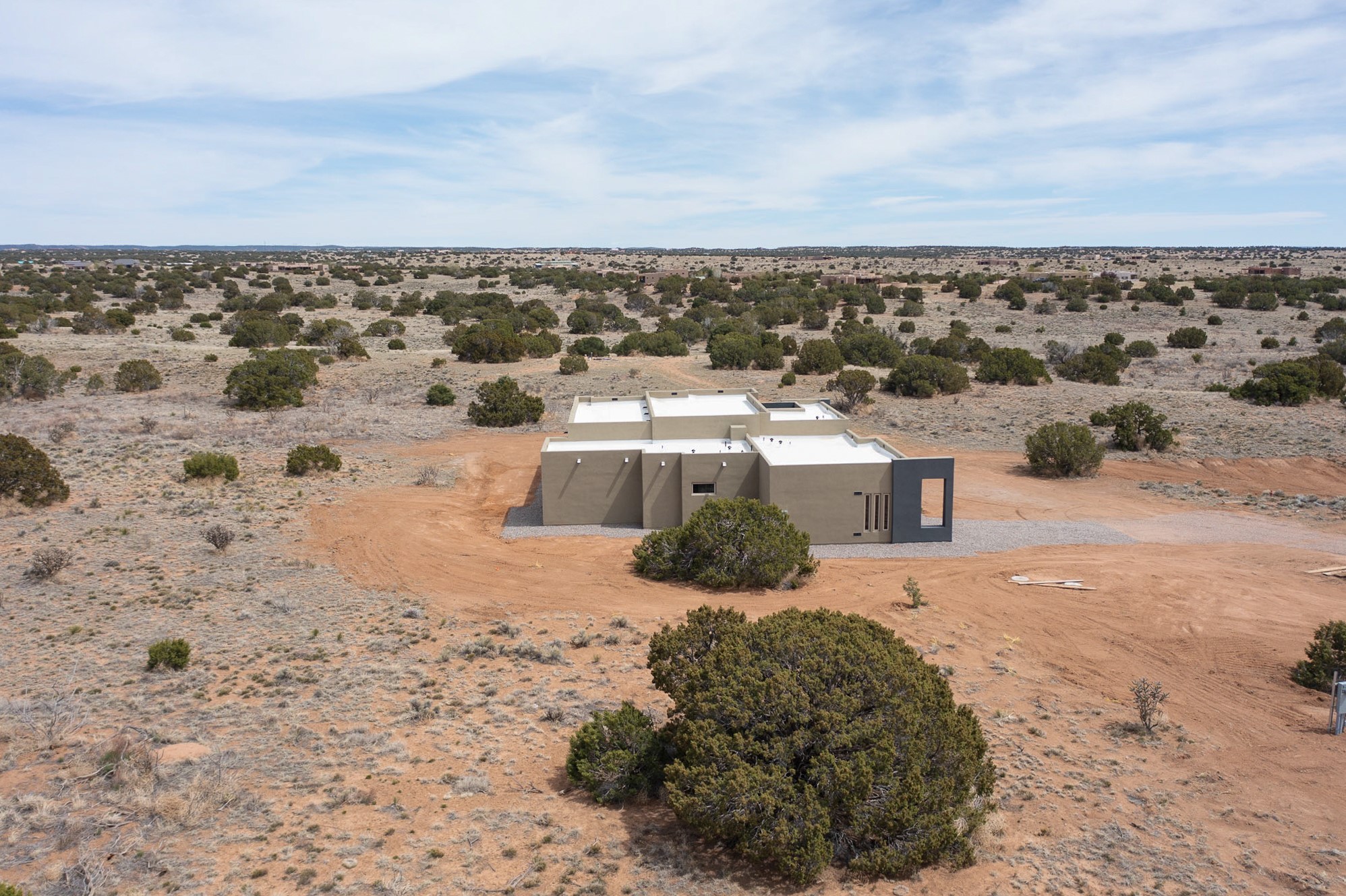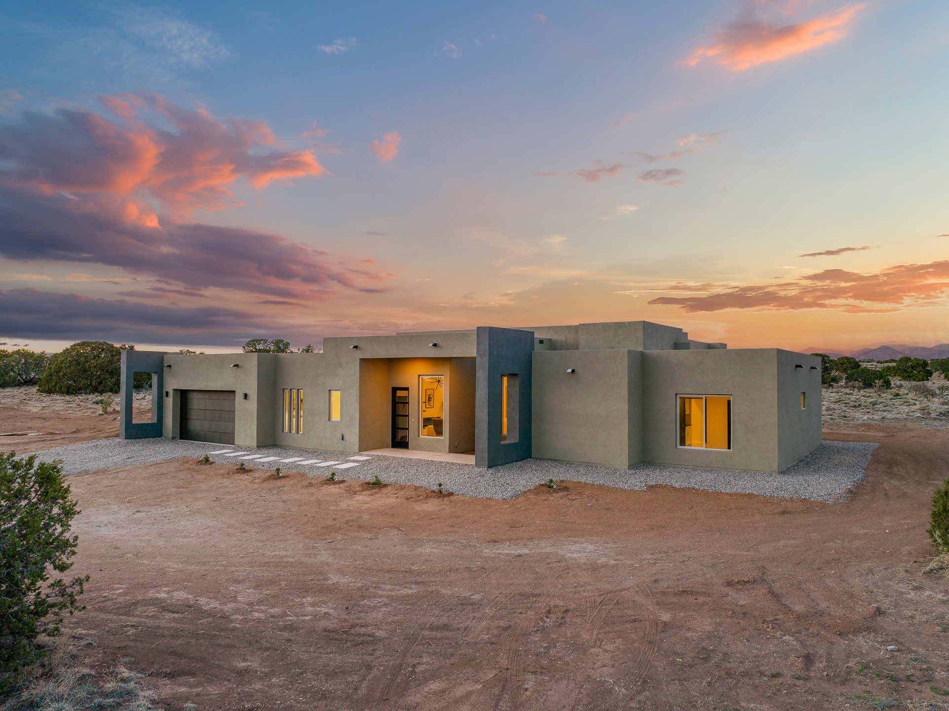 Just completed and ready for occupancy! One of the best view lots in the area. Mountain views from every window in this new custom built contemporary pueblo style home with open floor plan situated on a huge 12.50 +/- ac. private lot in Ceilo Tranquilo. Perfect for indoor and outdoor entertaining with 1000 square foot (50 x 20) back portal and over 200 square foot front portal. Open kitchen/family/dining room has floor to ceiling windows and double sliding glass doors to take in the fabulous views and access to the portal. The contemporary kitchen has a huge island bar and large walk in pantry. Home has all tile floors, high ceilings throughout and central a/c and heat. Owner's suite has large picture window with fabulous mountain views and sliding door to the portal. Owner's bath has double sinks, soaking tub and large walk in shower room with double shower heads and rain showers and a large walk in closet. Home features contemporary style vigas in living areas. Many extras including a bonus room that could be a mud room, office, studio or crafts room, oversized two car garage with extra storage space. This home has it all; new home, fabulous views, great outdoor spaces, contemporary open floor plan, large private lot that allows horses and additional structures. Easy access to all the shopping and dining and near all the outdoor activities. $4000 appliance credit for range, dishwasher and microwave.
