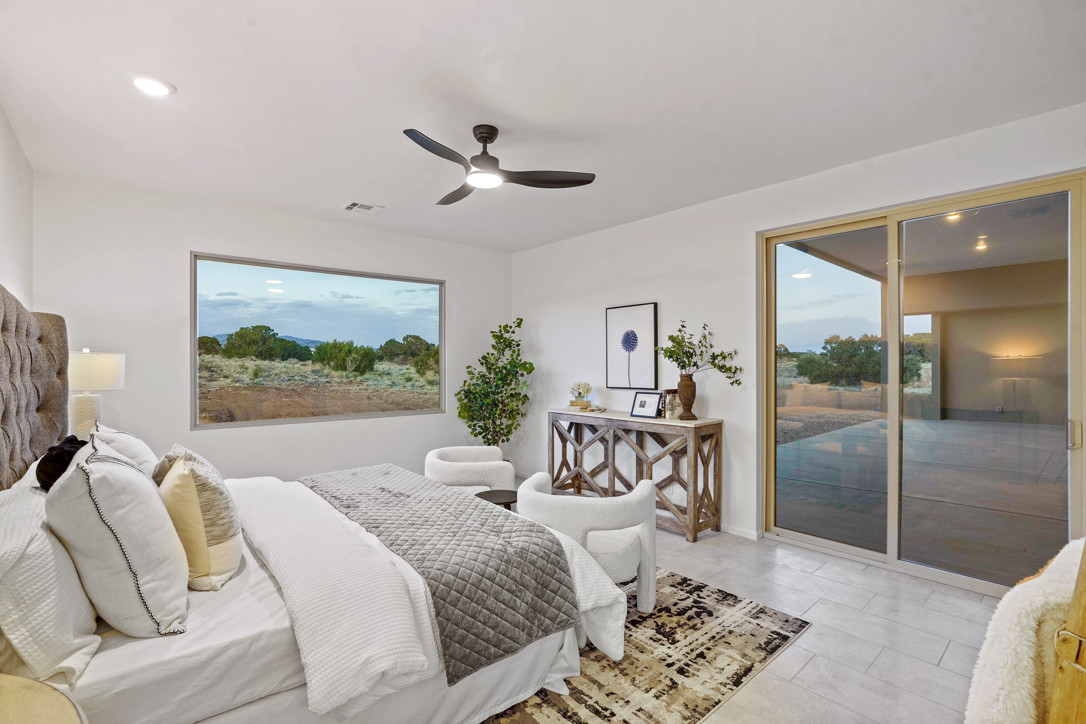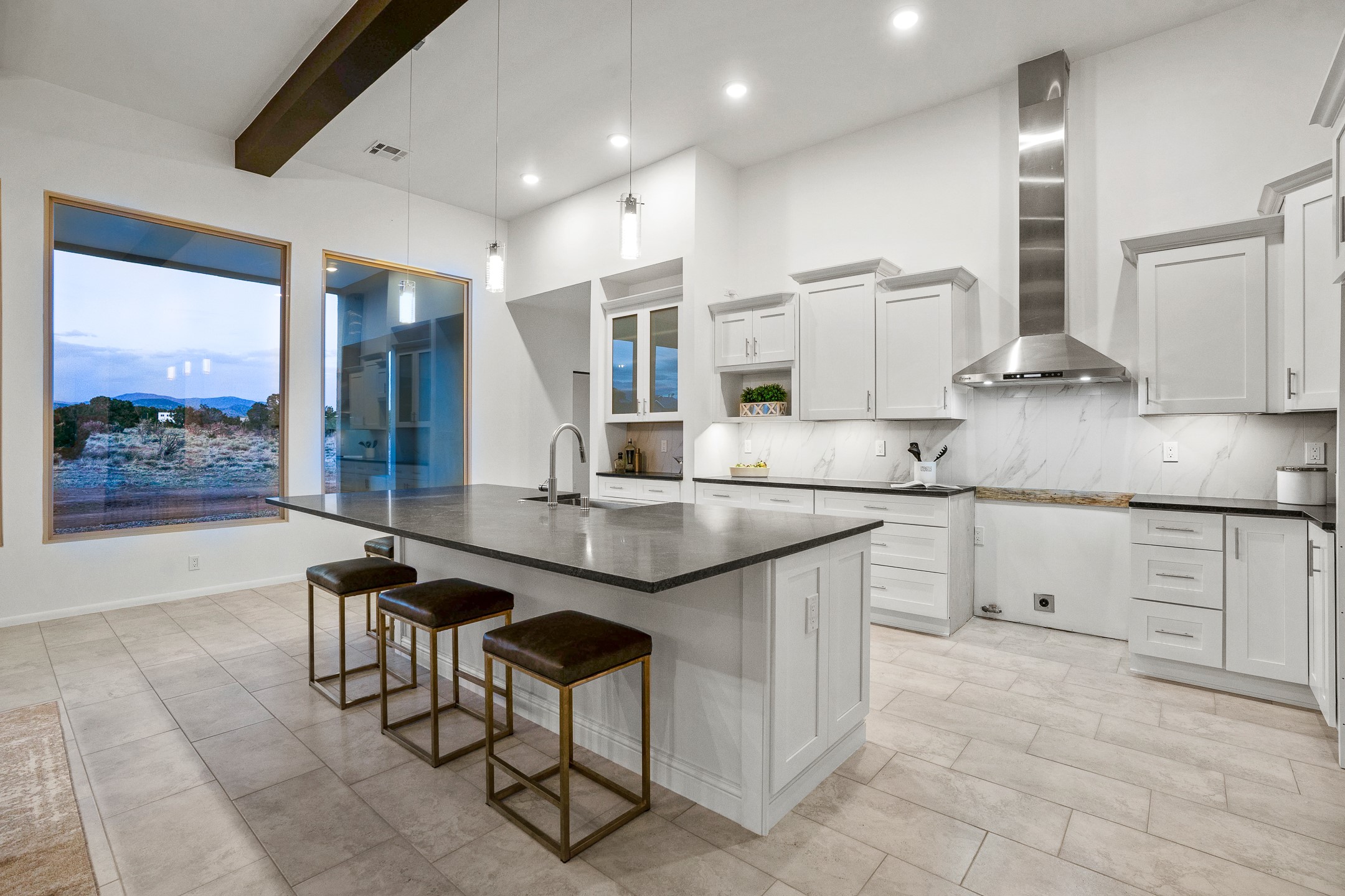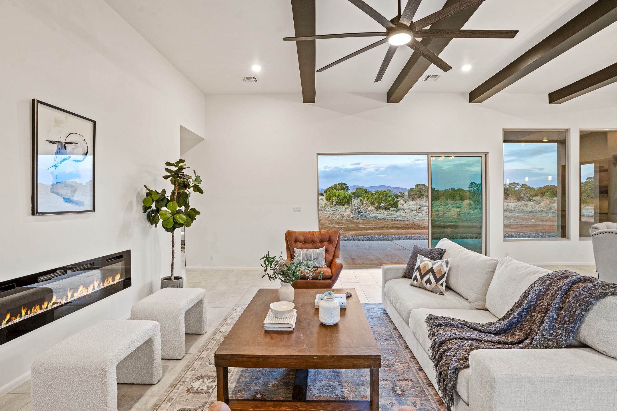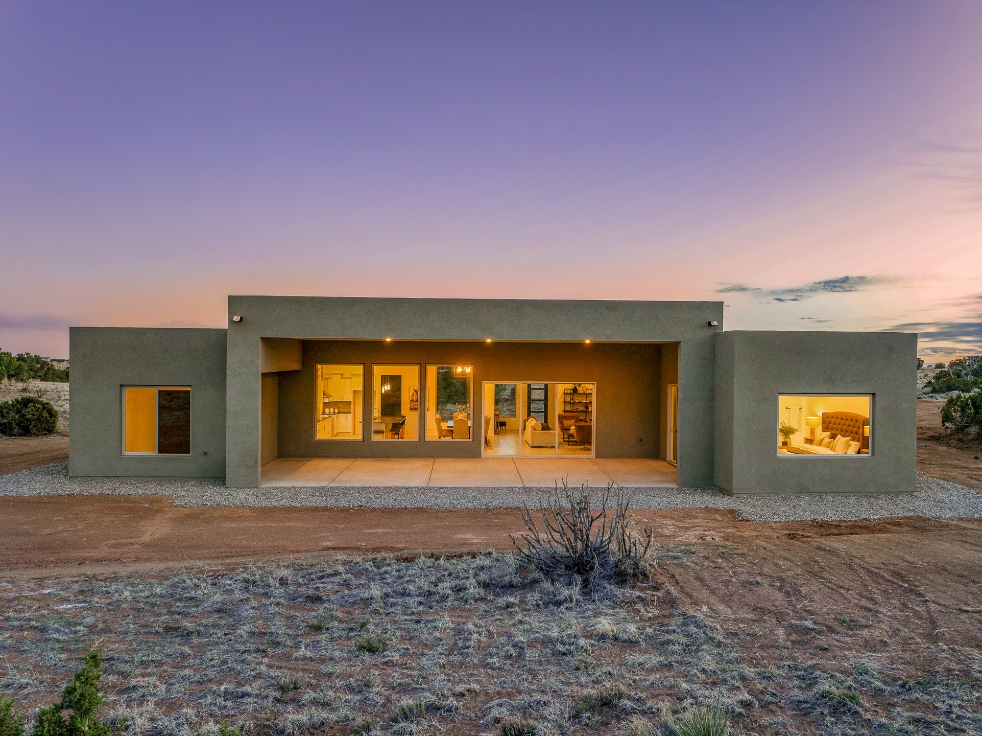 Just completed and ready for occupancy! One of the best view lots in the area. Mountain views from every window in this new custom built contemporary pueblo style home with open floor plan situated on a huge 12.50 +/- ac. private lot in Ceilo Tranquilo. Perfect for indoor and outdoor entertaining with 1000 square foot (50 x 20) back portal and over 200 square foot front portal. Open kitchen/family/dining room has floor to ceiling windows and double sliding glass doors to take in the fabulous views and access to the portal. The contemporary kitchen has a huge island bar and large walk in pantry. Home has all tile floors, high ceilings throughout and central a/c and heat. Owner's suite has large picture window with fabulous mountain views and sliding door to the portal. Owner's bath has double sinks, soaking tub and large walk in shower room with double shower heads and rain showers and a large walk in closet. Home features contemporary style vigas in living areas. Many extras including a bonus room that could be a mud room, office, studio or crafts room, oversized two car garage with extra storage space. This home has it all; new home, fabulous views, great outdoor spaces, contemporary open floor plan, large private lot that allows horses and additional structures. Easy access to all the shopping and dining and near all the outdoor activities. $4000 appliance credit for range, dishwasher and microwave.