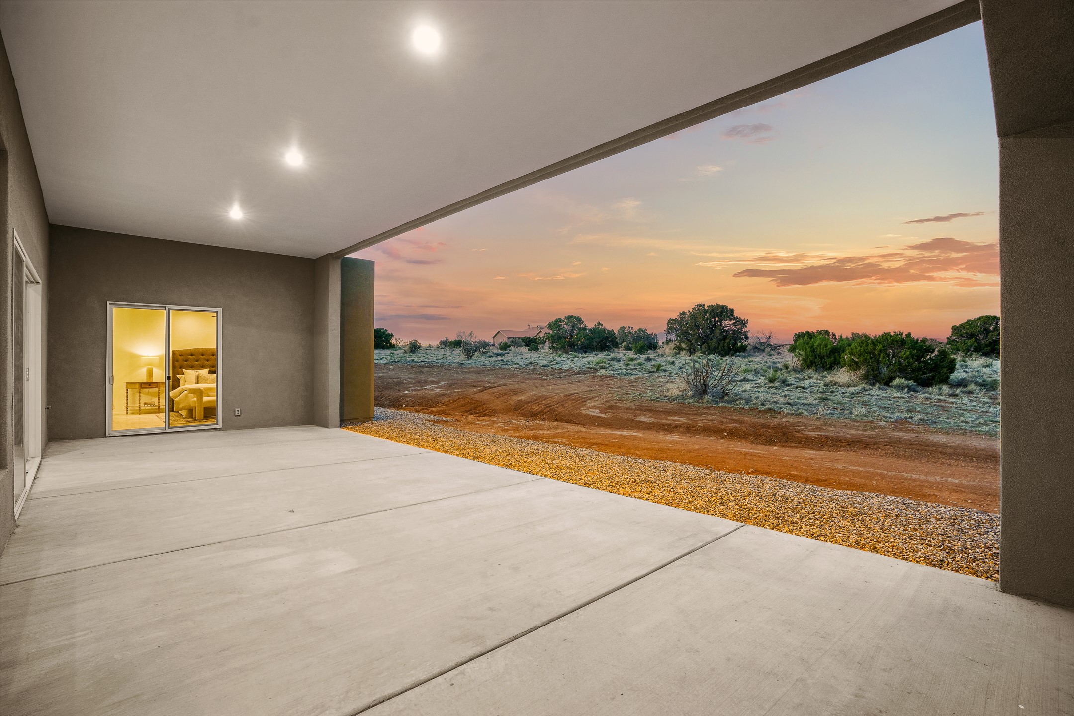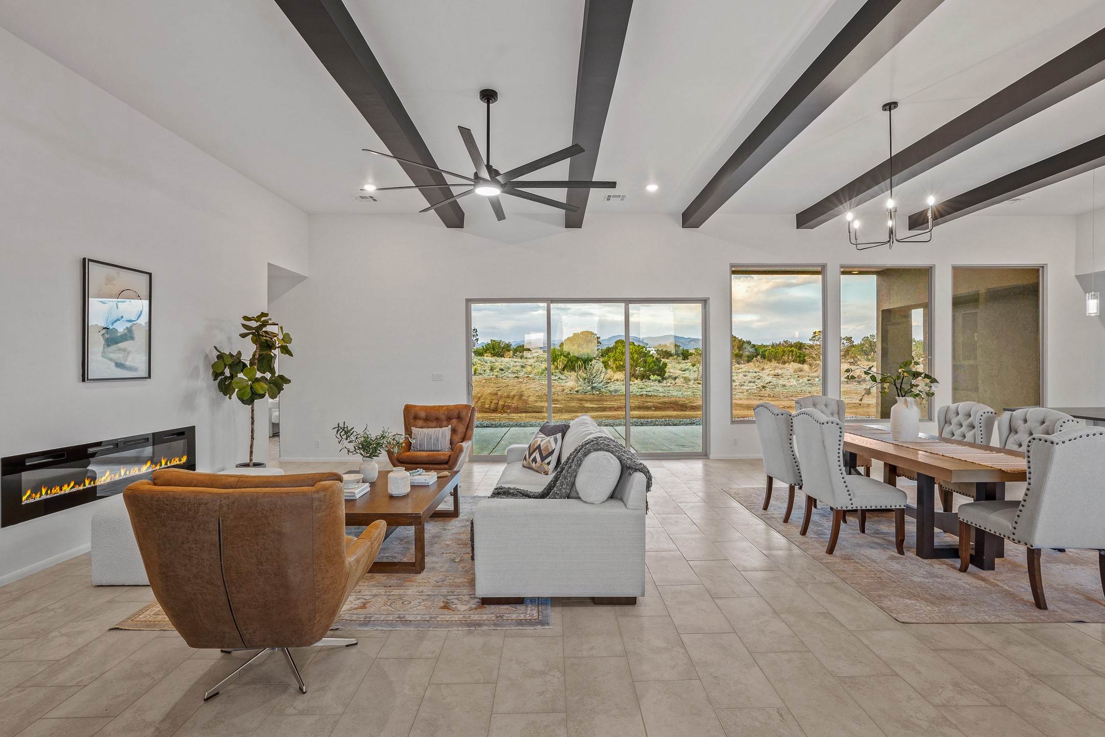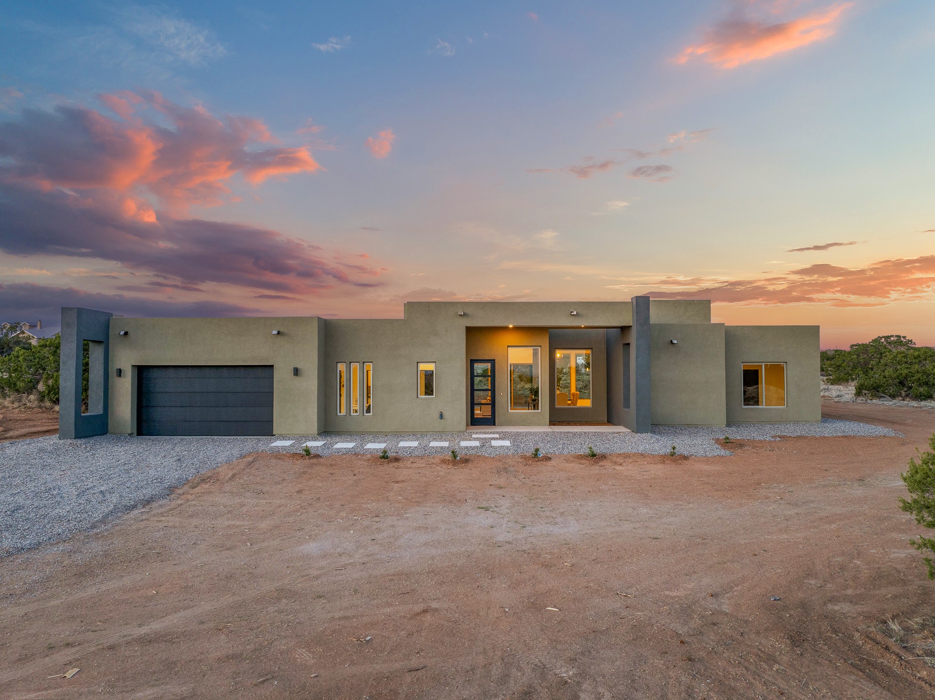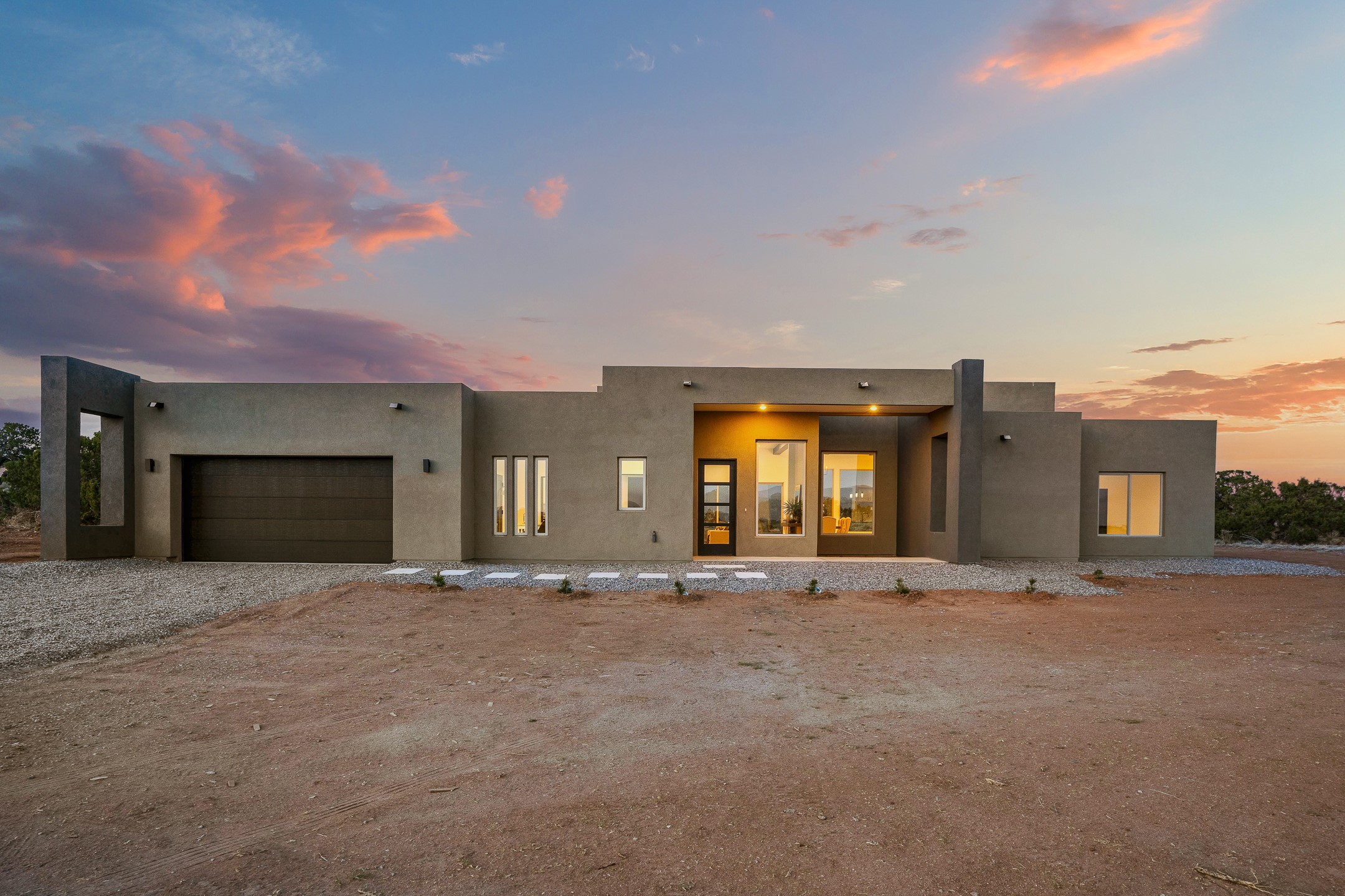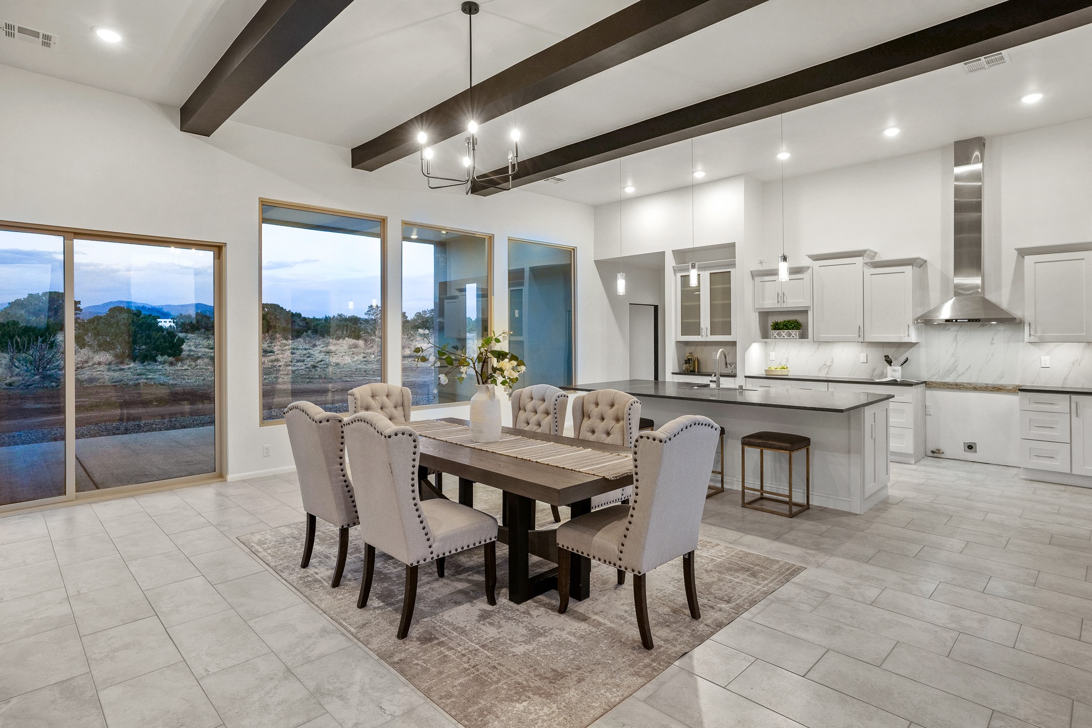 Just completed and ready for occupancy! One of the best view lots in the area. Mountain views from every window in this new custom built contemporary pueblo style home with open floor plan situated on a huge 12.50 +/- ac. private lot in Ceilo Tranquilo. Perfect for indoor and outdoor entertaining with 1000 square foot (50 x 20) back portal and over 200 square foot front portal. Open kitchen/family/dining room has floor to ceiling windows and double sliding glass doors to take in the fabulous views and access to the portal. The contemporary kitchen has a huge island bar and large walk in pantry. Home has all tile floors, high ceilings throughout and central a/c and heat. Owner's suite has large picture window with fabulous mountain views and sliding door to the portal. Owner's bath has double sinks, soaking tub and large walk in shower room with double shower heads and rain showers and a large walk in closet. Home features contemporary style vigas in living areas. Many extras including a bonus room that could be a mud room, office, studio or crafts room, oversized two car garage with extra storage space. This home has it all; new home, fabulous views, great outdoor spaces, contemporary open floor plan, large private lot that allows horses and additional structures. Easy access to all the shopping and dining and near all the outdoor activities. $4000 appliance credit for range, dishwasher and microwave.