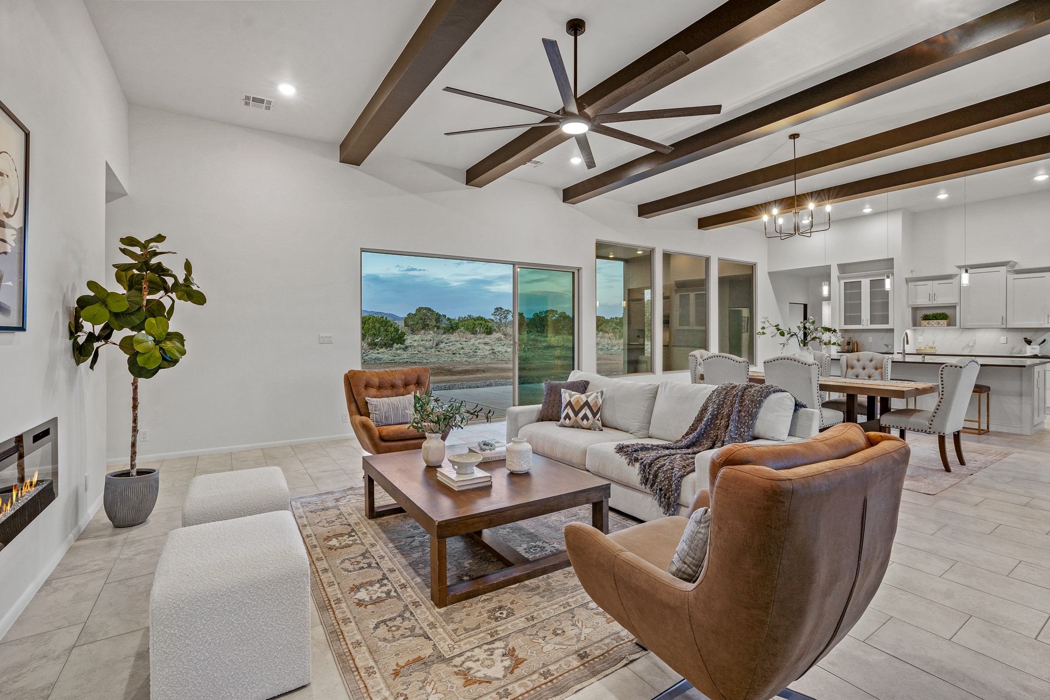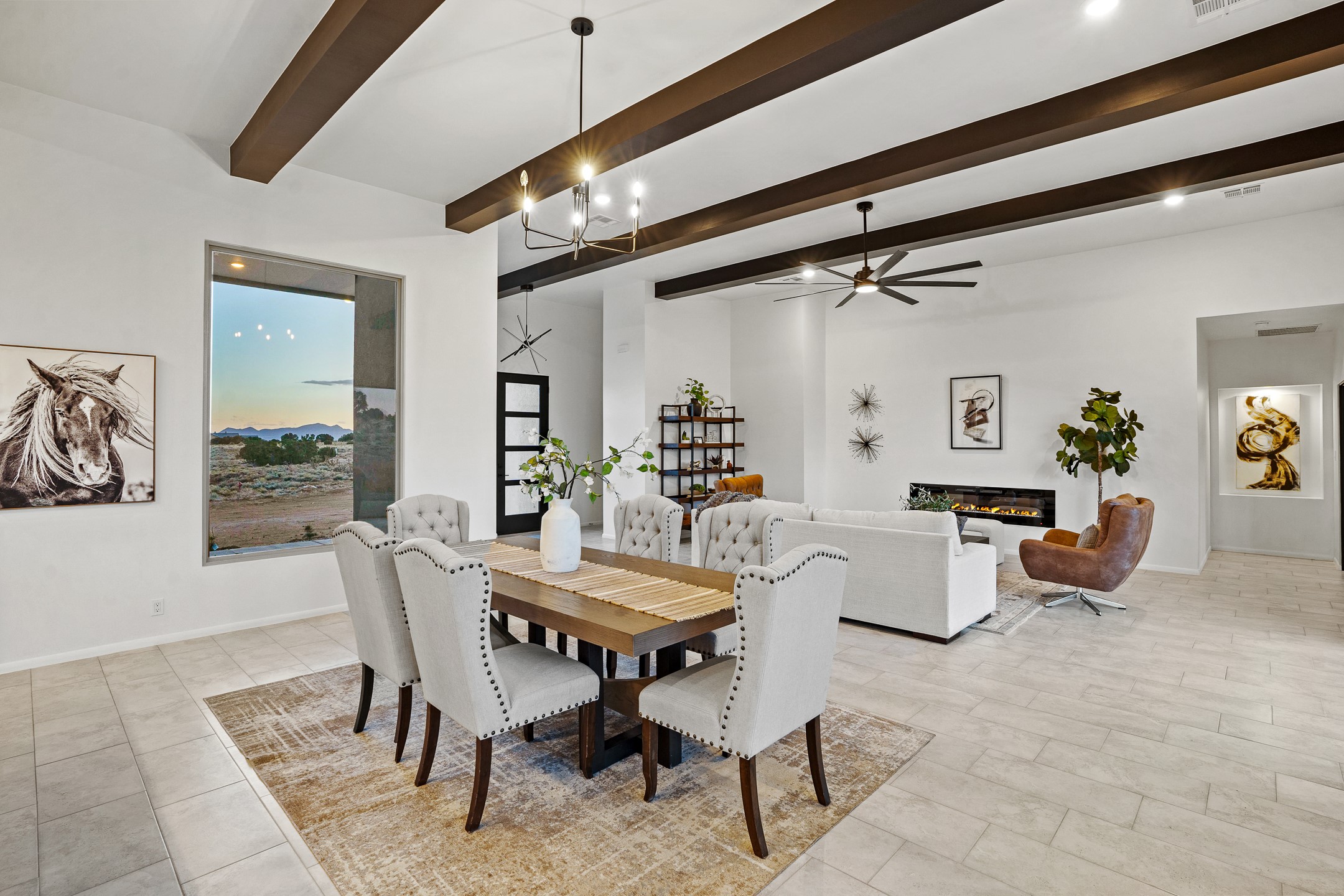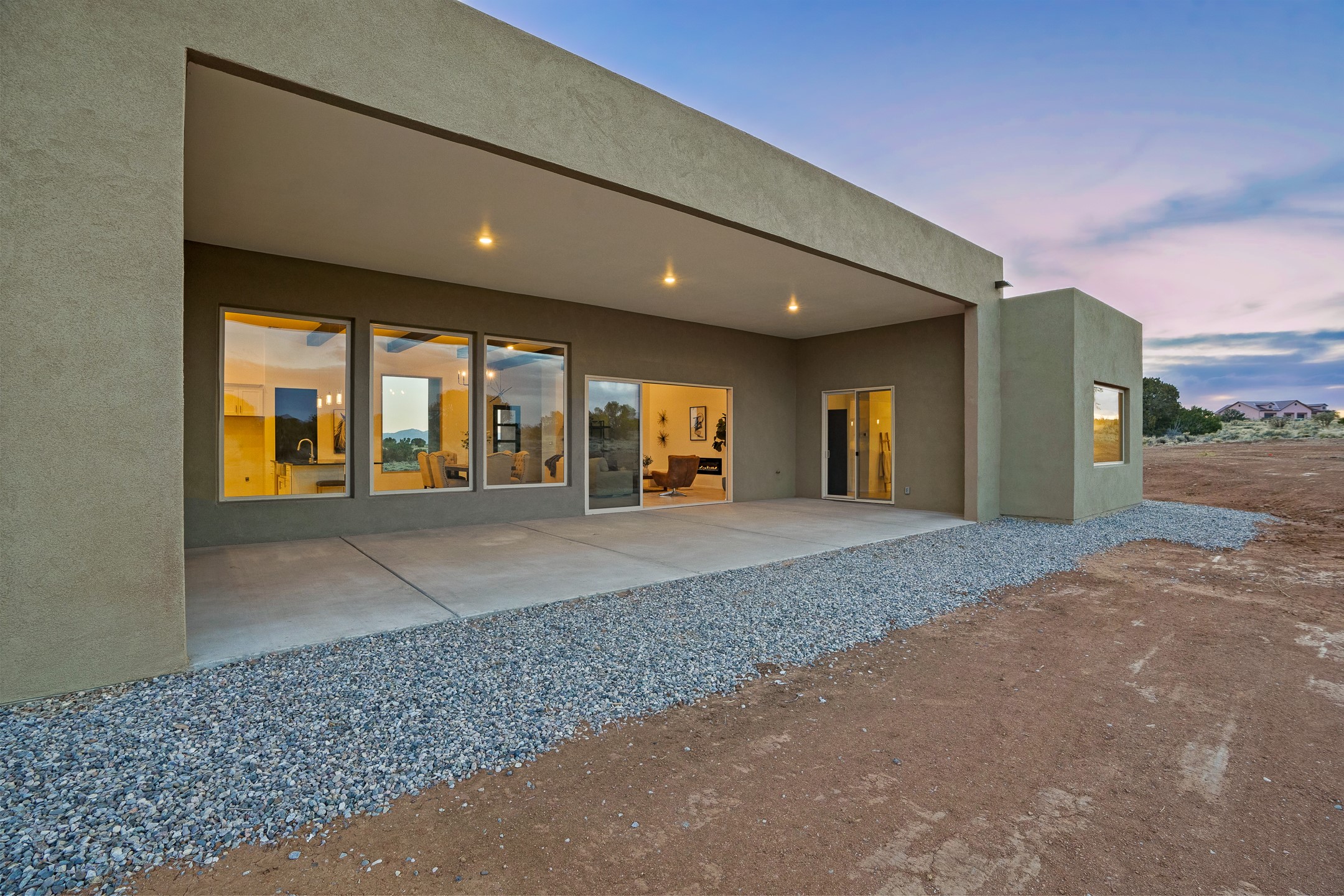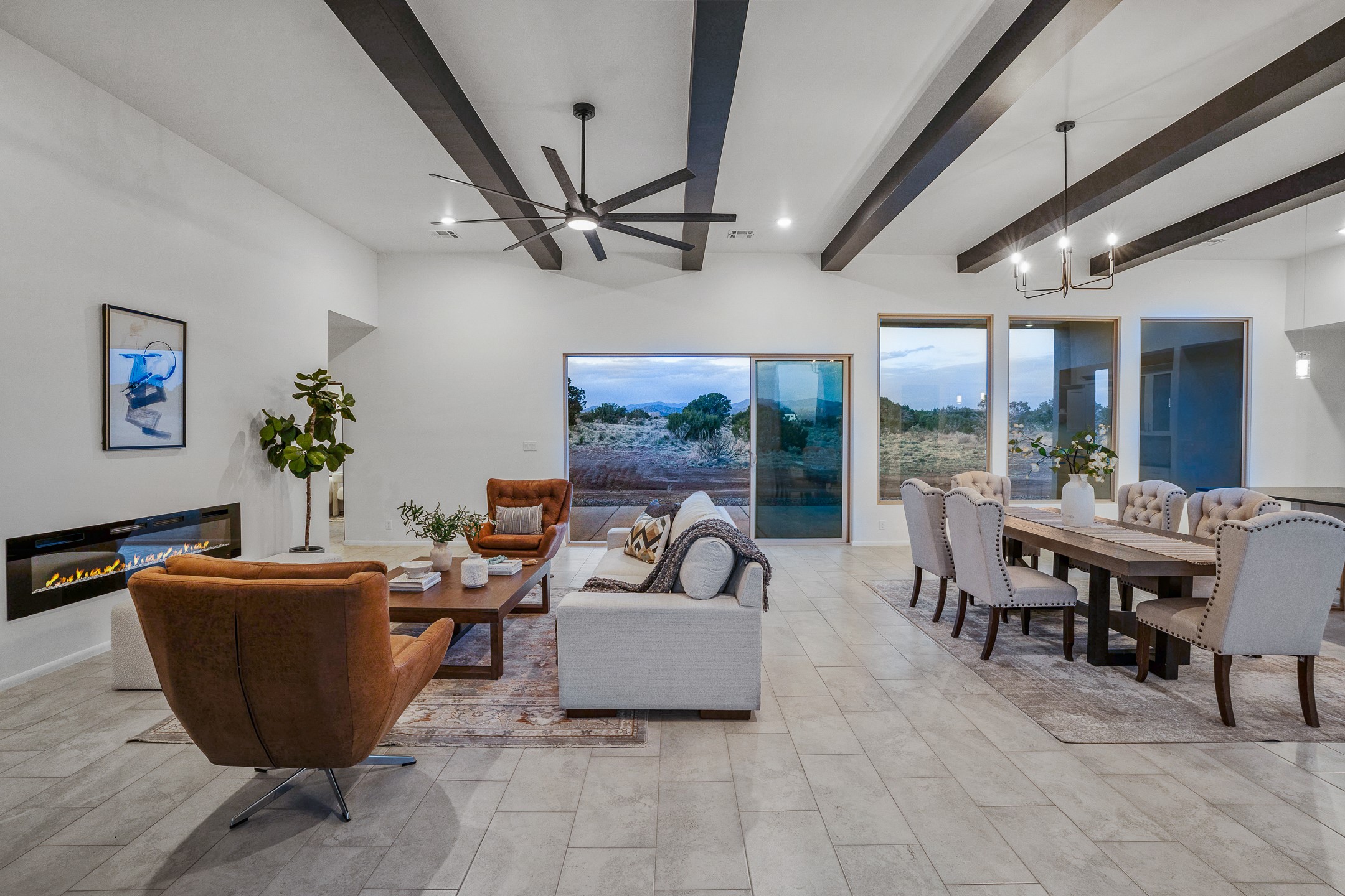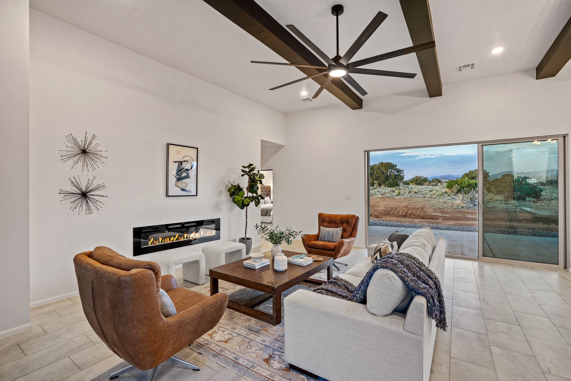 Just completed and ready for occupancy! One of the best view lots in the area. Mountain views from every window in this new custom built contemporary pueblo style home with open floor plan situated on a huge 12.50 +/- ac. private lot in Ceilo Tranquilo. Perfect for indoor and outdoor entertaining with 1000 square foot (50 x 20) back portal and over 200 square foot front portal. Open kitchen/family/dining room has floor to ceiling windows and double sliding glass doors to take in the fabulous views and access to the portal. The contemporary kitchen has a huge island bar and large walk in pantry. Home has all tile floors, high ceilings throughout and central a/c and heat. Owner's suite has large picture window with fabulous mountain views and sliding door to the portal. Owner's bath has double sinks, soaking tub and large walk in shower room with double shower heads and rain showers and a large walk in closet. Home features contemporary style vigas in living areas. Many extras including a bonus room that could be a mud room, office, studio or crafts room, oversized two car garage with extra storage space. This home has it all; new home, fabulous views, great outdoor spaces, contemporary open floor plan, large private lot that allows horses and additional structures. Easy access to all the shopping and dining and near all the outdoor activities. $4000 appliance credit for range, dishwasher and microwave.