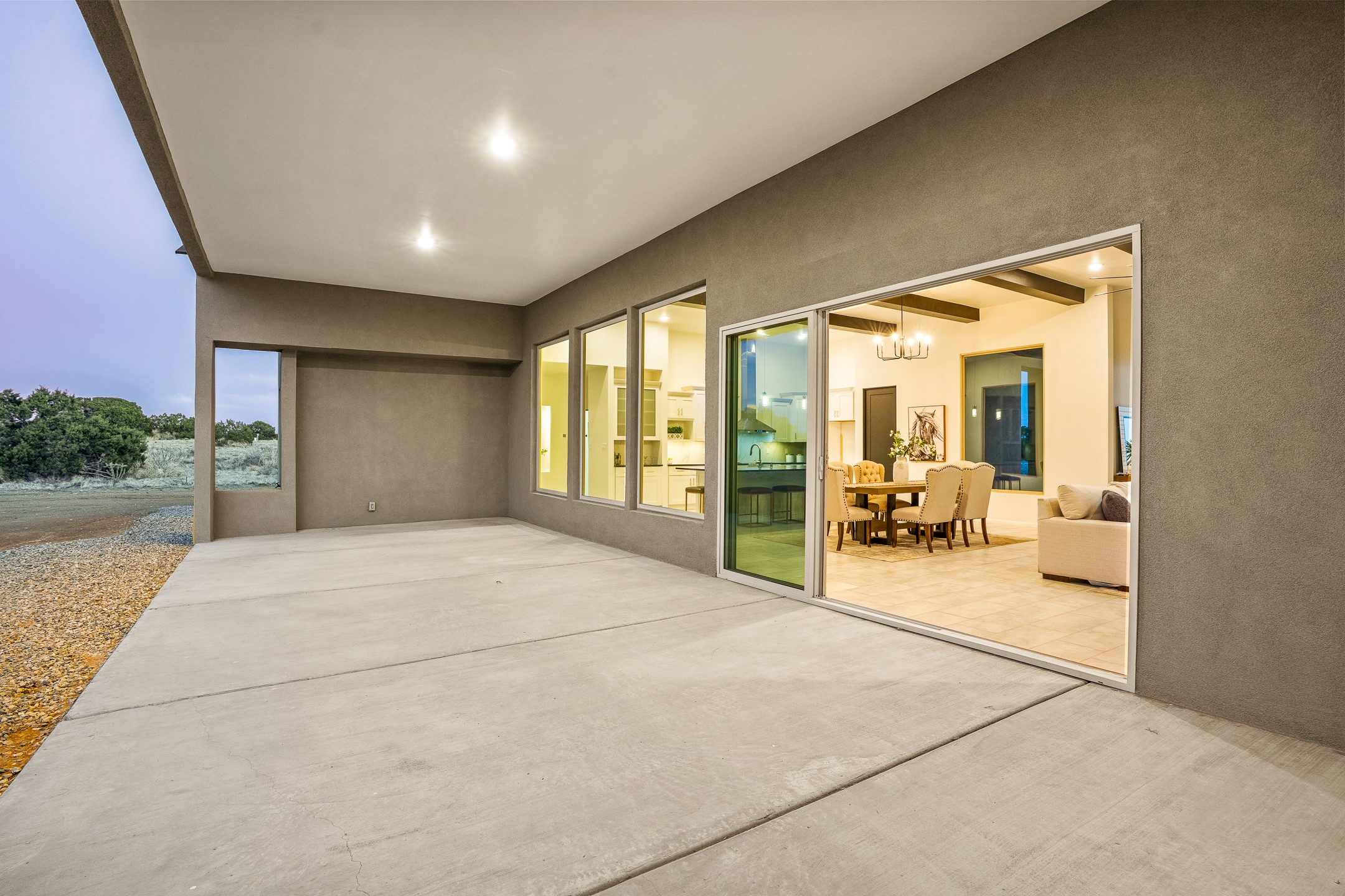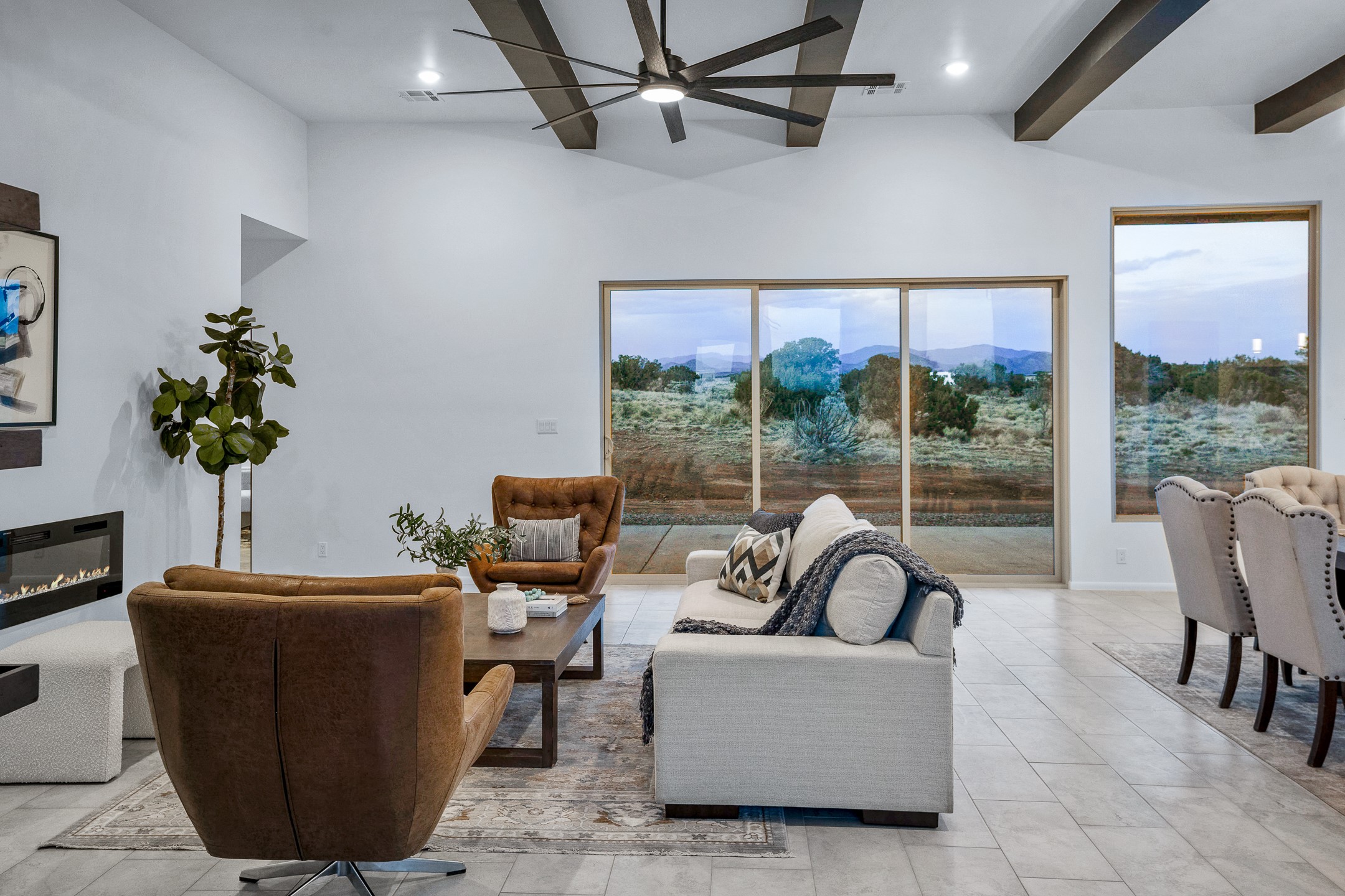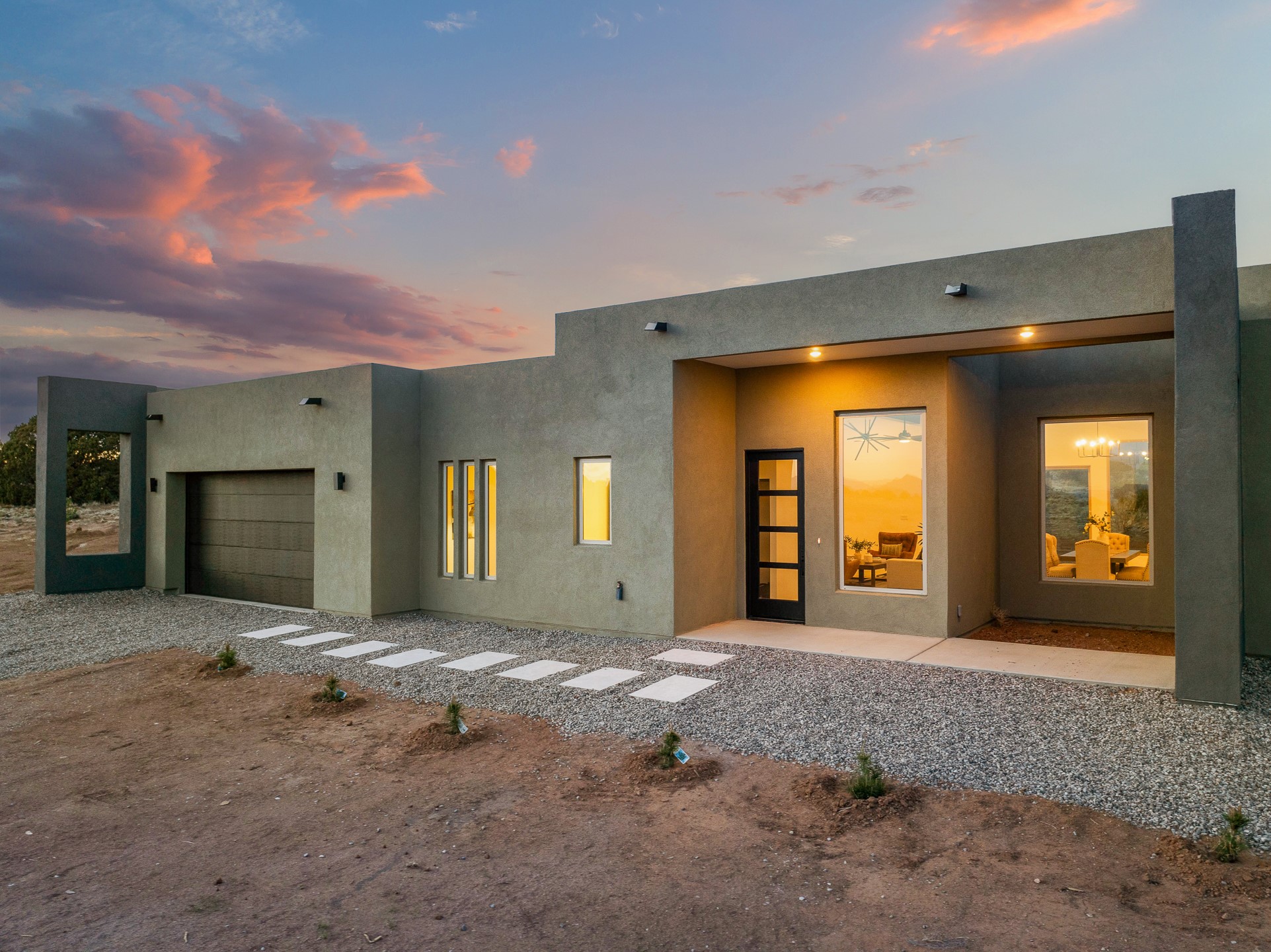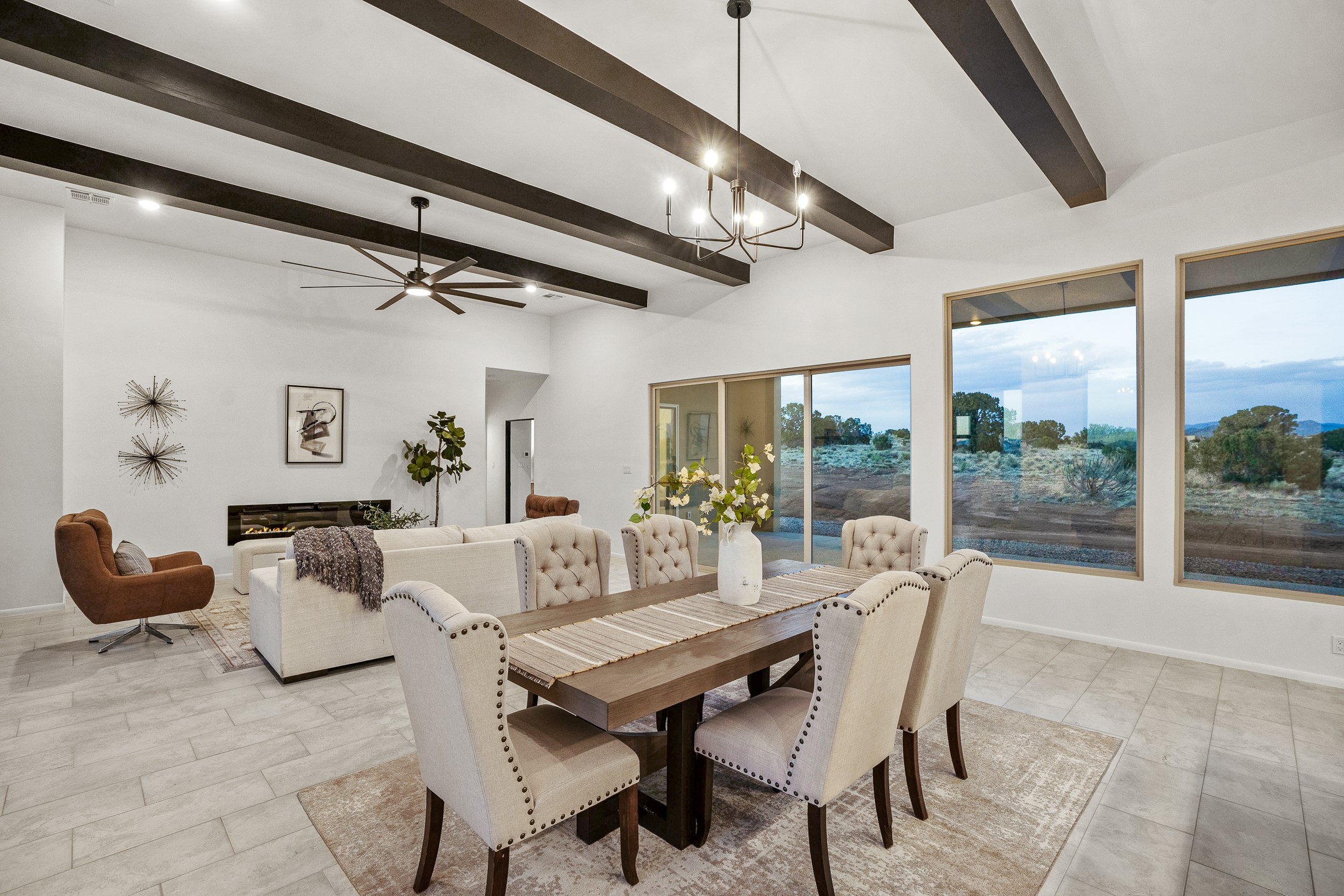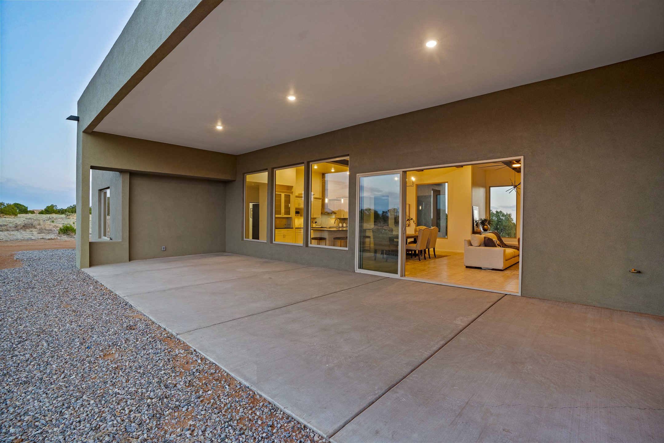 Just completed and ready for occupancy! One of the best view lots in the area. Mountain views from every window in this new custom built contemporary pueblo style home with open floor plan situated on a huge 12.50 +/- ac. private lot in Ceilo Tranquilo. Perfect for indoor and outdoor entertaining with 1000 square foot (50 x 20) back portal and over 200 square foot front portal. Open kitchen/family/dining room has floor to ceiling windows and double sliding glass doors to take in the fabulous views and access to the portal. The contemporary kitchen has a huge island bar and large walk in pantry. Home has all tile floors, high ceilings throughout and central a/c and heat. Owner's suite has large picture window with fabulous mountain views and sliding door to the portal. Owner's bath has double sinks, soaking tub and large walk in shower room with double shower heads and rain showers and a large walk in closet. Home features contemporary style vigas in living areas. Many extras including a bonus room that could be a mud room, office, studio or crafts room, oversized two car garage with extra storage space. This home has it all; new home, fabulous views, great outdoor spaces, contemporary open floor plan, large private lot that allows horses and additional structures. Easy access to all the shopping and dining and near all the outdoor activities. $4000 appliance credit for range, dishwasher and microwave.