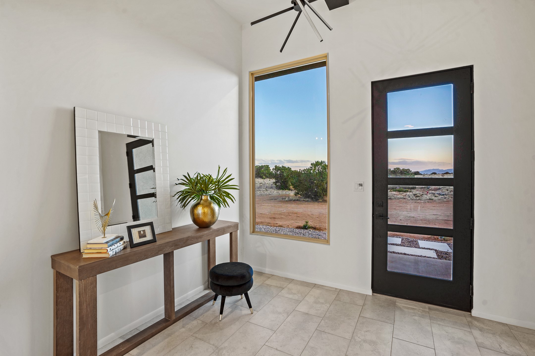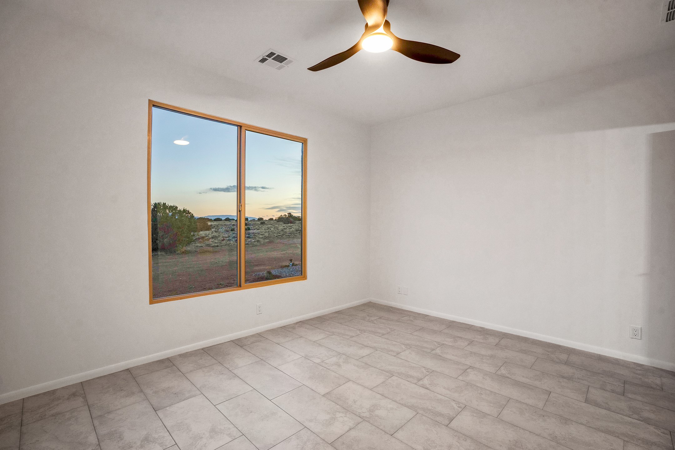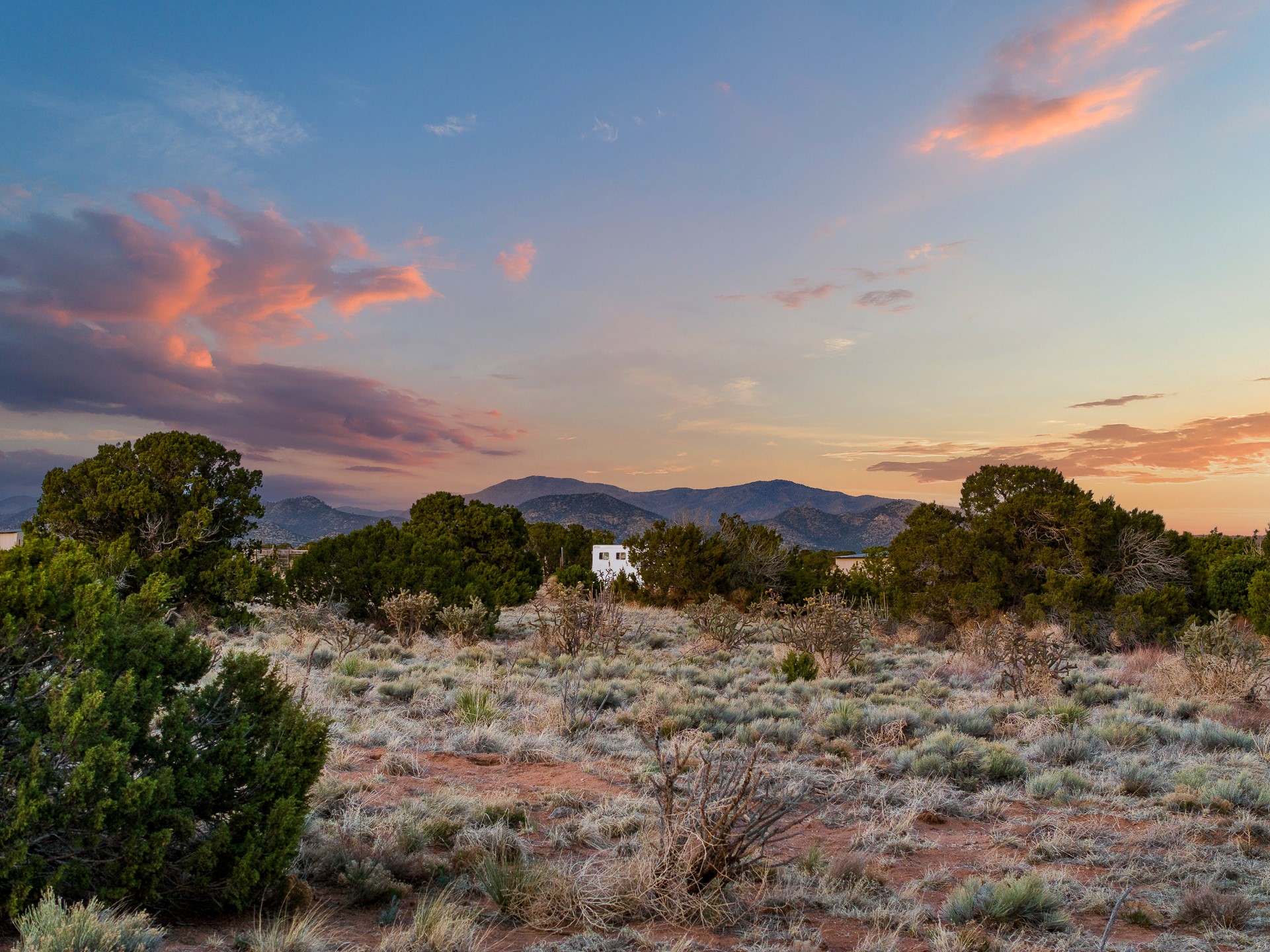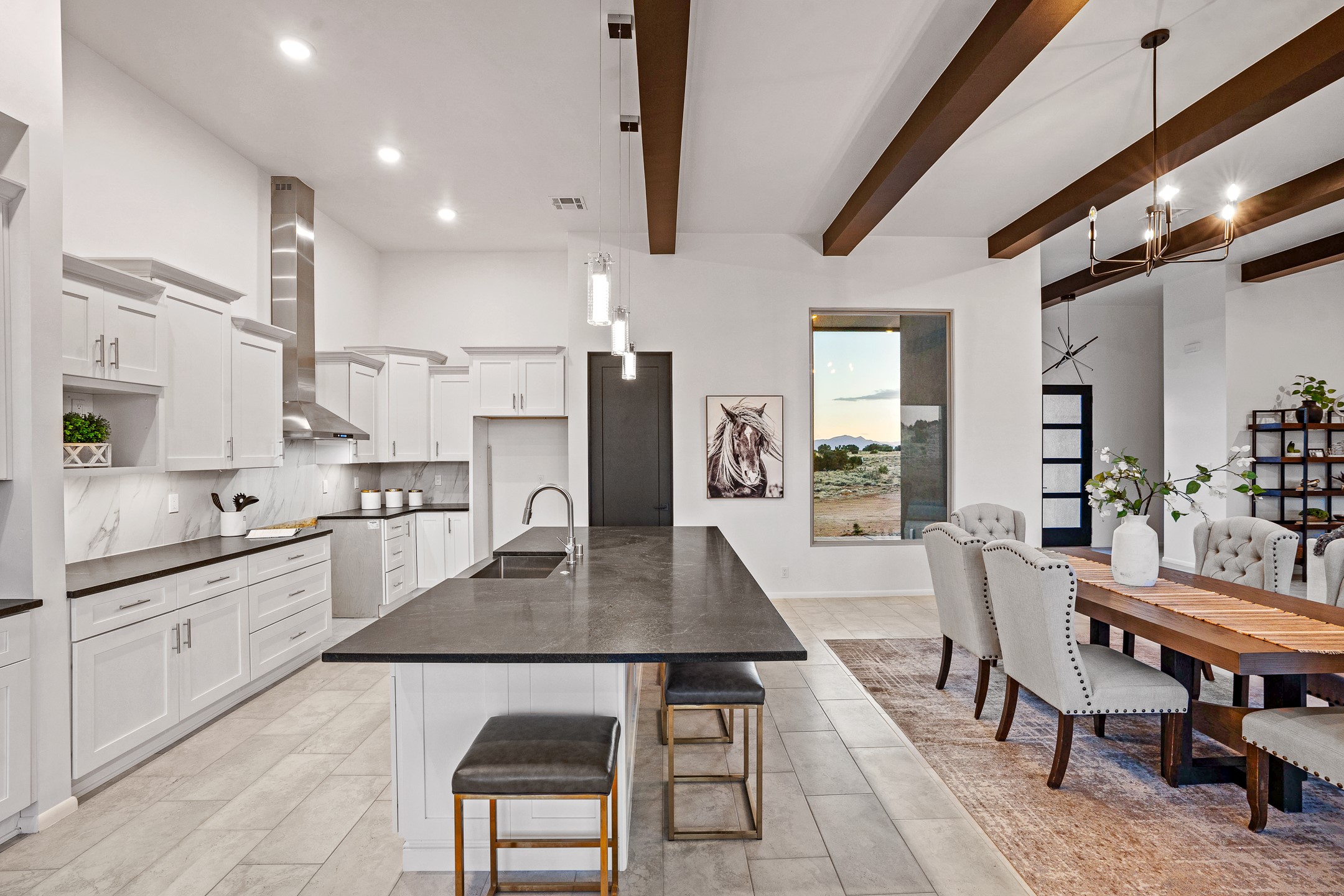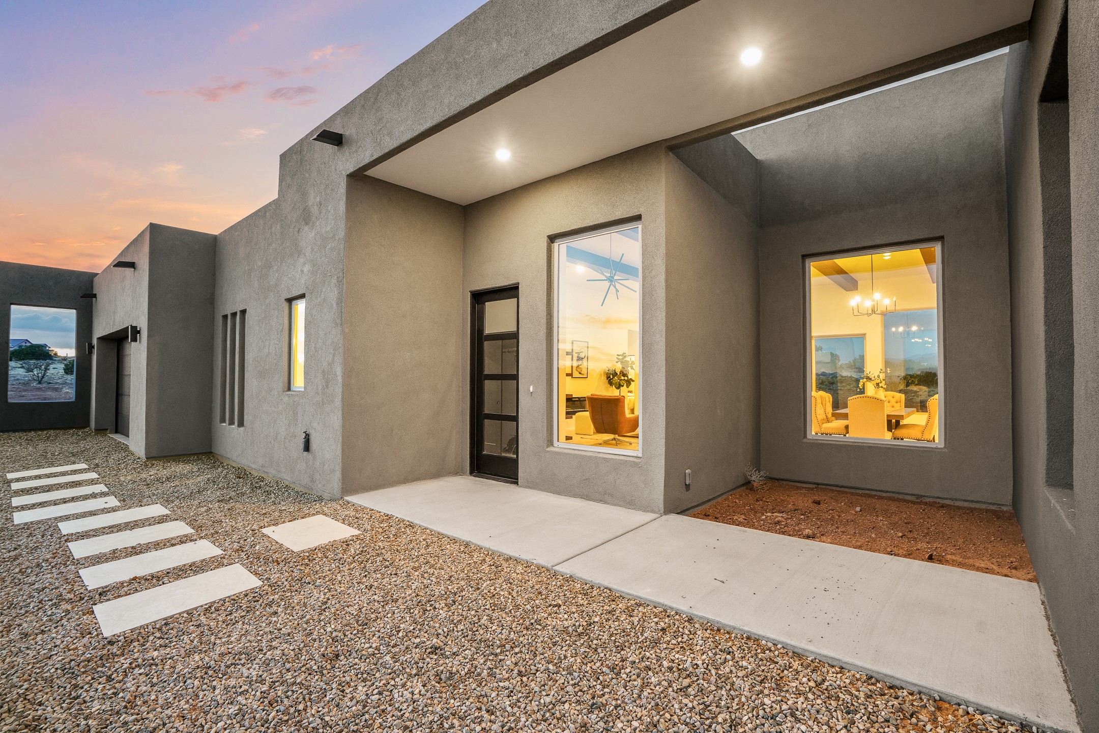 Just completed and ready for occupancy! One of the best view lots in the area. Mountain views from every window in this new custom built contemporary pueblo style home with open floor plan situated on a huge 12.50 +/- ac. private lot in Ceilo Tranquilo. Perfect for indoor and outdoor entertaining with 1000 square foot (50 x 20) back portal and over 200 square foot front portal. Open kitchen/family/dining room has floor to ceiling windows and double sliding glass doors to take in the fabulous views and access to the portal. The contemporary kitchen has a huge island bar and large walk in pantry. Home has all tile floors, high ceilings throughout and central a/c and heat. Owner's suite has large picture window with fabulous mountain views and sliding door to the portal. Owner's bath has double sinks, soaking tub and large walk in shower room with double shower heads and rain showers and a large walk in closet. Home features contemporary style vigas in living areas. Many extras including a bonus room that could be a mud room, office, studio or crafts room, oversized two car garage with extra storage space. This home has it all; new home, fabulous views, great outdoor spaces, contemporary open floor plan, large private lot that allows horses and additional structures. Easy access to all the shopping and dining and near all the outdoor activities. $4000 appliance credit for range, dishwasher and microwave.