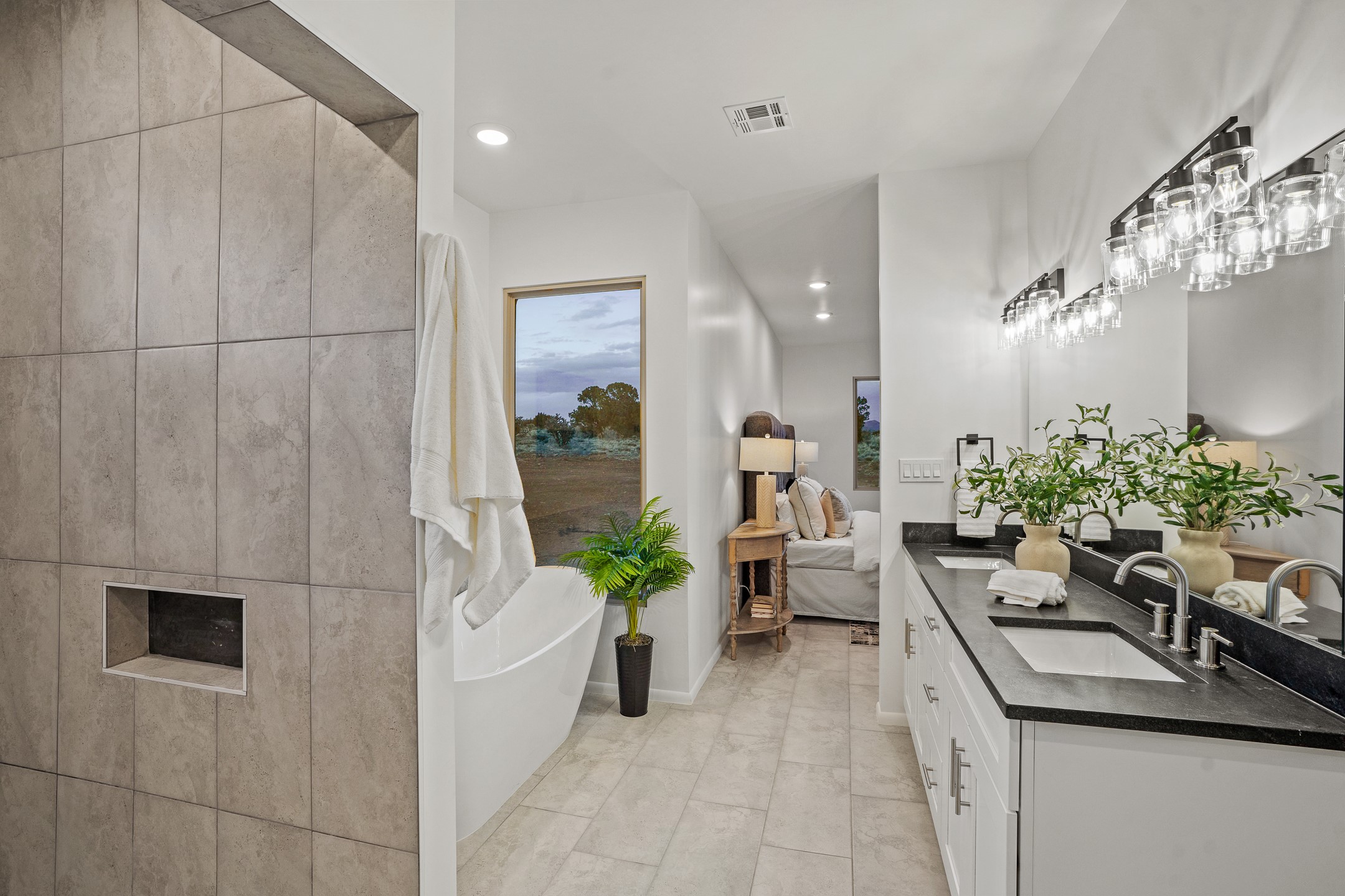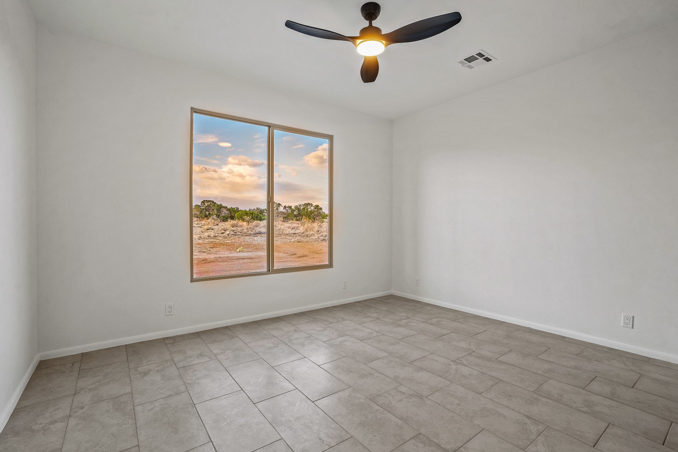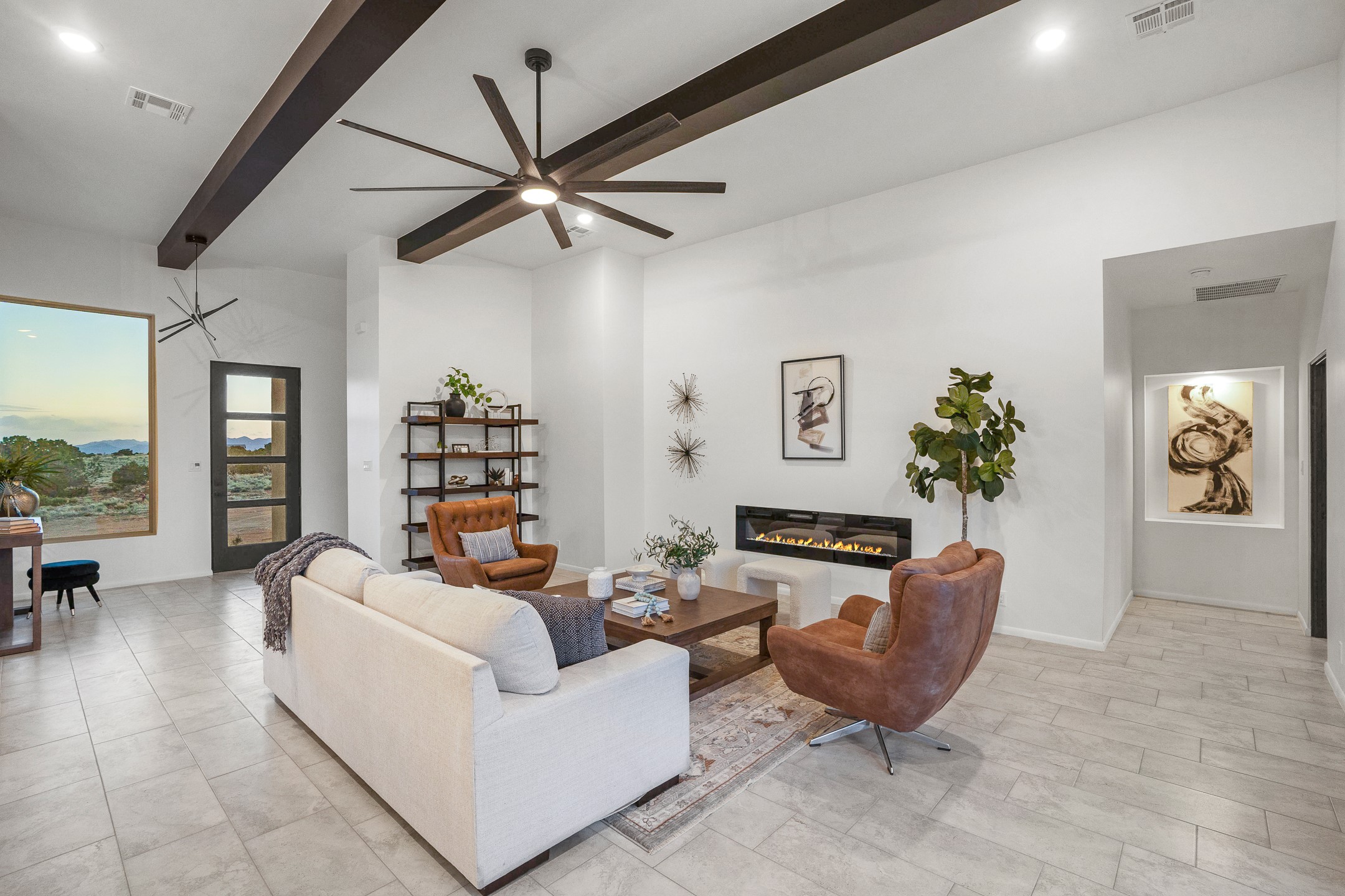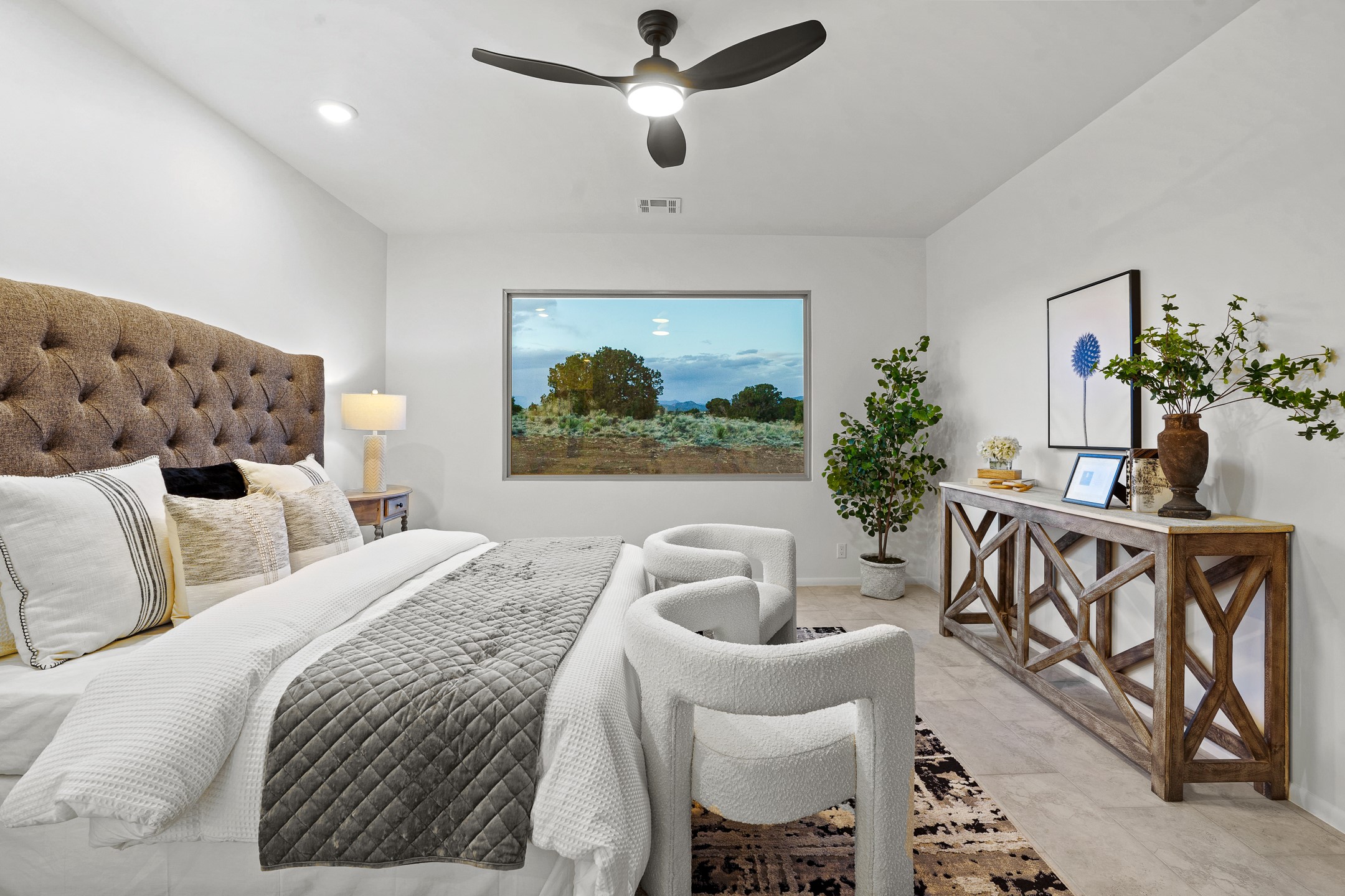 Just completed and ready for occupancy! One of the best view lots in the area. Mountain views from every window in this new custom built contemporary pueblo style home with open floor plan situated on a huge 12.50 +/- ac. private lot in Ceilo Tranquilo. Perfect for indoor and outdoor entertaining with 1000 square foot (50 x 20) back portal and over 200 square foot front portal. Open kitchen/family/dining room has floor to ceiling windows and double sliding glass doors to take in the fabulous views and access to the portal. The contemporary kitchen has a huge island bar and large walk in pantry. Home has all tile floors, high ceilings throughout and central a/c and heat. Owner's suite has large picture window with fabulous mountain views and sliding door to the portal. Owner's bath has double sinks, soaking tub and large walk in shower room with double shower heads and rain showers and a large walk in closet. Home features contemporary style vigas in living areas. Many extras including a bonus room that could be a mud room, office, studio or crafts room, oversized two car garage with extra storage space. This home has it all; new home, fabulous views, great outdoor spaces, contemporary open floor plan, large private lot that allows horses and additional structures. Easy access to all the shopping and dining and near all the outdoor activities. $4000 appliance credit for range, dishwasher and microwave.