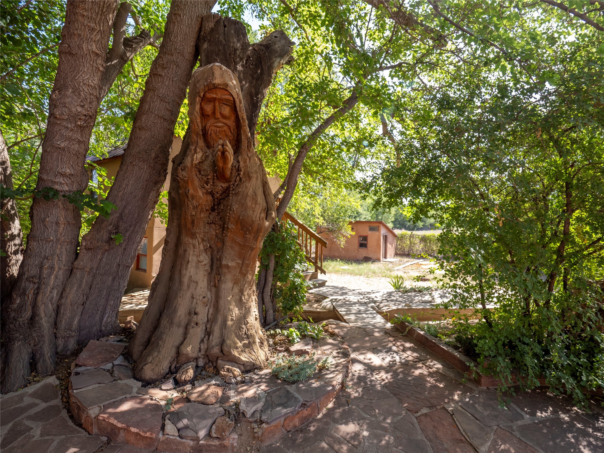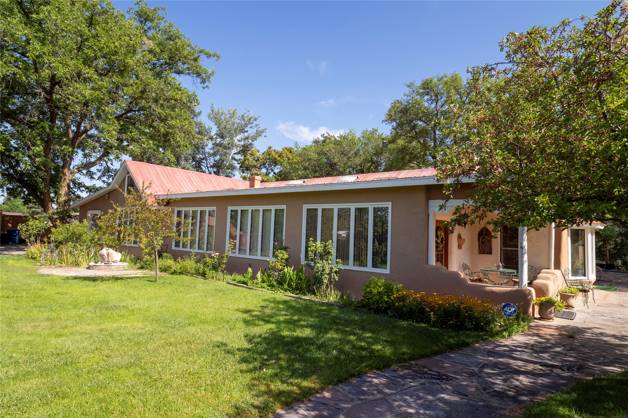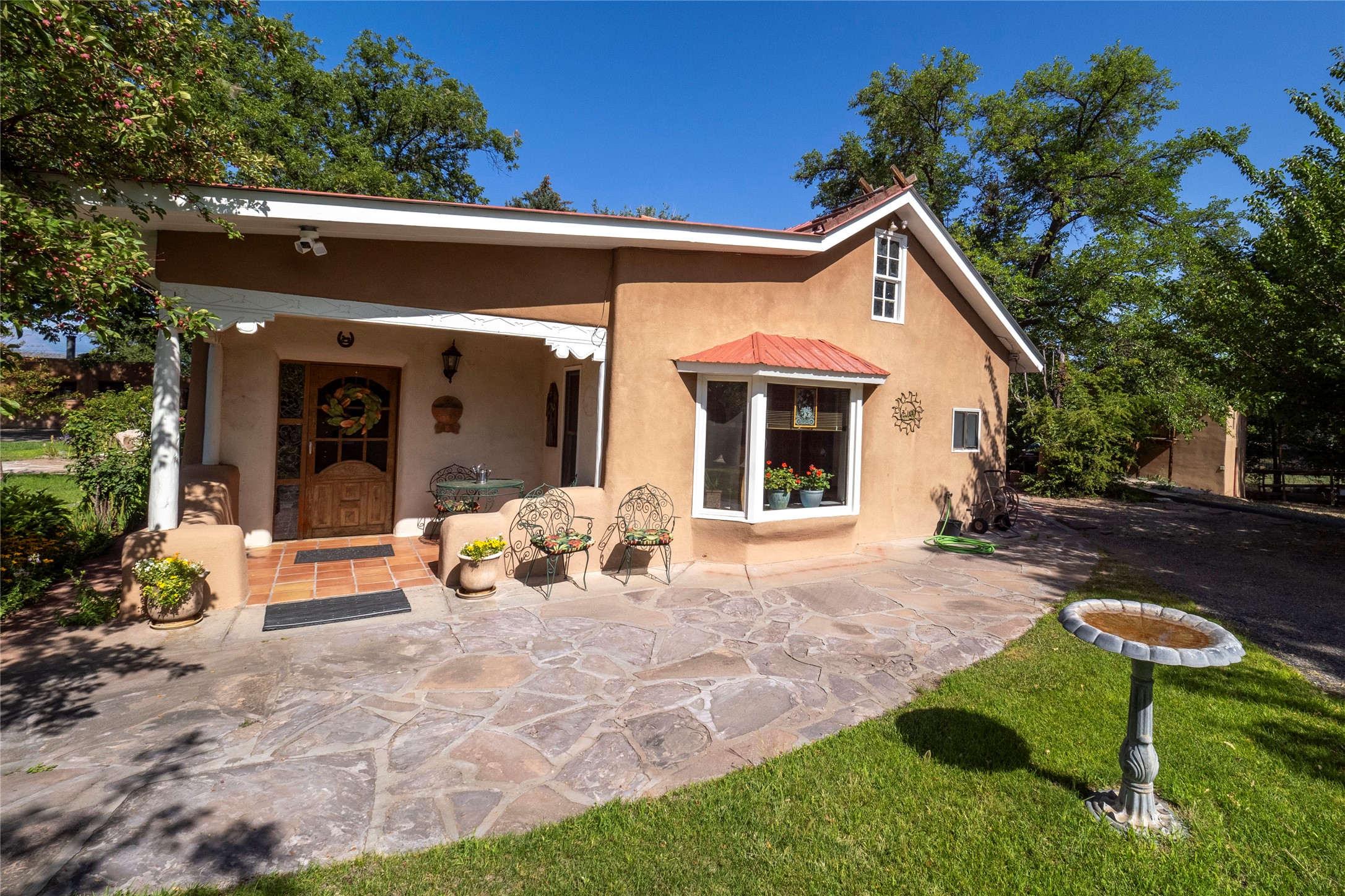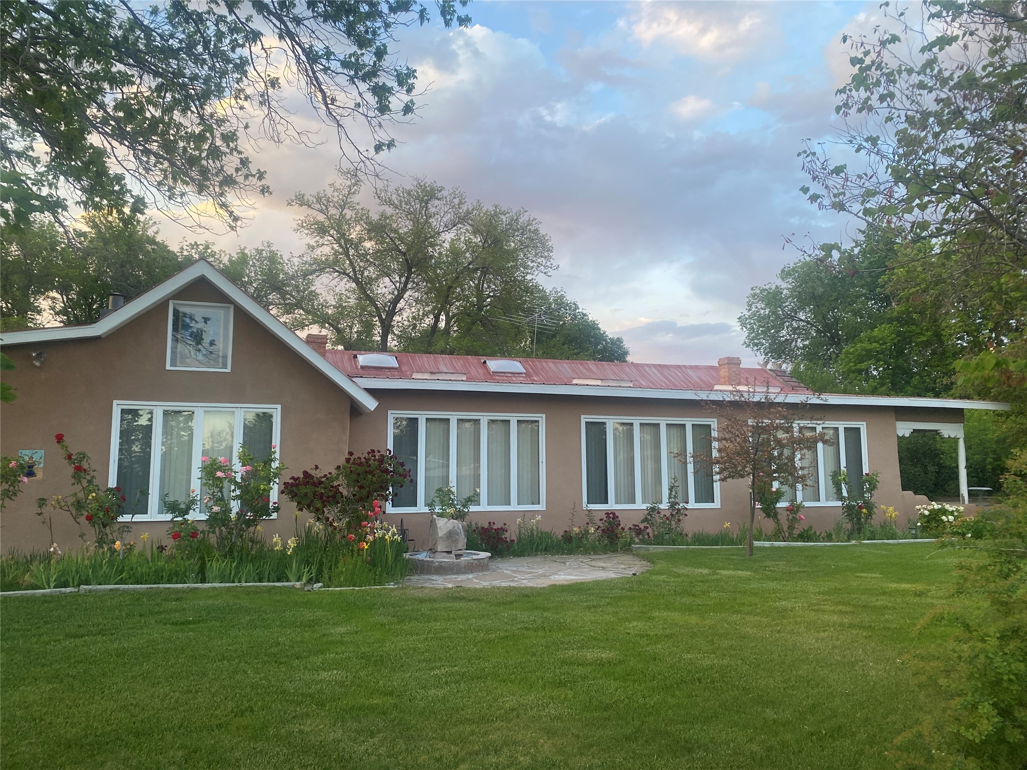 Historic Santa Cruz Double Adobe Hacienda build approximately 1886. This exquisite home has incomparable lush landscaping including several mature trees, productive grapevines, lawns, lovely flowerbeds and fruit trees creating a sanctuary of beauty, privacy and serenity. the Main House as 2 bedrooms and 2 and 1/2 baths. The Estate includes a 2 bedroom, 1 bath Casita, which is private and surrounded by beautiful landscaping and trees. A large portal, which is shady and comfortable in summer. both the House and Casita feature lovely hand crafted, carved southwestern doors made by the last owner who was a woodworker of some renown. His adobe workshop is spacious and has a woodstove and 1/2 bath. Also on the property is a two-story barn which houses an upper studio and one at ground level. The studio has power but no plumbing. A 2-bay carport has a storage area which can serve as a garden shed. This is a once in a lifetime opportunity to love care for and enjoy an exceptional Estate in Beautiful Santa Cruz. The Main house is reported by older locals to have been the residence of a French Priest who served at the Historic La Iglesia de Sant Cruz de la Canada which was built in 1773. There is an over 100-year pecan tree which is still standing. A stately St Joseph carved by noted carver, Henry Austin from an old tree watches over.