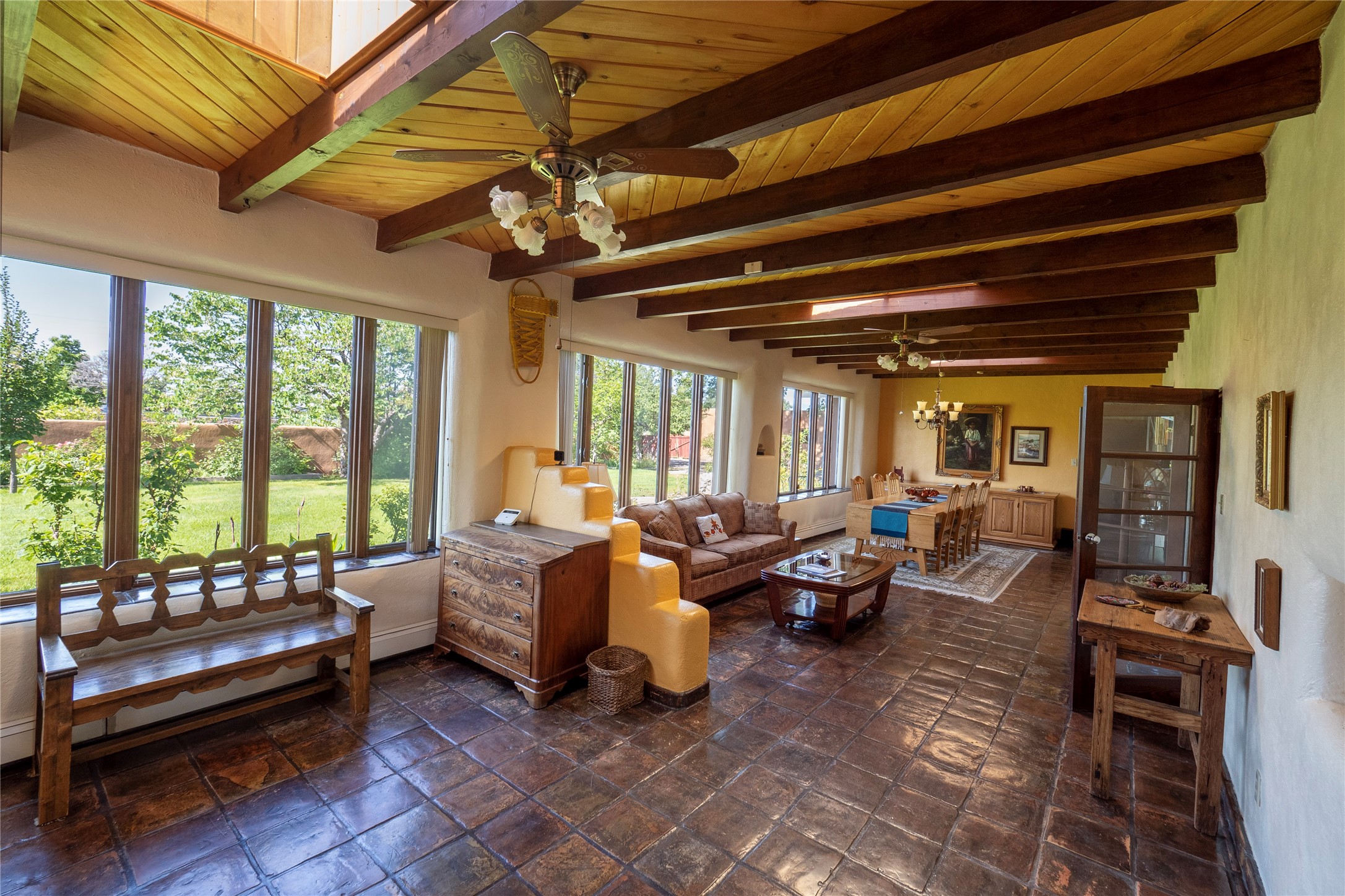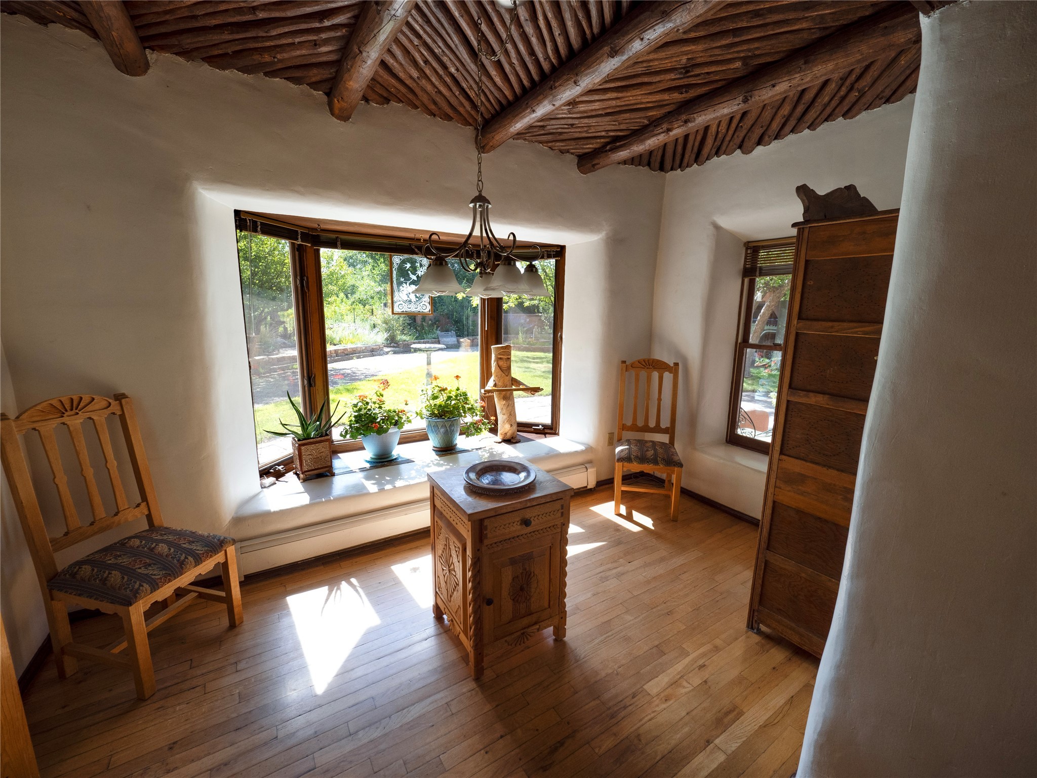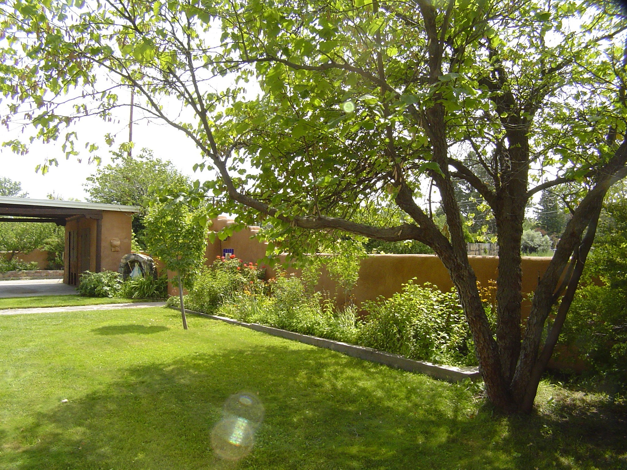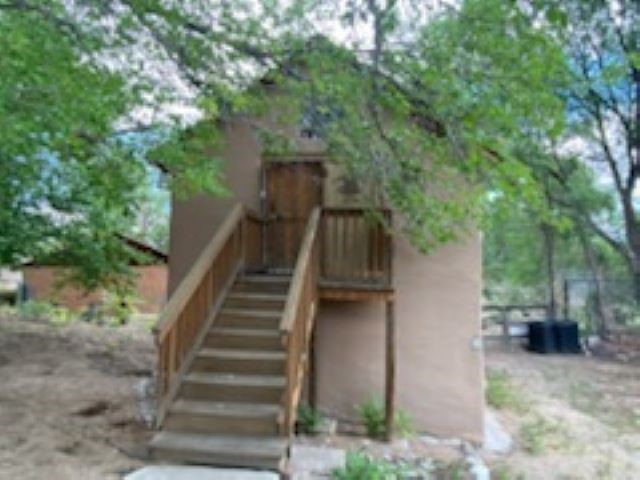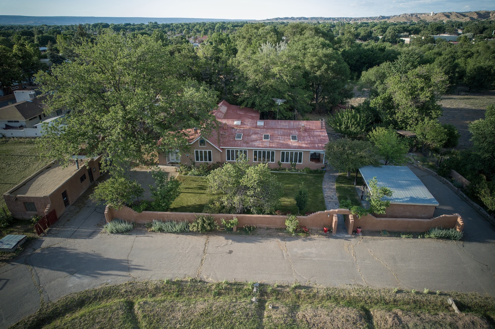 Historic Santa Cruz Double Adobe Hacienda build approximately 1886. This exquisite home has incomparable lush landscaping including several mature trees, productive grapevines, lawns, lovely flowerbeds and fruit trees creating a sanctuary of beauty, privacy and serenity. the Main House as 2 bedrooms and 2 and 1/2 baths. The Estate includes a 2 bedroom, 1 bath Casita, which is private and surrounded by beautiful landscaping and trees. A large portal, which is shady and comfortable in summer. both the House and Casita feature lovely hand crafted, carved southwestern doors made by the last owner who was a woodworker of some renown. His adobe workshop is spacious and has a woodstove and 1/2 bath. Also on the property is a two-story barn which houses an upper studio and one at ground level. The studio has power but no plumbing. A 2-bay carport has a storage area which can serve as a garden shed. This is a once in a lifetime opportunity to love care for and enjoy an exceptional Estate in Beautiful Santa Cruz. The Main house is reported by older locals to have been the residence of a French Priest who served at the Historic La Iglesia de Sant Cruz de la Canada which was built in 1773. There is an over 100-year pecan tree which is still standing. A stately St Joseph carved by noted carver, Henry Austin from an old tree watches over.