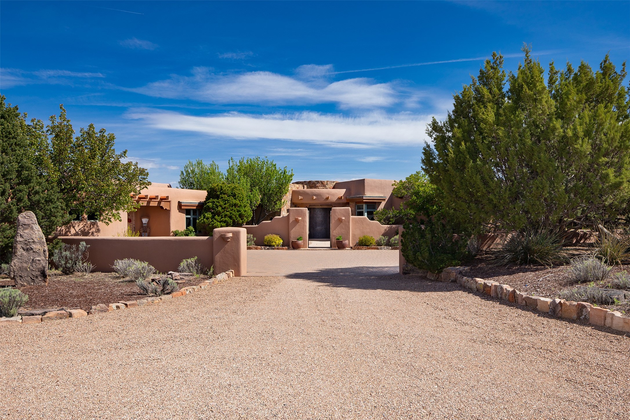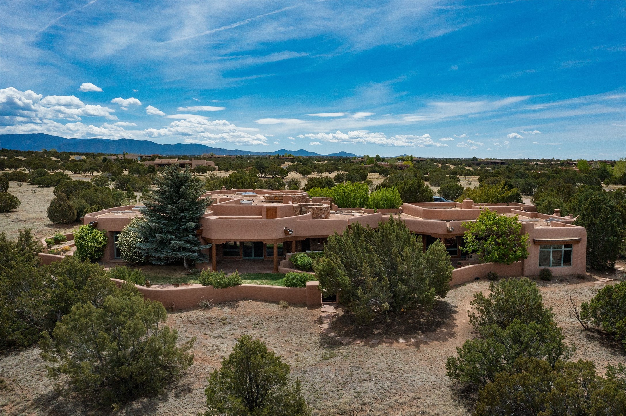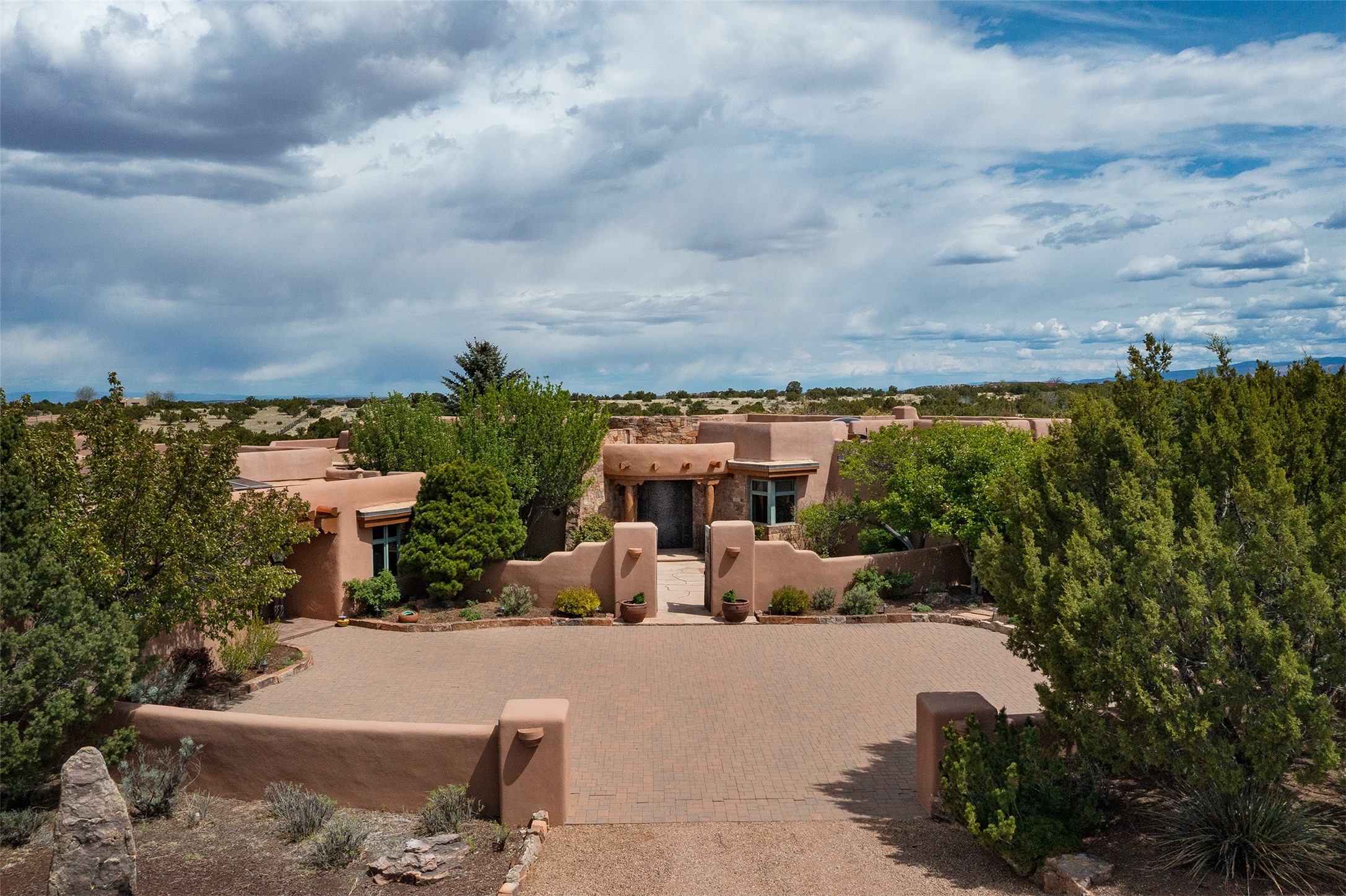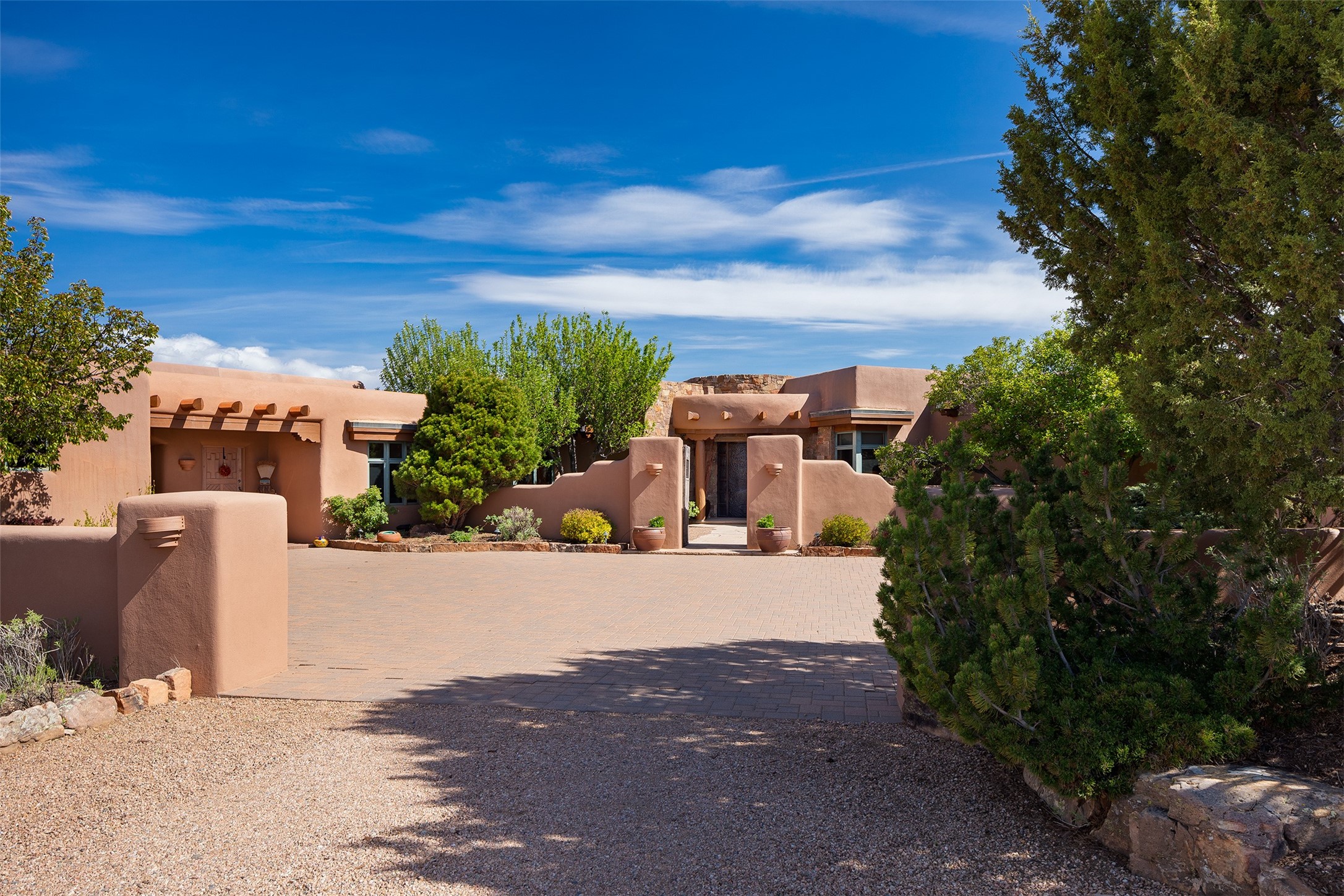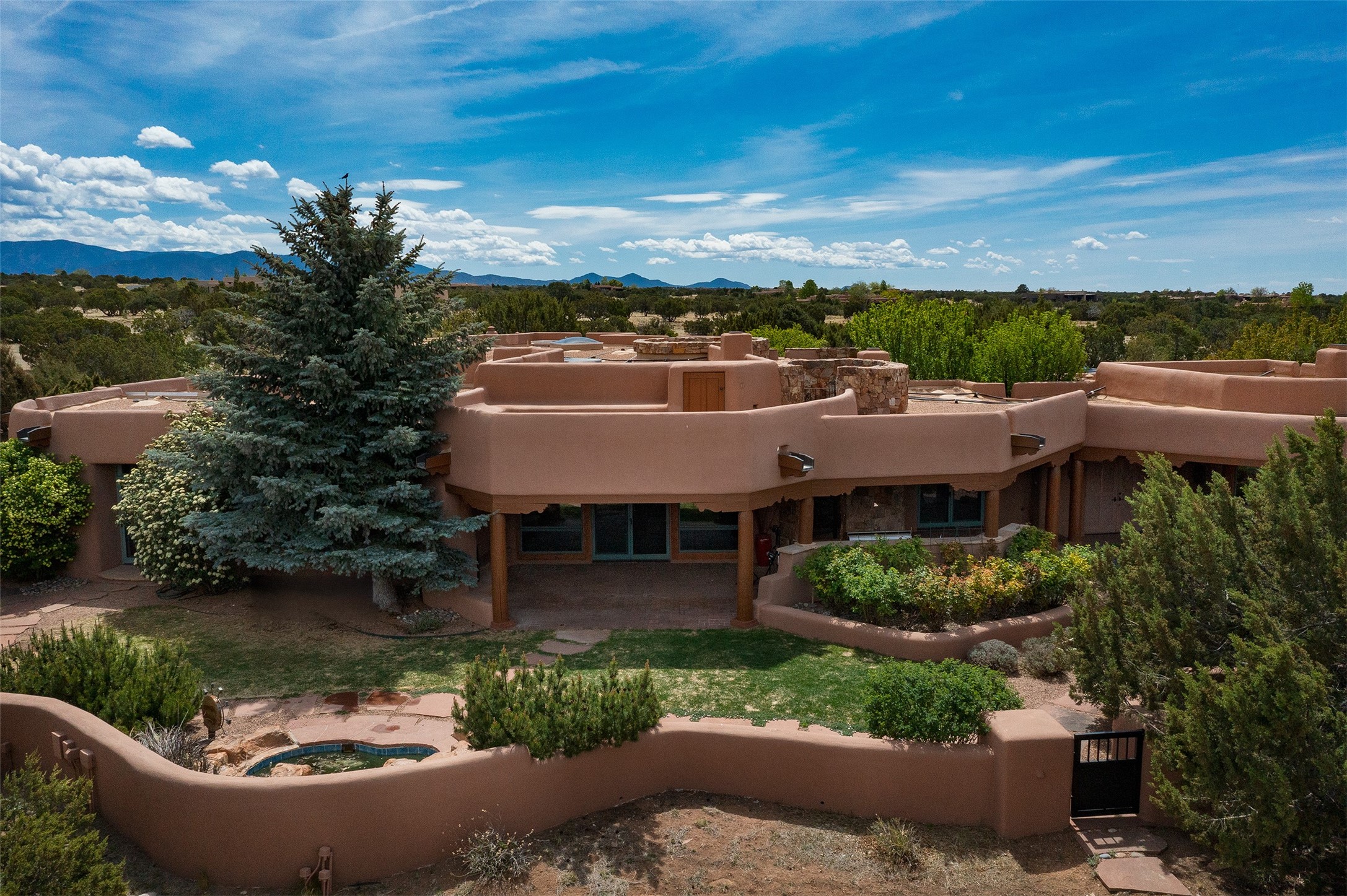 One of the most captivating estates in the famed community Las Campanas and throughout Santa Fe, this exceptional 4-bedroom home, plus office, with a guest house, excites with expansive Jemez and Sangre de Cristo Mountain views and impressive architecture. Privately sited on a rare, 5.25-acre view lot, in resort-like setting, this fabulous adobe-constructed home offers the ultimate Santa Fe lifestyle. Upon entering the 4,430 square foot main house with 2 bedrooms, plus an office, the exceptional experience begins with a welcoming front entrance courtyard, complete with vibrant landscape and a tranquil water feature. Ideal for entertaining, the main house delights with a stunning formal living room and dining room, with majestic Jemez and Sangre Mountain views, fireplace, wet bar and portal access, all of which opens to the well-appointed kitchen with large pantry and spacious casual living room with a fireplace and breakfast dining area. The primary suite impresses with views, fireplace, seating area, outdoor access, a spa-like bath with soft natural light and a large walk-in closet. Additional design features include a grand office with a fireplace and a private guest bedroom ensuite with views and outdoor access. Ideal for guests, the fully independent 1,688 square foot guest house offers 2 bedrooms, 2 baths, a full kitchen, and a great room living area, complete with a washer/dryer and a 1-car garage. The superior outdoor living experience is enhanced with lush, surround landscape, an in-ground spa, an outdoor kitchen, fully enclosed courtyards with gardens and surround covered portals, a fireplace and a substantial roof deck with surround views. Extraordinary finishes include an iconic Hogan front entrance ceiling, creamy plaster walls, flagstone flooring and the highest level of timeless craftsmanship. Less than 15 minutes to the Plaza, and within close proximity to the Club at Las Campanas, this exquisite estate is move-in ready and not to be missed.