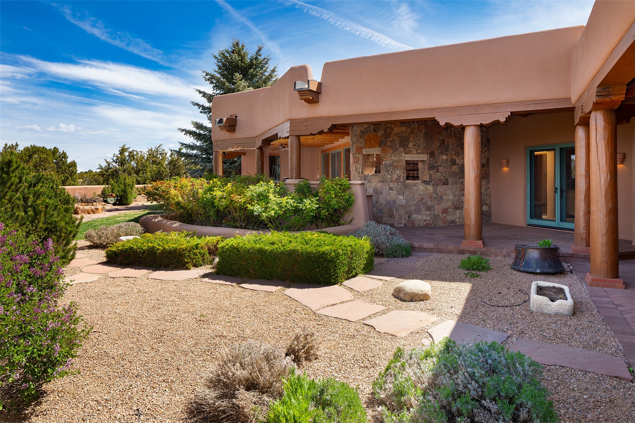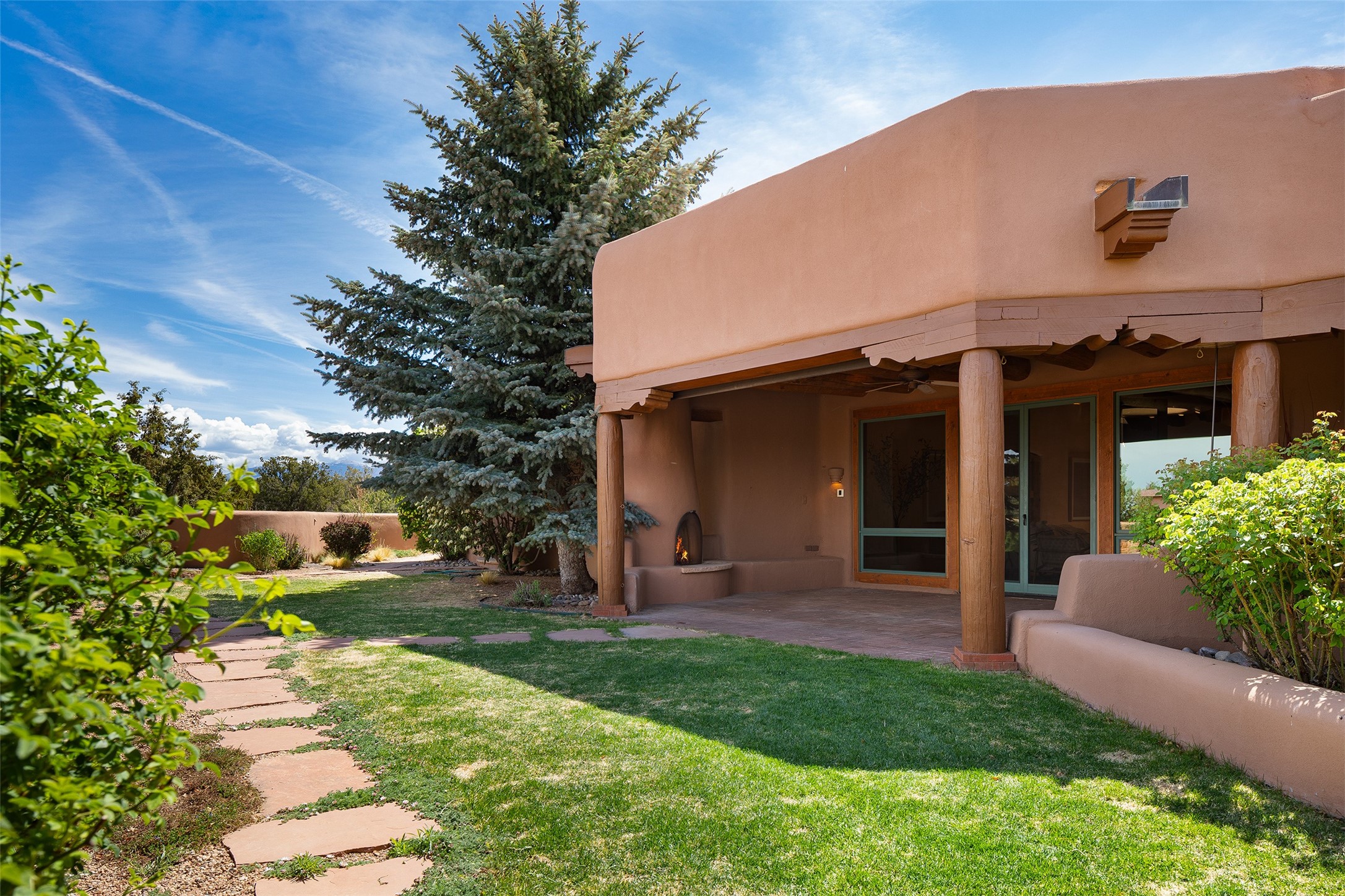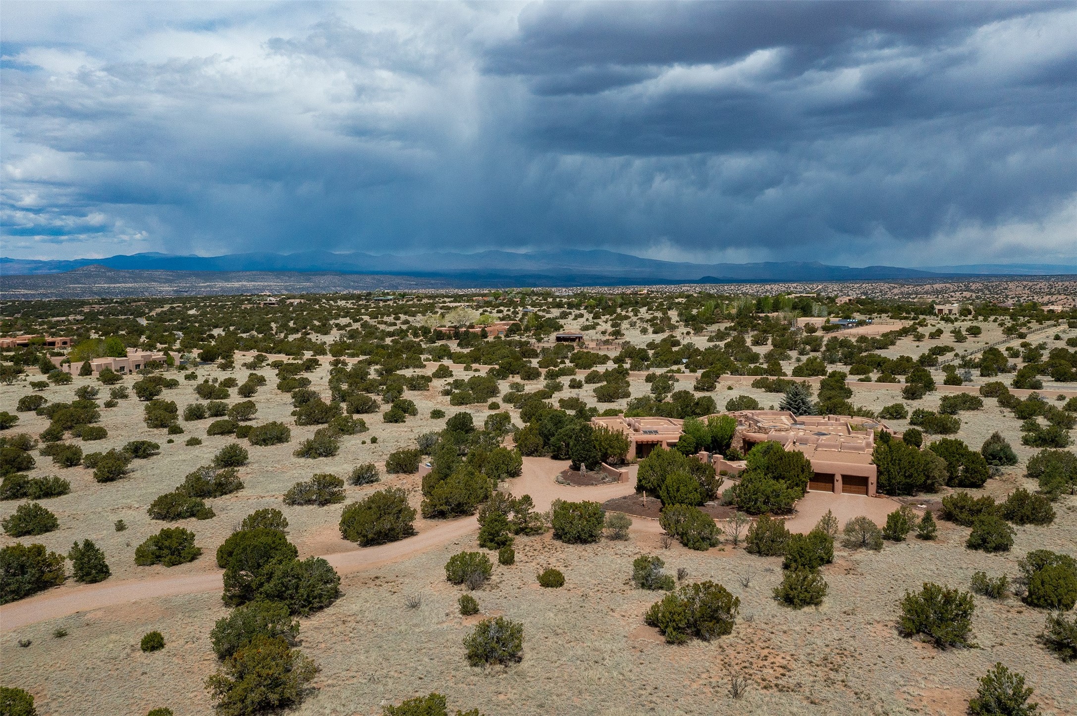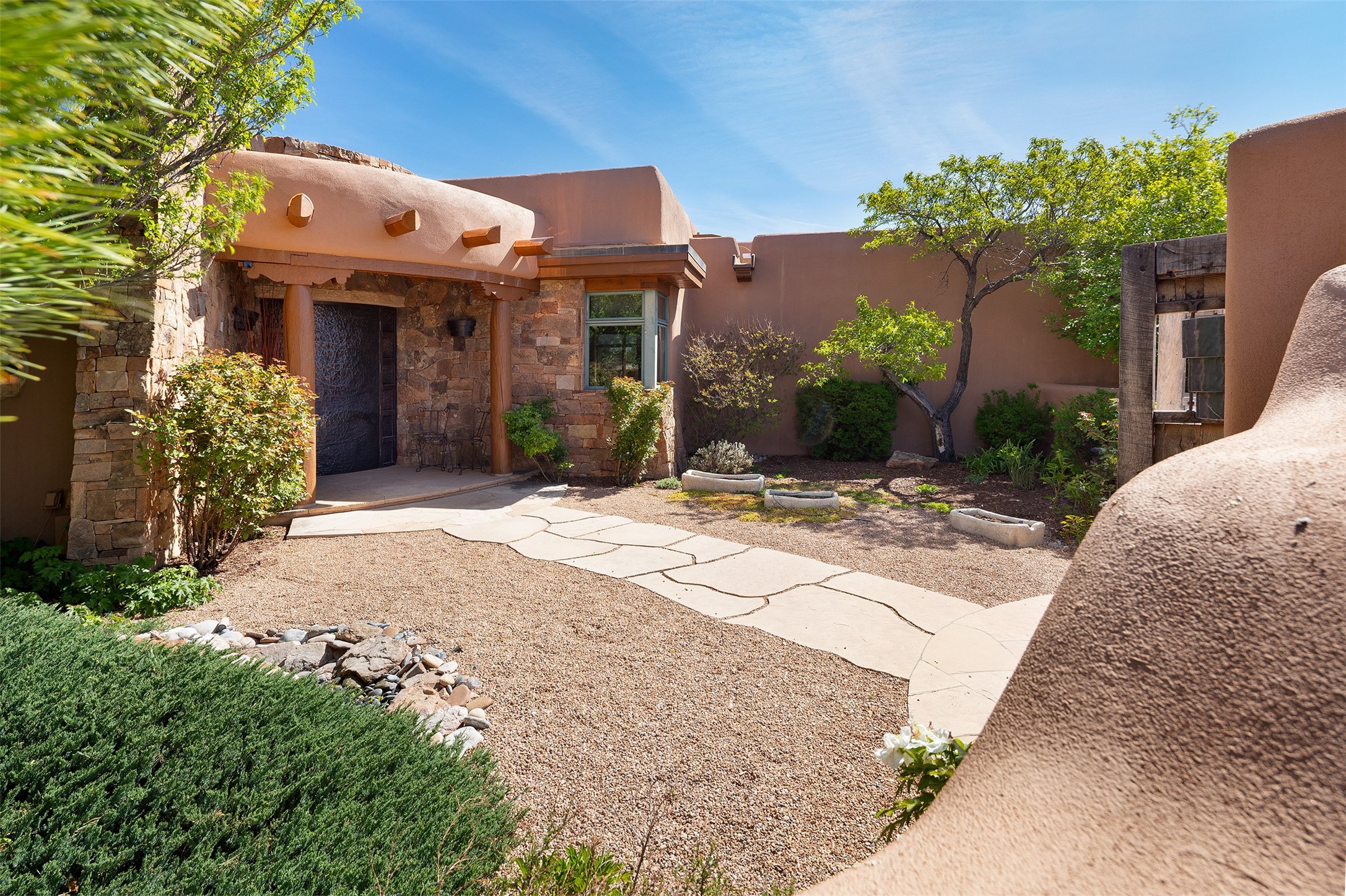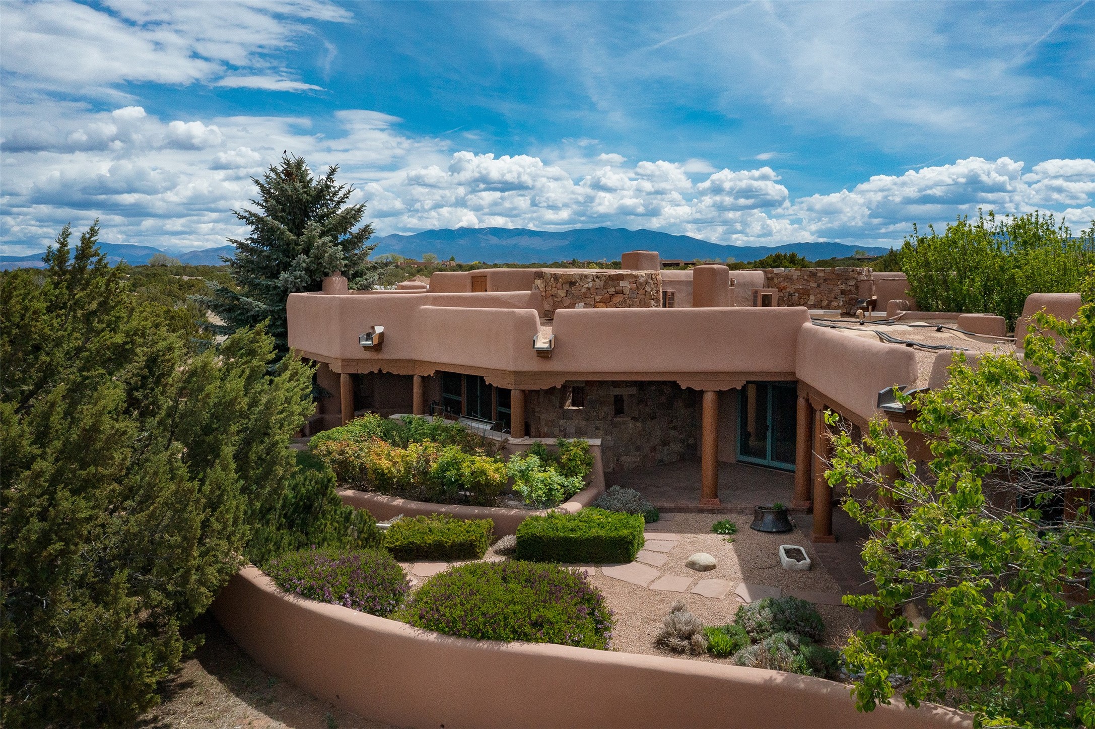 One of the most captivating estates in the famed community Las Campanas and throughout Santa Fe, this exceptional 4-bedroom home, plus office, with a guest house, excites with expansive Jemez and Sangre de Cristo Mountain views and impressive architecture. Privately sited on a rare, 5.25-acre view lot, in resort-like setting, this fabulous adobe-constructed home offers the ultimate Santa Fe lifestyle. Upon entering the 4,430 square foot main house with 2 bedrooms, plus an office, the exceptional experience begins with a welcoming front entrance courtyard, complete with vibrant landscape and a tranquil water feature. Ideal for entertaining, the main house delights with a stunning formal living room and dining room, with majestic Jemez and Sangre Mountain views, fireplace, wet bar and portal access, all of which opens to the well-appointed kitchen with large pantry and spacious casual living room with a fireplace and breakfast dining area. The primary suite impresses with views, fireplace, seating area, outdoor access, a spa-like bath with soft natural light and a large walk-in closet. Additional design features include a grand office with a fireplace and a private guest bedroom ensuite with views and outdoor access. Ideal for guests, the fully independent 1,688 square foot guest house offers 2 bedrooms, 2 baths, a full kitchen, and a great room living area, complete with a washer/dryer and a 1-car garage. The superior outdoor living experience is enhanced with lush, surround landscape, an in-ground spa, an outdoor kitchen, fully enclosed courtyards with gardens and surround covered portals, a fireplace and a substantial roof deck with surround views. Extraordinary finishes include an iconic Hogan front entrance ceiling, creamy plaster walls, flagstone flooring and the highest level of timeless craftsmanship. Less than 15 minutes to the Plaza, and within close proximity to the Club at Las Campanas, this exquisite estate is move-in ready and not to be missed.