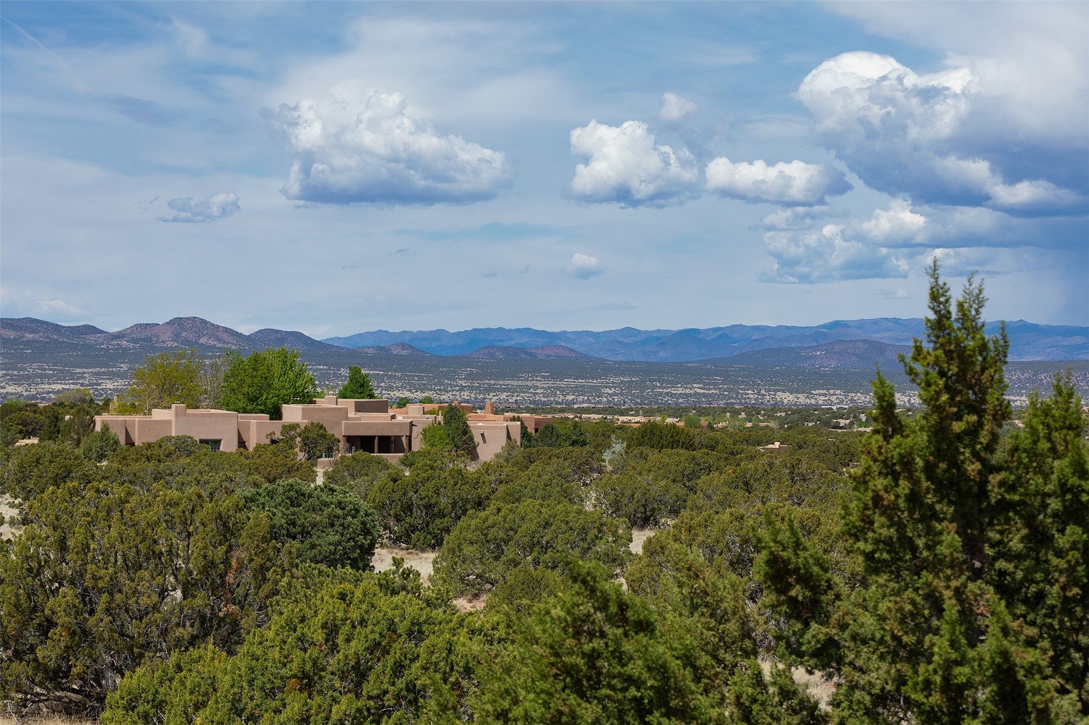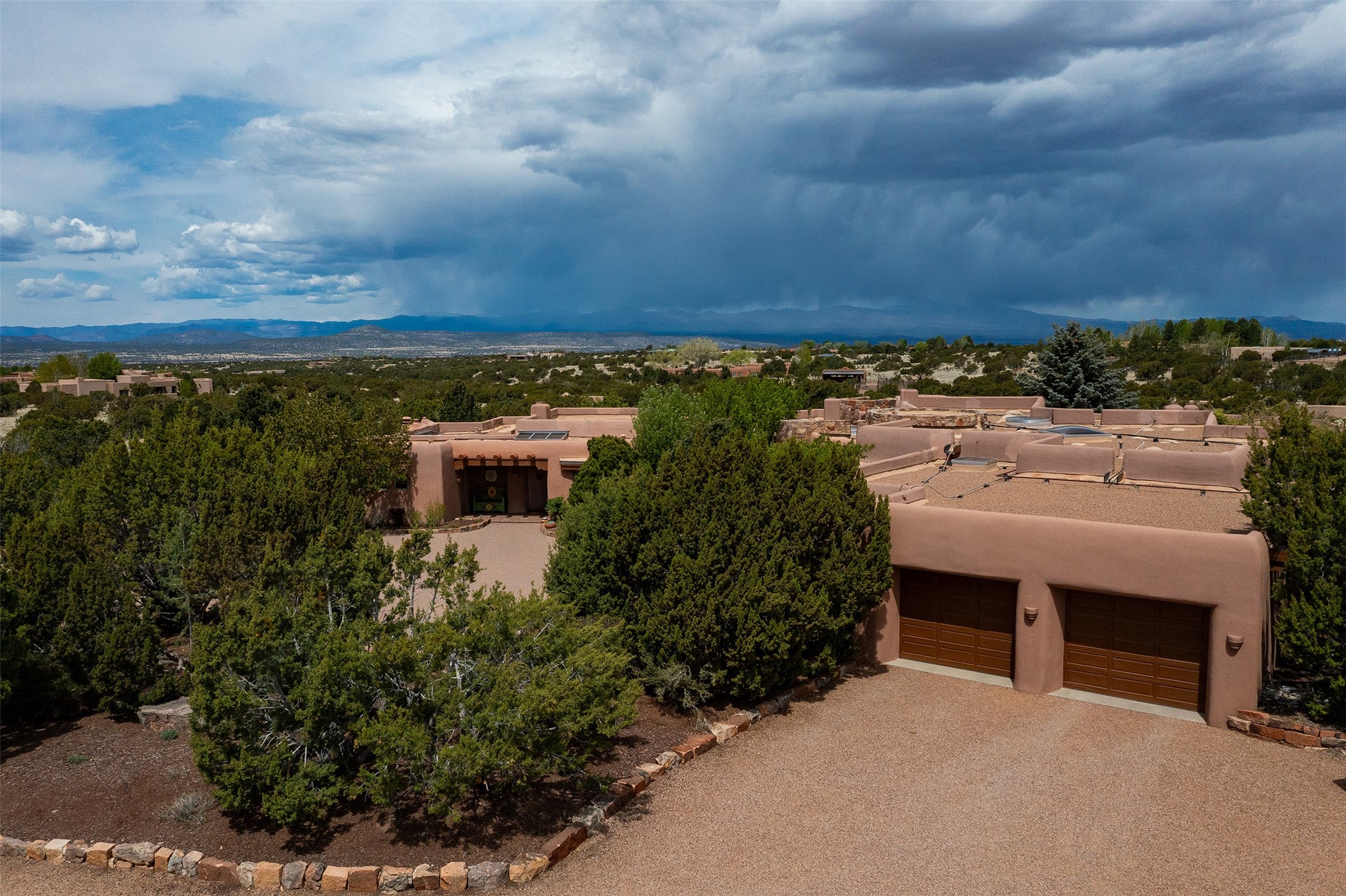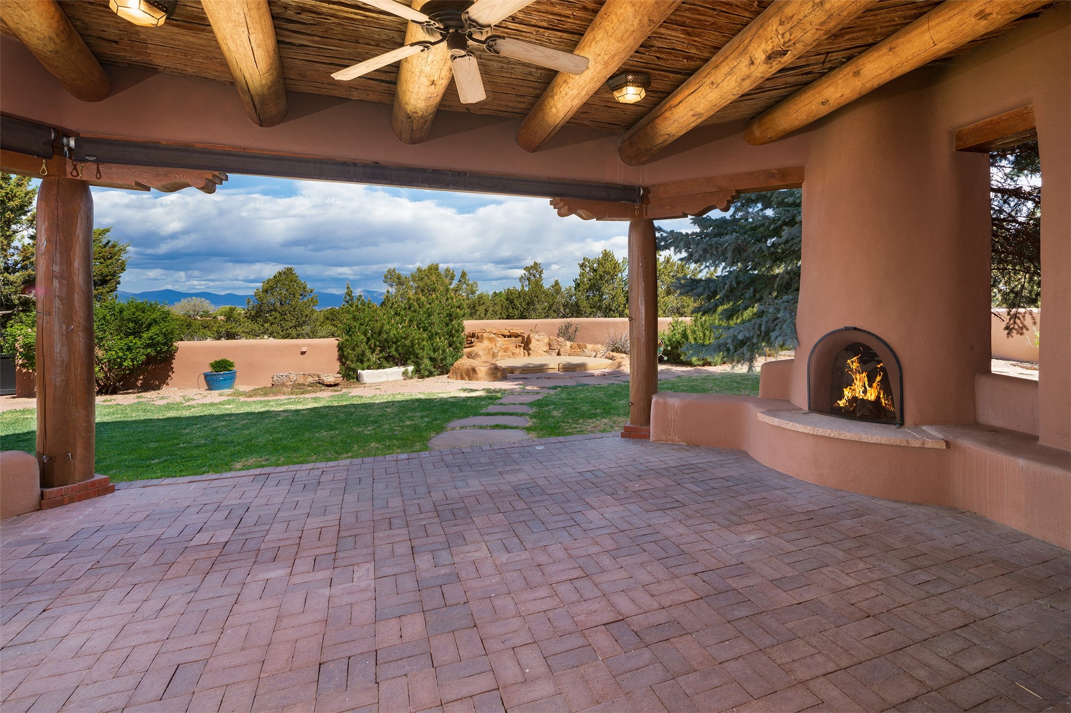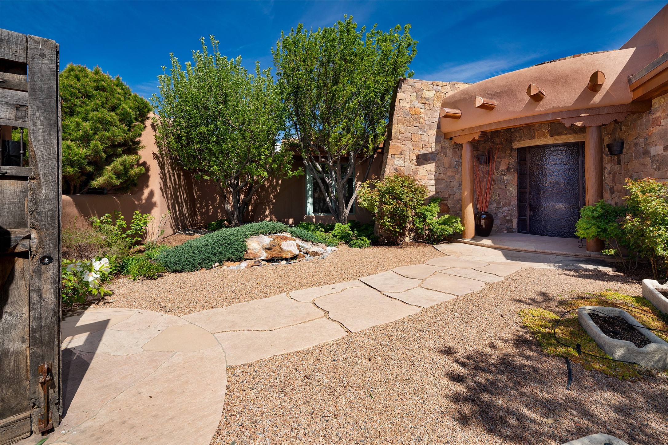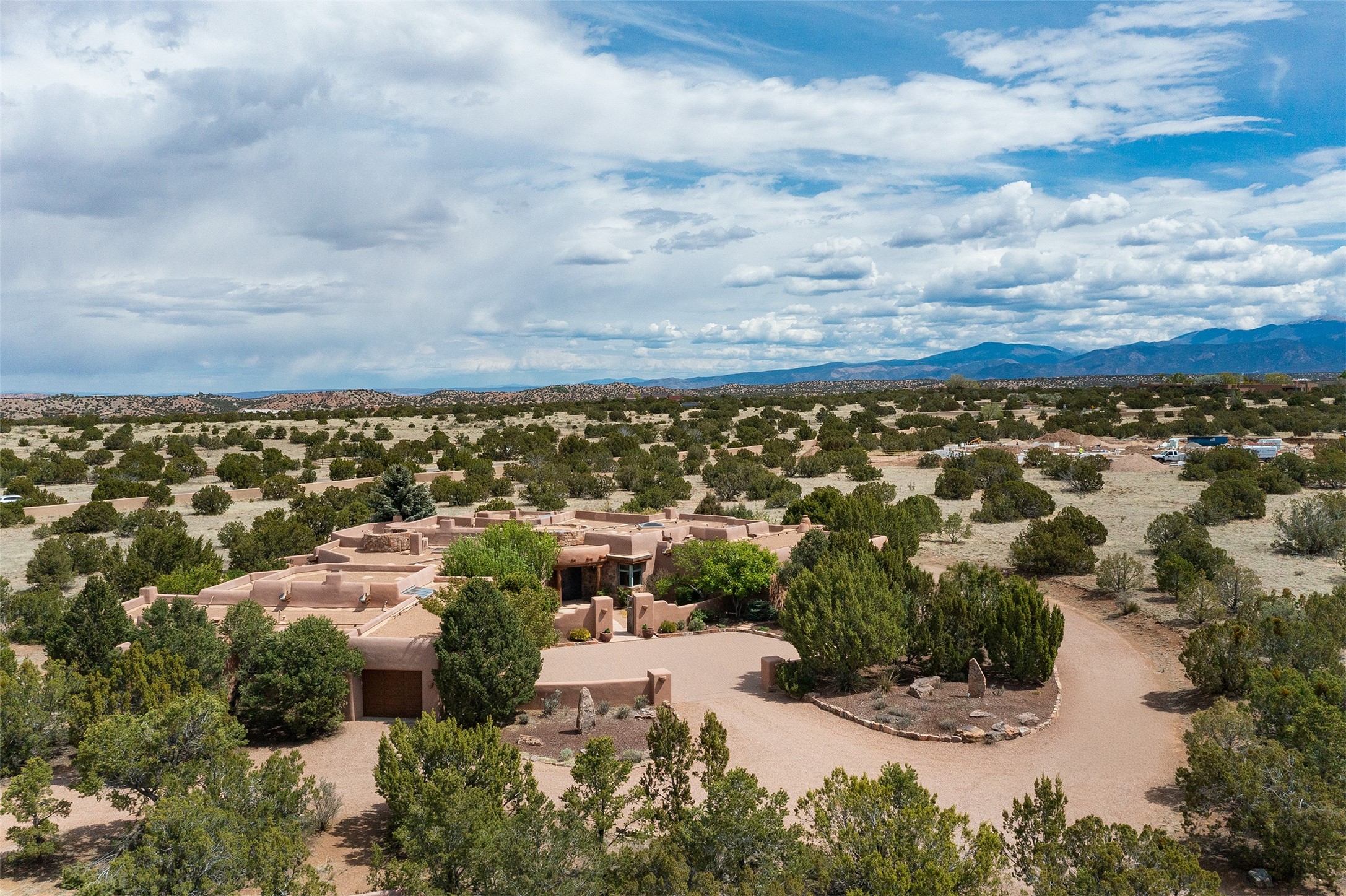 One of the most captivating estates in the famed community Las Campanas and throughout Santa Fe, this exceptional 4-bedroom home, plus office, with a guest house, excites with expansive Jemez and Sangre de Cristo Mountain views and impressive architecture. Privately sited on a rare, 5.25-acre view lot, in resort-like setting, this fabulous adobe-constructed home offers the ultimate Santa Fe lifestyle. Upon entering the 4,430 square foot main house with 2 bedrooms, plus an office, the exceptional experience begins with a welcoming front entrance courtyard, complete with vibrant landscape and a tranquil water feature. Ideal for entertaining, the main house delights with a stunning formal living room and dining room, with majestic Jemez and Sangre Mountain views, fireplace, wet bar and portal access, all of which opens to the well-appointed kitchen with large pantry and spacious casual living room with a fireplace and breakfast dining area. The primary suite impresses with views, fireplace, seating area, outdoor access, a spa-like bath with soft natural light and a large walk-in closet. Additional design features include a grand office with a fireplace and a private guest bedroom ensuite with views and outdoor access. Ideal for guests, the fully independent 1,688 square foot guest house offers 2 bedrooms, 2 baths, a full kitchen, and a great room living area, complete with a washer/dryer and a 1-car garage. The superior outdoor living experience is enhanced with lush, surround landscape, an in-ground spa, an outdoor kitchen, fully enclosed courtyards with gardens and surround covered portals, a fireplace and a substantial roof deck with surround views. Extraordinary finishes include an iconic Hogan front entrance ceiling, creamy plaster walls, flagstone flooring and the highest level of timeless craftsmanship. Less than 15 minutes to the Plaza, and within close proximity to the Club at Las Campanas, this exquisite estate is move-in ready and not to be missed.