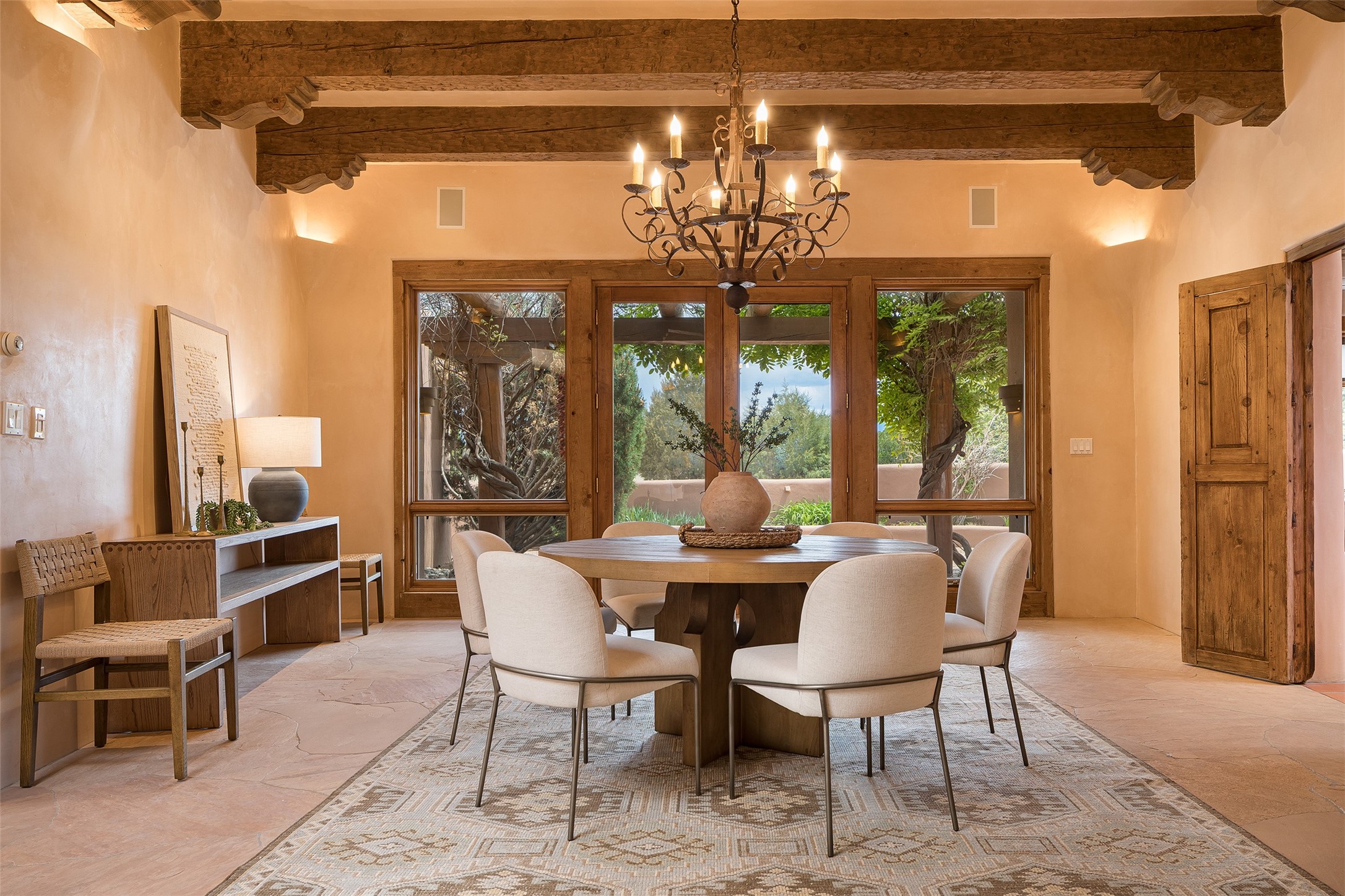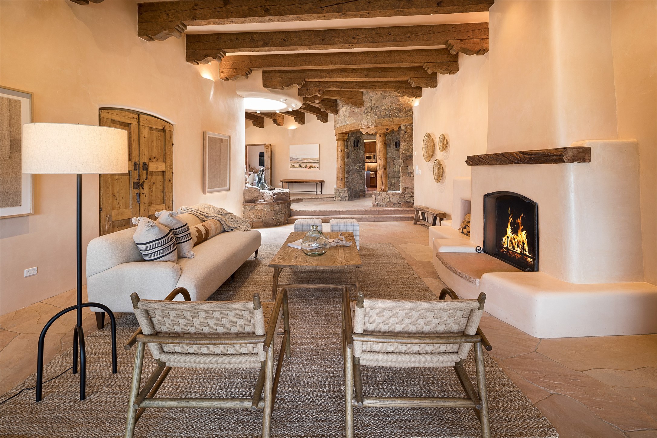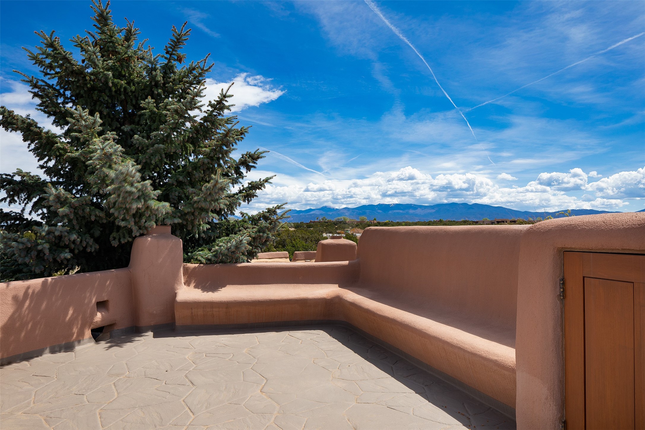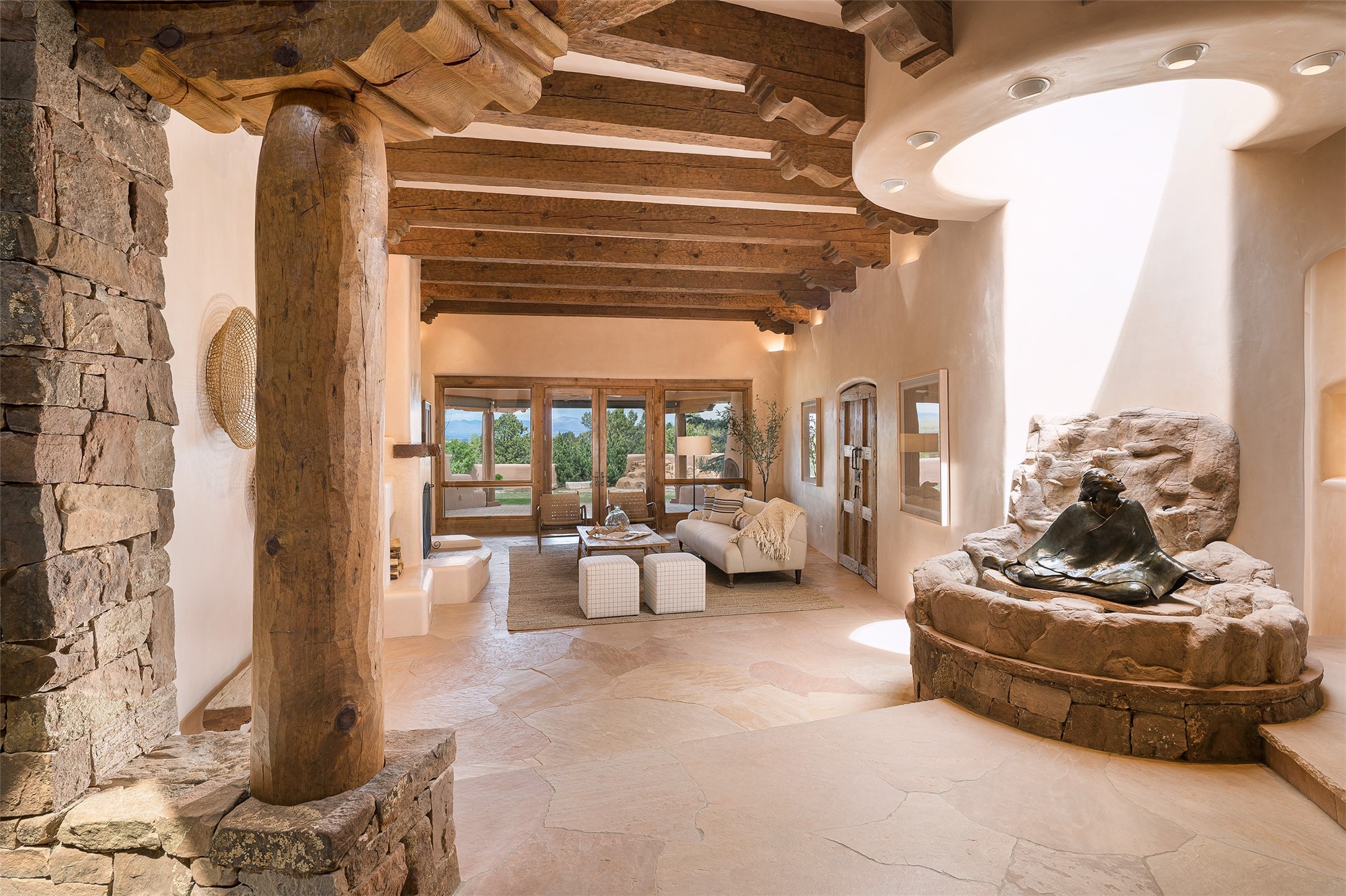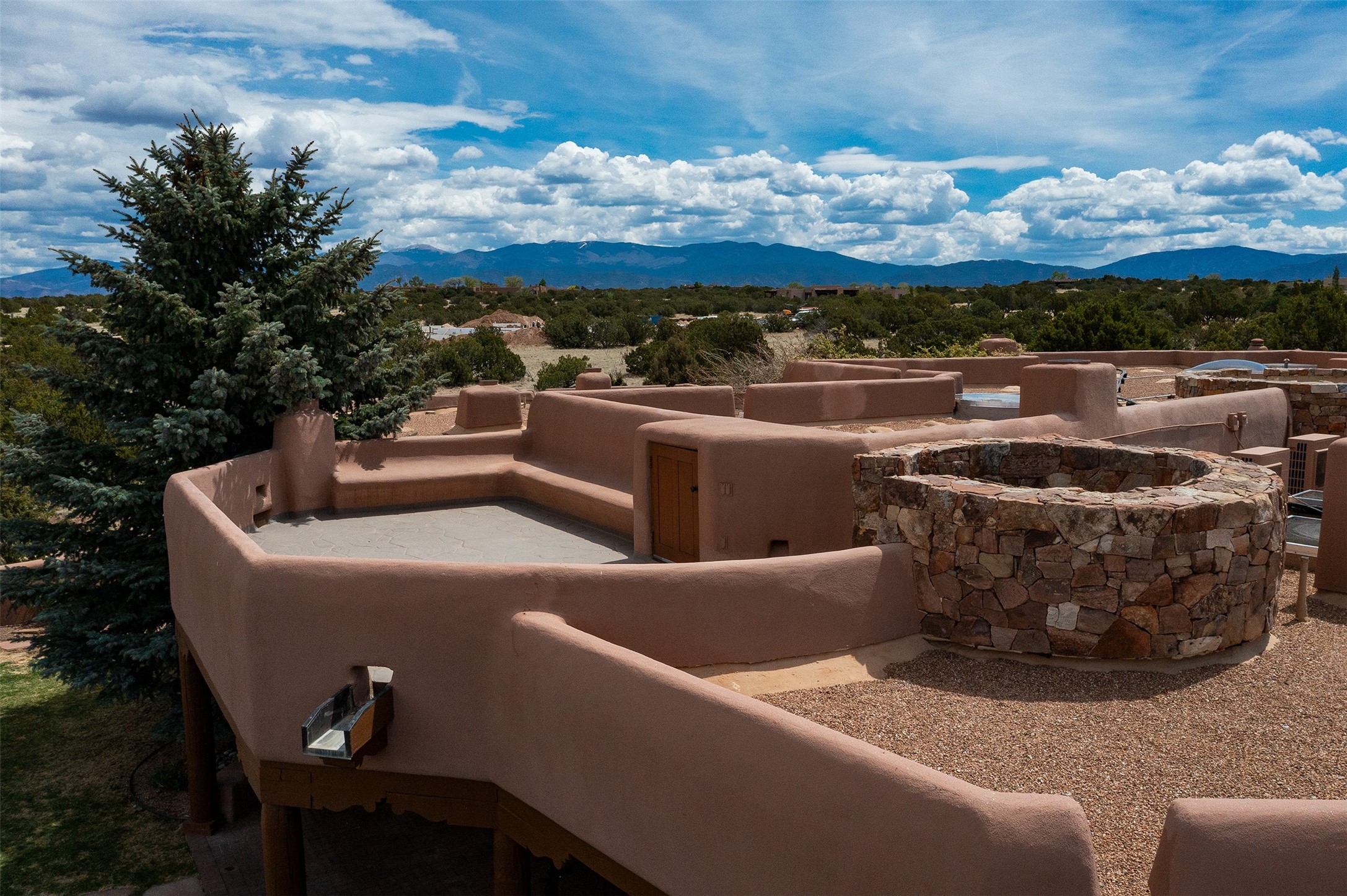 One of the most captivating estates in the famed community Las Campanas and throughout Santa Fe, this exceptional 4-bedroom home, plus office, with a guest house, excites with expansive Jemez and Sangre de Cristo Mountain views and impressive architecture. Privately sited on a rare, 5.25-acre view lot, in resort-like setting, this fabulous adobe-constructed home offers the ultimate Santa Fe lifestyle. Upon entering the 4,430 square foot main house with 2 bedrooms, plus an office, the exceptional experience begins with a welcoming front entrance courtyard, complete with vibrant landscape and a tranquil water feature. Ideal for entertaining, the main house delights with a stunning formal living room and dining room, with majestic Jemez and Sangre Mountain views, fireplace, wet bar and portal access, all of which opens to the well-appointed kitchen with large pantry and spacious casual living room with a fireplace and breakfast dining area. The primary suite impresses with views, fireplace, seating area, outdoor access, a spa-like bath with soft natural light and a large walk-in closet. Additional design features include a grand office with a fireplace and a private guest bedroom ensuite with views and outdoor access. Ideal for guests, the fully independent 1,688 square foot guest house offers 2 bedrooms, 2 baths, a full kitchen, and a great room living area, complete with a washer/dryer and a 1-car garage. The superior outdoor living experience is enhanced with lush, surround landscape, an in-ground spa, an outdoor kitchen, fully enclosed courtyards with gardens and surround covered portals, a fireplace and a substantial roof deck with surround views. Extraordinary finishes include an iconic Hogan front entrance ceiling, creamy plaster walls, flagstone flooring and the highest level of timeless craftsmanship. Less than 15 minutes to the Plaza, and within close proximity to the Club at Las Campanas, this exquisite estate is move-in ready and not to be missed.