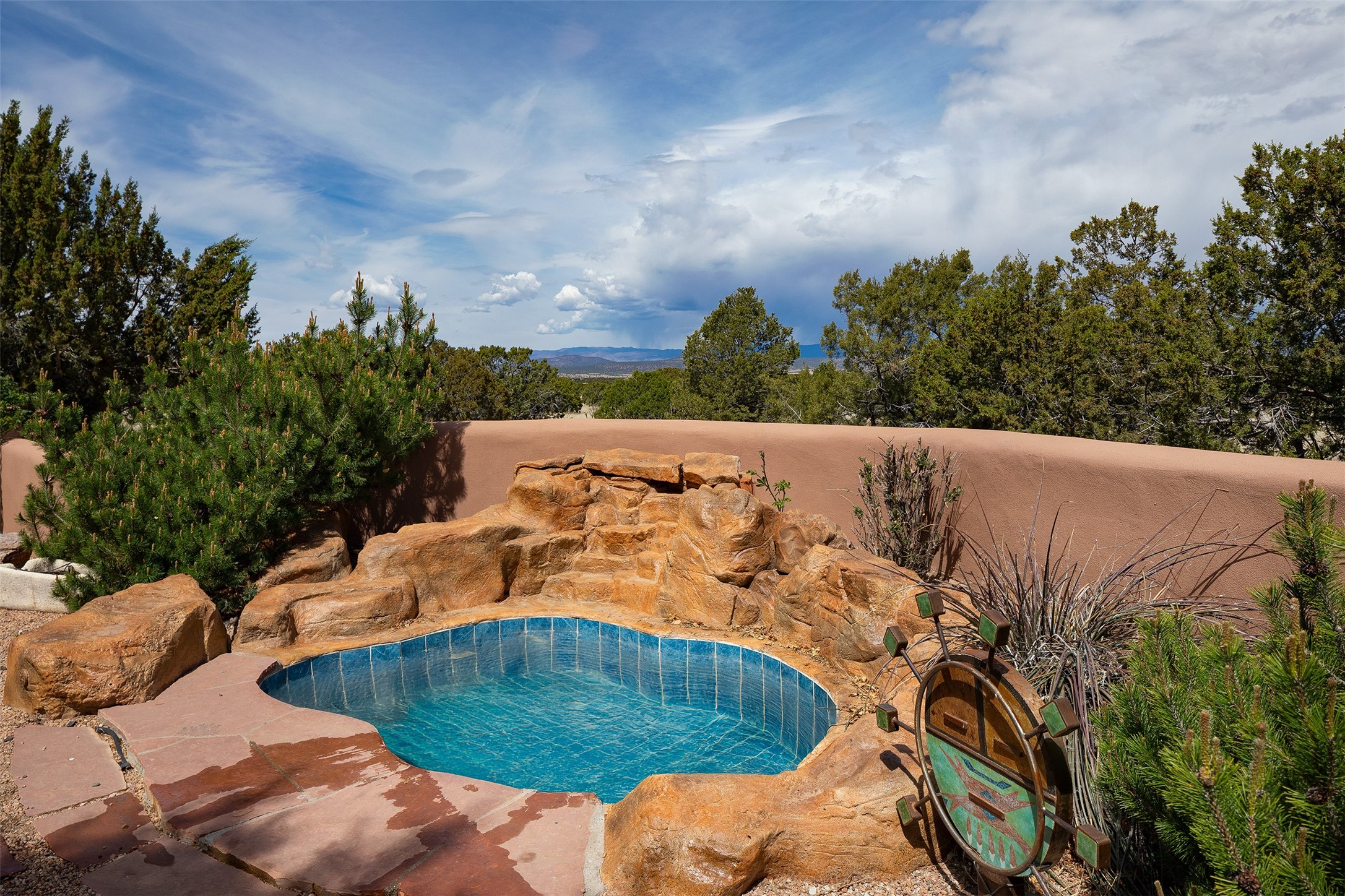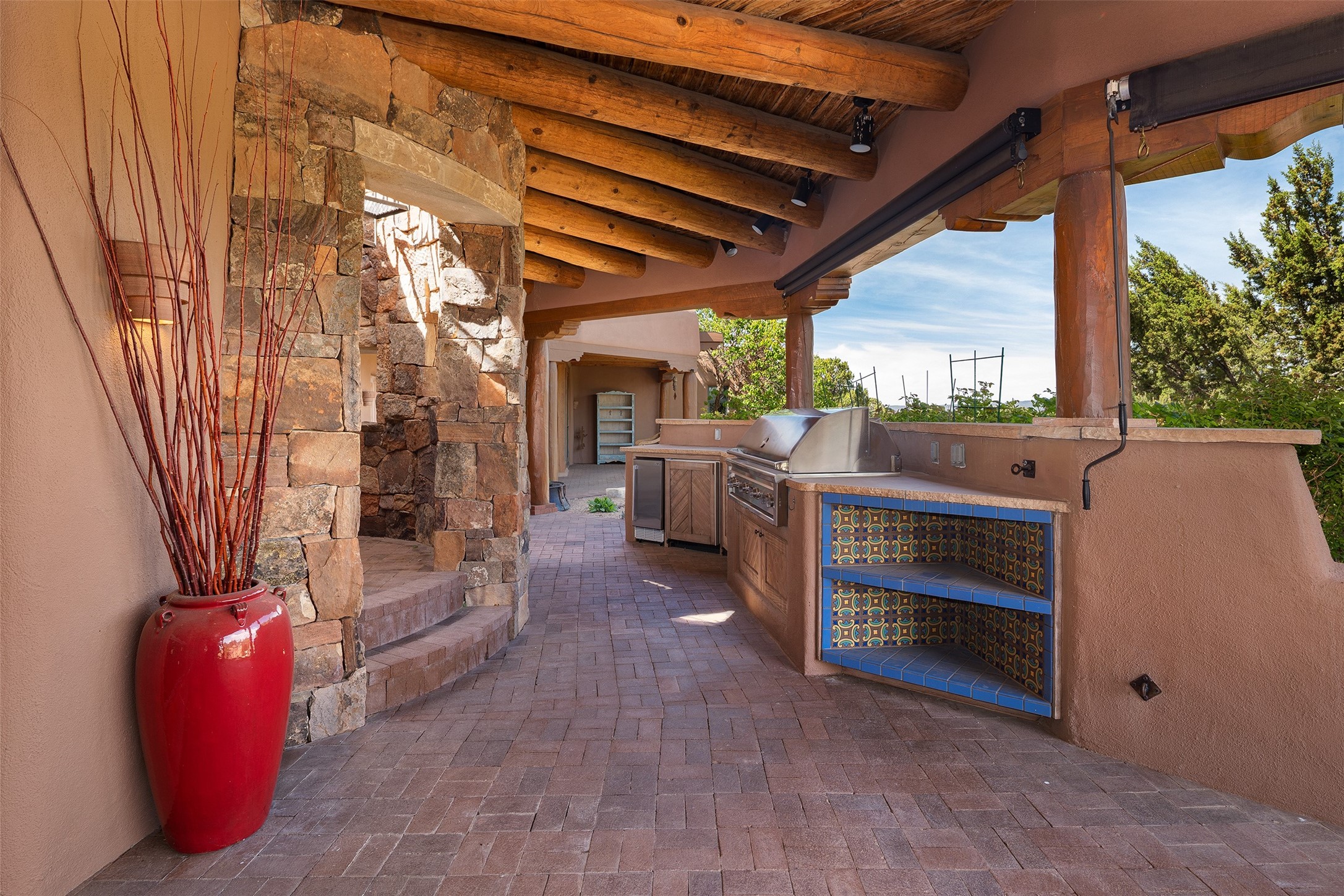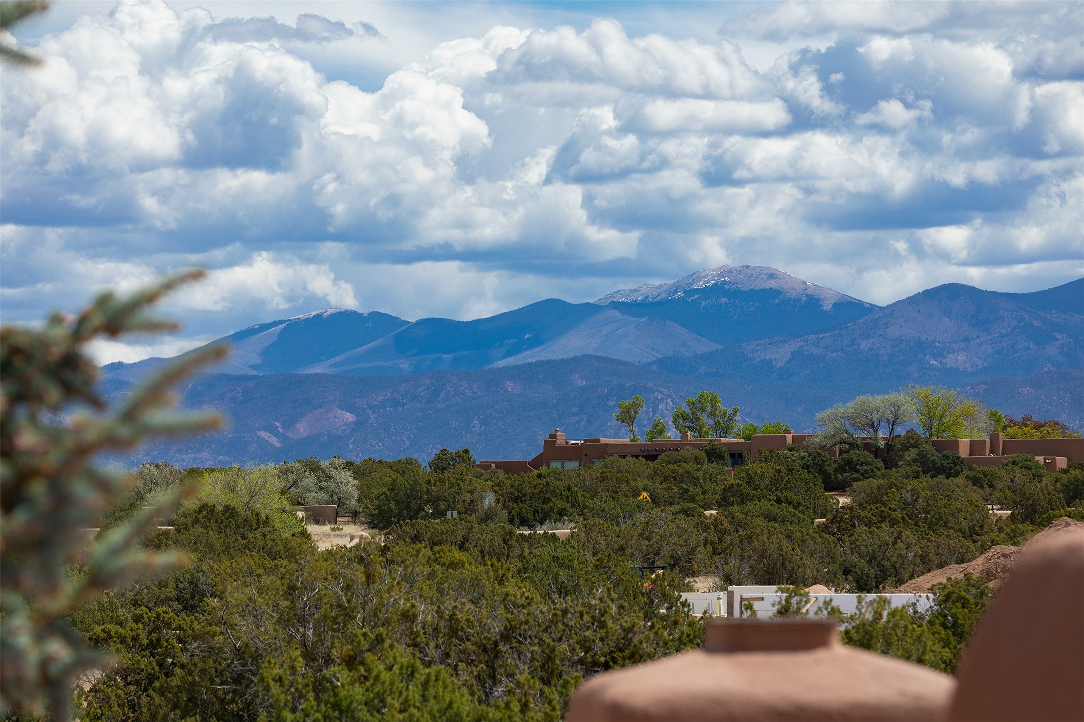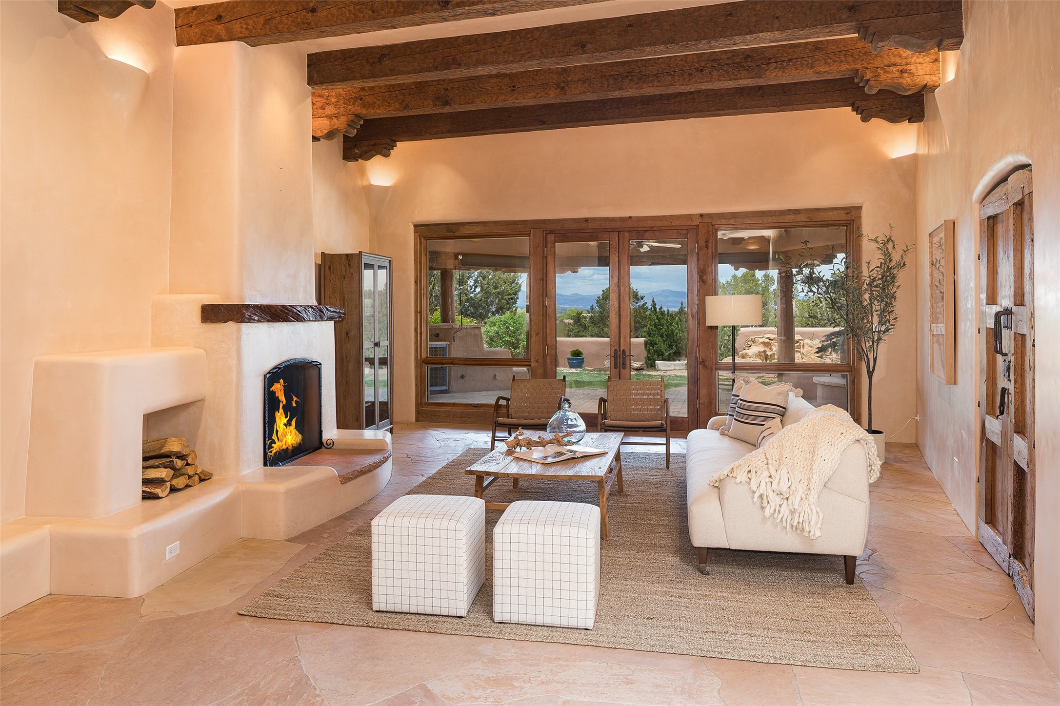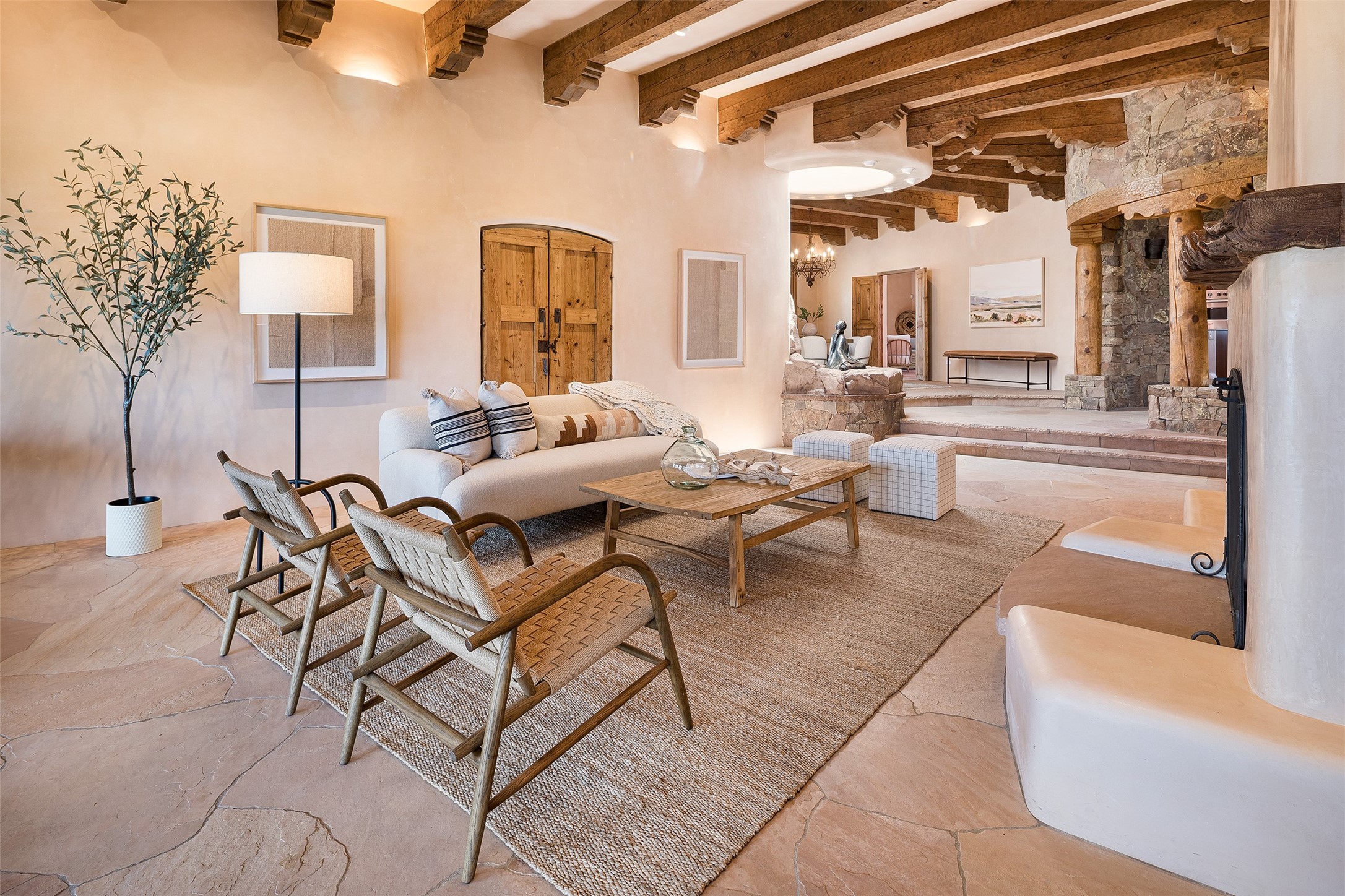 One of the most captivating estates in the famed community Las Campanas and throughout Santa Fe, this exceptional 4-bedroom home, plus office, with a guest house, excites with expansive Jemez and Sangre de Cristo Mountain views and impressive architecture. Privately sited on a rare, 5.25-acre view lot, in resort-like setting, this fabulous adobe-constructed home offers the ultimate Santa Fe lifestyle. Upon entering the 4,430 square foot main house with 2 bedrooms, plus an office, the exceptional experience begins with a welcoming front entrance courtyard, complete with vibrant landscape and a tranquil water feature. Ideal for entertaining, the main house delights with a stunning formal living room and dining room, with majestic Jemez and Sangre Mountain views, fireplace, wet bar and portal access, all of which opens to the well-appointed kitchen with large pantry and spacious casual living room with a fireplace and breakfast dining area. The primary suite impresses with views, fireplace, seating area, outdoor access, a spa-like bath with soft natural light and a large walk-in closet. Additional design features include a grand office with a fireplace and a private guest bedroom ensuite with views and outdoor access. Ideal for guests, the fully independent 1,688 square foot guest house offers 2 bedrooms, 2 baths, a full kitchen, and a great room living area, complete with a washer/dryer and a 1-car garage. The superior outdoor living experience is enhanced with lush, surround landscape, an in-ground spa, an outdoor kitchen, fully enclosed courtyards with gardens and surround covered portals, a fireplace and a substantial roof deck with surround views. Extraordinary finishes include an iconic Hogan front entrance ceiling, creamy plaster walls, flagstone flooring and the highest level of timeless craftsmanship. Less than 15 minutes to the Plaza, and within close proximity to the Club at Las Campanas, this exquisite estate is move-in ready and not to be missed.