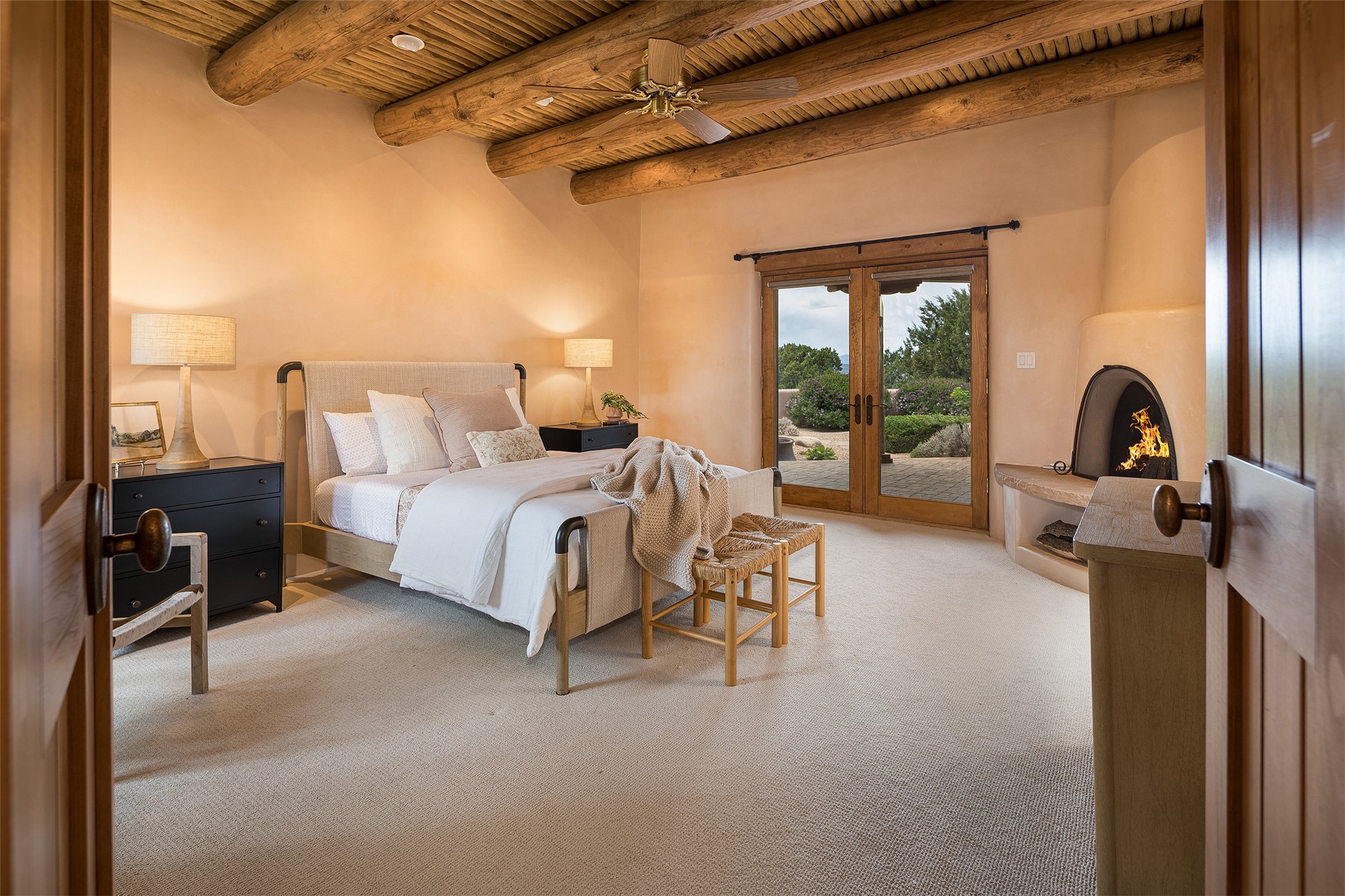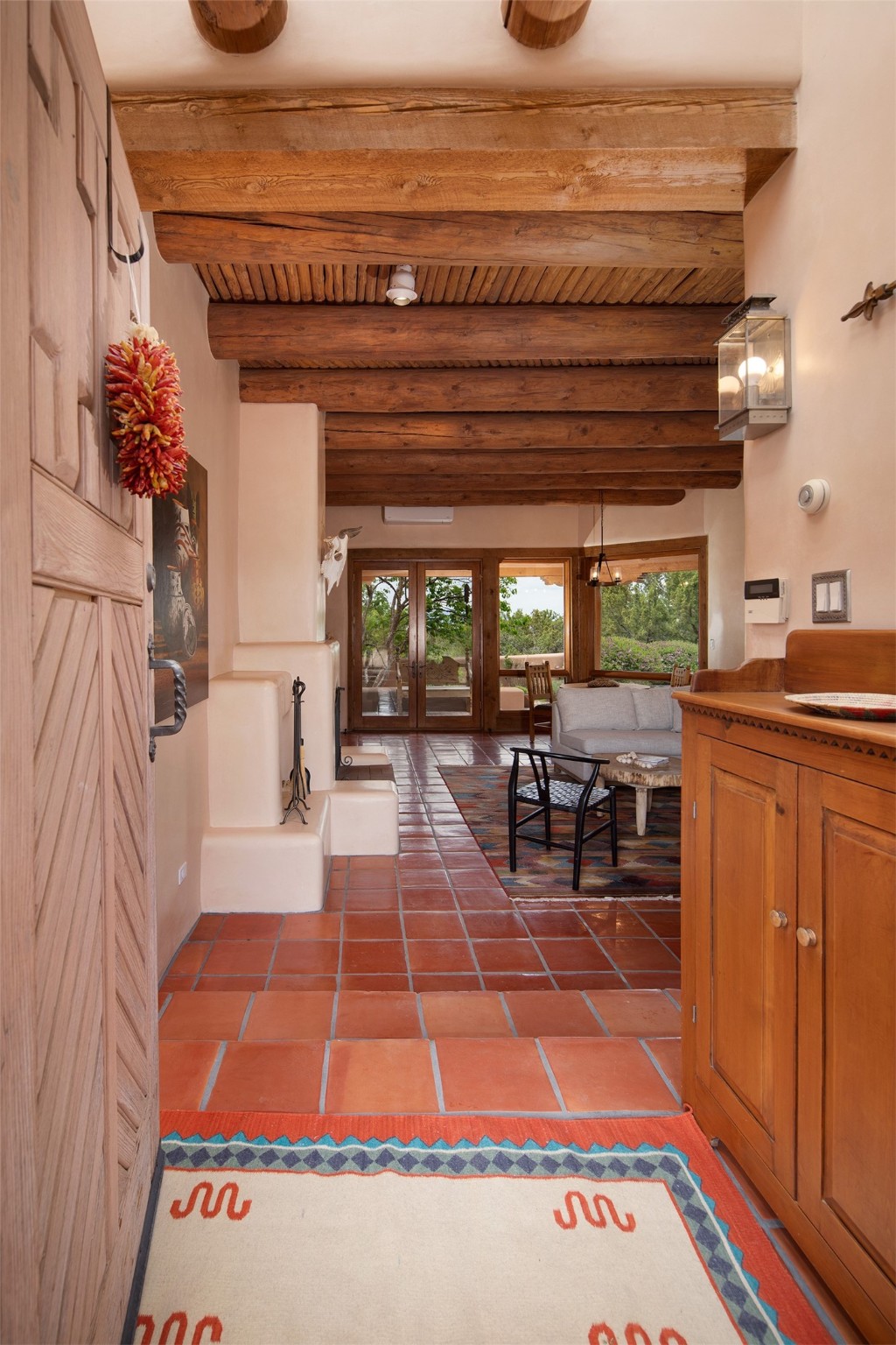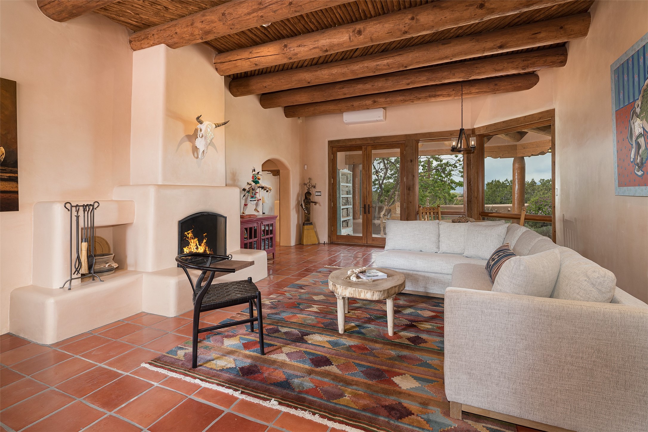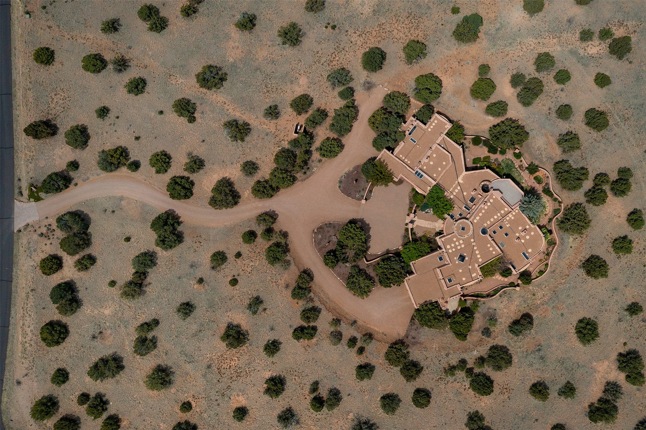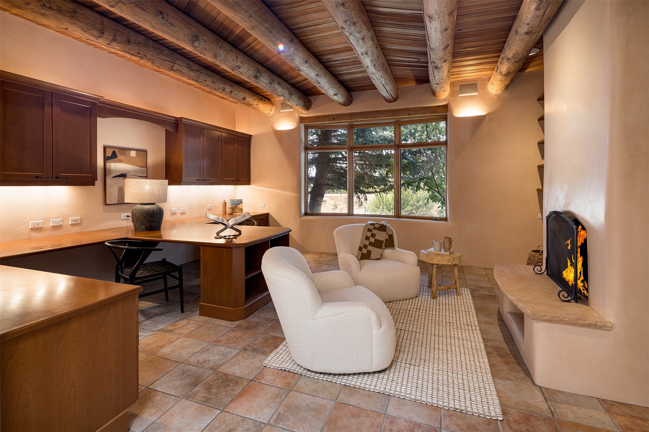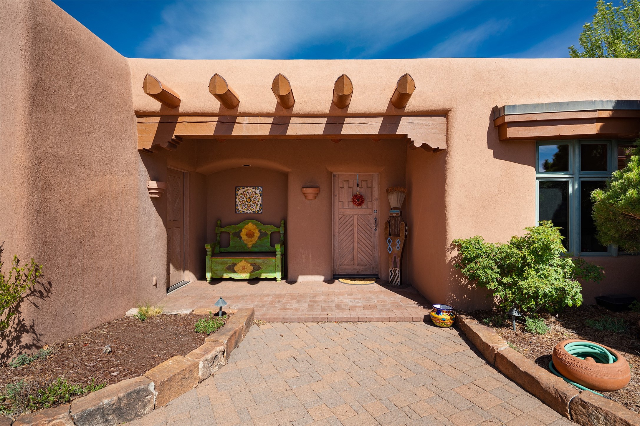 One of the most captivating estates in the famed community Las Campanas and throughout Santa Fe, this exceptional 4-bedroom home, plus office, with a guest house, excites with expansive Jemez and Sangre de Cristo Mountain views and impressive architecture. Privately sited on a rare, 5.25-acre view lot, in resort-like setting, this fabulous adobe-constructed home offers the ultimate Santa Fe lifestyle. Upon entering the 4,430 square foot main house with 2 bedrooms, plus an office, the exceptional experience begins with a welcoming front entrance courtyard, complete with vibrant landscape and a tranquil water feature. Ideal for entertaining, the main house delights with a stunning formal living room and dining room, with majestic Jemez and Sangre Mountain views, fireplace, wet bar and portal access, all of which opens to the well-appointed kitchen with large pantry and spacious casual living room with a fireplace and breakfast dining area. The primary suite impresses with views, fireplace, seating area, outdoor access, a spa-like bath with soft natural light and a large walk-in closet. Additional design features include a grand office with a fireplace and a private guest bedroom ensuite with views and outdoor access. Ideal for guests, the fully independent 1,688 square foot guest house offers 2 bedrooms, 2 baths, a full kitchen, and a great room living area, complete with a washer/dryer and a 1-car garage. The superior outdoor living experience is enhanced with lush, surround landscape, an in-ground spa, an outdoor kitchen, fully enclosed courtyards with gardens and surround covered portals, a fireplace and a substantial roof deck with surround views. Extraordinary finishes include an iconic Hogan front entrance ceiling, creamy plaster walls, flagstone flooring and the highest level of timeless craftsmanship. Less than 15 minutes to the Plaza, and within close proximity to the Club at Las Campanas, this exquisite estate is move-in ready and not to be missed.
