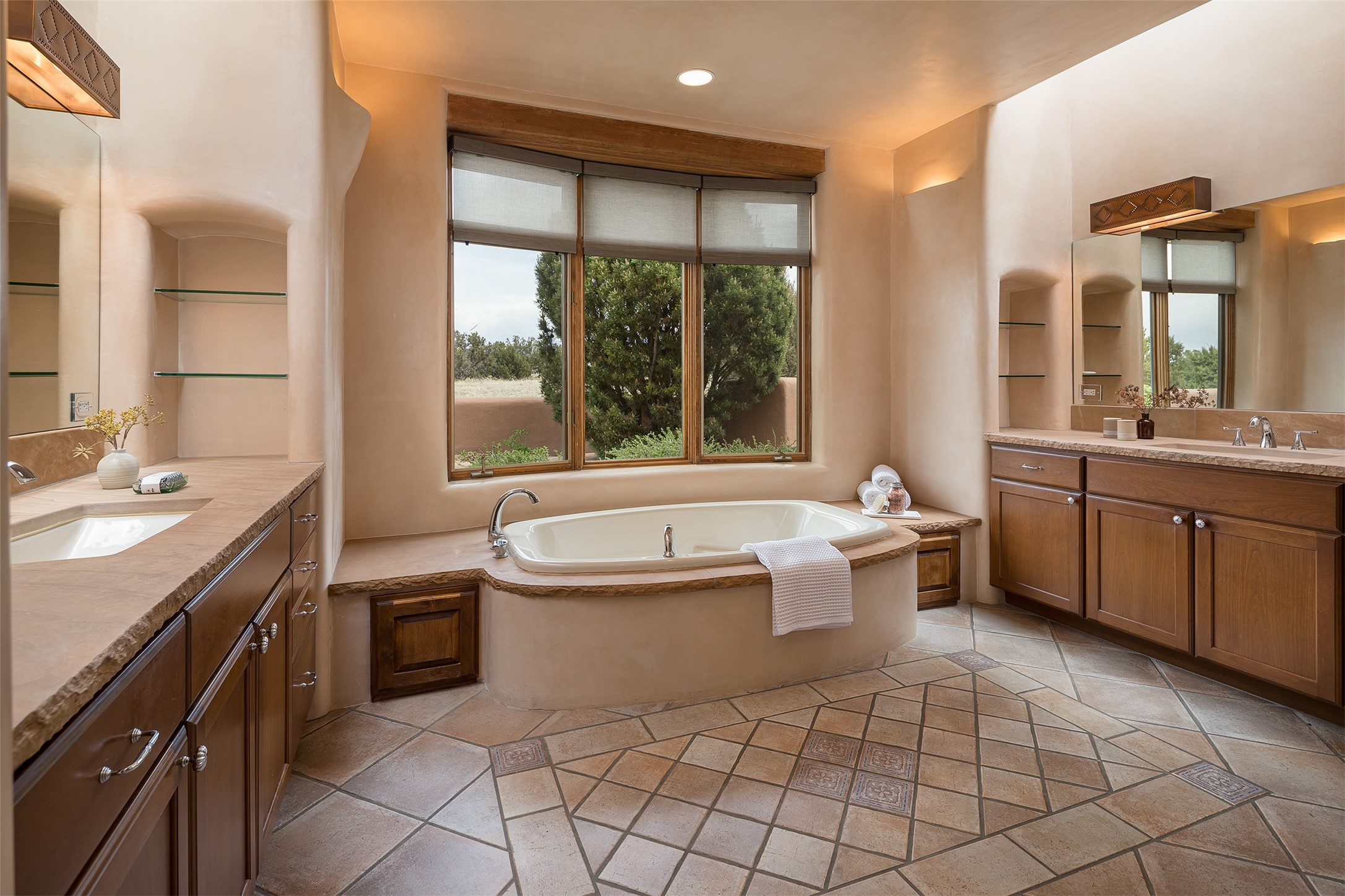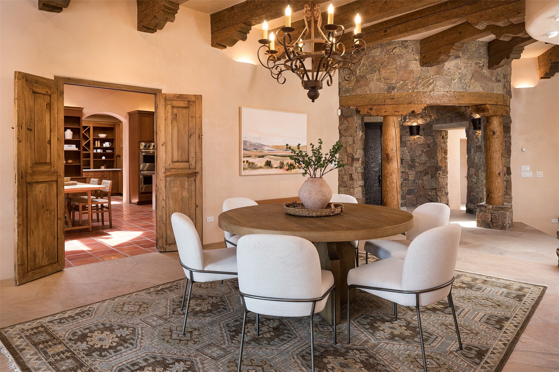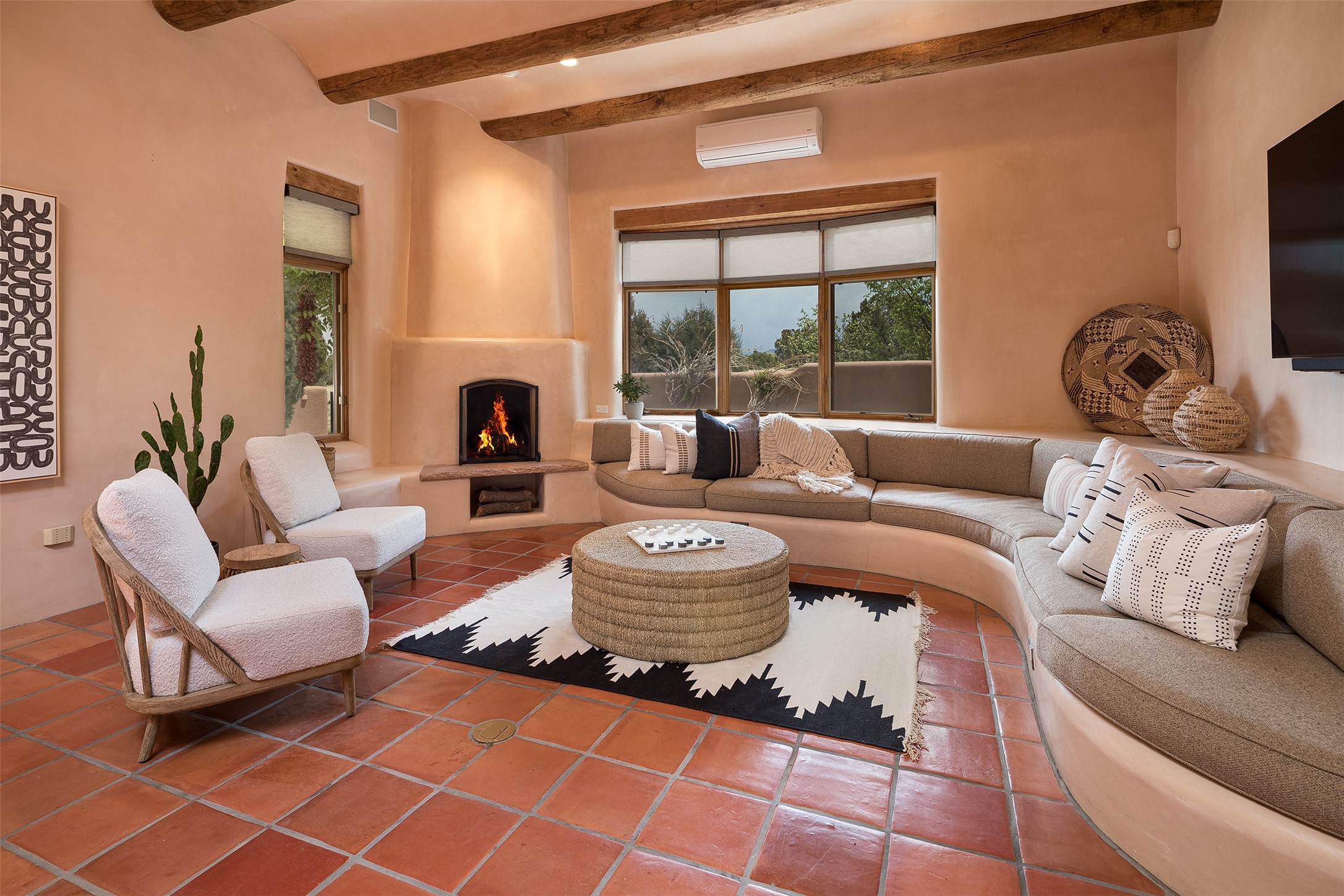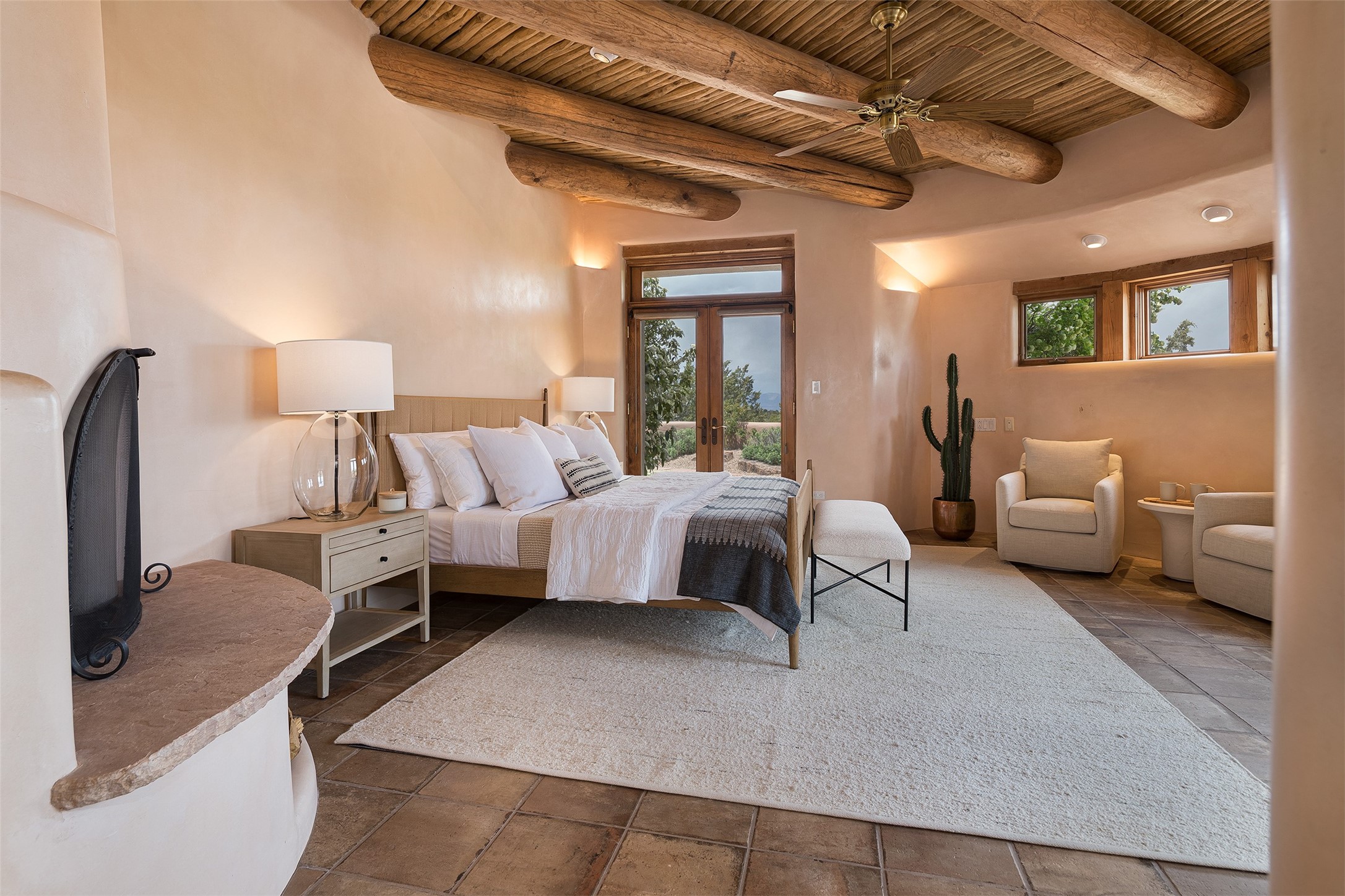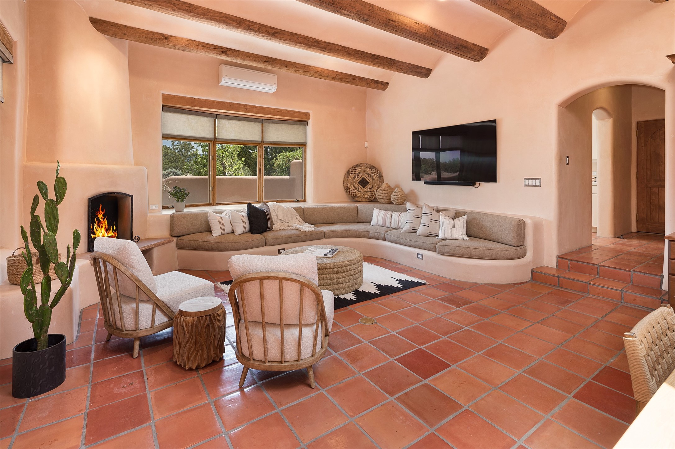 One of the most captivating estates in the famed community Las Campanas and throughout Santa Fe, this exceptional 4-bedroom home, plus office, with a guest house, excites with expansive Jemez and Sangre de Cristo Mountain views and impressive architecture. Privately sited on a rare, 5.25-acre view lot, in resort-like setting, this fabulous adobe-constructed home offers the ultimate Santa Fe lifestyle. Upon entering the 4,430 square foot main house with 2 bedrooms, plus an office, the exceptional experience begins with a welcoming front entrance courtyard, complete with vibrant landscape and a tranquil water feature. Ideal for entertaining, the main house delights with a stunning formal living room and dining room, with majestic Jemez and Sangre Mountain views, fireplace, wet bar and portal access, all of which opens to the well-appointed kitchen with large pantry and spacious casual living room with a fireplace and breakfast dining area. The primary suite impresses with views, fireplace, seating area, outdoor access, a spa-like bath with soft natural light and a large walk-in closet. Additional design features include a grand office with a fireplace and a private guest bedroom ensuite with views and outdoor access. Ideal for guests, the fully independent 1,688 square foot guest house offers 2 bedrooms, 2 baths, a full kitchen, and a great room living area, complete with a washer/dryer and a 1-car garage. The superior outdoor living experience is enhanced with lush, surround landscape, an in-ground spa, an outdoor kitchen, fully enclosed courtyards with gardens and surround covered portals, a fireplace and a substantial roof deck with surround views. Extraordinary finishes include an iconic Hogan front entrance ceiling, creamy plaster walls, flagstone flooring and the highest level of timeless craftsmanship. Less than 15 minutes to the Plaza, and within close proximity to the Club at Las Campanas, this exquisite estate is move-in ready and not to be missed.