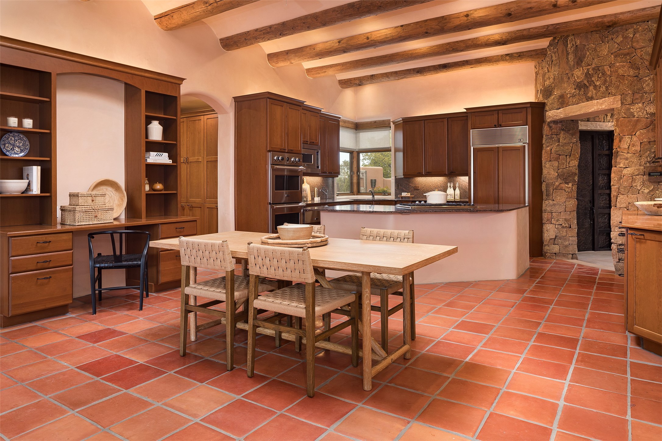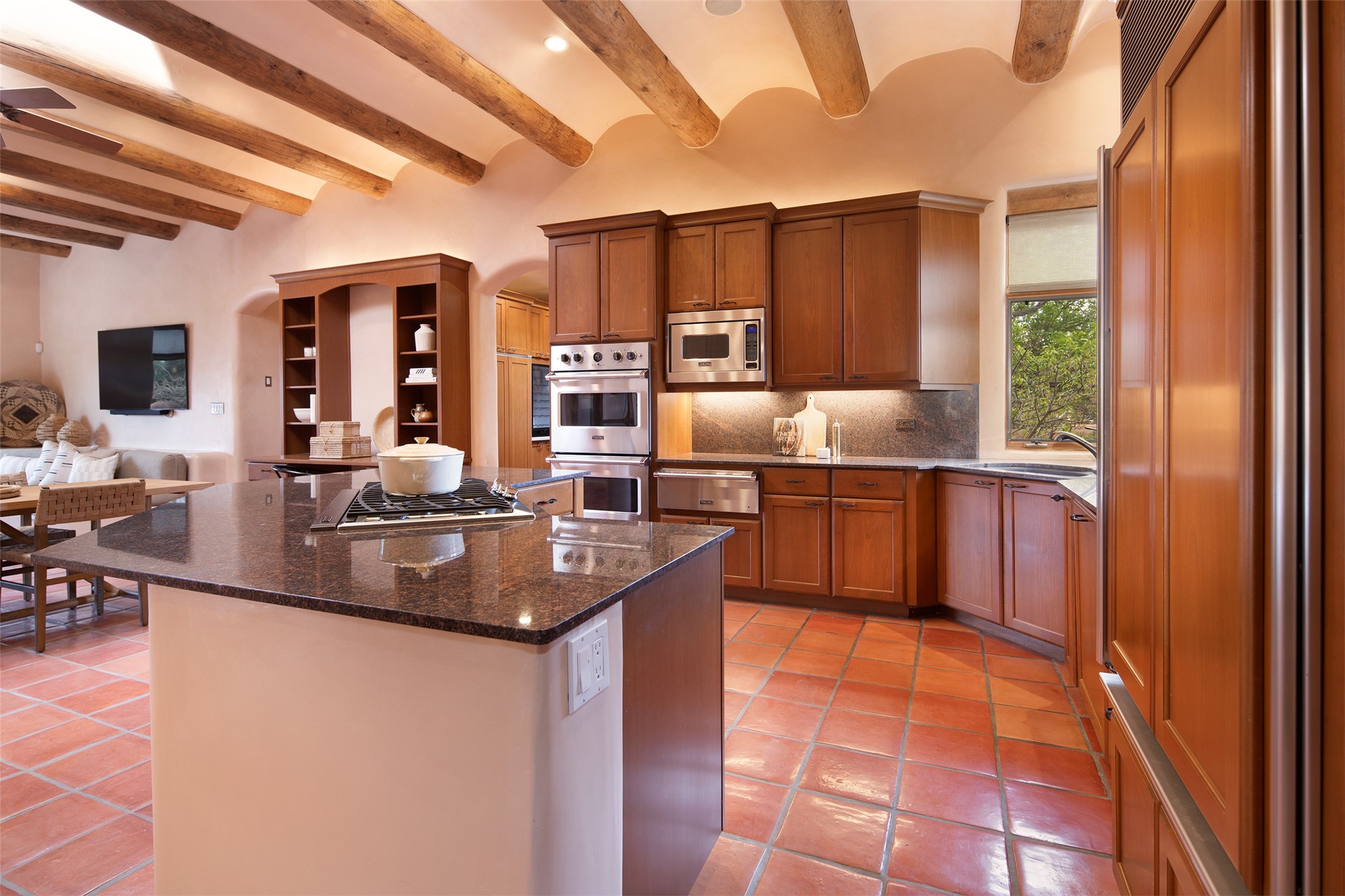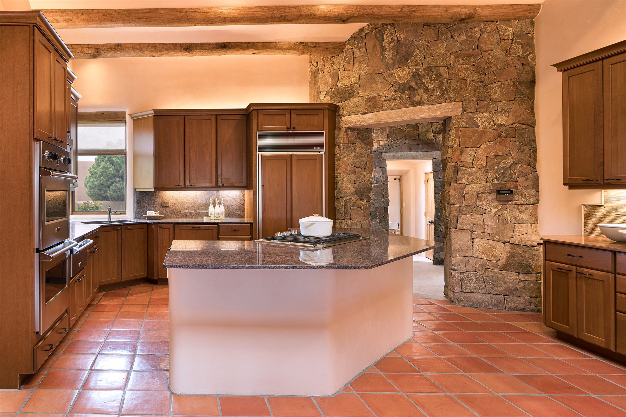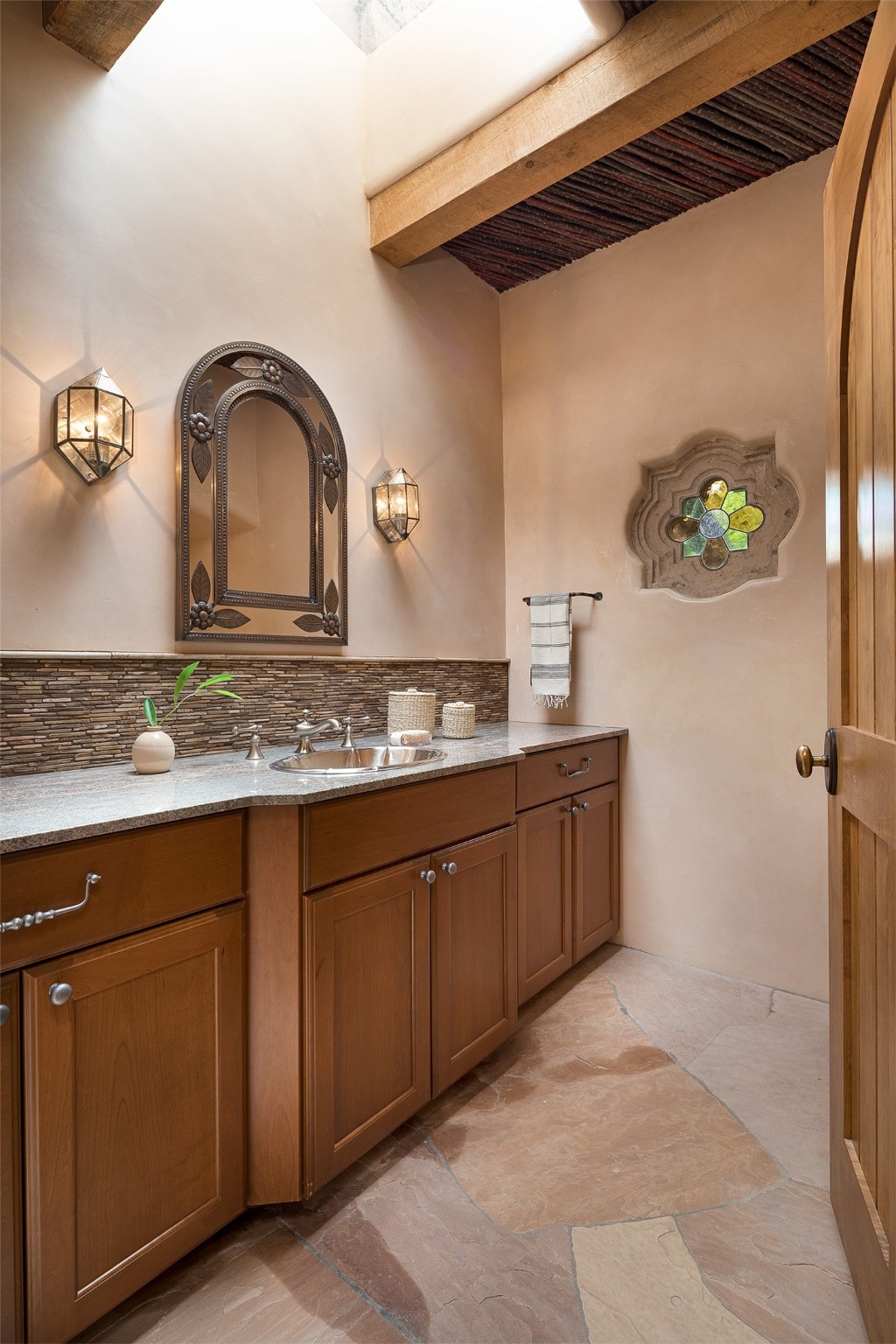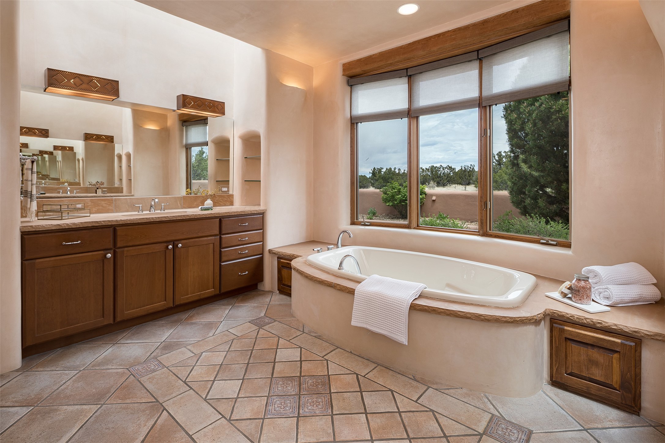 One of the most captivating estates in the famed community Las Campanas and throughout Santa Fe, this exceptional 4-bedroom home, plus office, with a guest house, excites with expansive Jemez and Sangre de Cristo Mountain views and impressive architecture. Privately sited on a rare, 5.25-acre view lot, in resort-like setting, this fabulous adobe-constructed home offers the ultimate Santa Fe lifestyle. Upon entering the 4,430 square foot main house with 2 bedrooms, plus an office, the exceptional experience begins with a welcoming front entrance courtyard, complete with vibrant landscape and a tranquil water feature. Ideal for entertaining, the main house delights with a stunning formal living room and dining room, with majestic Jemez and Sangre Mountain views, fireplace, wet bar and portal access, all of which opens to the well-appointed kitchen with large pantry and spacious casual living room with a fireplace and breakfast dining area. The primary suite impresses with views, fireplace, seating area, outdoor access, a spa-like bath with soft natural light and a large walk-in closet. Additional design features include a grand office with a fireplace and a private guest bedroom ensuite with views and outdoor access. Ideal for guests, the fully independent 1,688 square foot guest house offers 2 bedrooms, 2 baths, a full kitchen, and a great room living area, complete with a washer/dryer and a 1-car garage. The superior outdoor living experience is enhanced with lush, surround landscape, an in-ground spa, an outdoor kitchen, fully enclosed courtyards with gardens and surround covered portals, a fireplace and a substantial roof deck with surround views. Extraordinary finishes include an iconic Hogan front entrance ceiling, creamy plaster walls, flagstone flooring and the highest level of timeless craftsmanship. Less than 15 minutes to the Plaza, and within close proximity to the Club at Las Campanas, this exquisite estate is move-in ready and not to be missed.