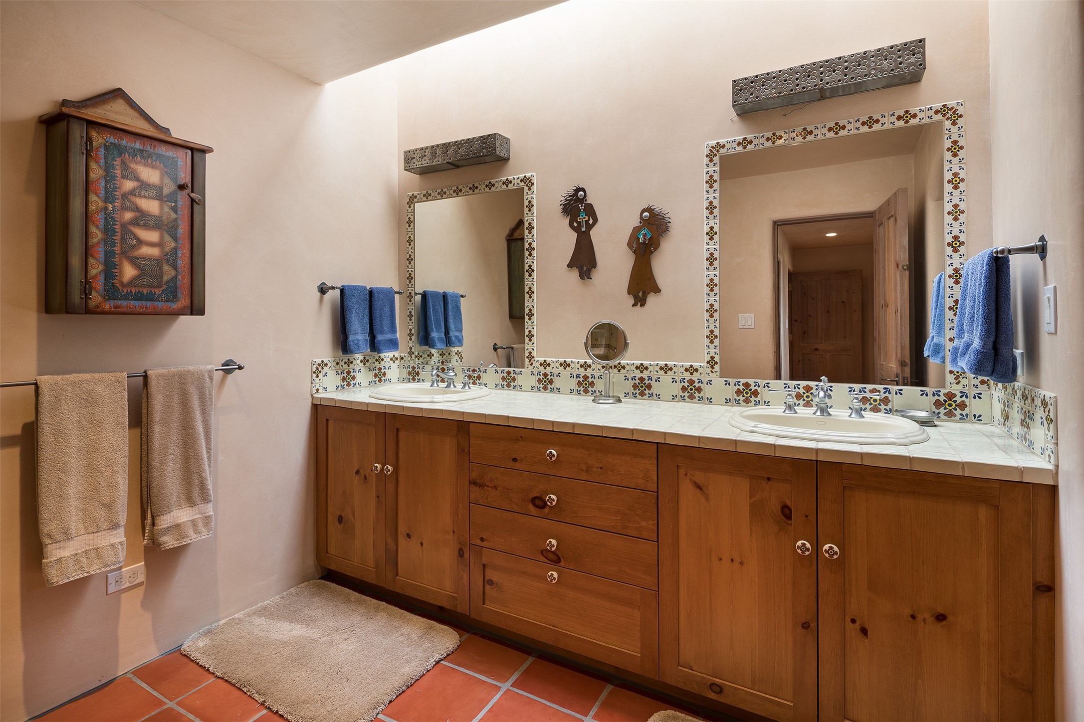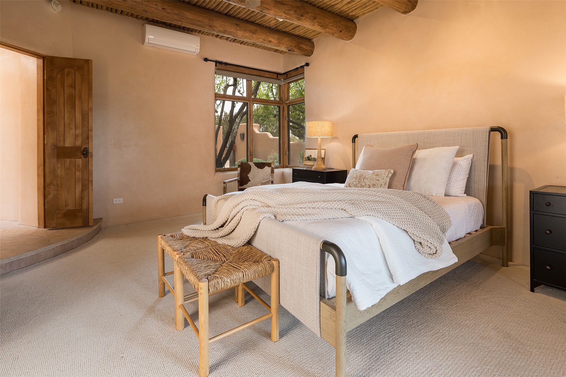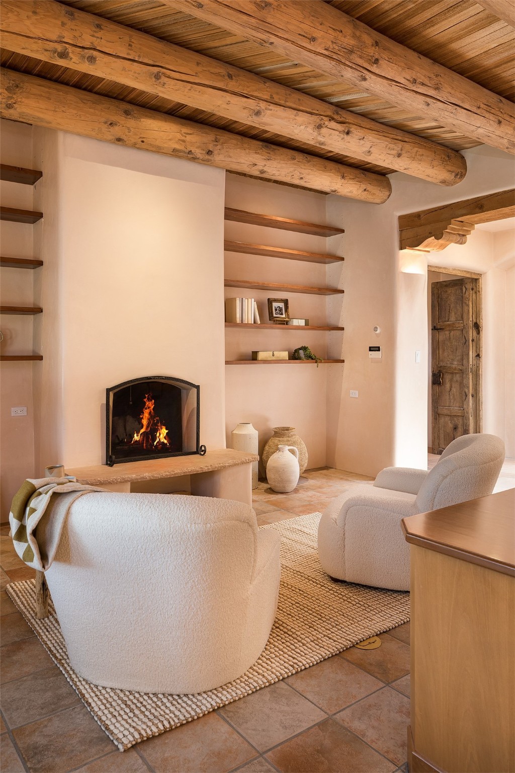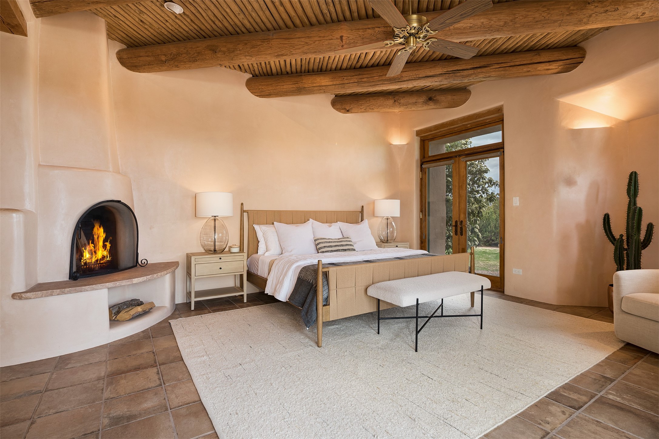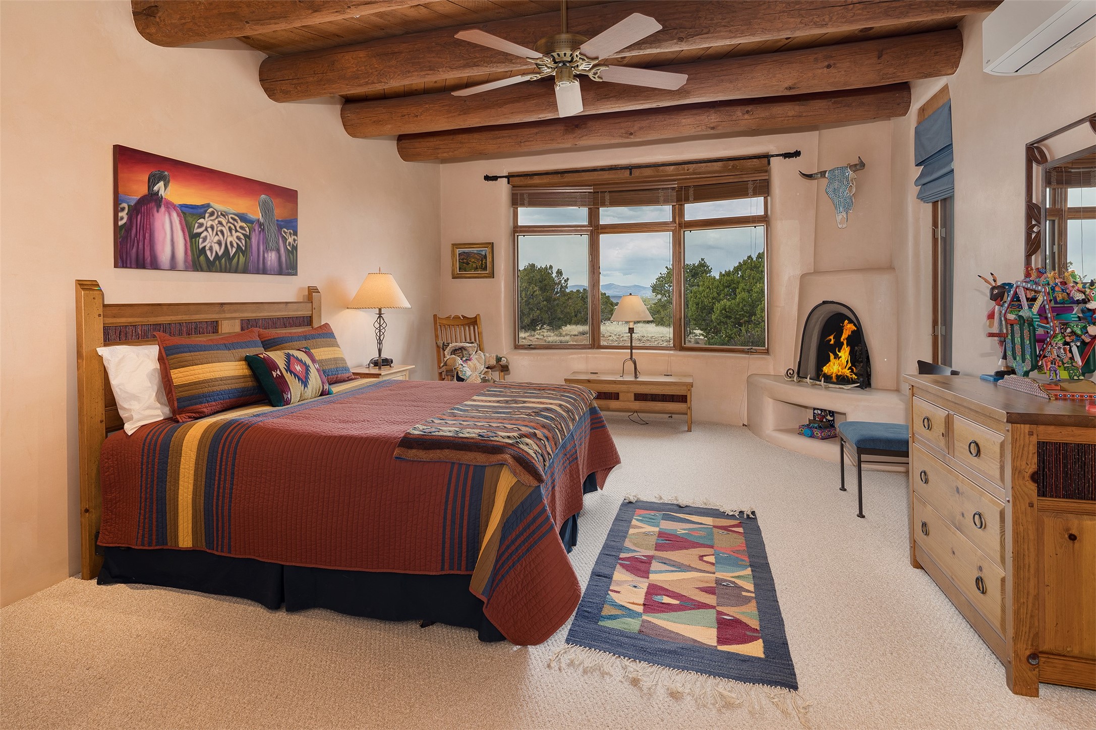One of the most captivating estates in the famed community Las Campanas and throughout Santa Fe, this exceptional 4-bedroom home, plus office, with a guest house, excites with expansive Jemez and Sangre de Cristo Mountain views and impressive architecture. Privately sited on a rare, 5.25-acre view lot, in resort-like setting, this fabulous adobe-constructed home offers the ultimate Santa Fe lifestyle. Upon entering the 4,430 square foot main house with 2 bedrooms, plus an office, the exceptional experience begins with a welcoming front entrance courtyard, complete with vibrant landscape and a tranquil water feature. Ideal for entertaining, the main house delights with a stunning formal living room and dining room, with majestic Jemez and Sangre Mountain views, fireplace, wet bar and portal access, all of which opens to the well-appointed kitchen with large pantry and spacious casual living room with a fireplace and breakfast dining area. The primary suite impresses with views, fireplace, seating area, outdoor access, a spa-like bath with soft natural light and a large walk-in closet. Additional design features include a grand office with a fireplace and a private guest bedroom ensuite with views and outdoor access. Ideal for guests, the fully independent 1,688 square foot guest house offers 2 bedrooms, 2 baths, a full kitchen, and a great room living area, complete with a washer/dryer and a 1-car garage. The superior outdoor living experience is enhanced with lush, surround landscape, an in-ground spa, an outdoor kitchen, fully enclosed courtyards with gardens and surround covered portals, a fireplace and a substantial roof deck with surround views. Extraordinary finishes include an iconic Hogan front entrance ceiling, creamy plaster walls, flagstone flooring and the highest level of timeless craftsmanship. Less than 15 minutes to the Plaza, and within close proximity to the Club at Las Campanas, this exquisite estate is move-in ready and not to be missed.
