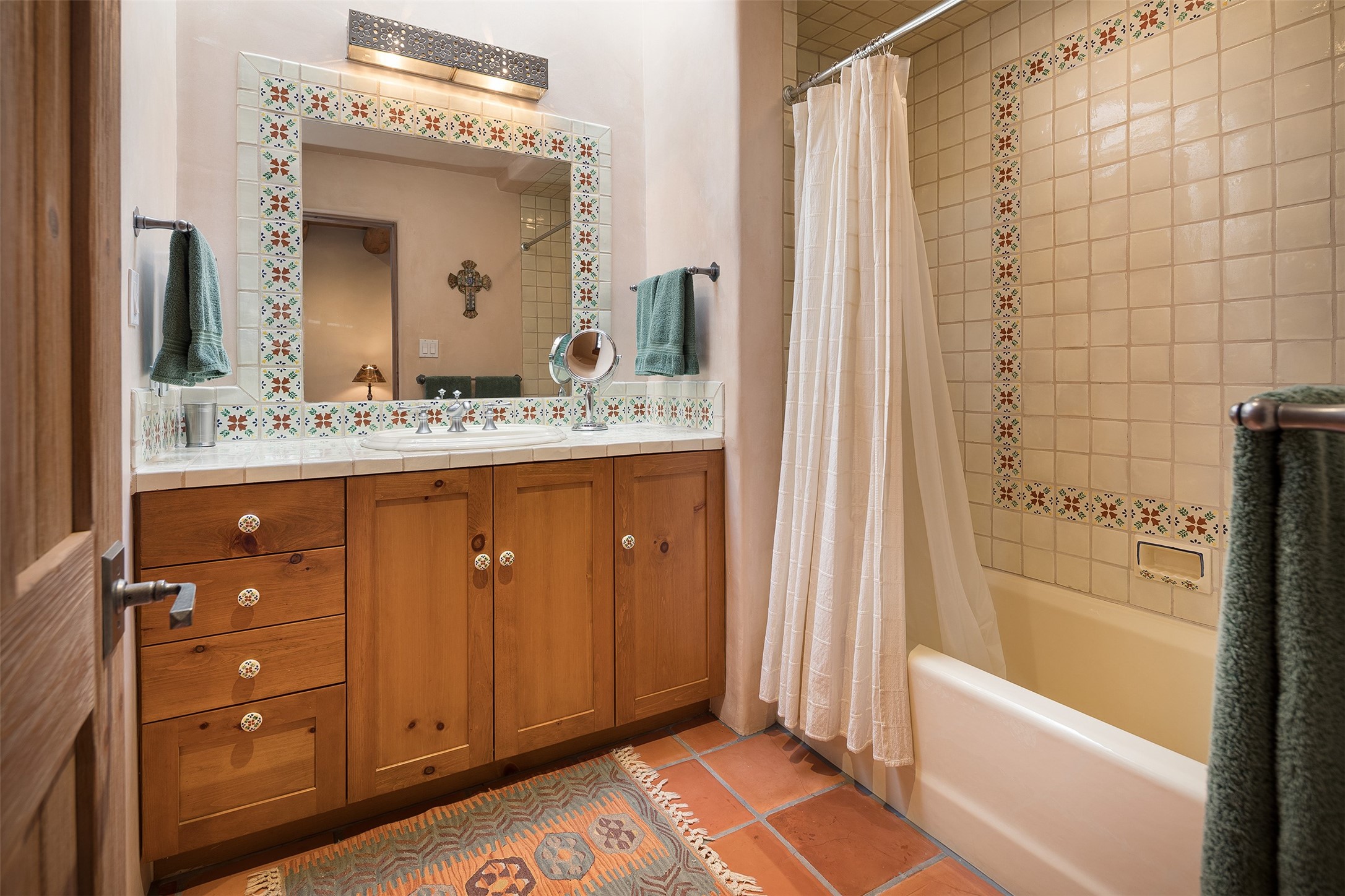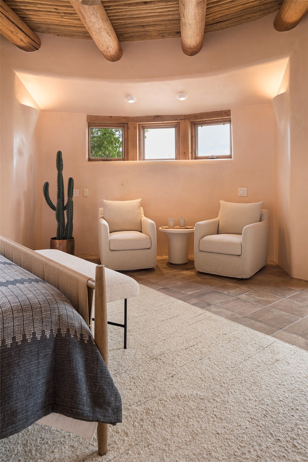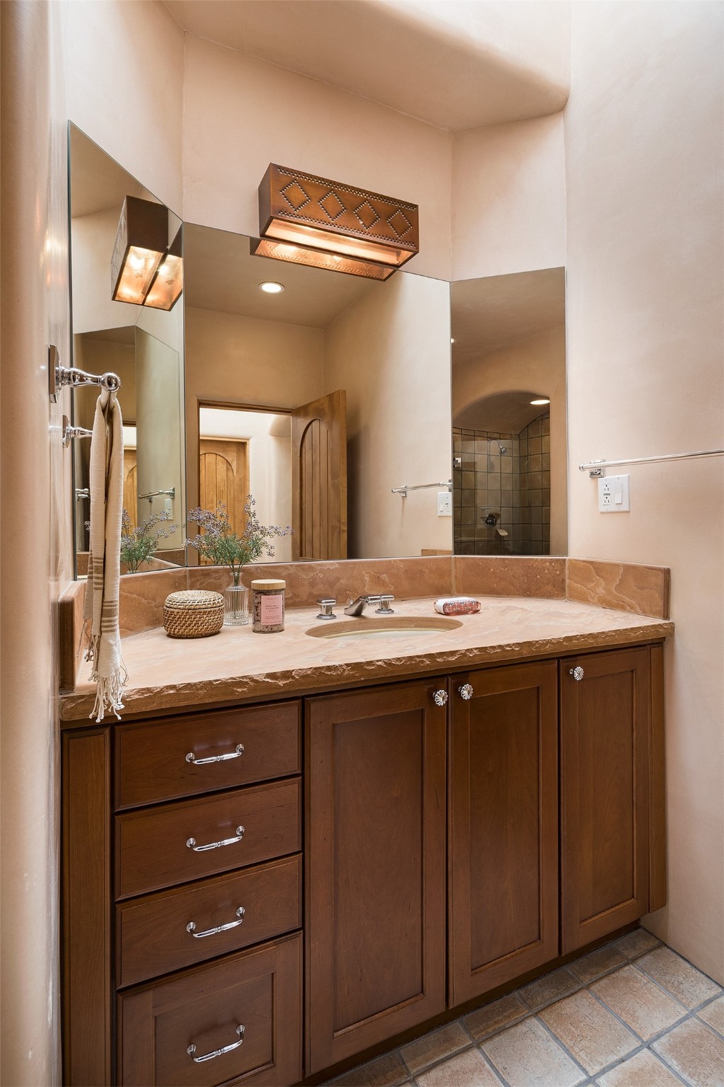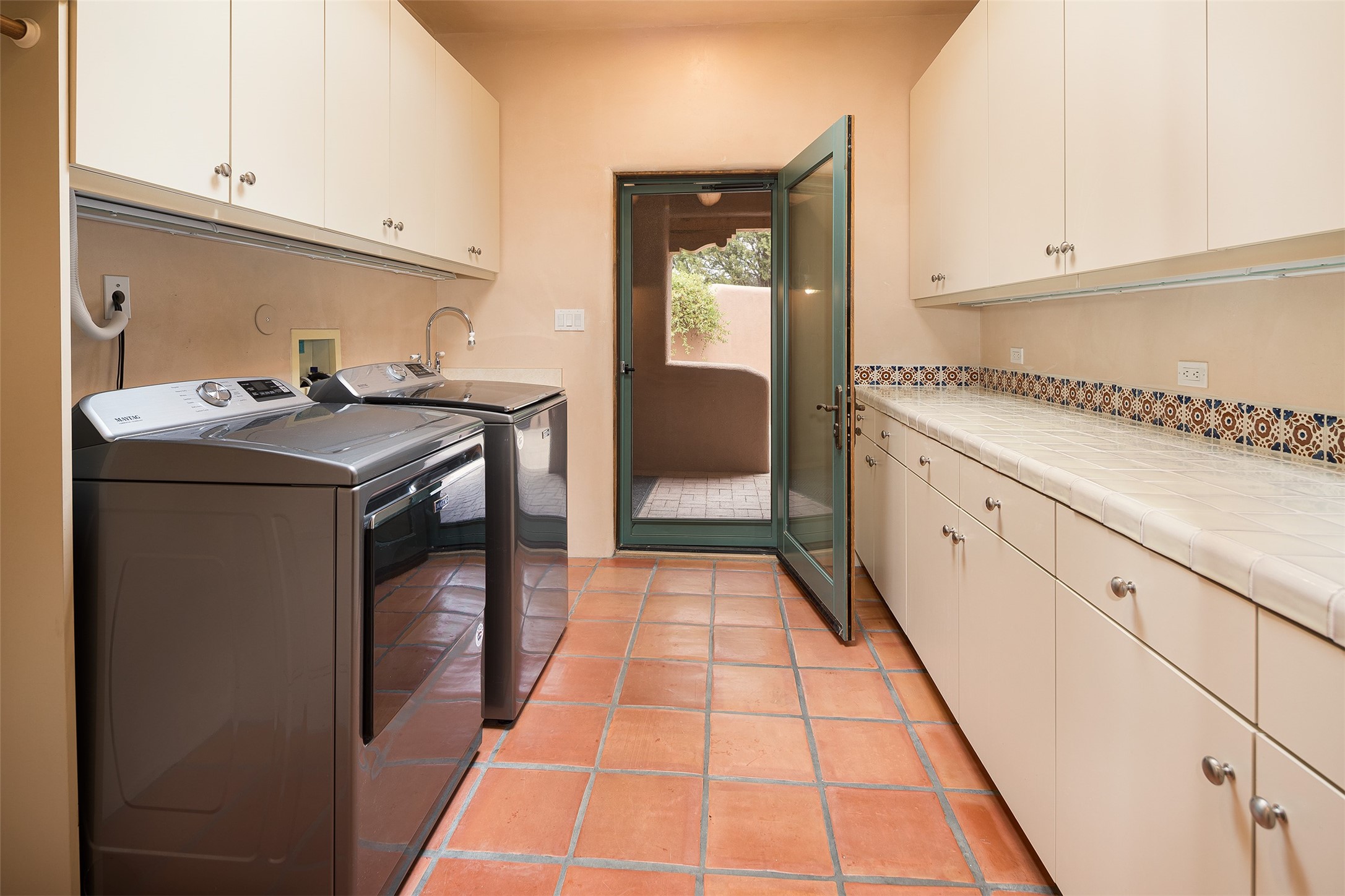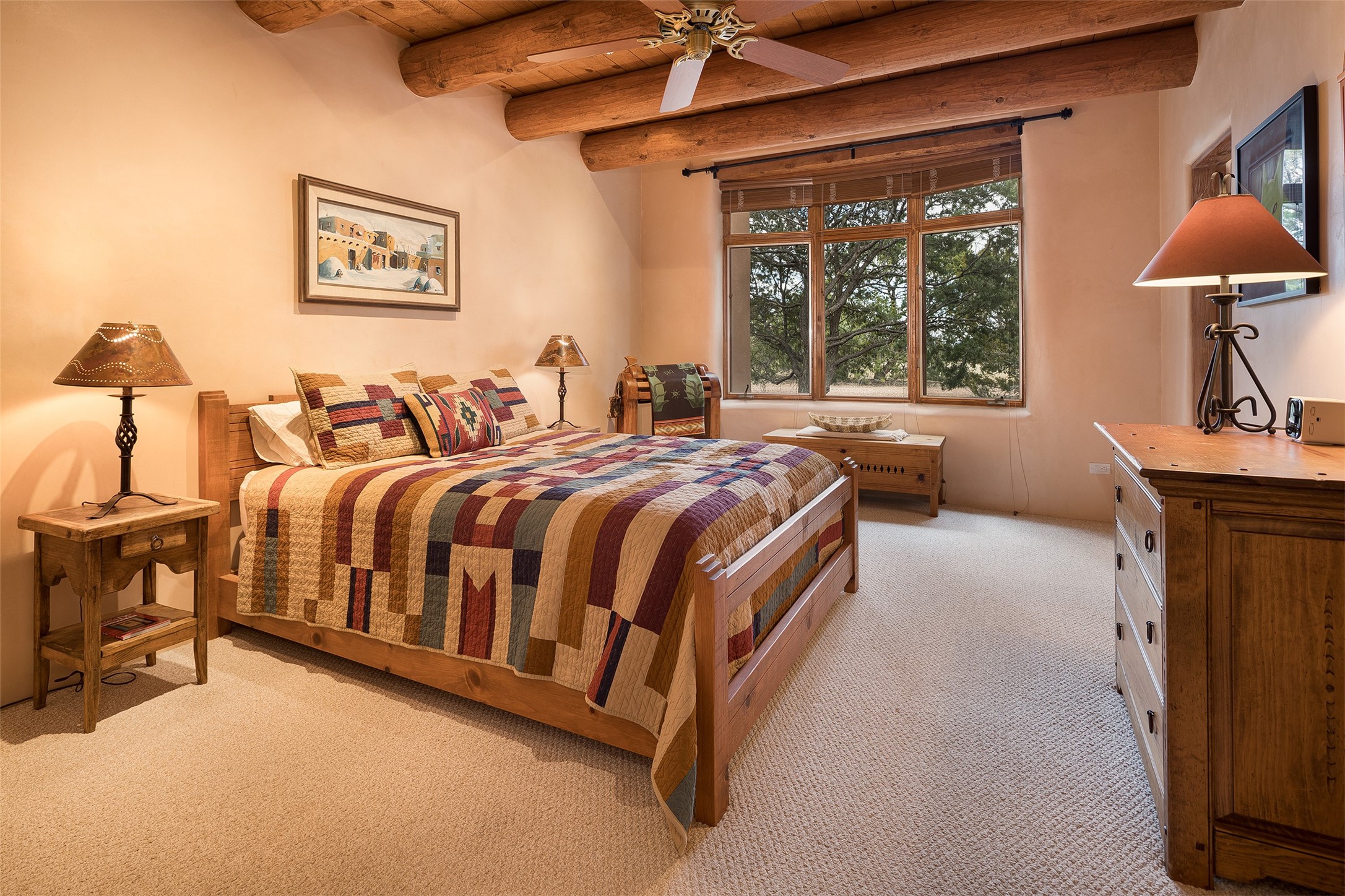 One of the most captivating estates in the famed community Las Campanas and throughout Santa Fe, this exceptional 4-bedroom home, plus office, with a guest house, excites with expansive Jemez and Sangre de Cristo Mountain views and impressive architecture. Privately sited on a rare, 5.25-acre view lot, in resort-like setting, this fabulous adobe-constructed home offers the ultimate Santa Fe lifestyle. Upon entering the 4,430 square foot main house with 2 bedrooms, plus an office, the exceptional experience begins with a welcoming front entrance courtyard, complete with vibrant landscape and a tranquil water feature. Ideal for entertaining, the main house delights with a stunning formal living room and dining room, with majestic Jemez and Sangre Mountain views, fireplace, wet bar and portal access, all of which opens to the well-appointed kitchen with large pantry and spacious casual living room with a fireplace and breakfast dining area. The primary suite impresses with views, fireplace, seating area, outdoor access, a spa-like bath with soft natural light and a large walk-in closet. Additional design features include a grand office with a fireplace and a private guest bedroom ensuite with views and outdoor access. Ideal for guests, the fully independent 1,688 square foot guest house offers 2 bedrooms, 2 baths, a full kitchen, and a great room living area, complete with a washer/dryer and a 1-car garage. The superior outdoor living experience is enhanced with lush, surround landscape, an in-ground spa, an outdoor kitchen, fully enclosed courtyards with gardens and surround covered portals, a fireplace and a substantial roof deck with surround views. Extraordinary finishes include an iconic Hogan front entrance ceiling, creamy plaster walls, flagstone flooring and the highest level of timeless craftsmanship. Less than 15 minutes to the Plaza, and within close proximity to the Club at Las Campanas, this exquisite estate is move-in ready and not to be missed.