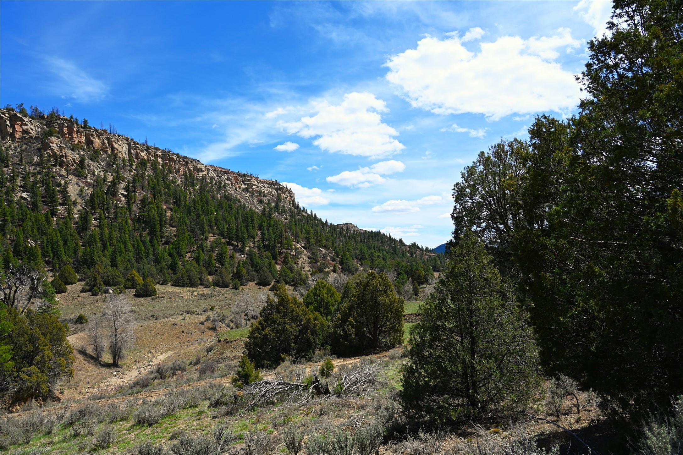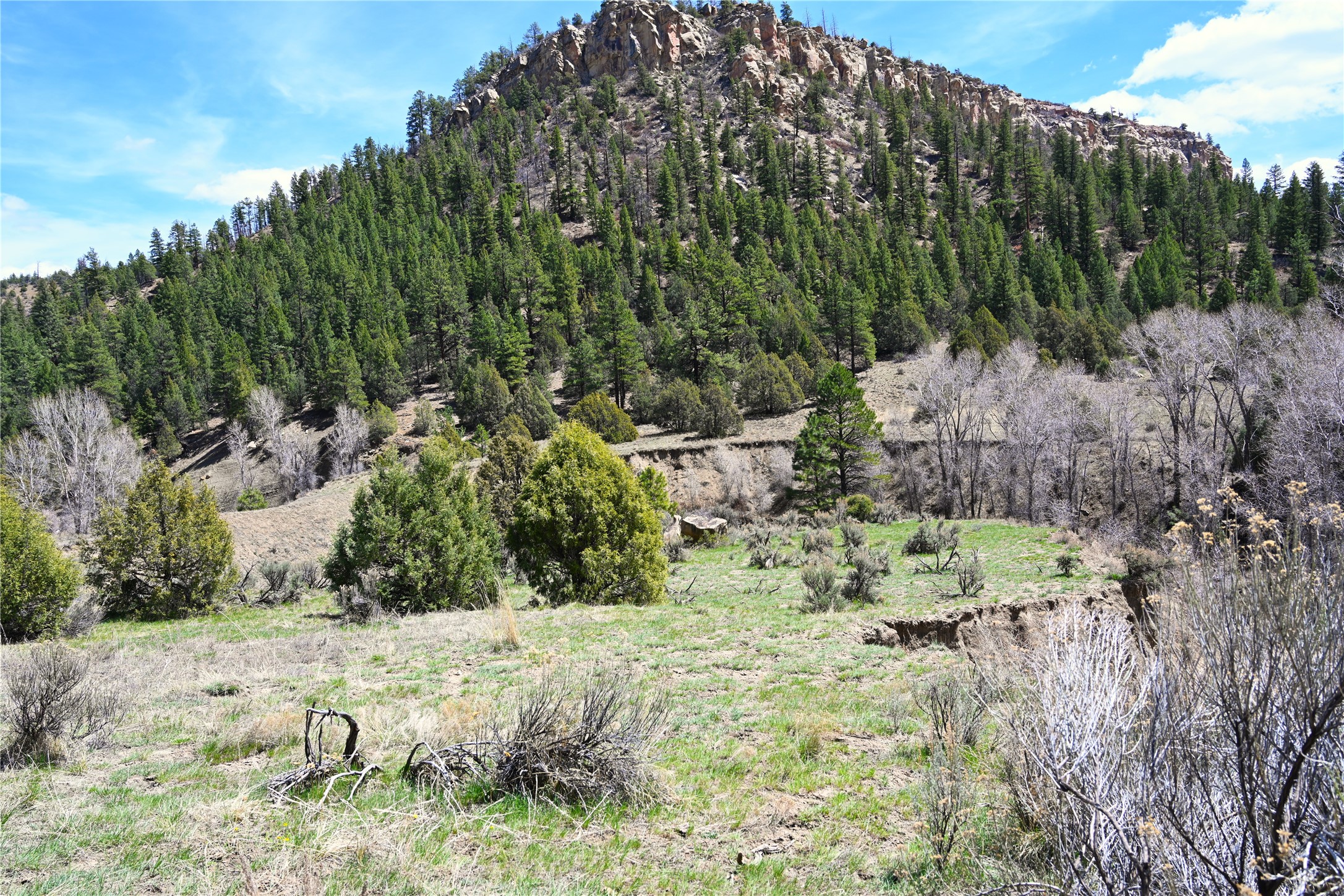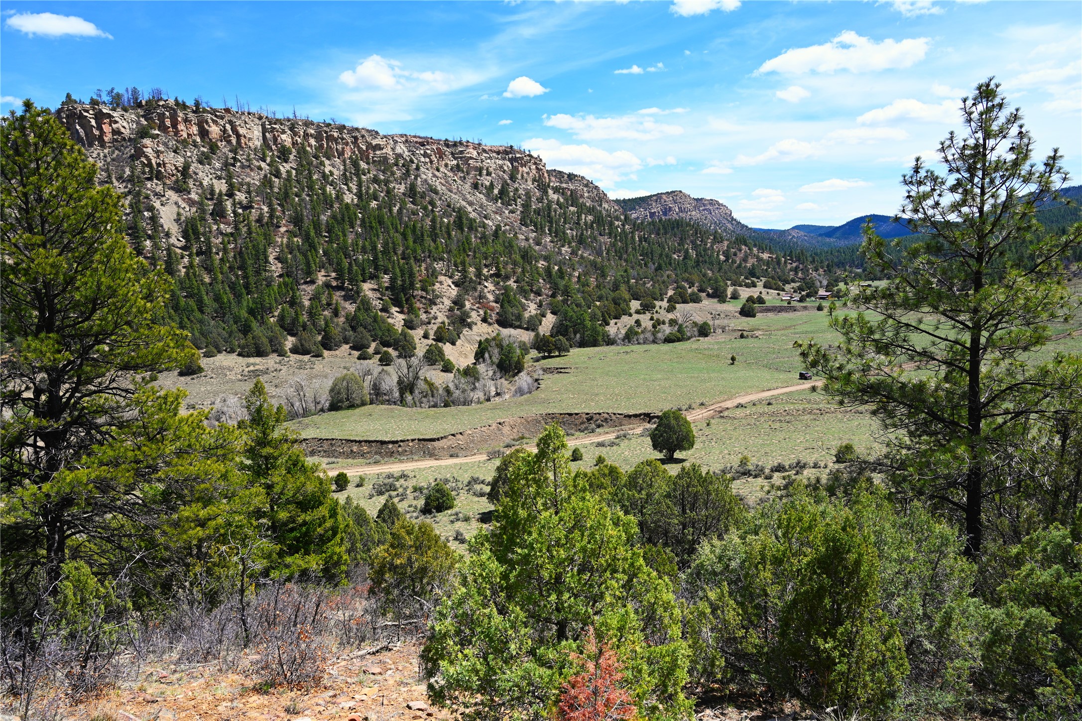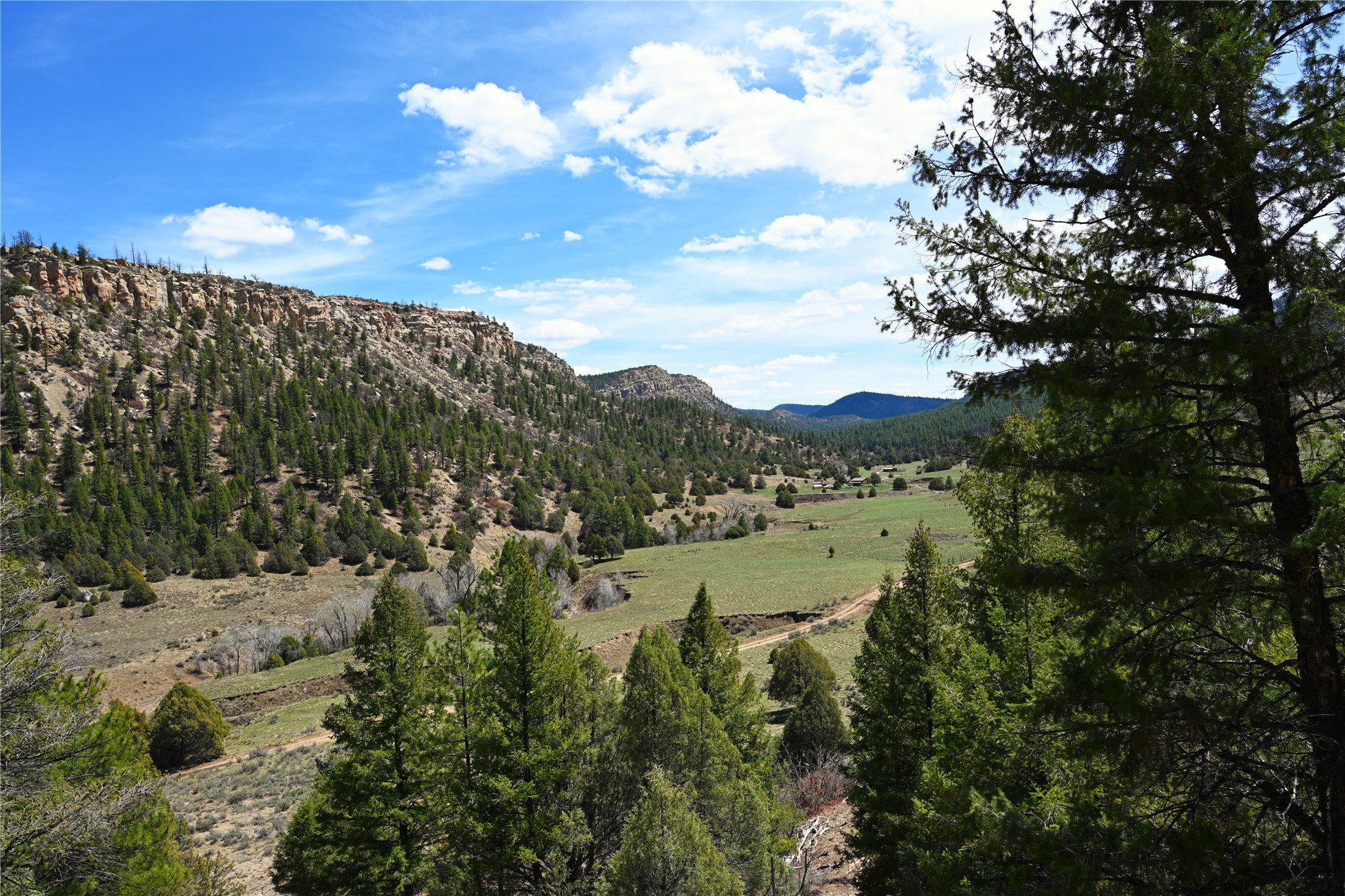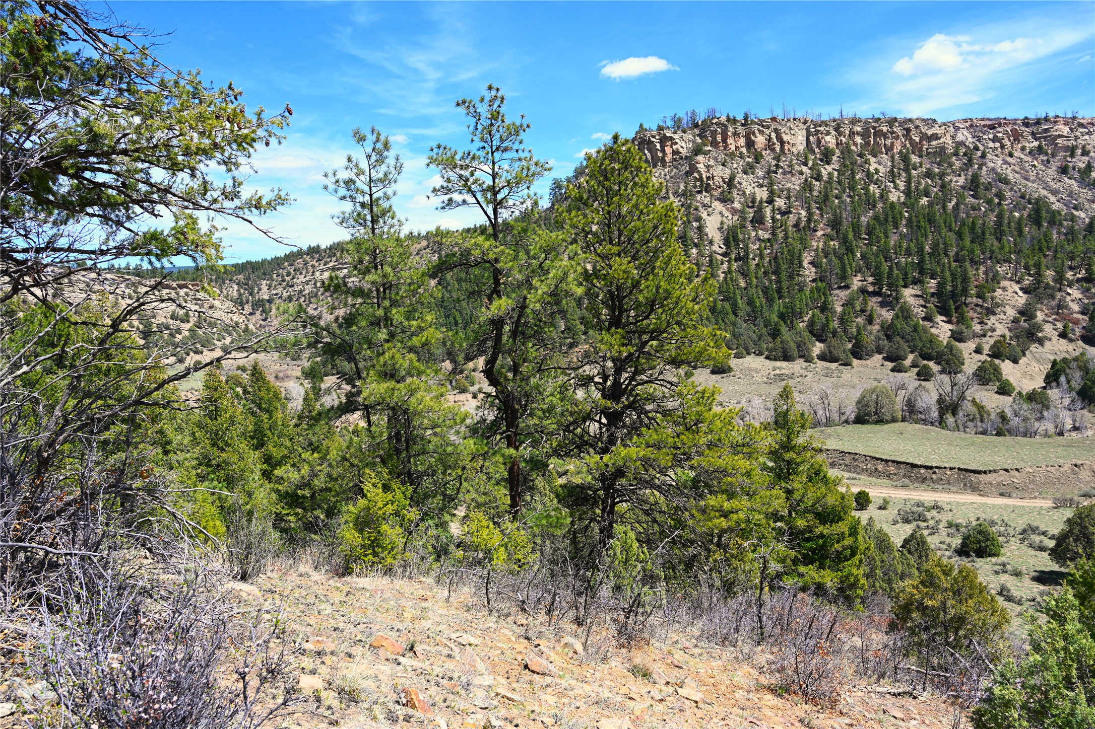 Northern New Mexico off grid property with stunning views. Tall pines Gambrel Oak, nice flat areas to set up camp or that off grid home.. Beautiful rock cliffs on the west side. Elk ,Mule Deer, Turkey and Bear roam these areas.. Property has been assigned an Elk Tag in the past, but not guaranteed every year , new owners would have to check with NMFGD.. Seasonal creek. Backs up to all private Ranches. 7250 feet in elevation. Property on both sides of Cr 352.
