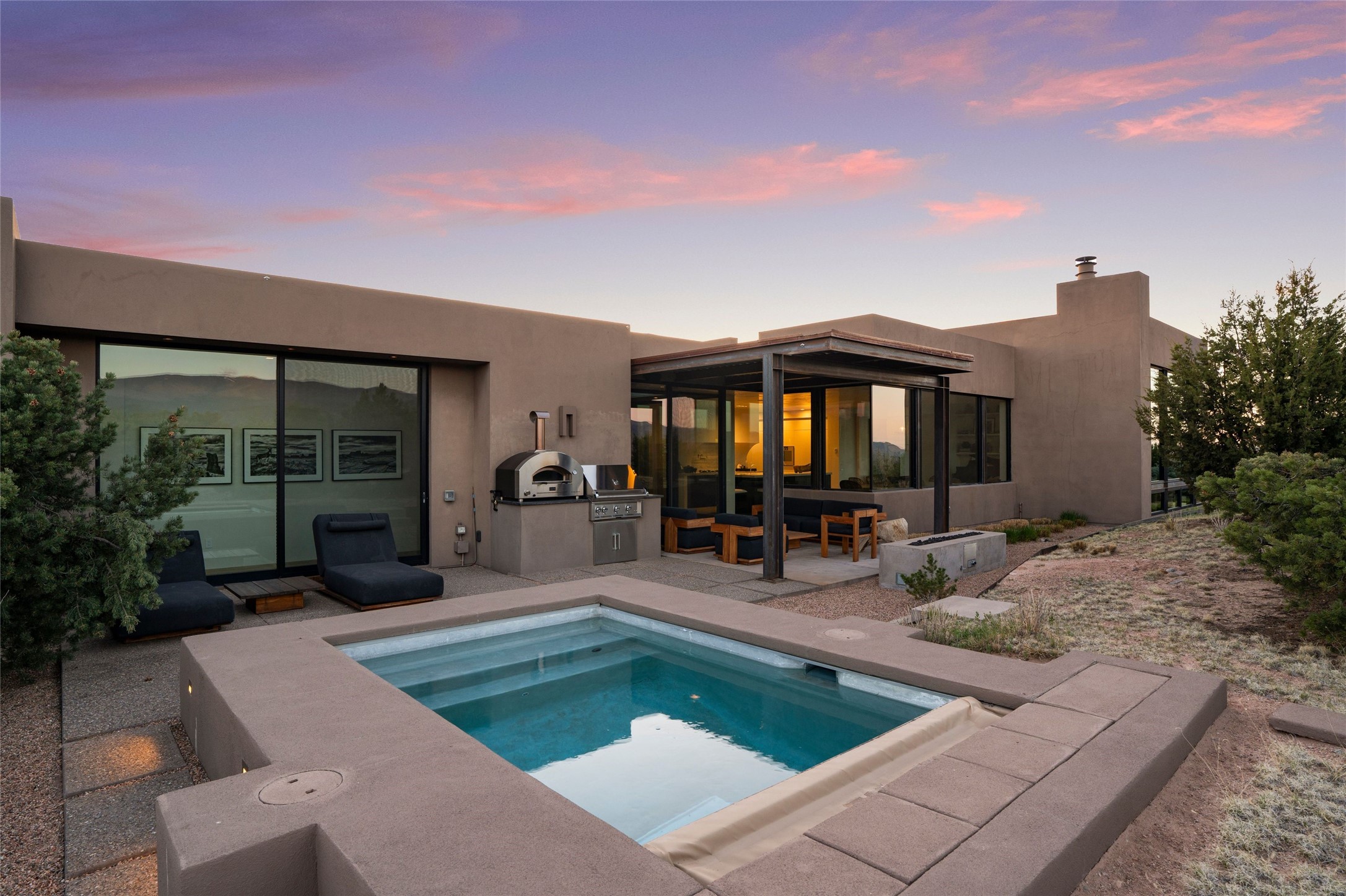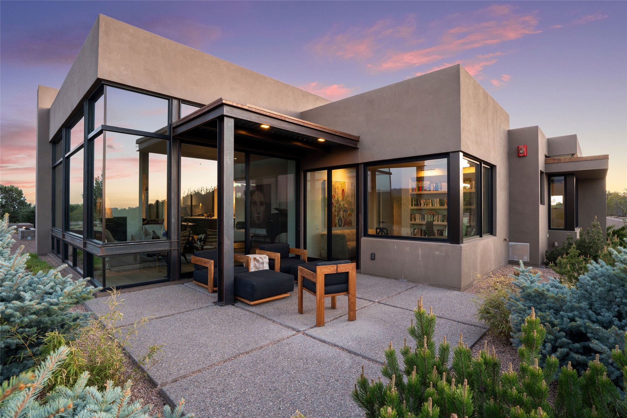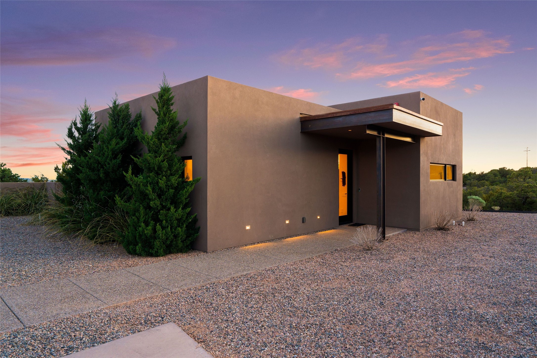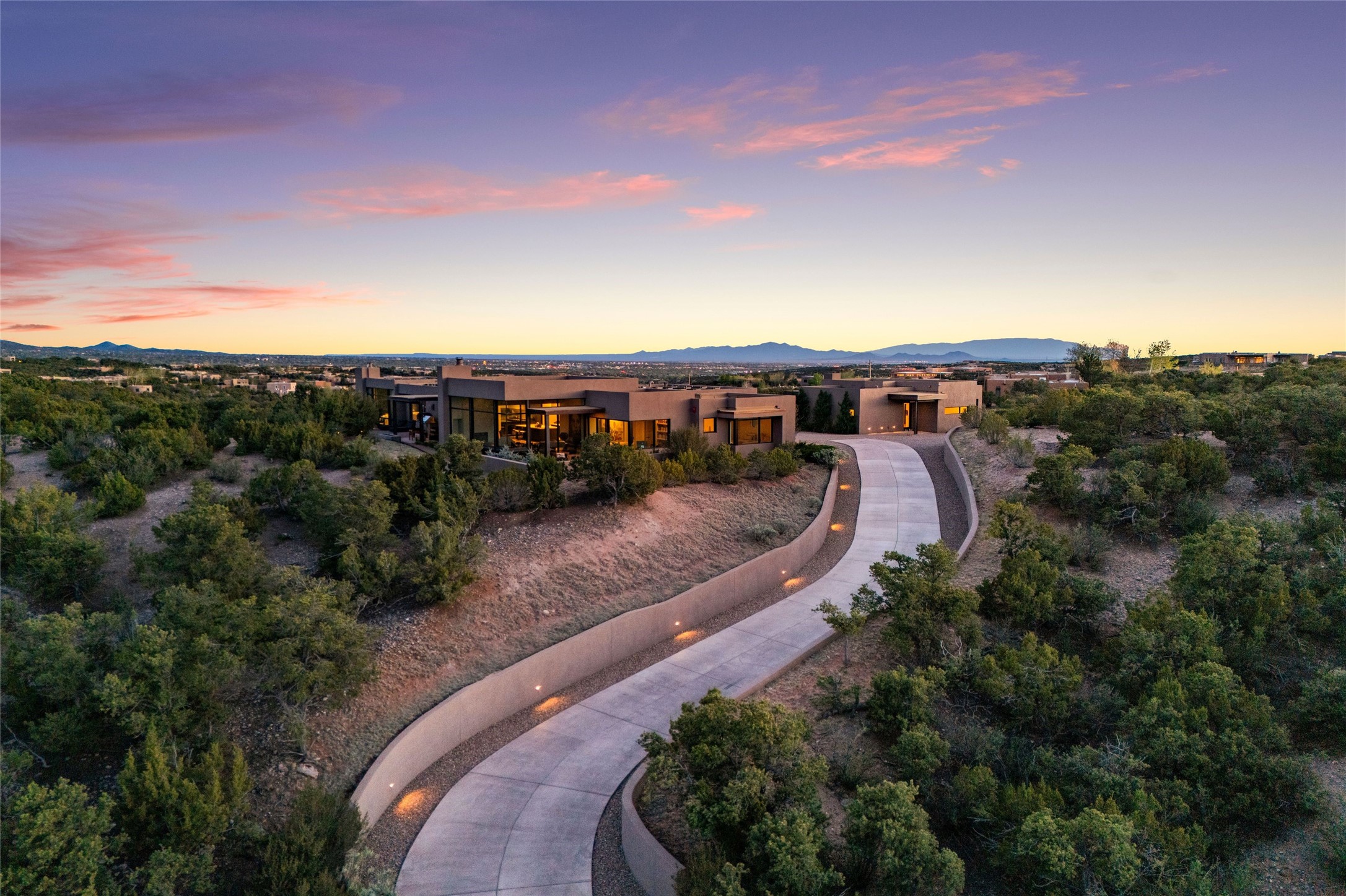 Experience the pinnacle of luxury living in this stunning 4-bedroom, 3.5-bath home, including an 878 sq. ft. guesthouse. Situated within the esteemed Monte Sereno community, this award-winning residence, designed by architect Robert Zachry and builder Scott Wong of Solterra, captures the essence of modern elegance. Perched on one of the highest lots in the community, with a private, gated entrance, enjoy 270-degree unobstructed views of the Sangre de Cristo Mountains, the Badlands, Ortiz/Sandia Mountains, and the twinkling lights of Santa Fe. This single-level home has recently been thoughtfully reimagined by designer Mary Clark with luxury finishes throughout. The flow from the living room to the dining area, kitchen, and outdoor portals creates an inviting atmosphere. The open kitchen includes custom oak cabinetry, travertine countertops, Gaggenau ovens, Thermador and Miele appliances, as well as a hidden scullery. Luxurious owner's suite provides privacy, featuring a Swedish wood burning stove, two walk-in closets, exercise room, and an en-suite bath with a travertine wet room, Waterworks soaking tub, Vola faucets and shower for two. Additional highlights include 32 solar panels, a heated driveway and sidewalks and a comprehensive audio system. The in-ground hot tub / plunge pool and outdoor custom kitchen, equipped with a Hestan grill and Alfa gas pizza oven, are ideal for entertaining. Low-water xeriscape landscaping enhances outdoor appeal, while the 2-car garage plus another in the guesthouse adds convenience. Discover unparalleled living in a convenient, close-in location where comfort and sophistication unite.