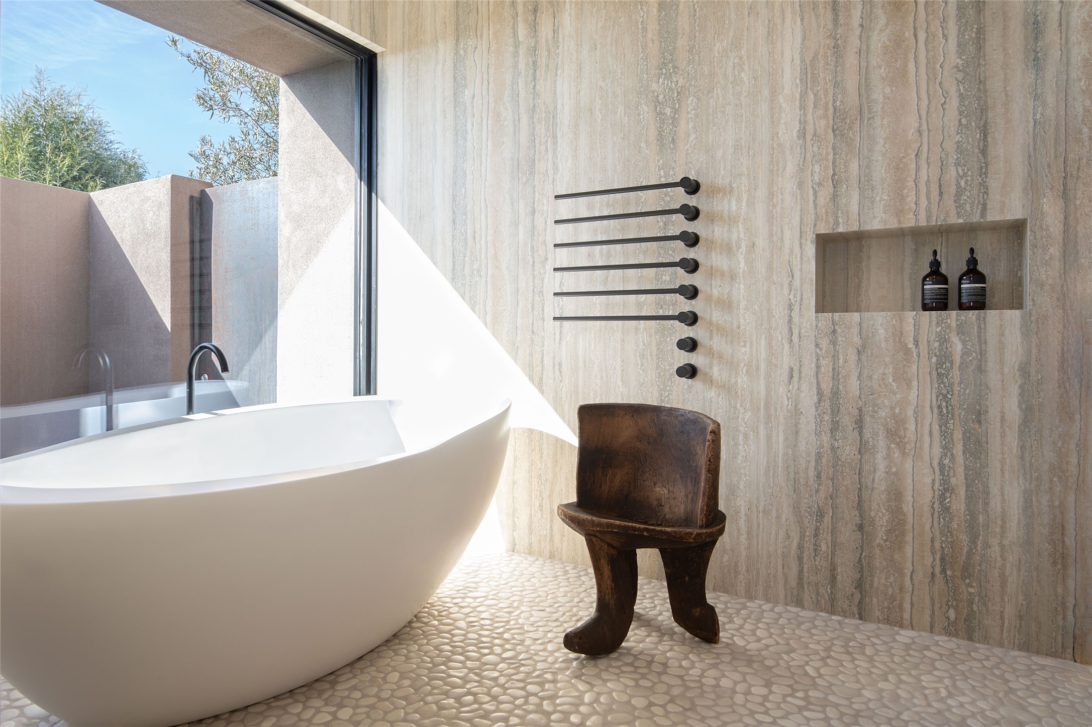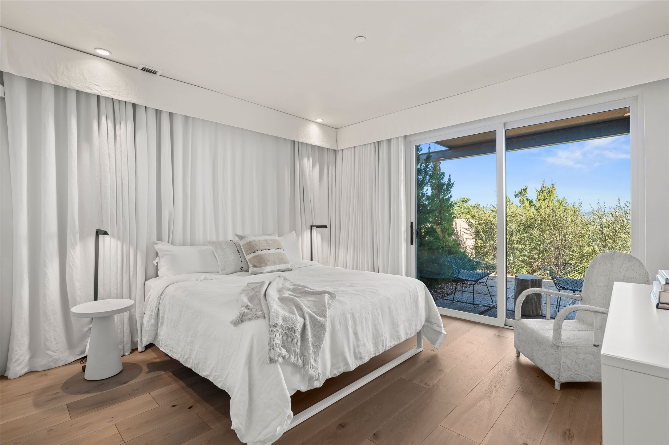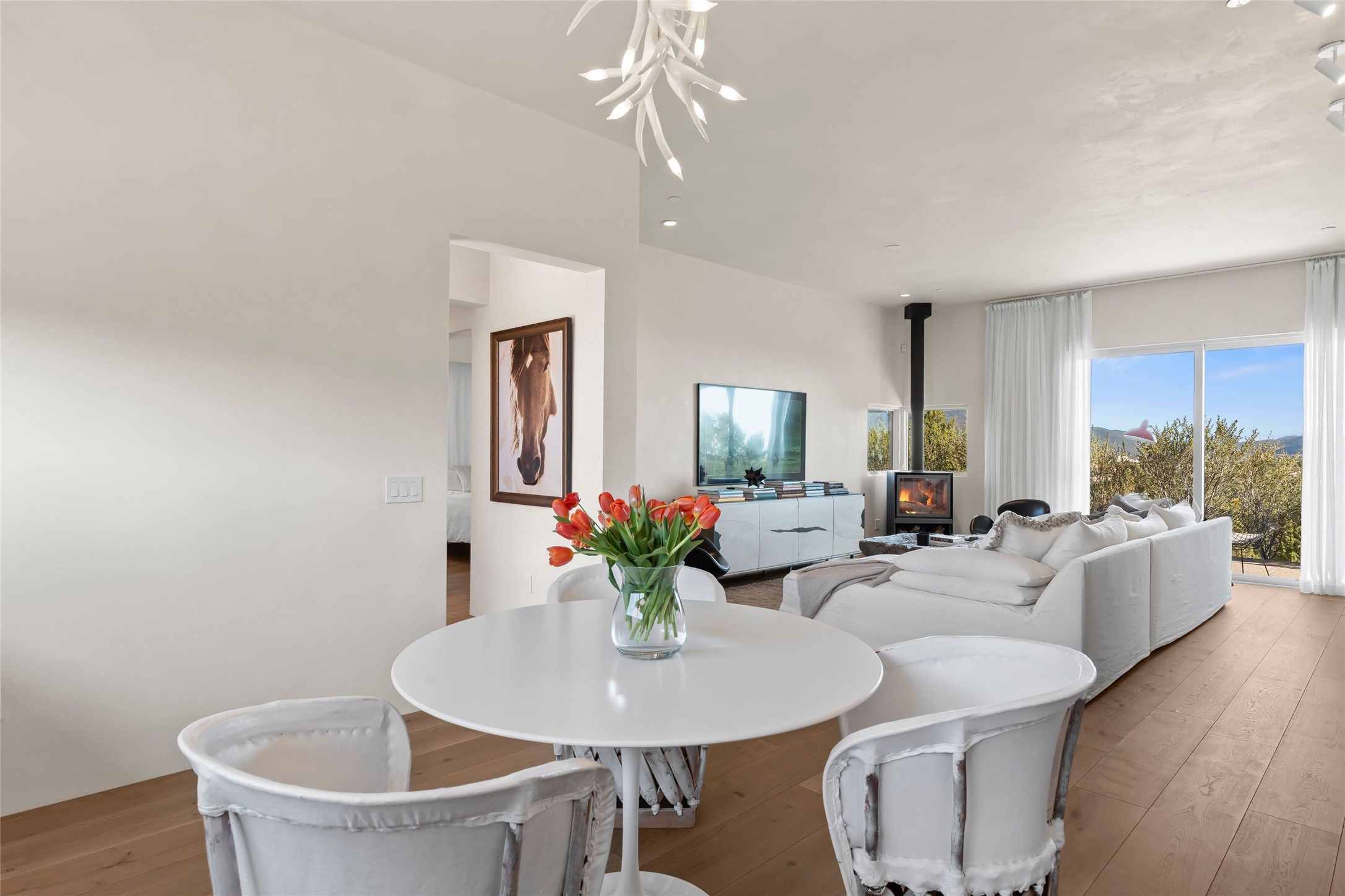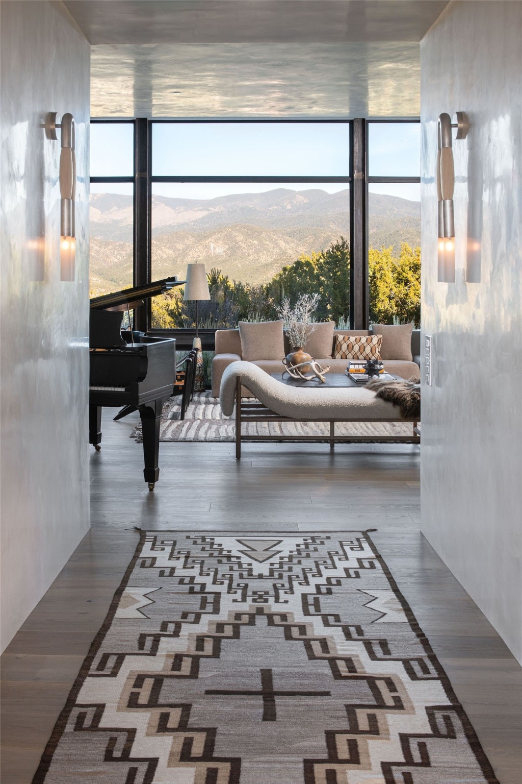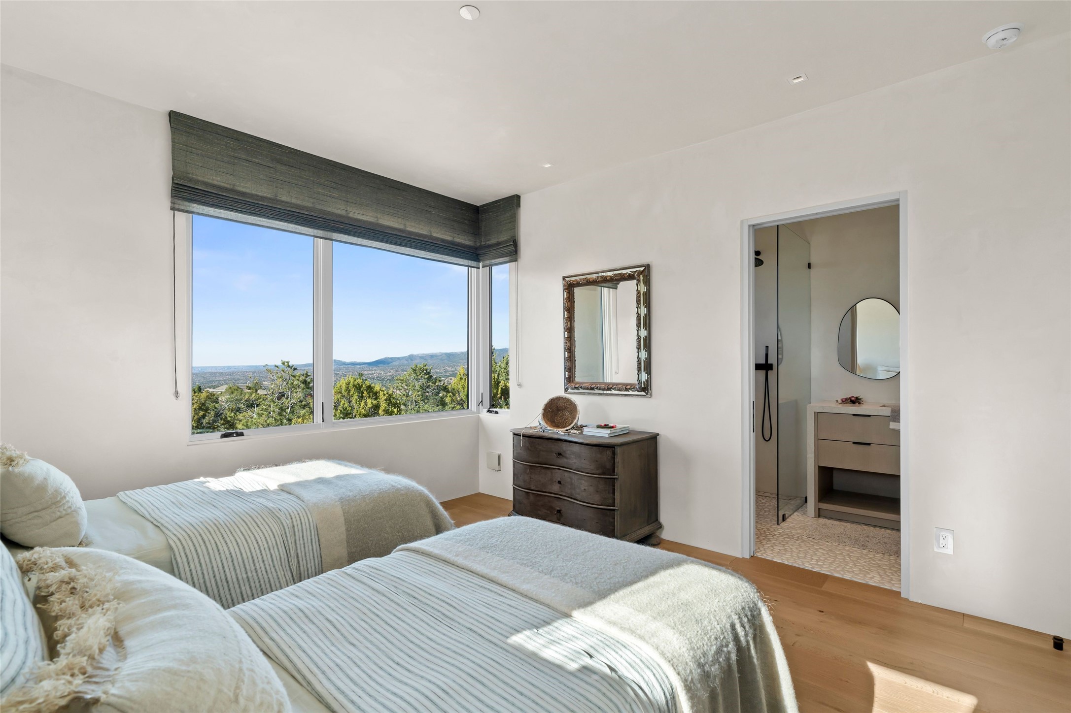 Experience the pinnacle of luxury living in this stunning 4-bedroom, 3.5-bath home, including an 878 sq. ft. guesthouse. Situated within the esteemed Monte Sereno community, this award-winning residence, designed by architect Robert Zachry and builder Scott Wong of Solterra, captures the essence of modern elegance. Perched on one of the highest lots in the community, with a private, gated entrance, enjoy 270-degree unobstructed views of the Sangre de Cristo Mountains, the Badlands, Ortiz/Sandia Mountains, and the twinkling lights of Santa Fe. This single-level home has recently been thoughtfully reimagined by designer Mary Clark with luxury finishes throughout. The flow from the living room to the dining area, kitchen, and outdoor portals creates an inviting atmosphere. The open kitchen includes custom oak cabinetry, travertine countertops, Gaggenau ovens, Thermador and Miele appliances, as well as a hidden scullery. Luxurious owner's suite provides privacy, featuring a Swedish wood burning stove, two walk-in closets, exercise room, and an en-suite bath with a travertine wet room, Waterworks soaking tub, Vola faucets and shower for two. Additional highlights include 32 solar panels, a heated driveway and sidewalks and a comprehensive audio system. The in-ground hot tub / plunge pool and outdoor custom kitchen, equipped with a Hestan grill and Alfa gas pizza oven, are ideal for entertaining. Low-water xeriscape landscaping enhances outdoor appeal, while the 2-car garage plus another in the guesthouse adds convenience. Discover unparalleled living in a convenient, close-in location where comfort and sophistication unite.