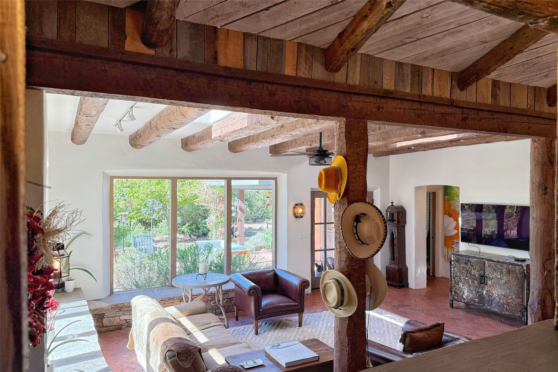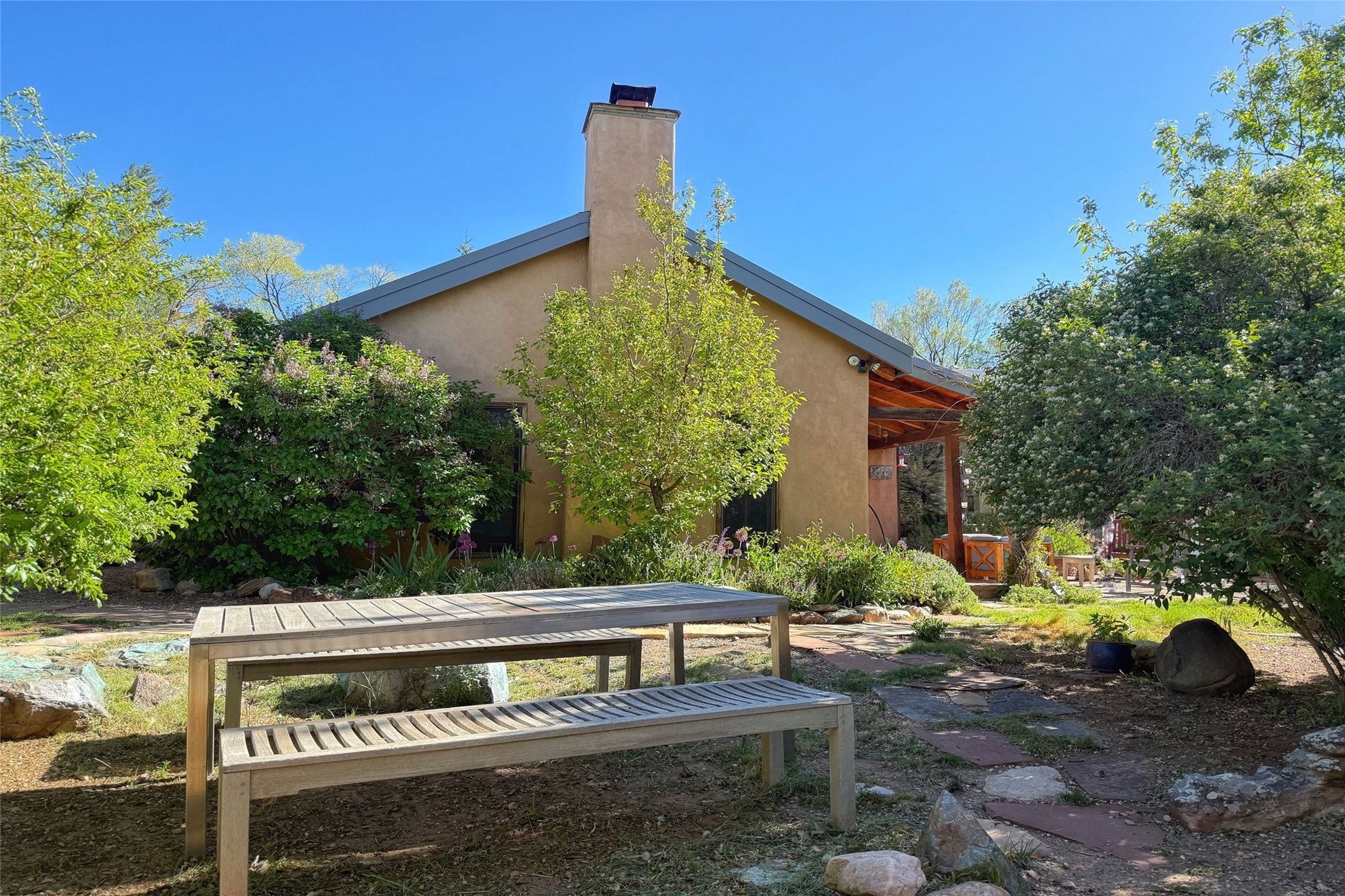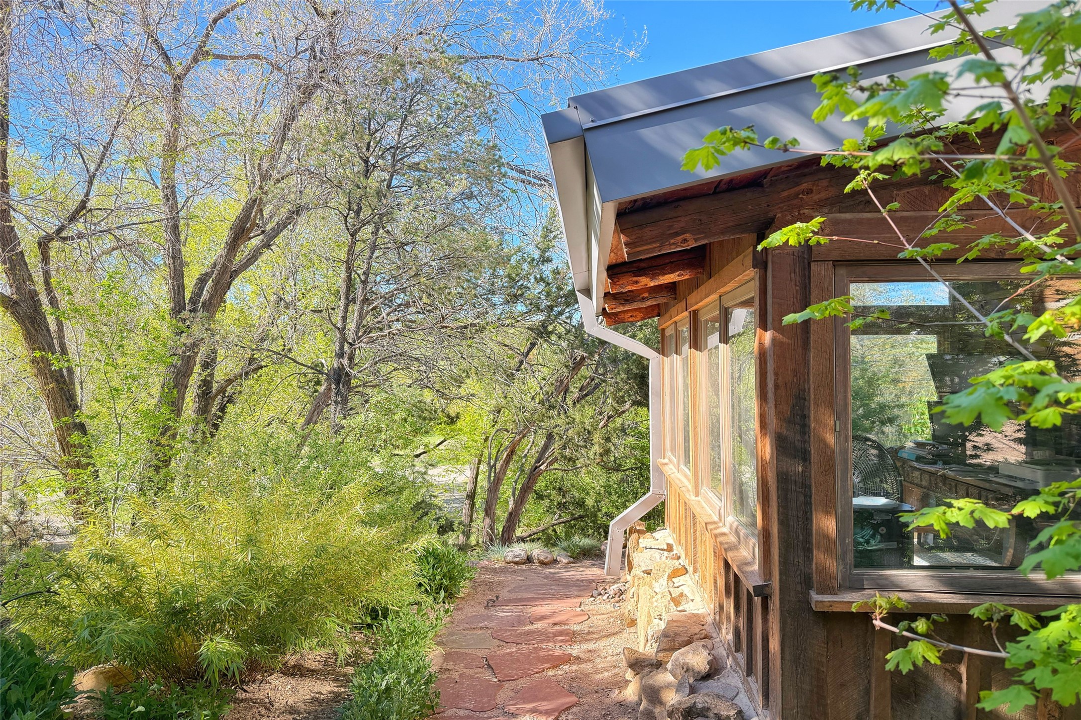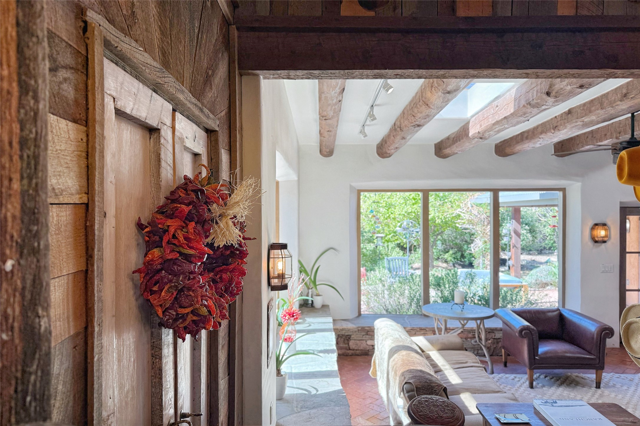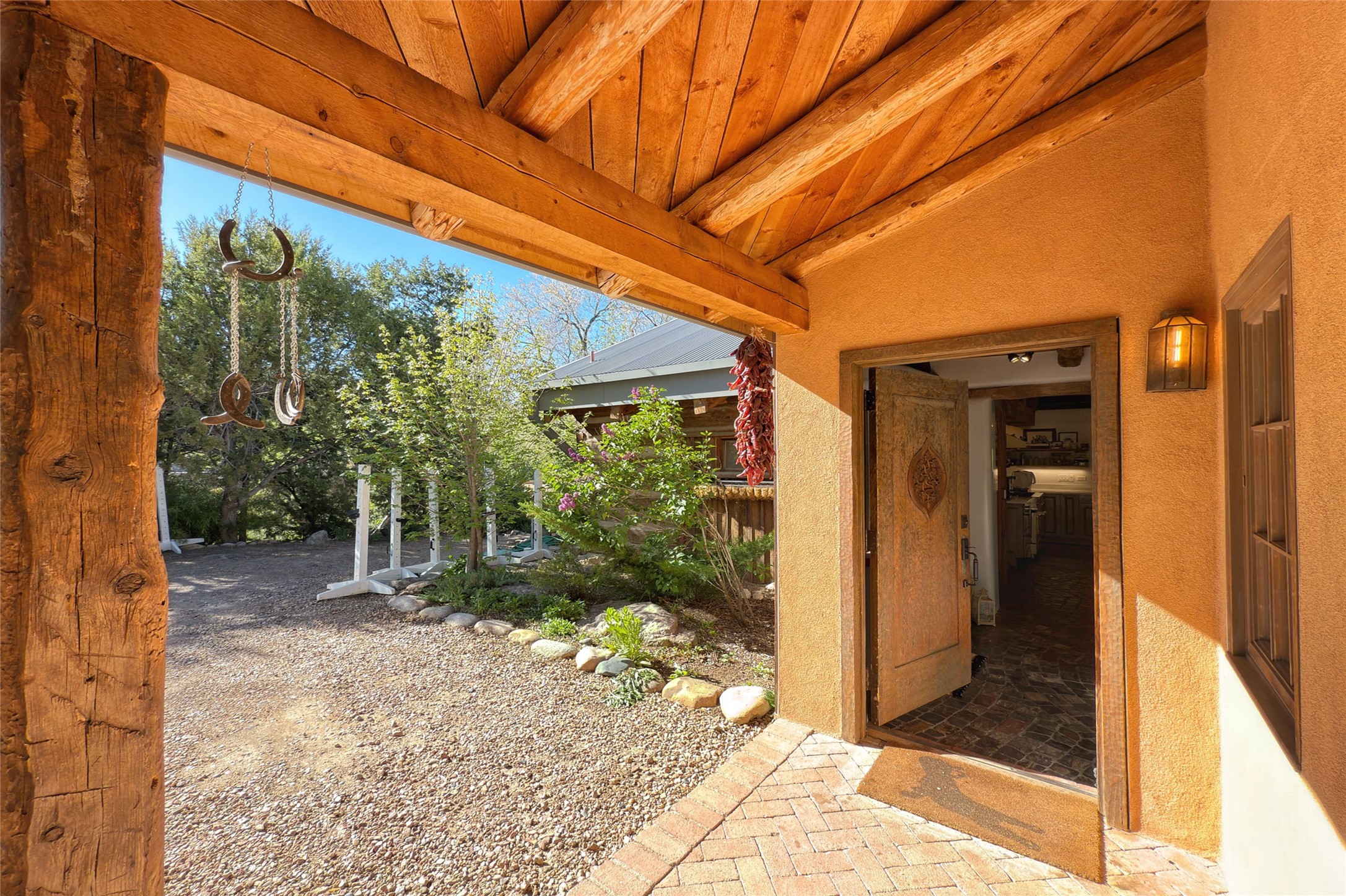 Rustic Charm Meets Santa Fe Serenity - East Side GemDiscover a truly unique and lovingly maintained property on the desirable East Side of Santa Fe. Once an original barn, this character-rich home blends rustic authenticity with modern touches to create a warm and inviting living space surrounded by natural beauty.Inside, the home retains many of its original features, including gorgeous stone barn flooring, now integrated seamlessly into the interior, and exposed pitched beams that frame the ceilings. The rough-hewn wood treatments, wood plank floors, and custom doors with distinctive hardware enhance the home's one-of-a-kind storybook charm.The kitchen is a showstopper, centered around a stunning oval island counter crafted by AZ Tile (material to be confirmed, possibly granite) and built on the original barn wood base. Culinary enthusiasts will appreciate the brass Big Chill dual-fuel range (gas cooktop, electric oven) and a uniquely designed wine storage cabinet that adds flair and function.Two bedrooms feature ladder-accessed storage lofts, providing additional space and a whimsical touch.Outside, the property is fully irrigated, showcasing vibrant floral gardens, a separate curated vegetable garden, and a variety of mature fruit trees including Apricot, Pear, Plum, and Apple. Listen to the tranquil sounds of the Santa Fe River just beyond the fenced yard, and enjoy peaceful strolls along garden paths that wind through this magical slice of Northern New Mexico.