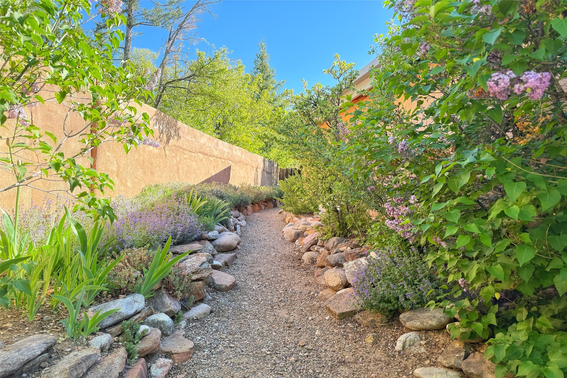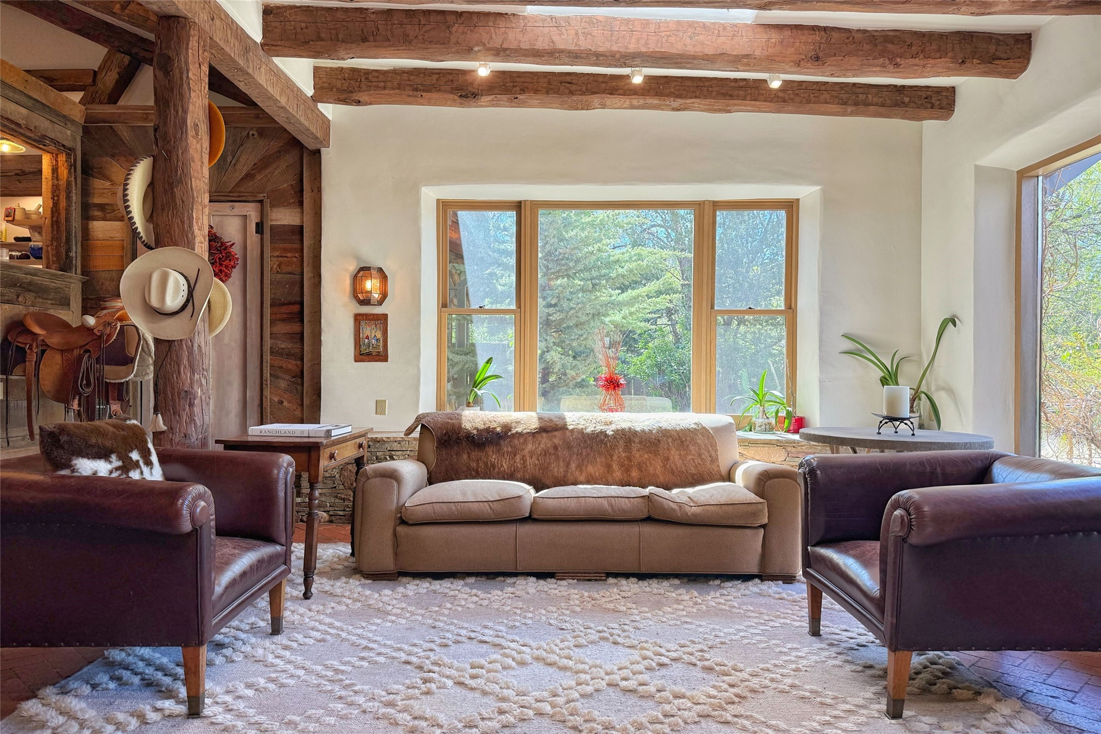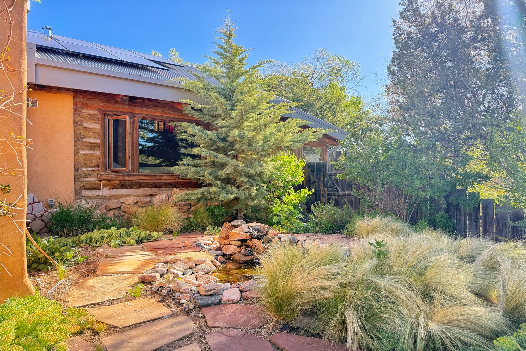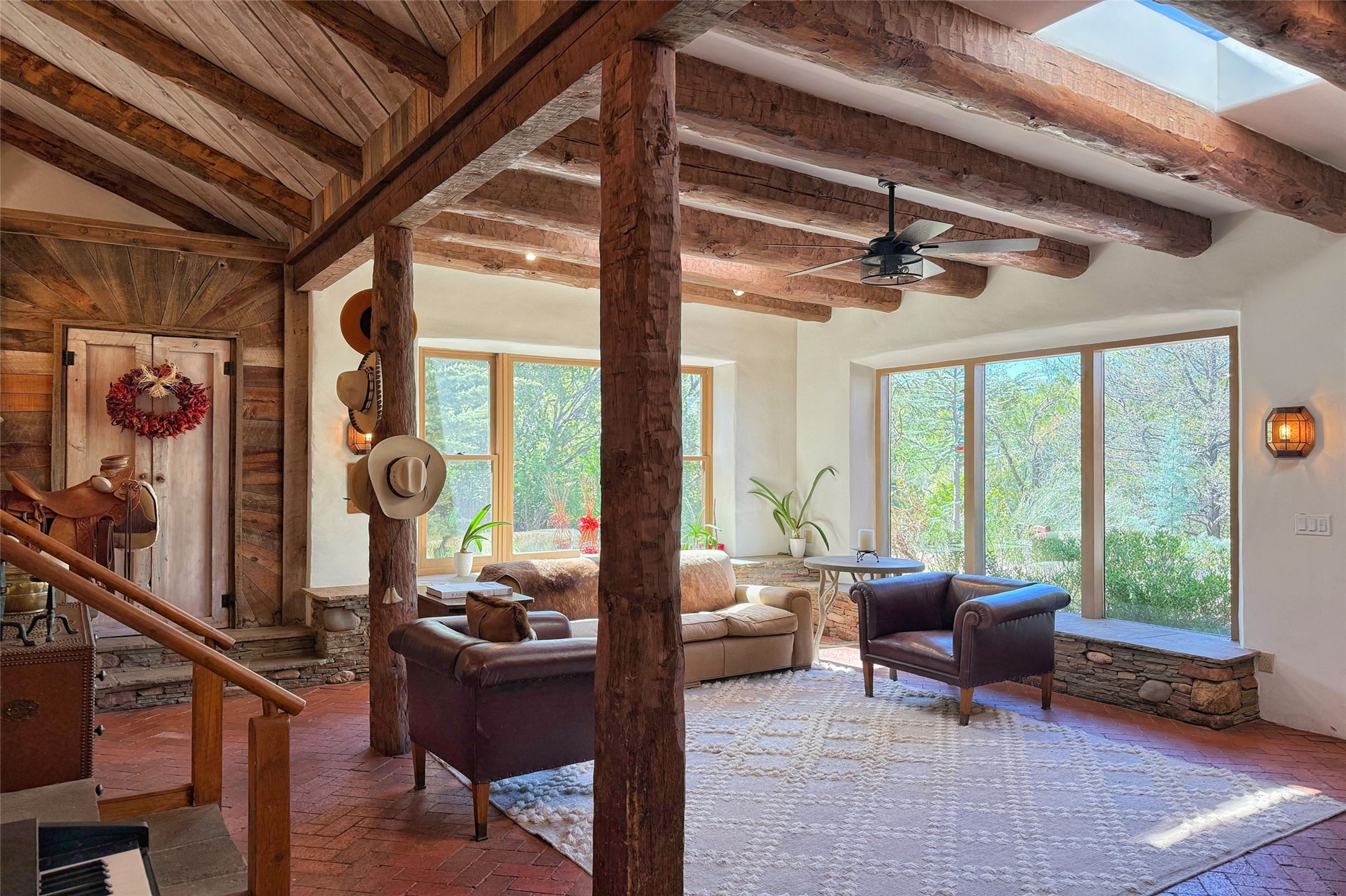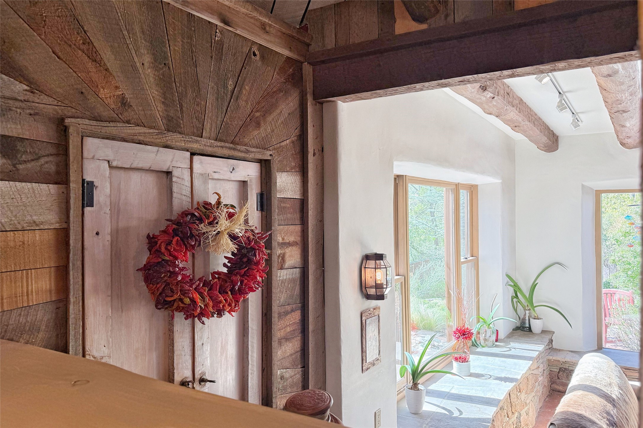 Rustic Charm Meets Santa Fe Serenity - East Side GemDiscover a truly unique and lovingly maintained property on the desirable East Side of Santa Fe. Once an original barn, this character-rich home blends rustic authenticity with modern touches to create a warm and inviting living space surrounded by natural beauty.Inside, the home retains many of its original features, including gorgeous stone barn flooring, now integrated seamlessly into the interior, and exposed pitched beams that frame the ceilings. The rough-hewn wood treatments, wood plank floors, and custom doors with distinctive hardware enhance the home's one-of-a-kind storybook charm.The kitchen is a showstopper, centered around a stunning oval island counter crafted by AZ Tile (material to be confirmed, possibly granite) and built on the original barn wood base. Culinary enthusiasts will appreciate the brass Big Chill dual-fuel range (gas cooktop, electric oven) and a uniquely designed wine storage cabinet that adds flair and function.Two bedrooms feature ladder-accessed storage lofts, providing additional space and a whimsical touch.Outside, the property is fully irrigated, showcasing vibrant floral gardens, a separate curated vegetable garden, and a variety of mature fruit trees including Apricot, Pear, Plum, and Apple. Listen to the tranquil sounds of the Santa Fe River just beyond the fenced yard, and enjoy peaceful strolls along garden paths that wind through this magical slice of Northern New Mexico.