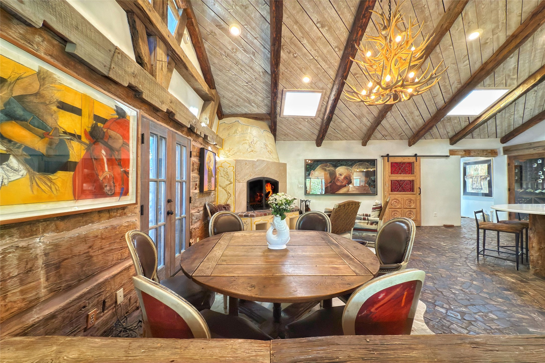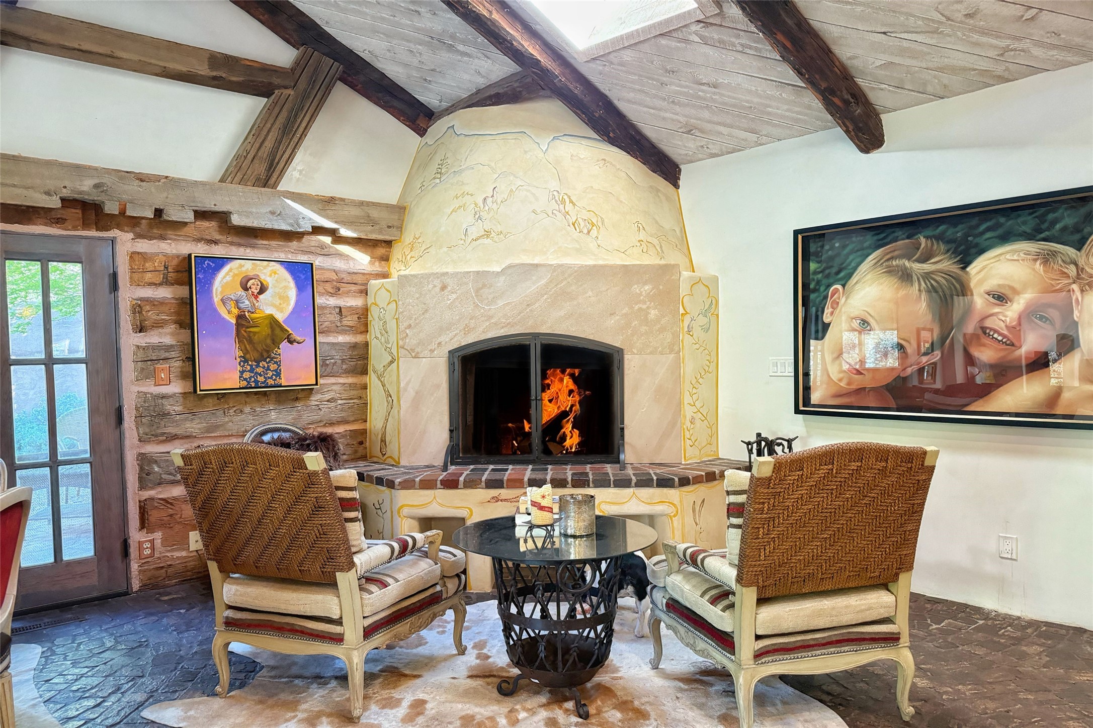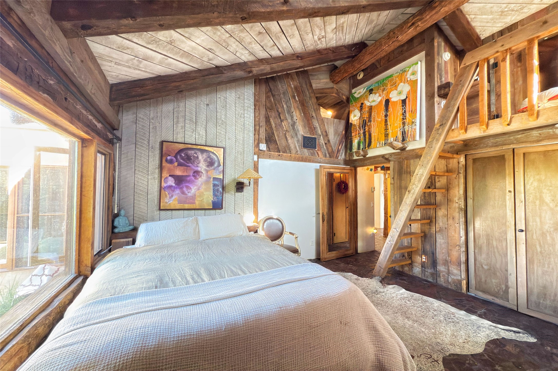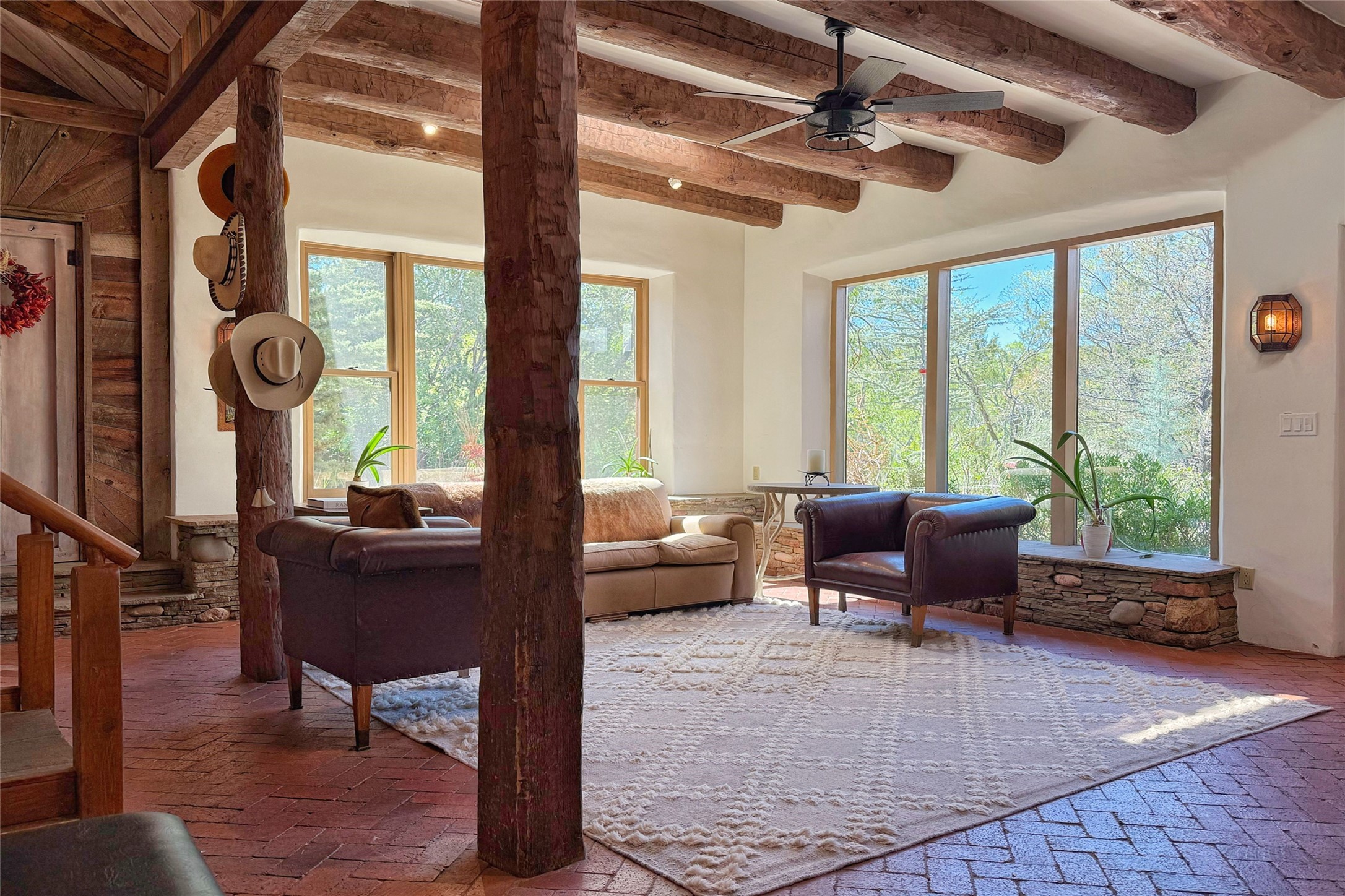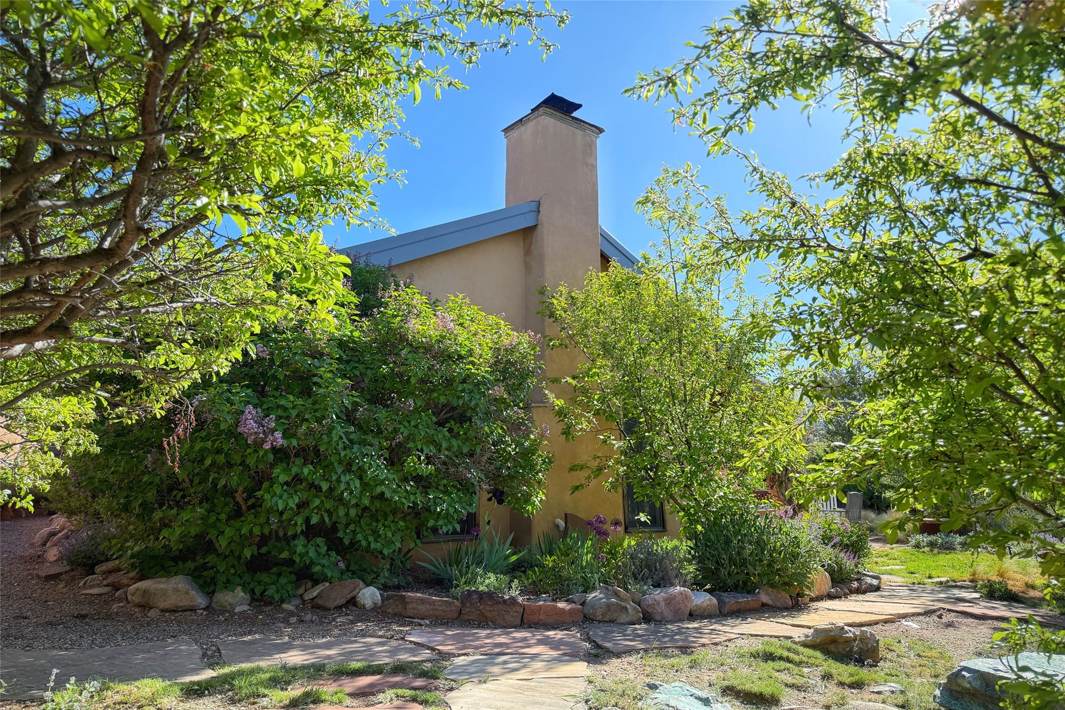 Rustic Charm Meets Santa Fe Serenity - East Side GemDiscover a truly unique and lovingly maintained property on the desirable East Side of Santa Fe. Once an original barn, this character-rich home blends rustic authenticity with modern touches to create a warm and inviting living space surrounded by natural beauty.Inside, the home retains many of its original features, including gorgeous stone barn flooring, now integrated seamlessly into the interior, and exposed pitched beams that frame the ceilings. The rough-hewn wood treatments, wood plank floors, and custom doors with distinctive hardware enhance the home's one-of-a-kind storybook charm.The kitchen is a showstopper, centered around a stunning oval island counter crafted by AZ Tile (material to be confirmed, possibly granite) and built on the original barn wood base. Culinary enthusiasts will appreciate the brass Big Chill dual-fuel range (gas cooktop, electric oven) and a uniquely designed wine storage cabinet that adds flair and function.Two bedrooms feature ladder-accessed storage lofts, providing additional space and a whimsical touch.Outside, the property is fully irrigated, showcasing vibrant floral gardens, a separate curated vegetable garden, and a variety of mature fruit trees including Apricot, Pear, Plum, and Apple. Listen to the tranquil sounds of the Santa Fe River just beyond the fenced yard, and enjoy peaceful strolls along garden paths that wind through this magical slice of Northern New Mexico.