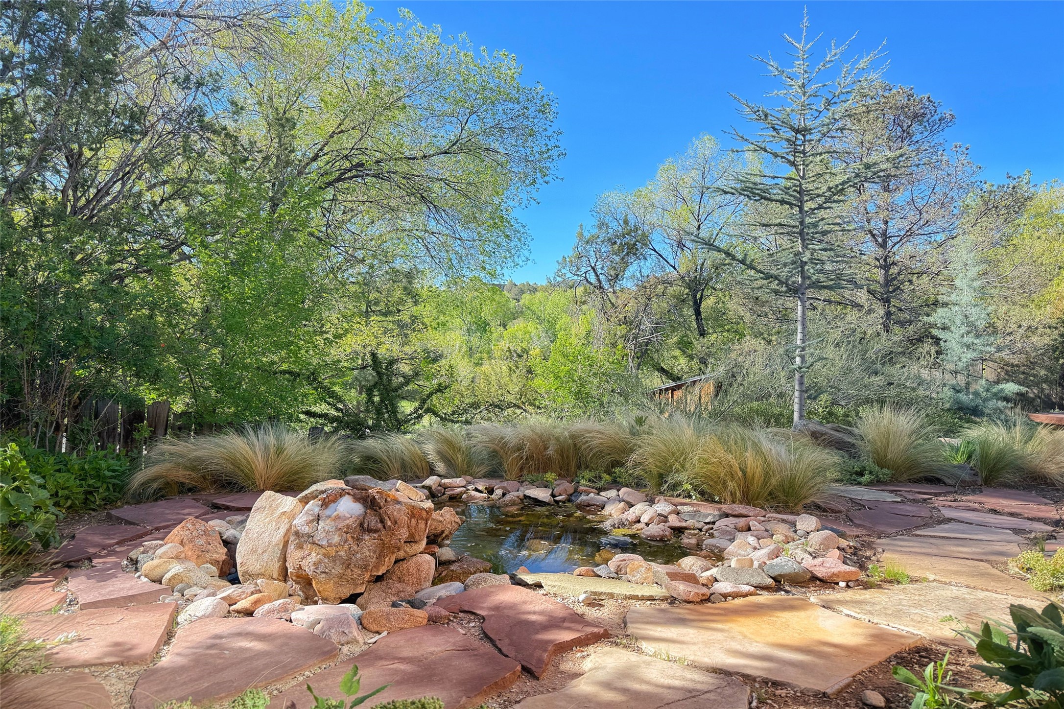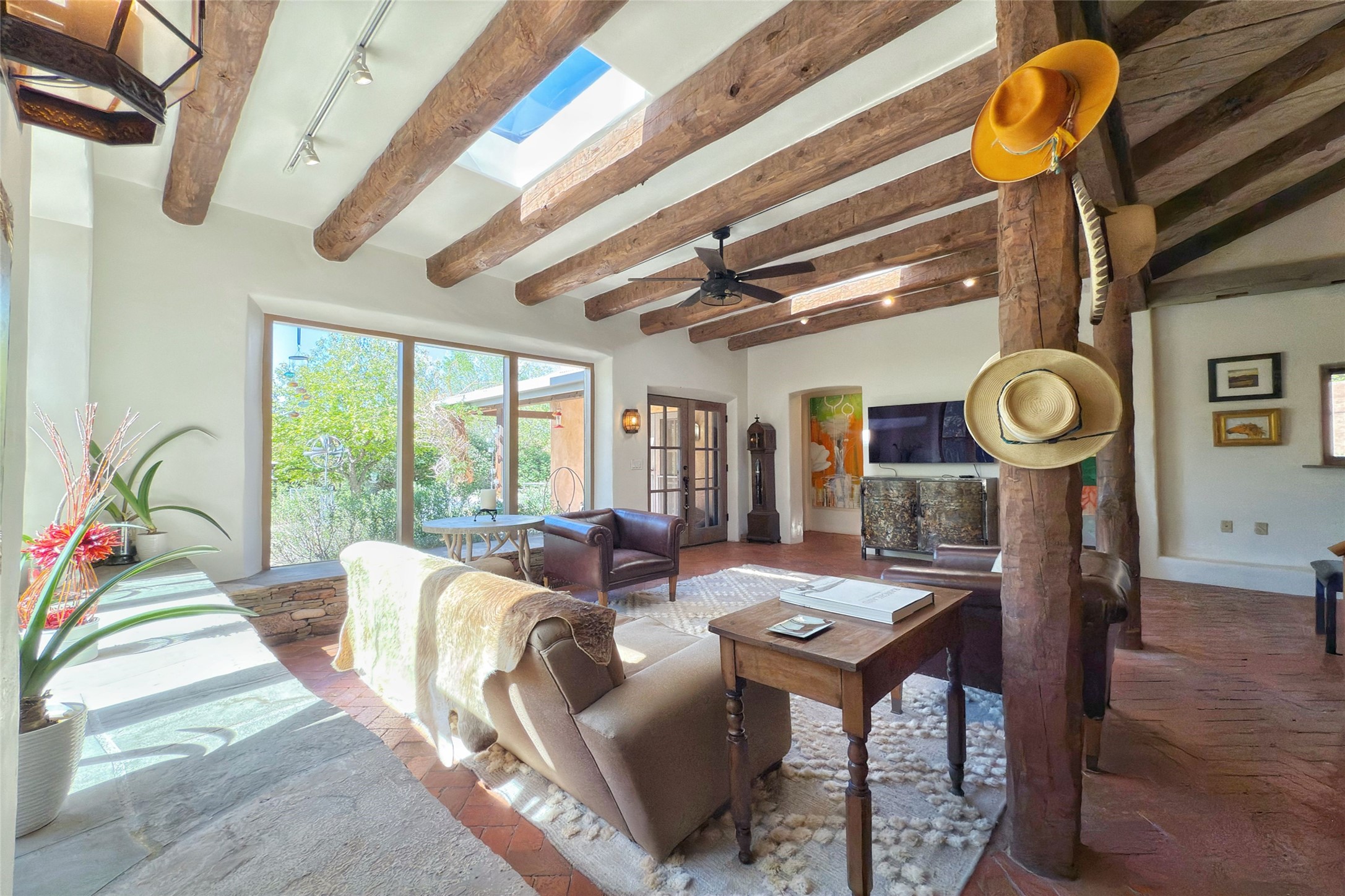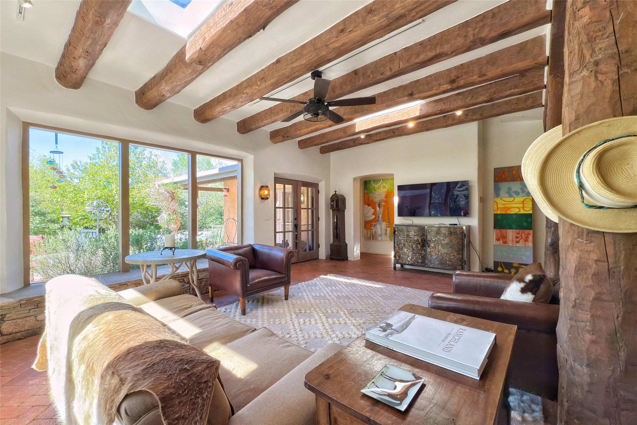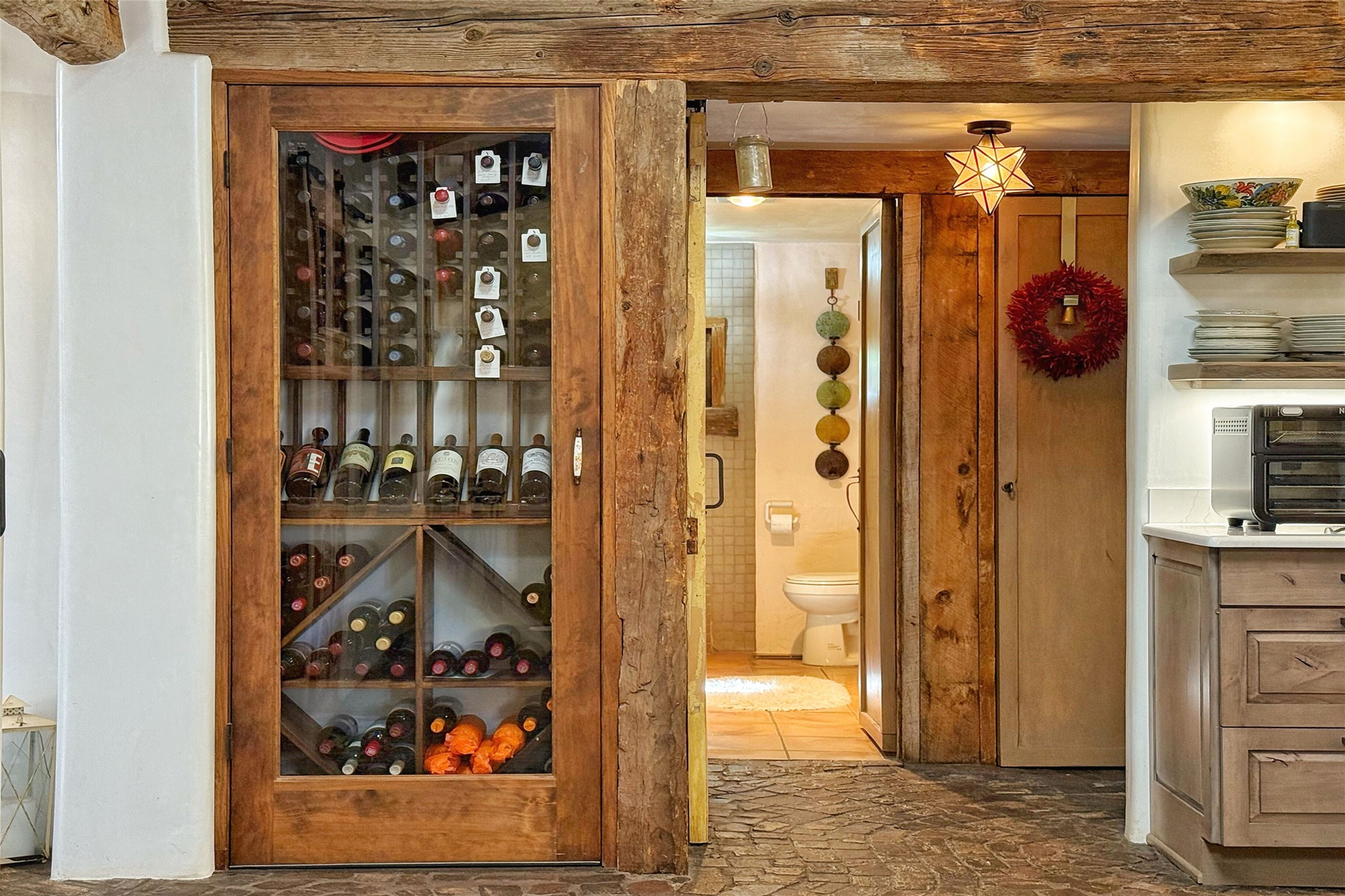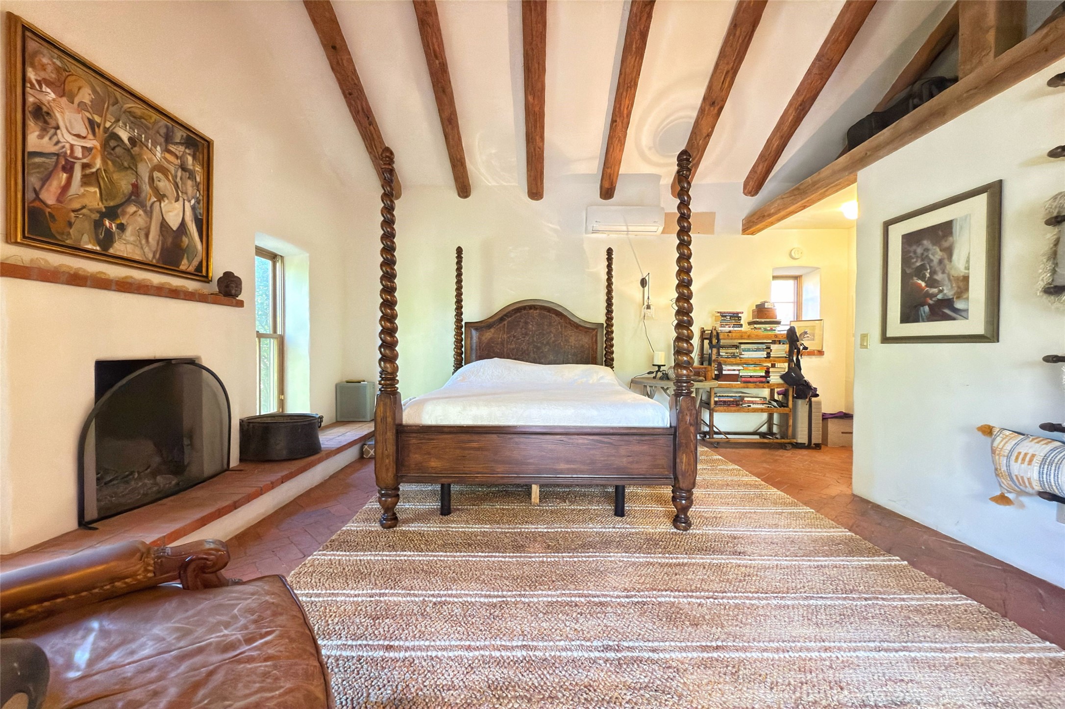 Rustic Charm Meets Santa Fe Serenity - East Side GemDiscover a truly unique and lovingly maintained property on the desirable East Side of Santa Fe. Once an original barn, this character-rich home blends rustic authenticity with modern touches to create a warm and inviting living space surrounded by natural beauty.Inside, the home retains many of its original features, including gorgeous stone barn flooring, now integrated seamlessly into the interior, and exposed pitched beams that frame the ceilings. The rough-hewn wood treatments, wood plank floors, and custom doors with distinctive hardware enhance the home's one-of-a-kind storybook charm.The kitchen is a showstopper, centered around a stunning oval island counter crafted by AZ Tile (material to be confirmed, possibly granite) and built on the original barn wood base. Culinary enthusiasts will appreciate the brass Big Chill dual-fuel range (gas cooktop, electric oven) and a uniquely designed wine storage cabinet that adds flair and function.Two bedrooms feature ladder-accessed storage lofts, providing additional space and a whimsical touch.Outside, the property is fully irrigated, showcasing vibrant floral gardens, a separate curated vegetable garden, and a variety of mature fruit trees including Apricot, Pear, Plum, and Apple. Listen to the tranquil sounds of the Santa Fe River just beyond the fenced yard, and enjoy peaceful strolls along garden paths that wind through this magical slice of Northern New Mexico.