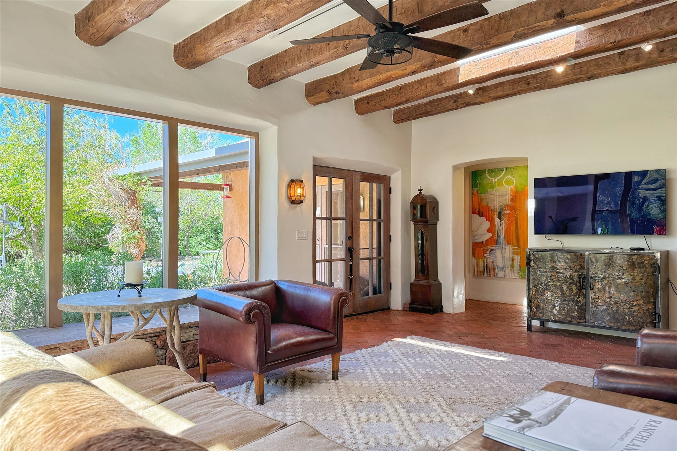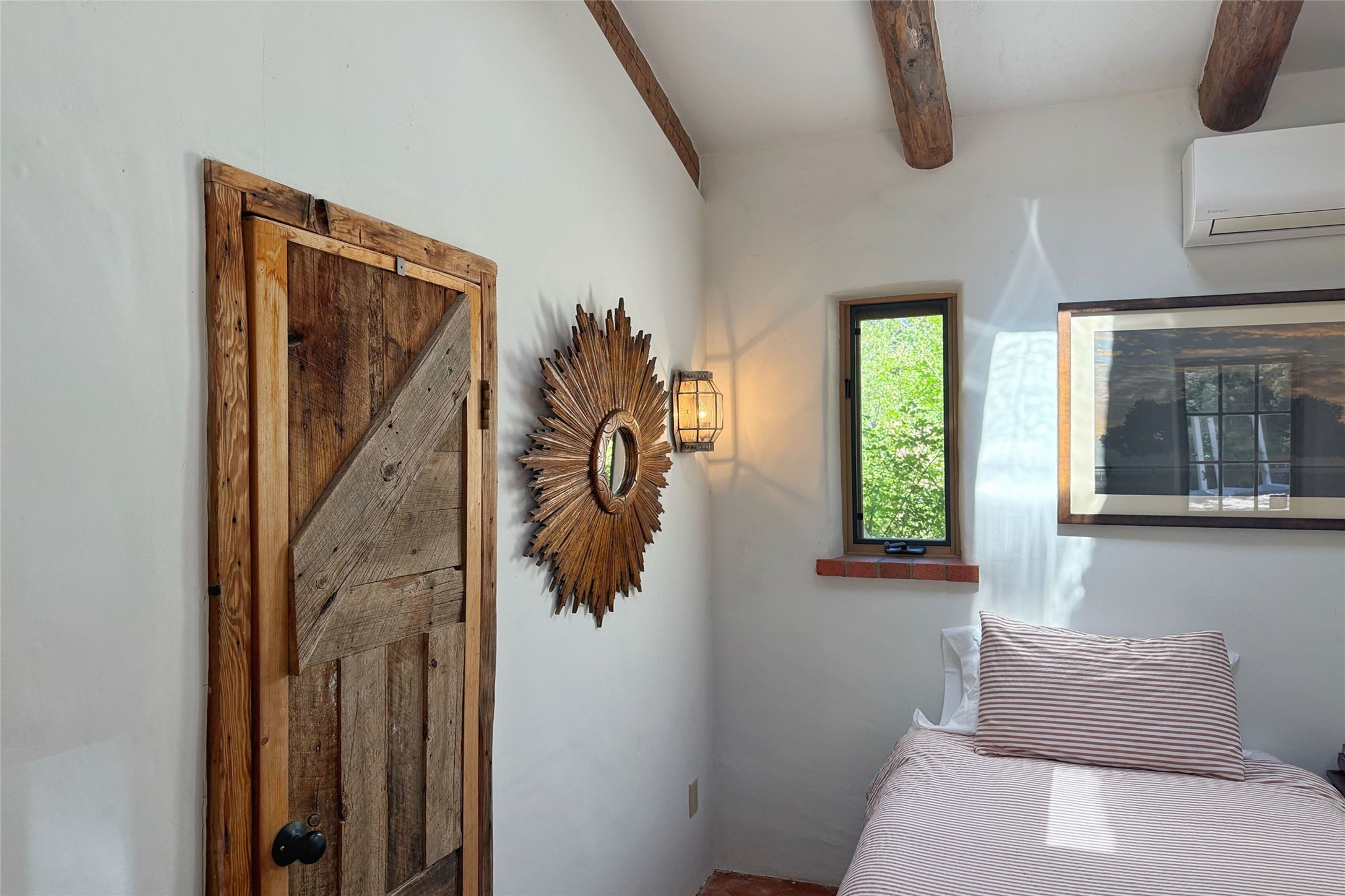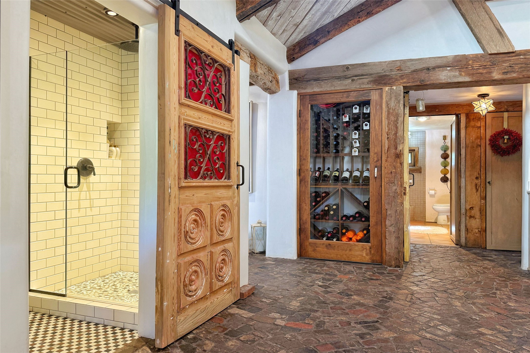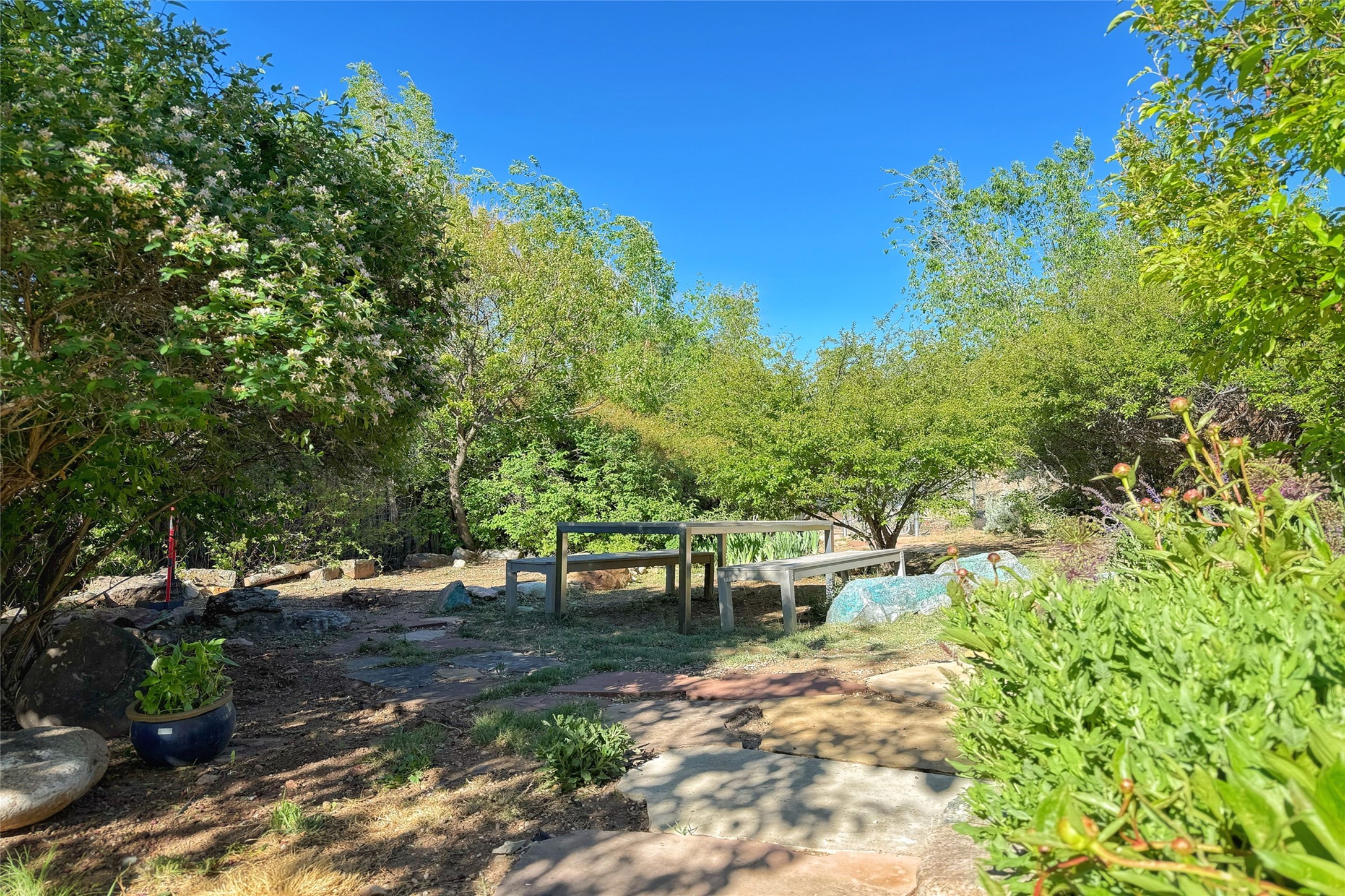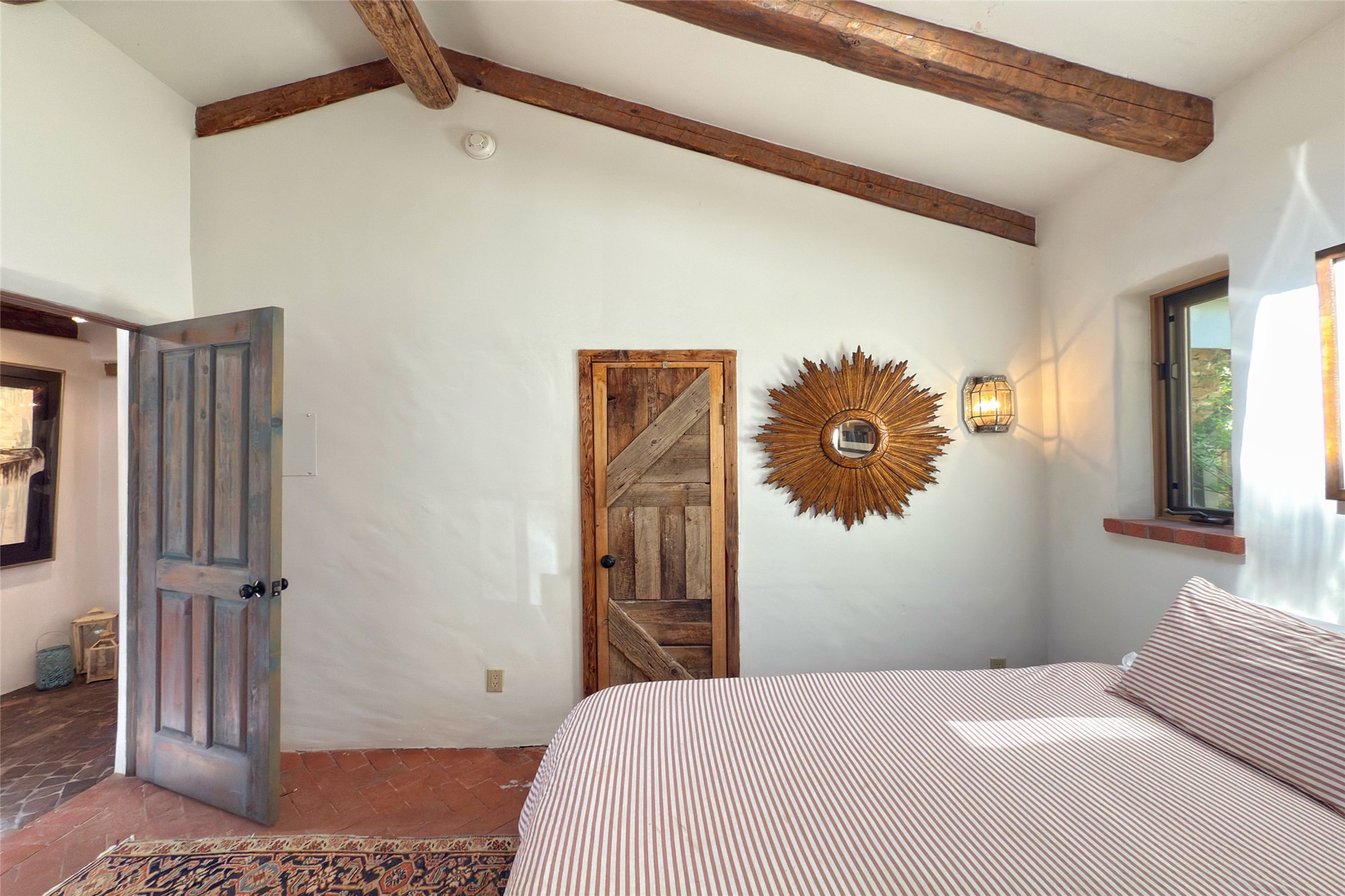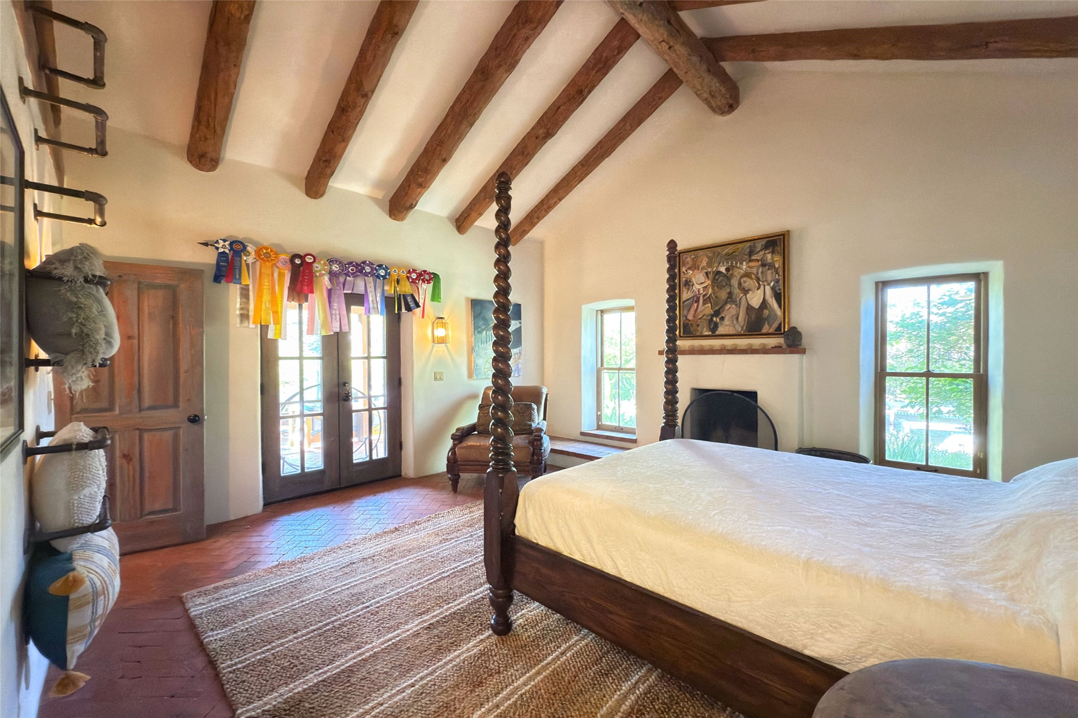Rustic Charm Meets Santa Fe Serenity - East Side GemDiscover a truly unique and lovingly maintained property on the desirable East Side of Santa Fe. Once an original barn, this character-rich home blends rustic authenticity with modern touches to create a warm and inviting living space surrounded by natural beauty.Inside, the home retains many of its original features, including gorgeous stone barn flooring, now integrated seamlessly into the interior, and exposed pitched beams that frame the ceilings. The rough-hewn wood treatments, wood plank floors, and custom doors with distinctive hardware enhance the home's one-of-a-kind storybook charm.The kitchen is a showstopper, centered around a stunning oval island counter crafted by AZ Tile (material to be confirmed, possibly granite) and built on the original barn wood base. Culinary enthusiasts will appreciate the brass Big Chill dual-fuel range (gas cooktop, electric oven) and a uniquely designed wine storage cabinet that adds flair and function.Two bedrooms feature ladder-accessed storage lofts, providing additional space and a whimsical touch.Outside, the property is fully irrigated, showcasing vibrant floral gardens, a separate curated vegetable garden, and a variety of mature fruit trees including Apricot, Pear, Plum, and Apple. Listen to the tranquil sounds of the Santa Fe River just beyond the fenced yard, and enjoy peaceful strolls along garden paths that wind through this magical slice of Northern New Mexico.