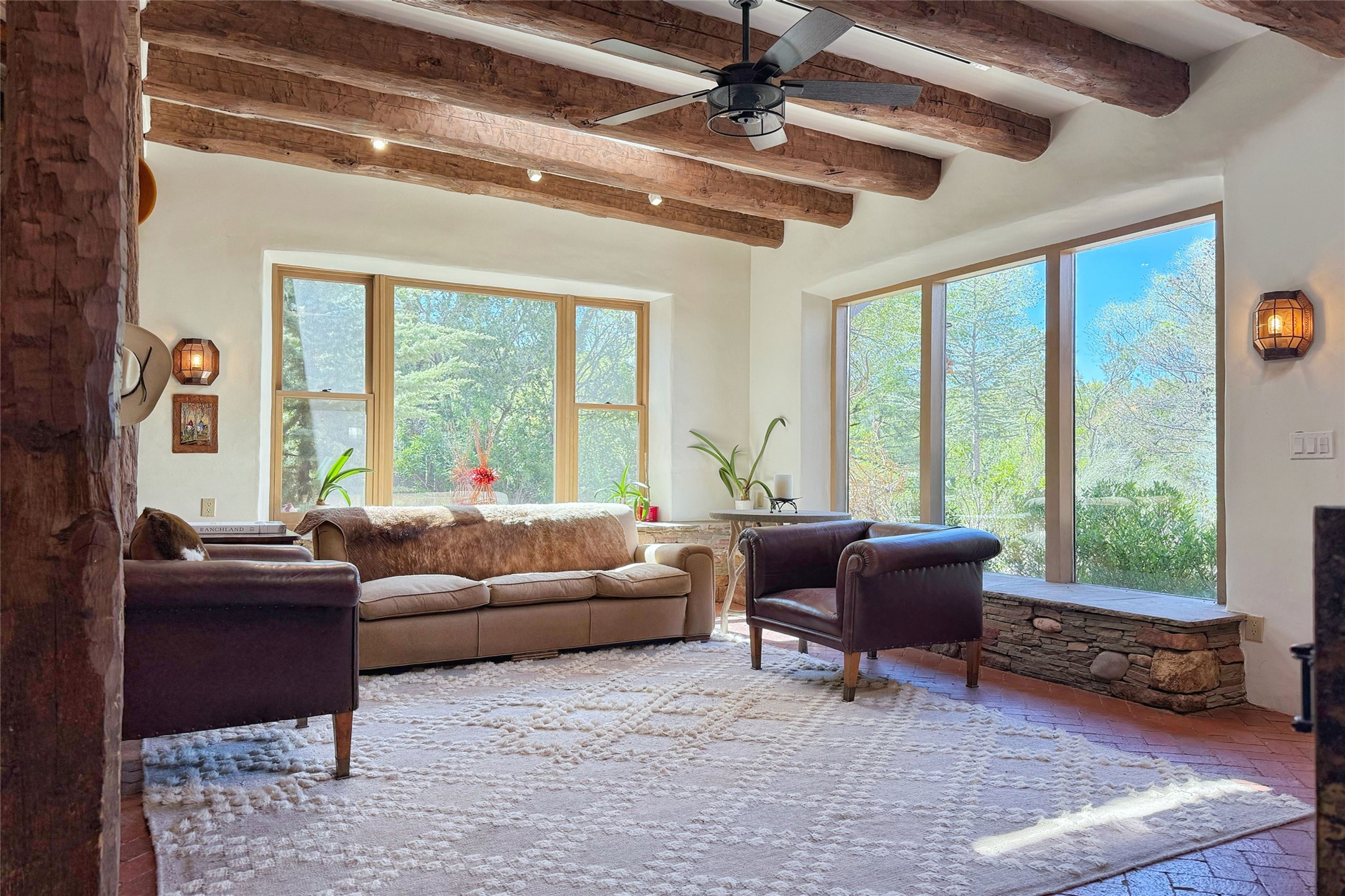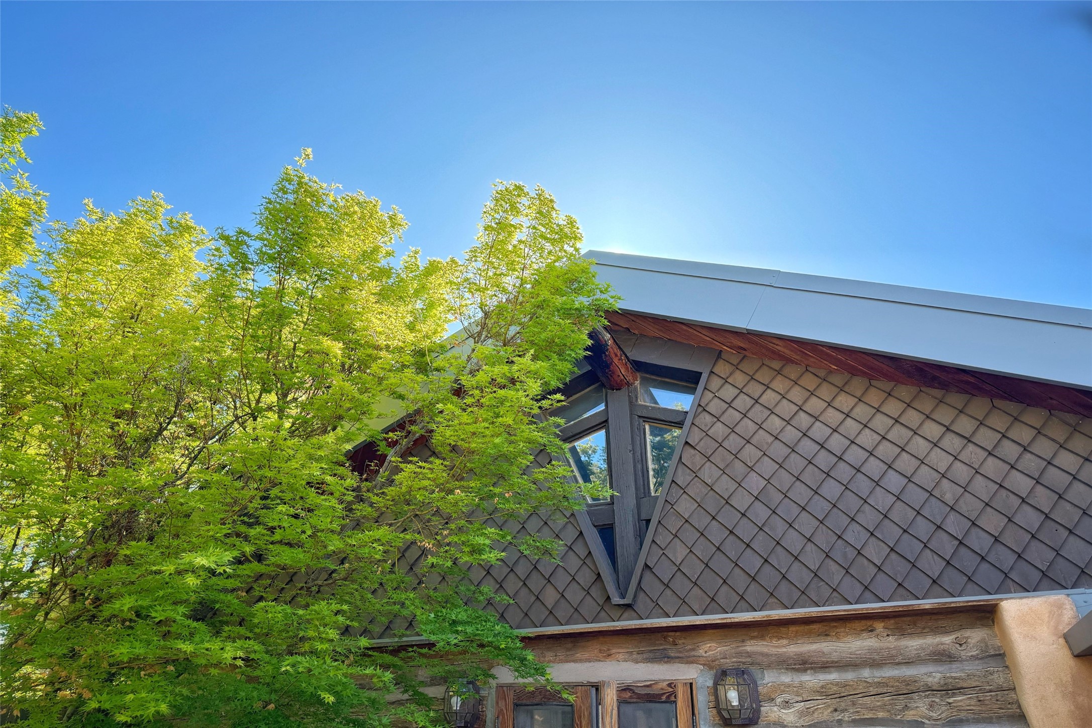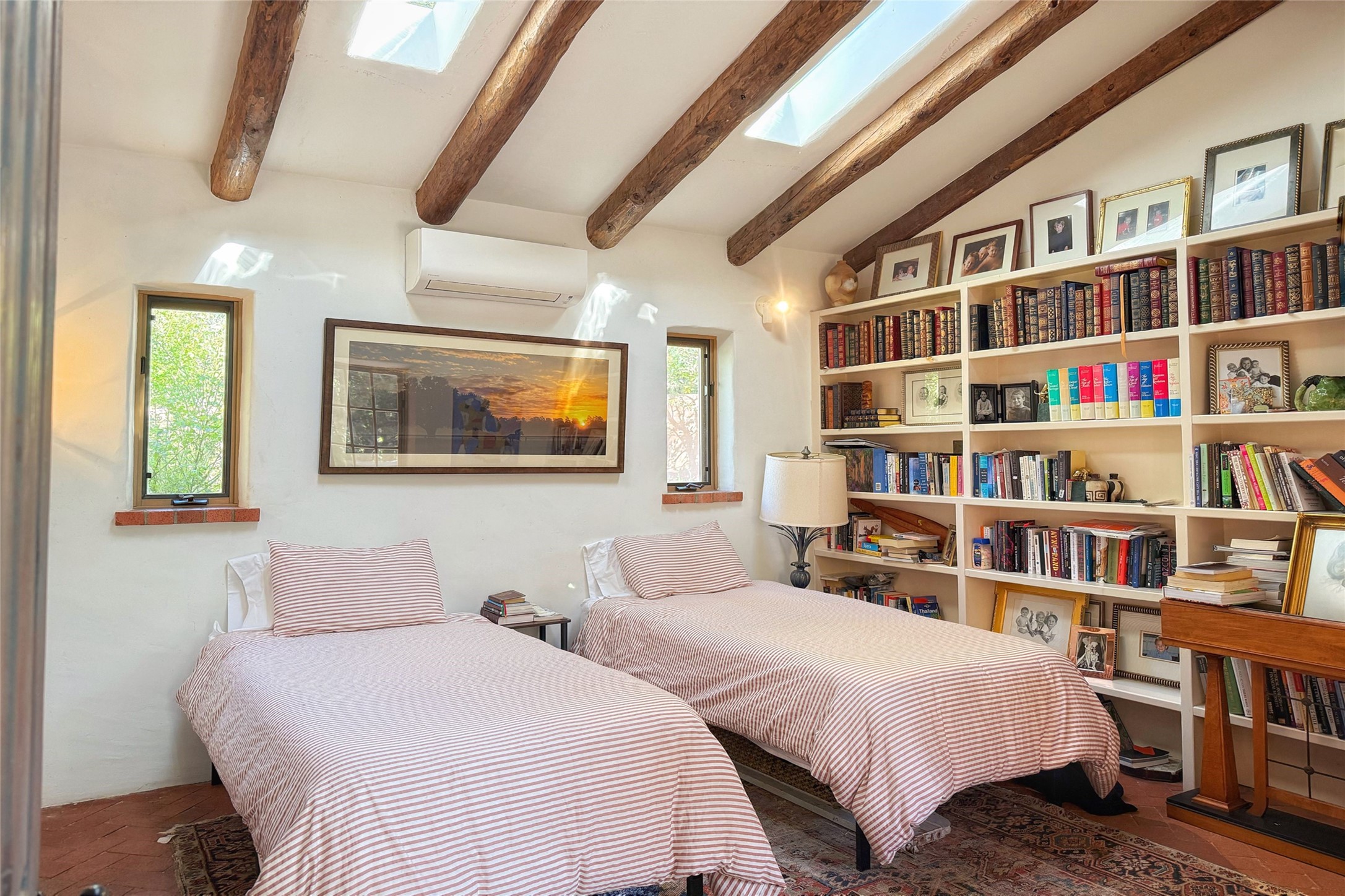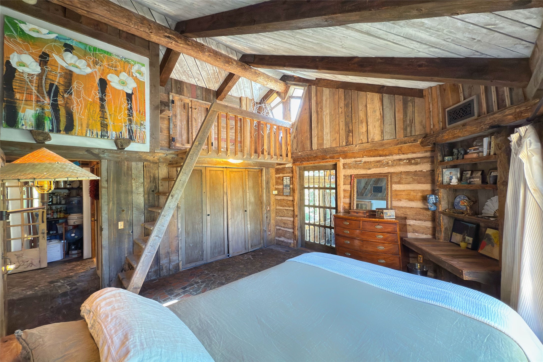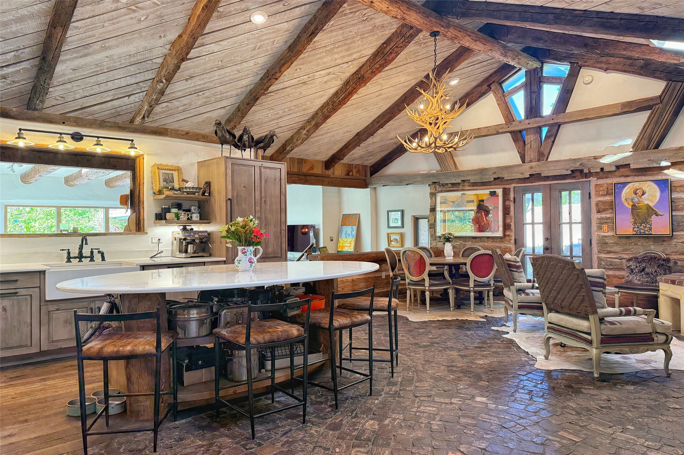 Rustic Charm Meets Santa Fe Serenity - East Side GemDiscover a truly unique and lovingly maintained property on the desirable East Side of Santa Fe. Once an original barn, this character-rich home blends rustic authenticity with modern touches to create a warm and inviting living space surrounded by natural beauty.Inside, the home retains many of its original features, including gorgeous stone barn flooring, now integrated seamlessly into the interior, and exposed pitched beams that frame the ceilings. The rough-hewn wood treatments, wood plank floors, and custom doors with distinctive hardware enhance the home's one-of-a-kind storybook charm.The kitchen is a showstopper, centered around a stunning oval island counter crafted by AZ Tile (material to be confirmed, possibly granite) and built on the original barn wood base. Culinary enthusiasts will appreciate the brass Big Chill dual-fuel range (gas cooktop, electric oven) and a uniquely designed wine storage cabinet that adds flair and function.Two bedrooms feature ladder-accessed storage lofts, providing additional space and a whimsical touch.Outside, the property is fully irrigated, showcasing vibrant floral gardens, a separate curated vegetable garden, and a variety of mature fruit trees including Apricot, Pear, Plum, and Apple. Listen to the tranquil sounds of the Santa Fe River just beyond the fenced yard, and enjoy peaceful strolls along garden paths that wind through this magical slice of Northern New Mexico.