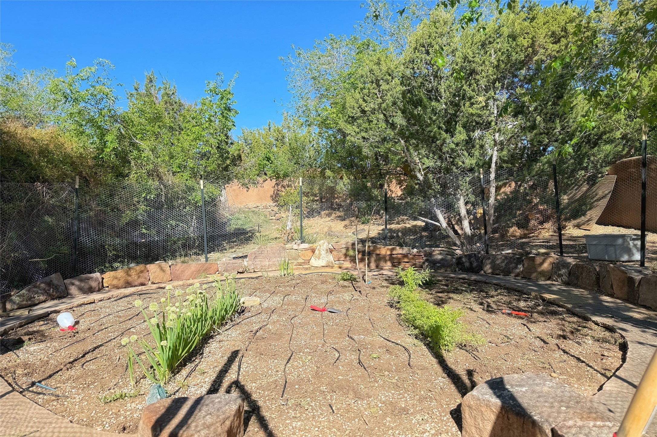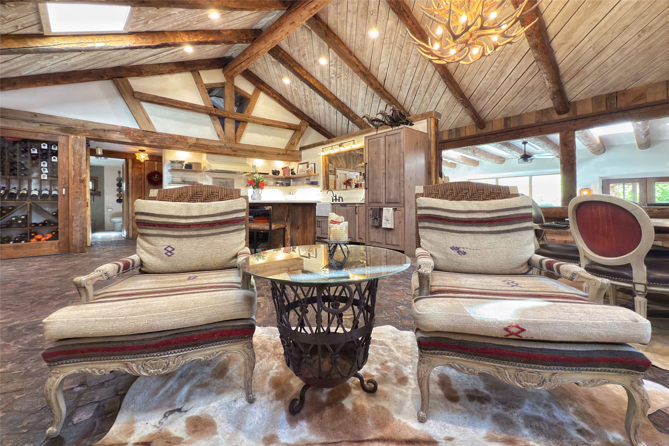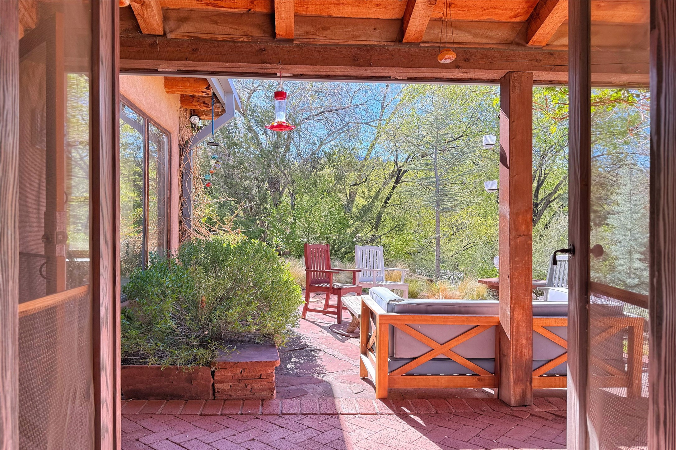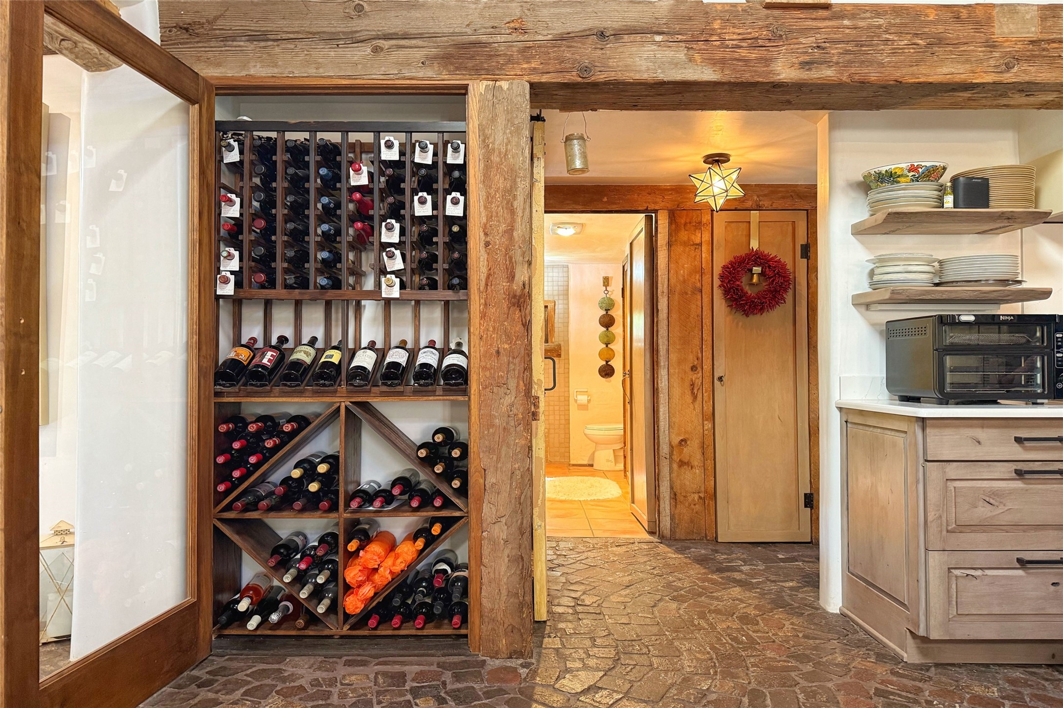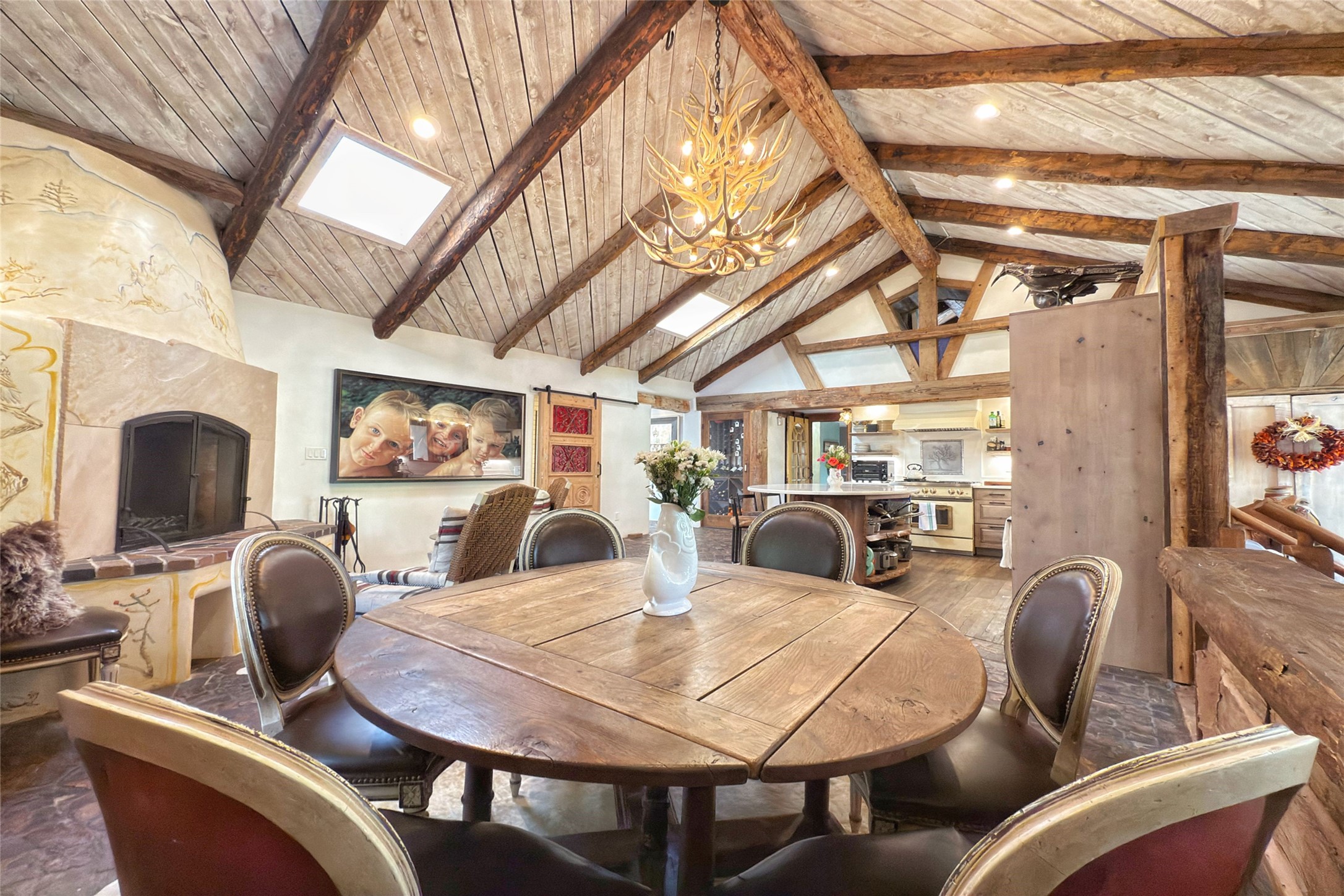 Rustic Charm Meets Santa Fe Serenity - East Side GemDiscover a truly unique and lovingly maintained property on the desirable East Side of Santa Fe. Once an original barn, this character-rich home blends rustic authenticity with modern touches to create a warm and inviting living space surrounded by natural beauty.Inside, the home retains many of its original features, including gorgeous stone barn flooring, now integrated seamlessly into the interior, and exposed pitched beams that frame the ceilings. The rough-hewn wood treatments, wood plank floors, and custom doors with distinctive hardware enhance the home's one-of-a-kind storybook charm.The kitchen is a showstopper, centered around a stunning oval island counter crafted by AZ Tile (material to be confirmed, possibly granite) and built on the original barn wood base. Culinary enthusiasts will appreciate the brass Big Chill dual-fuel range (gas cooktop, electric oven) and a uniquely designed wine storage cabinet that adds flair and function.Two bedrooms feature ladder-accessed storage lofts, providing additional space and a whimsical touch.Outside, the property is fully irrigated, showcasing vibrant floral gardens, a separate curated vegetable garden, and a variety of mature fruit trees including Apricot, Pear, Plum, and Apple. Listen to the tranquil sounds of the Santa Fe River just beyond the fenced yard, and enjoy peaceful strolls along garden paths that wind through this magical slice of Northern New Mexico.