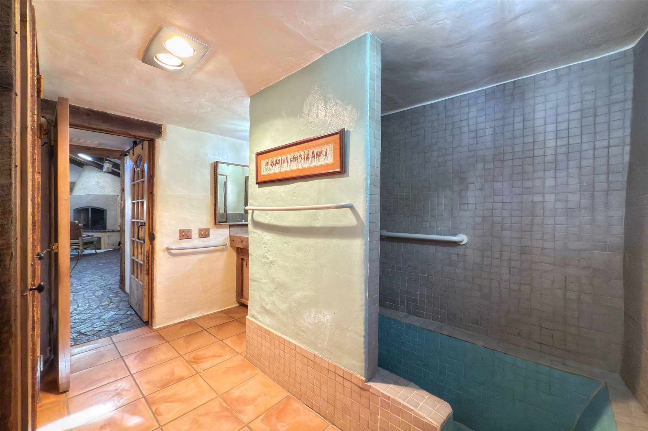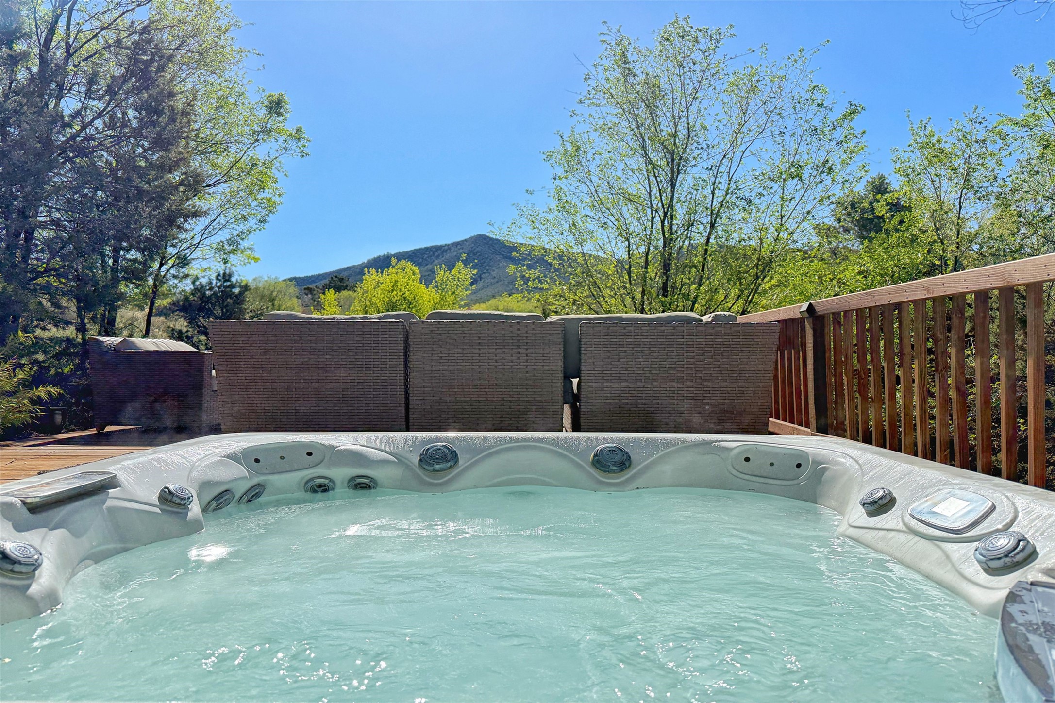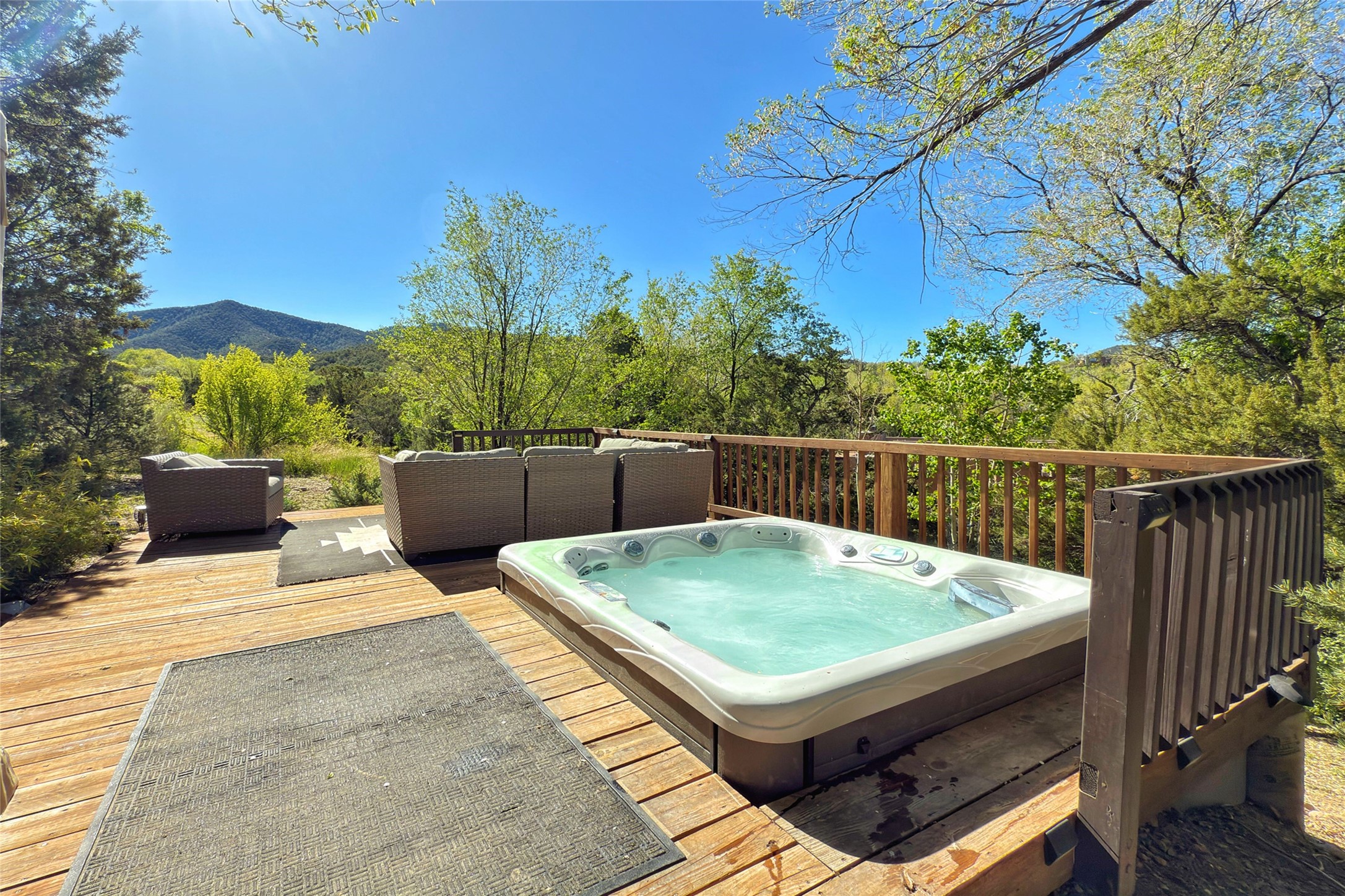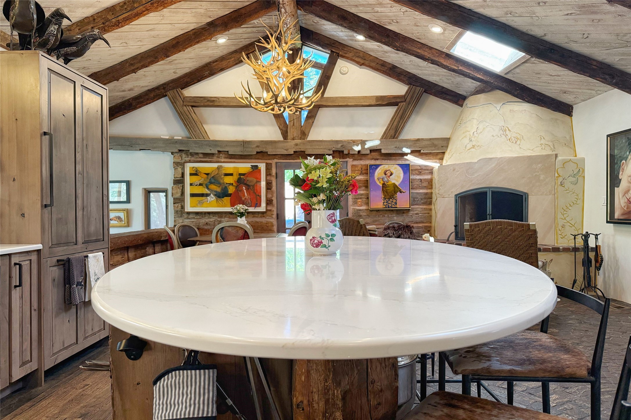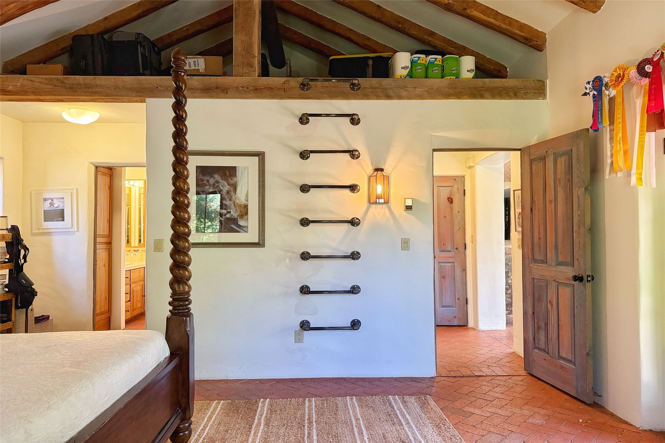 Rustic Charm Meets Santa Fe Serenity - East Side GemDiscover a truly unique and lovingly maintained property on the desirable East Side of Santa Fe. Once an original barn, this character-rich home blends rustic authenticity with modern touches to create a warm and inviting living space surrounded by natural beauty.Inside, the home retains many of its original features, including gorgeous stone barn flooring, now integrated seamlessly into the interior, and exposed pitched beams that frame the ceilings. The rough-hewn wood treatments, wood plank floors, and custom doors with distinctive hardware enhance the home's one-of-a-kind storybook charm.The kitchen is a showstopper, centered around a stunning oval island counter crafted by AZ Tile (material to be confirmed, possibly granite) and built on the original barn wood base. Culinary enthusiasts will appreciate the brass Big Chill dual-fuel range (gas cooktop, electric oven) and a uniquely designed wine storage cabinet that adds flair and function.Two bedrooms feature ladder-accessed storage lofts, providing additional space and a whimsical touch.Outside, the property is fully irrigated, showcasing vibrant floral gardens, a separate curated vegetable garden, and a variety of mature fruit trees including Apricot, Pear, Plum, and Apple. Listen to the tranquil sounds of the Santa Fe River just beyond the fenced yard, and enjoy peaceful strolls along garden paths that wind through this magical slice of Northern New Mexico.