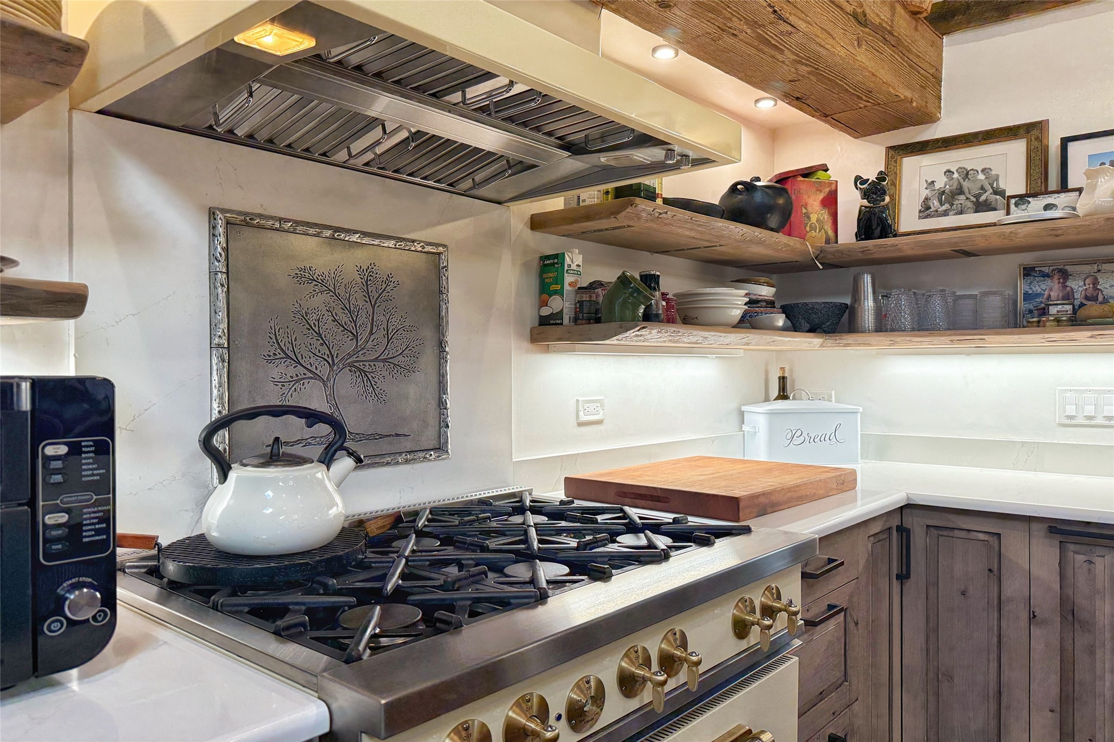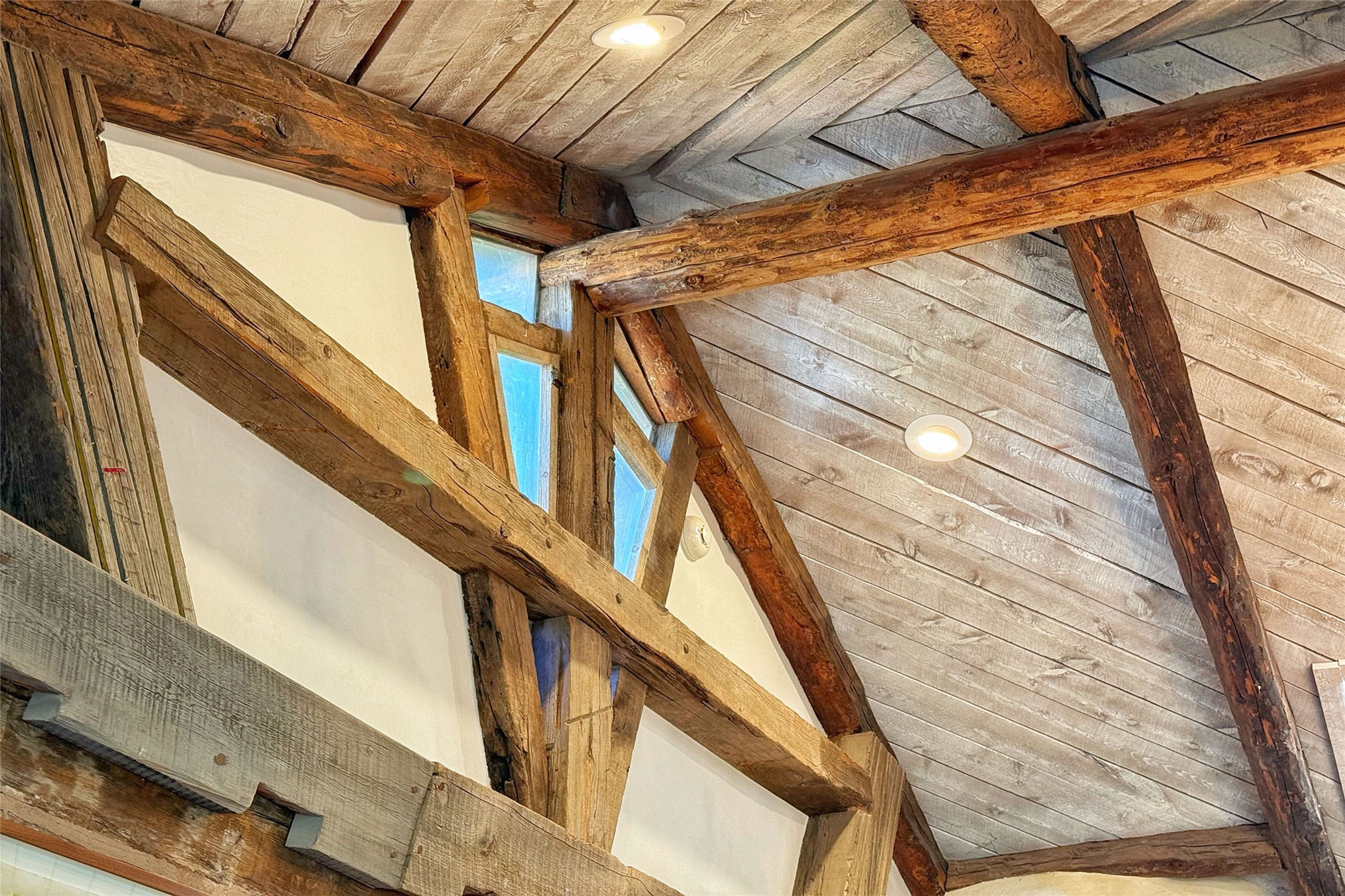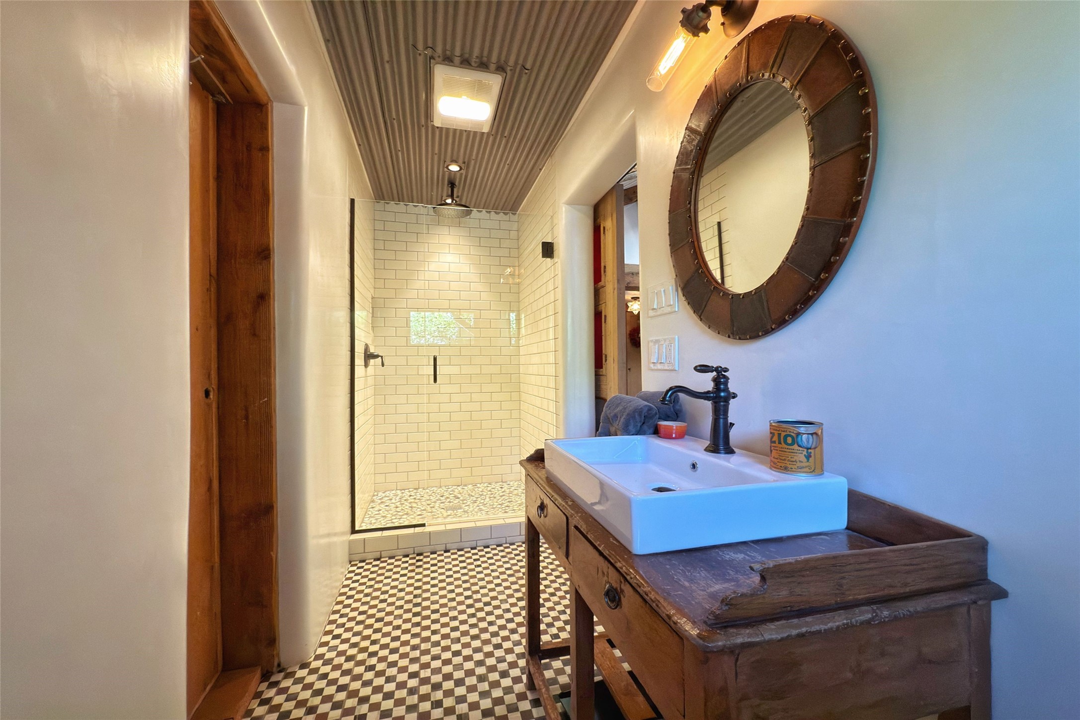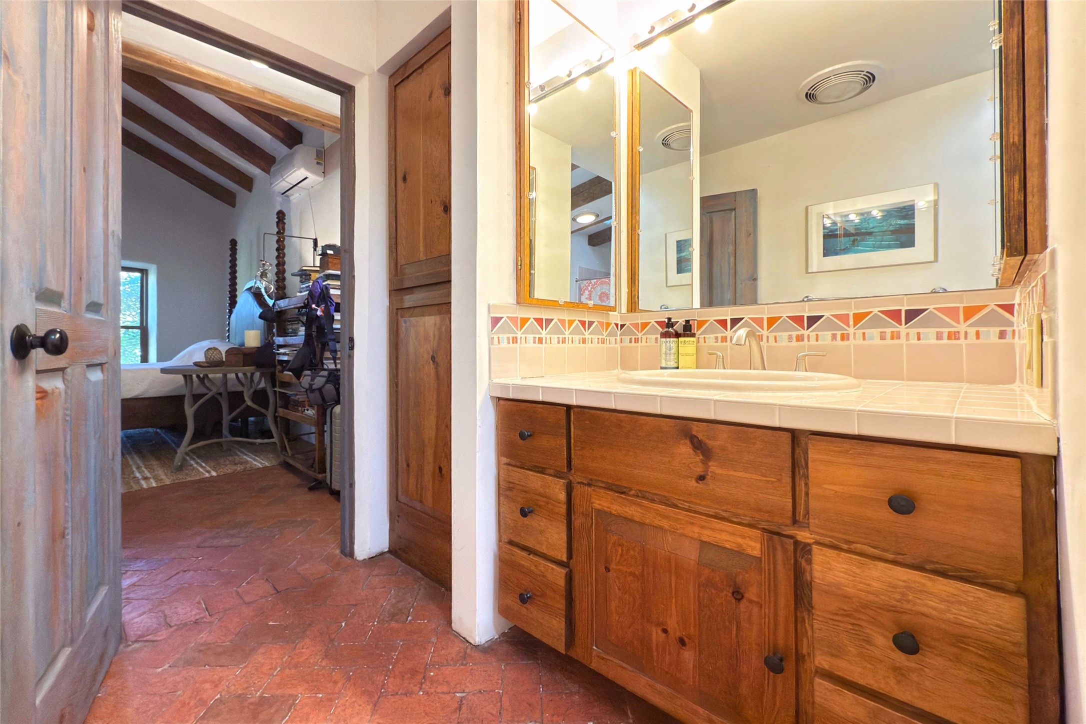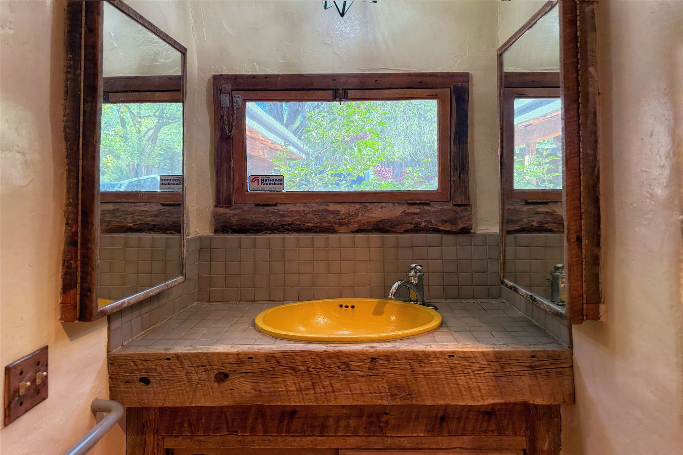 Rustic Charm Meets Santa Fe Serenity - East Side GemDiscover a truly unique and lovingly maintained property on the desirable East Side of Santa Fe. Once an original barn, this character-rich home blends rustic authenticity with modern touches to create a warm and inviting living space surrounded by natural beauty.Inside, the home retains many of its original features, including gorgeous stone barn flooring, now integrated seamlessly into the interior, and exposed pitched beams that frame the ceilings. The rough-hewn wood treatments, wood plank floors, and custom doors with distinctive hardware enhance the home's one-of-a-kind storybook charm.The kitchen is a showstopper, centered around a stunning oval island counter crafted by AZ Tile (material to be confirmed, possibly granite) and built on the original barn wood base. Culinary enthusiasts will appreciate the brass Big Chill dual-fuel range (gas cooktop, electric oven) and a uniquely designed wine storage cabinet that adds flair and function.Two bedrooms feature ladder-accessed storage lofts, providing additional space and a whimsical touch.Outside, the property is fully irrigated, showcasing vibrant floral gardens, a separate curated vegetable garden, and a variety of mature fruit trees including Apricot, Pear, Plum, and Apple. Listen to the tranquil sounds of the Santa Fe River just beyond the fenced yard, and enjoy peaceful strolls along garden paths that wind through this magical slice of Northern New Mexico.