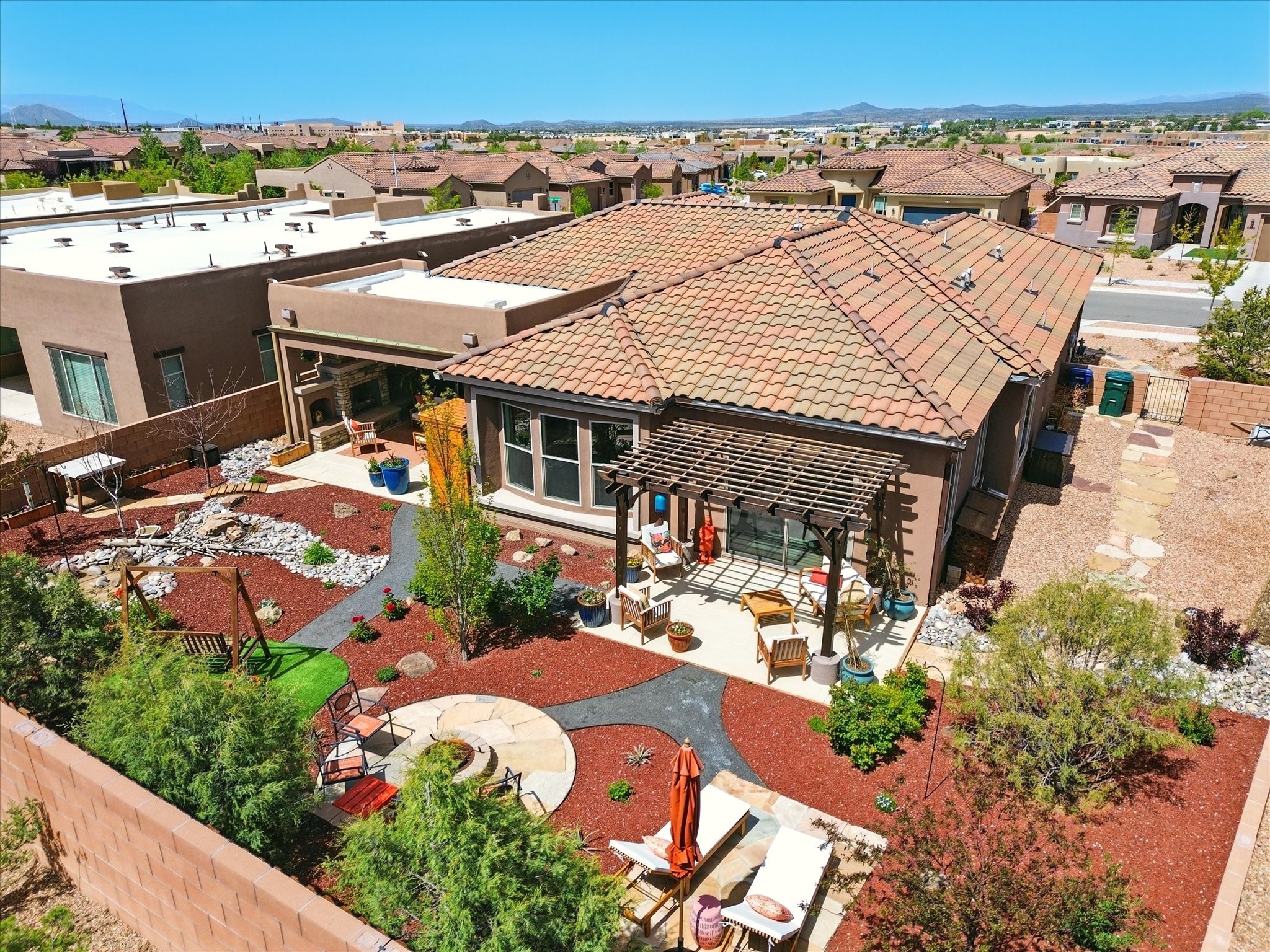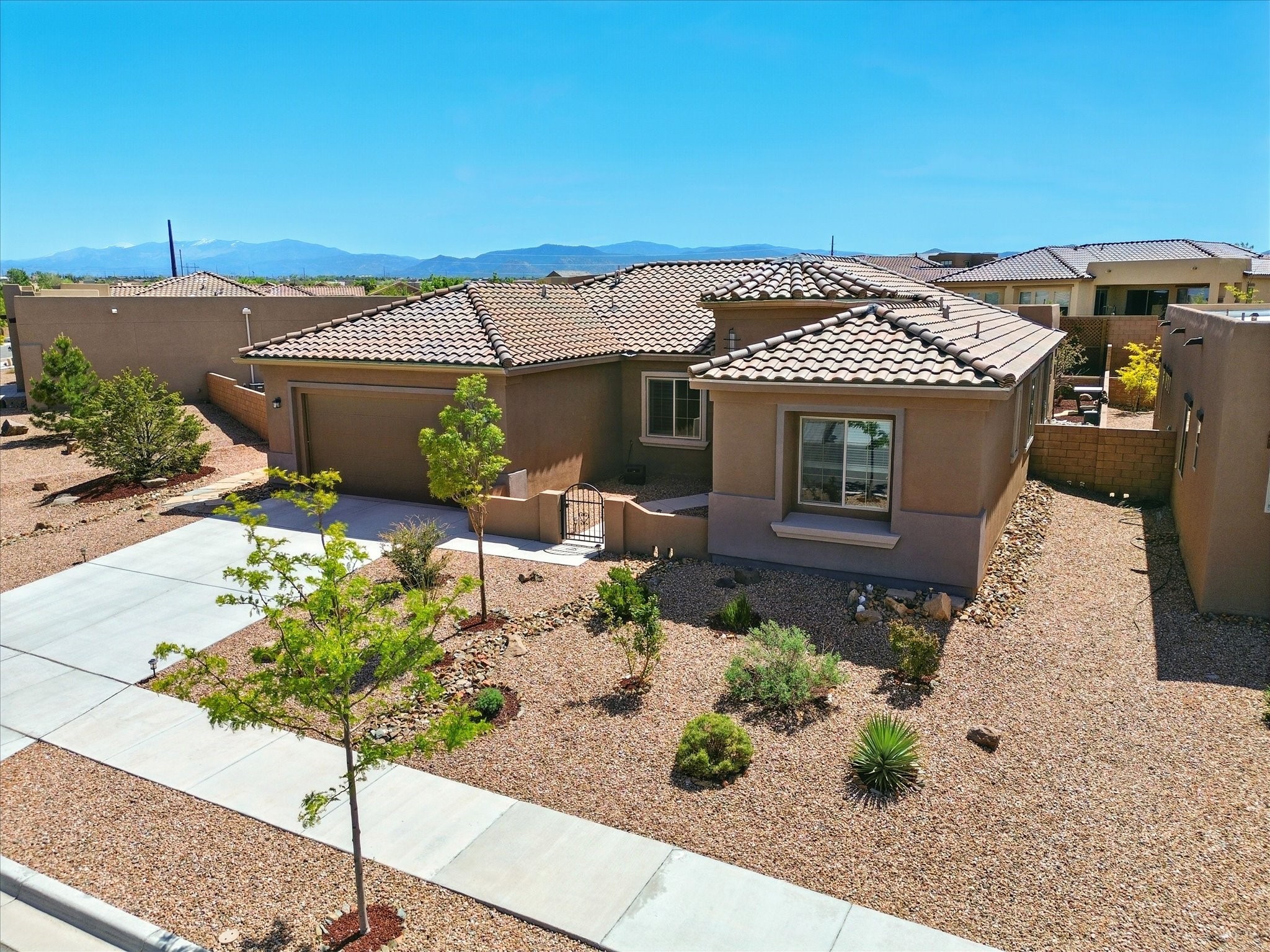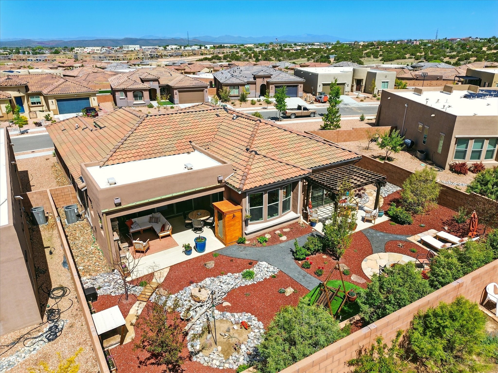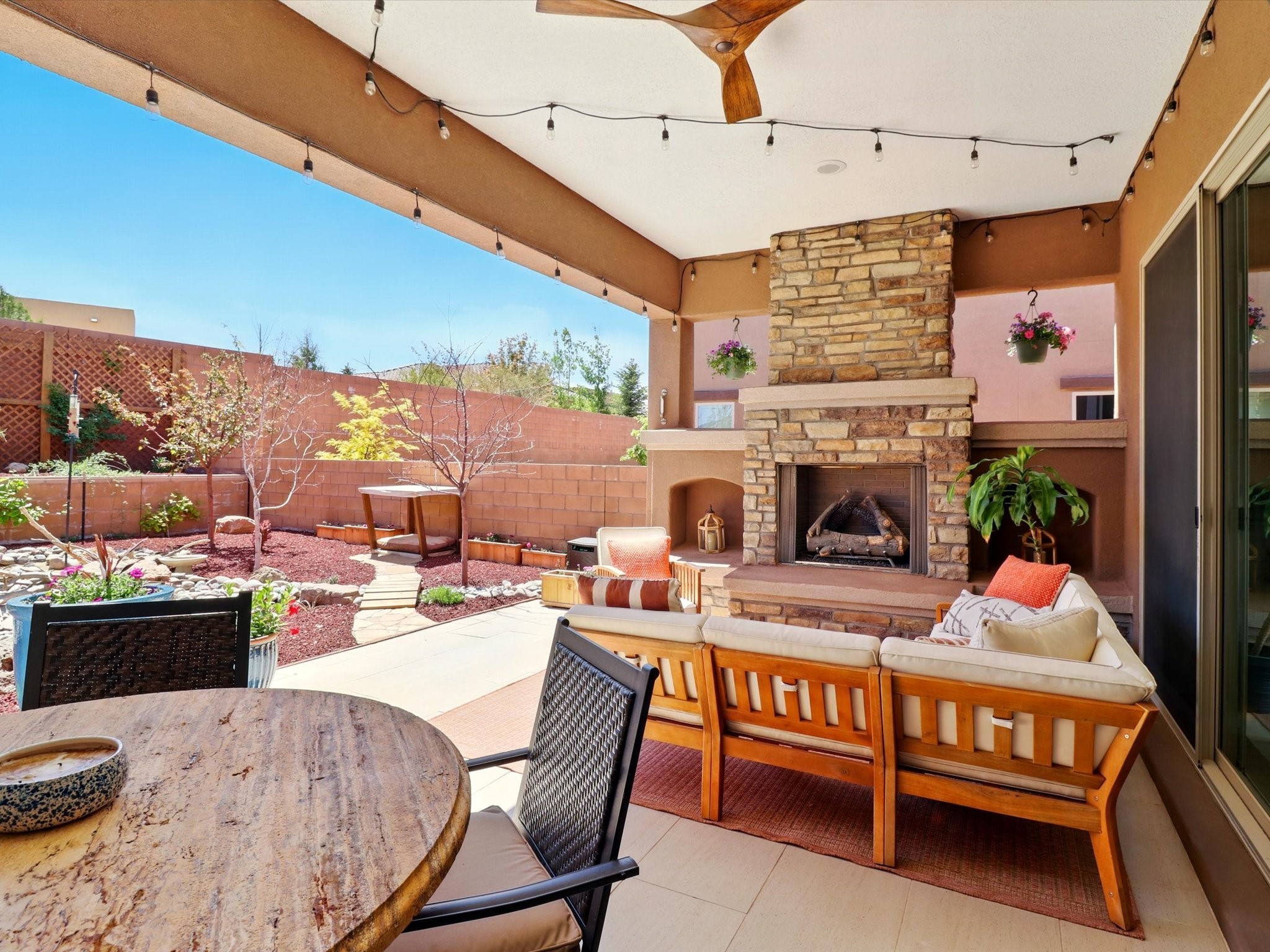 Welcome to a perfect blend of style and functionality in this beautifully appointed 3-bedroom, 2-bath home located in the highly desirable Las Soleras community. From the moment you enter, you're welcomed by a bright, versatile flex room--ideal for a home office, studio, or den--setting the tone for the open-concept living space that follows.Soaked in natural light, the spacious living and dining areas flow seamlessly into a chef-inspired kitchen featuring an in-wall Whirlpool oven and microwave combo, a sleek Samsung refrigerator, gas stovetop, and ample cabinetry for all your storage needs. A large pantry adds even more convenience for the home cook or entertainer.The generously sized primary suite offers a peaceful retreat with added Custom sliding doors that lead directly to the backyard. Step outside into your own private haven--beautifully landscaped with gravel and greenery, and extended for true outdoor living with a built-in fireplace, perfect for Santa Fe evenings under the stars.Situated on a .23-acre lot with a two-car garage, this home offers space, comfort, and thoughtful upgrades throughout.