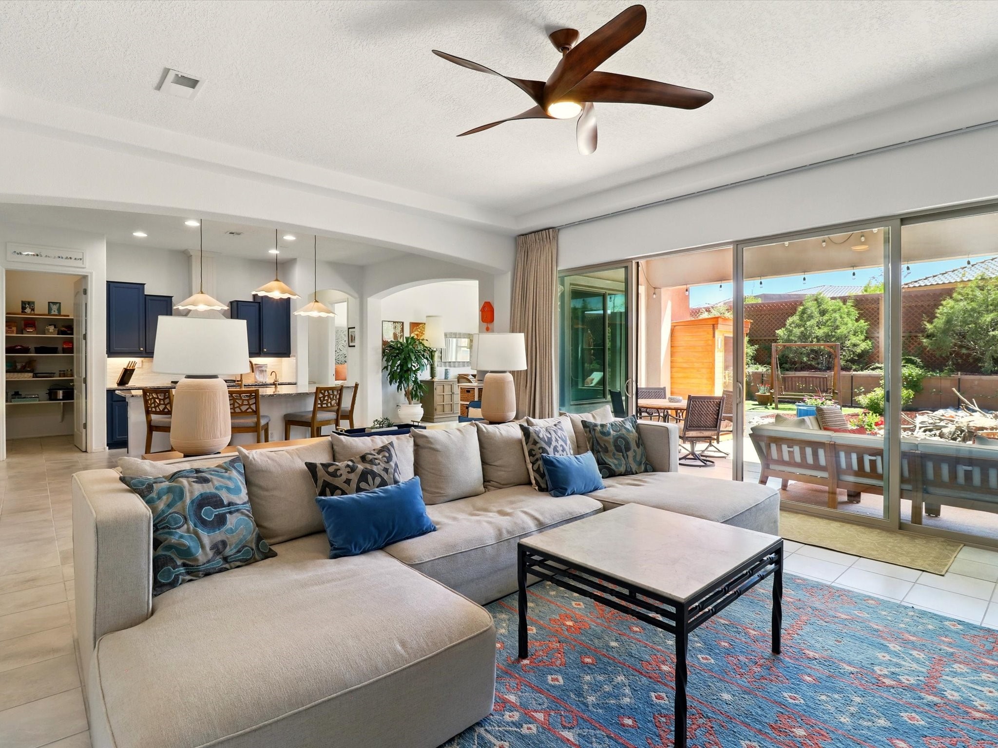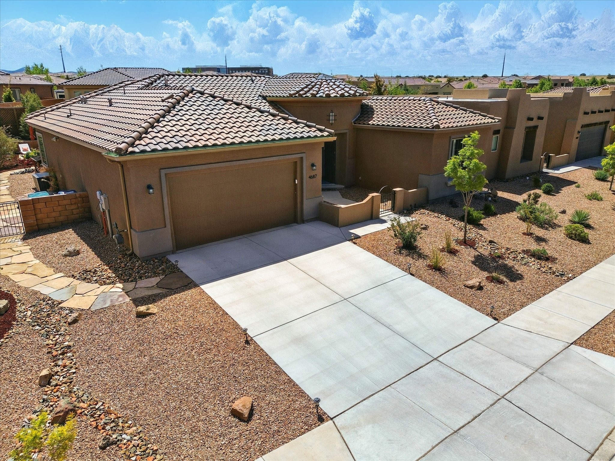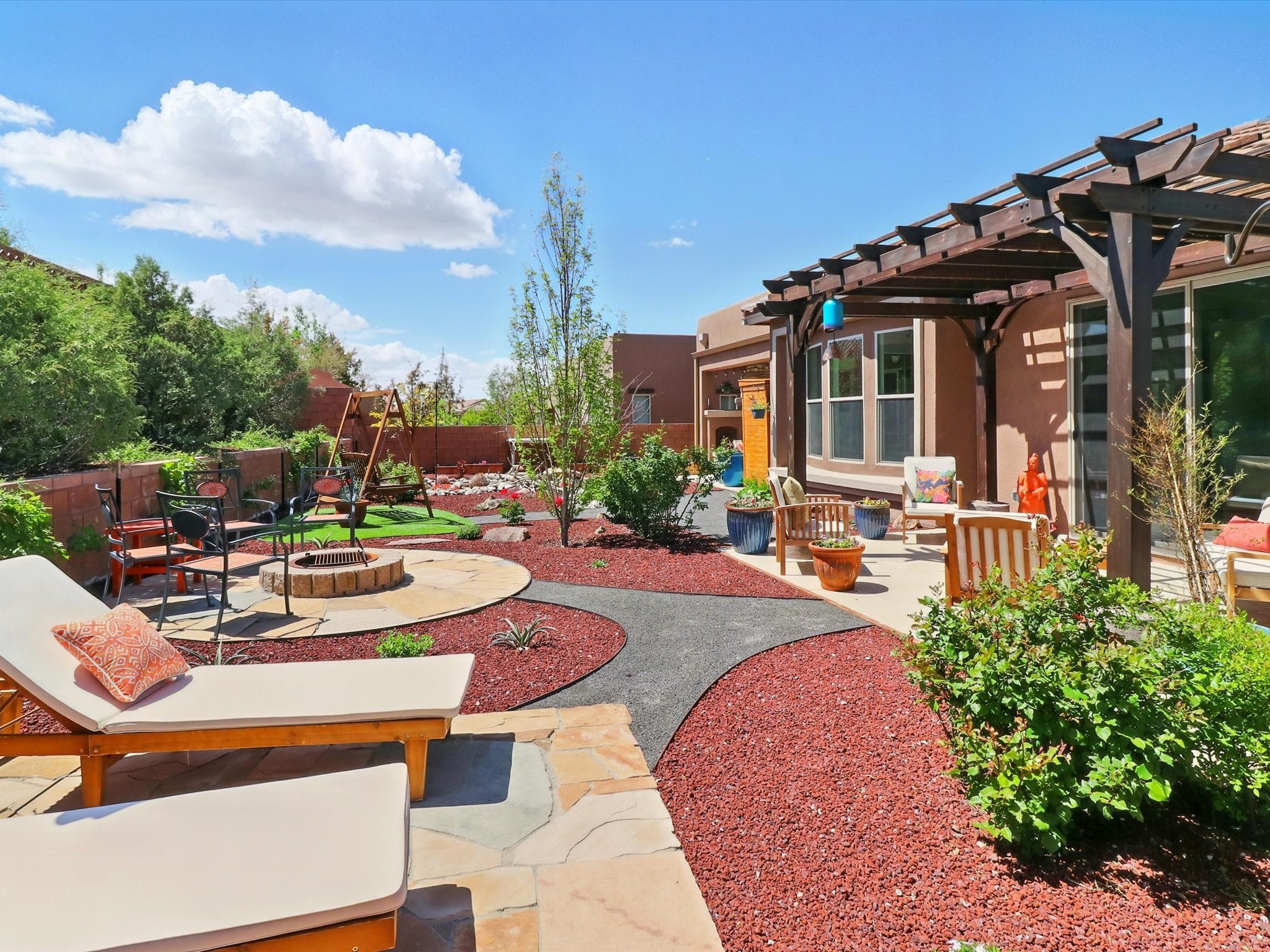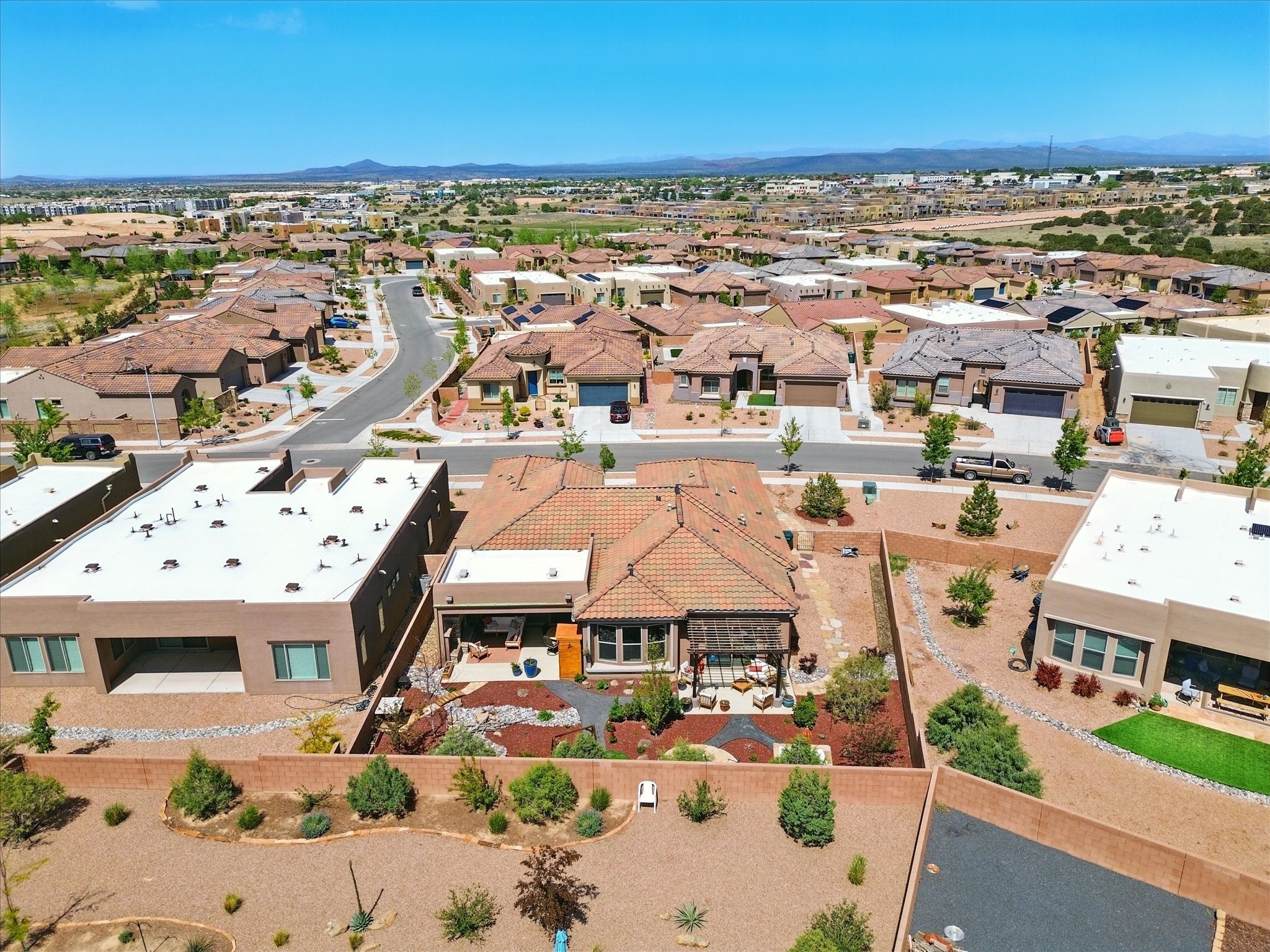 Welcome to a perfect blend of style and functionality in this beautifully appointed 3-bedroom, 2-bath home located in the highly desirable Las Soleras community. From the moment you enter, you're welcomed by a bright, versatile flex room--ideal for a home office, studio, or den--setting the tone for the open-concept living space that follows.Soaked in natural light, the spacious living and dining areas flow seamlessly into a chef-inspired kitchen featuring an in-wall Whirlpool oven and microwave combo, a sleek Samsung refrigerator, gas stovetop, and ample cabinetry for all your storage needs. A large pantry adds even more convenience for the home cook or entertainer.The generously sized primary suite offers a peaceful retreat with added Custom sliding doors that lead directly to the backyard. Step outside into your own private haven--beautifully landscaped with gravel and greenery, and extended for true outdoor living with a built-in fireplace, perfect for Santa Fe evenings under the stars.Situated on a .23-acre lot with a two-car garage, this home offers space, comfort, and thoughtful upgrades throughout.