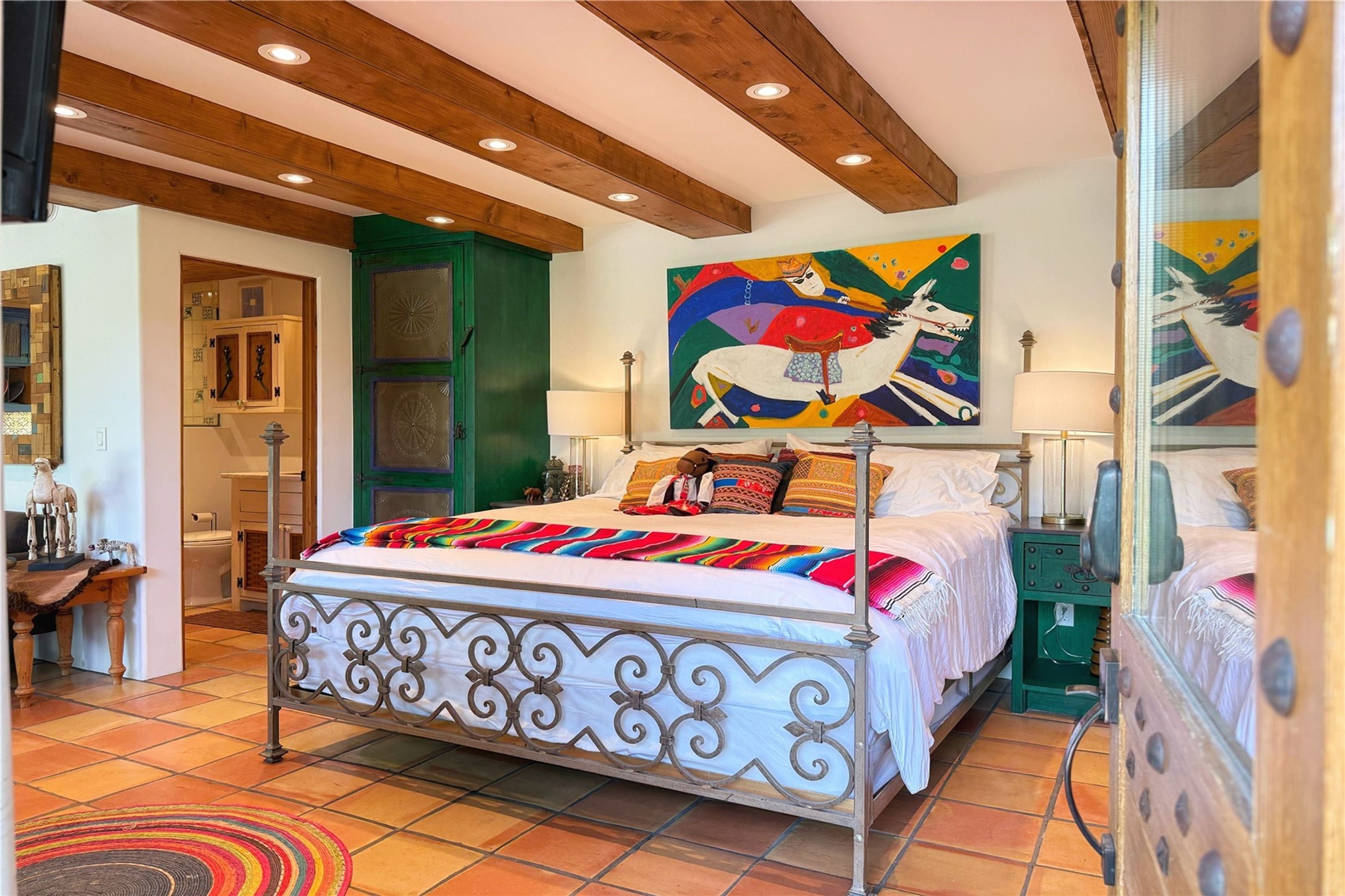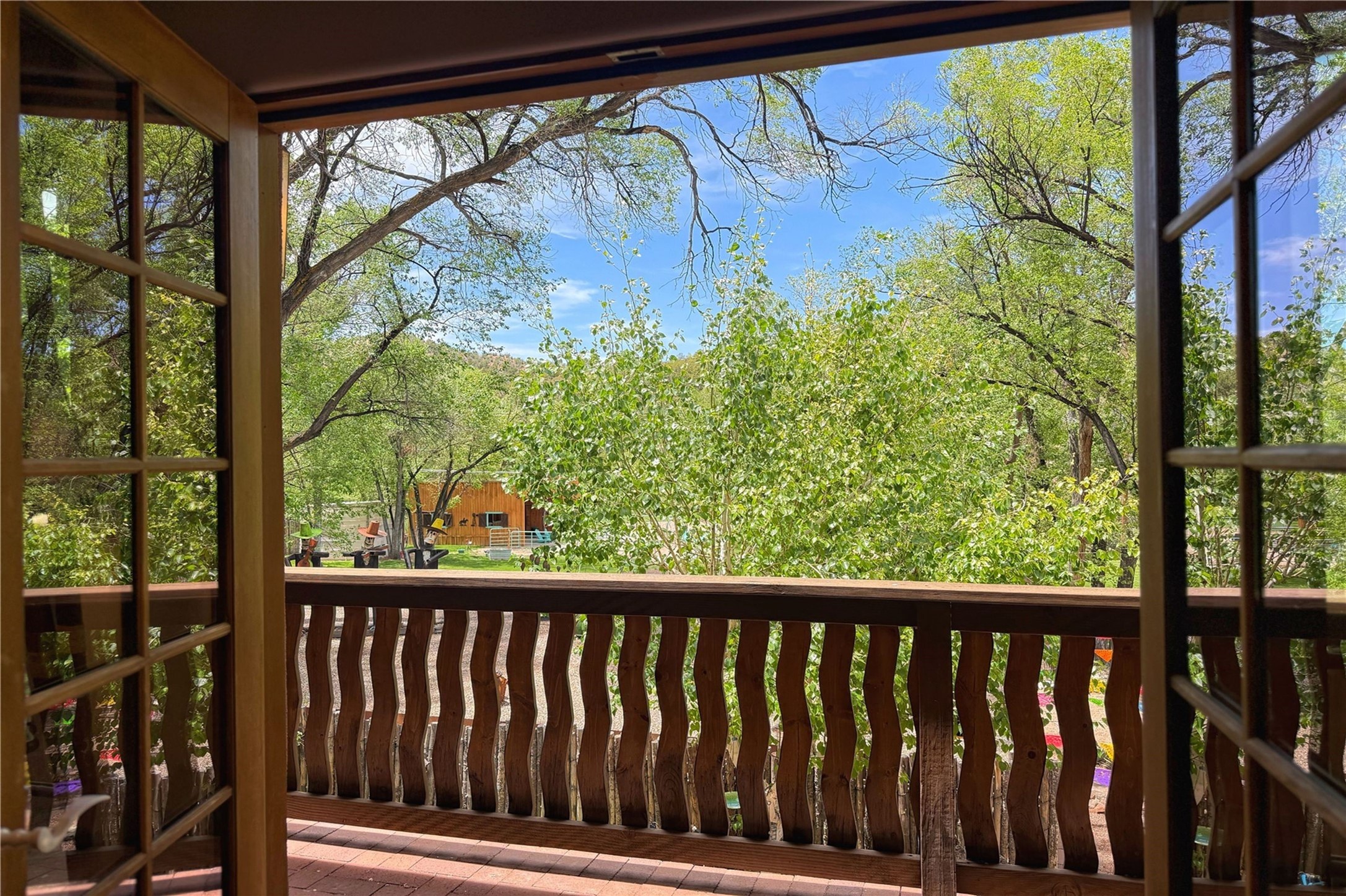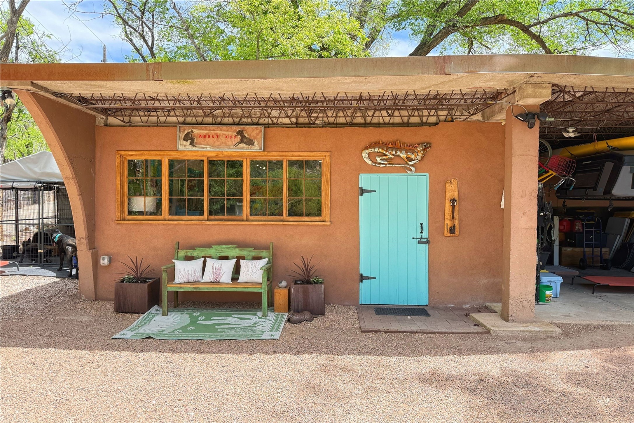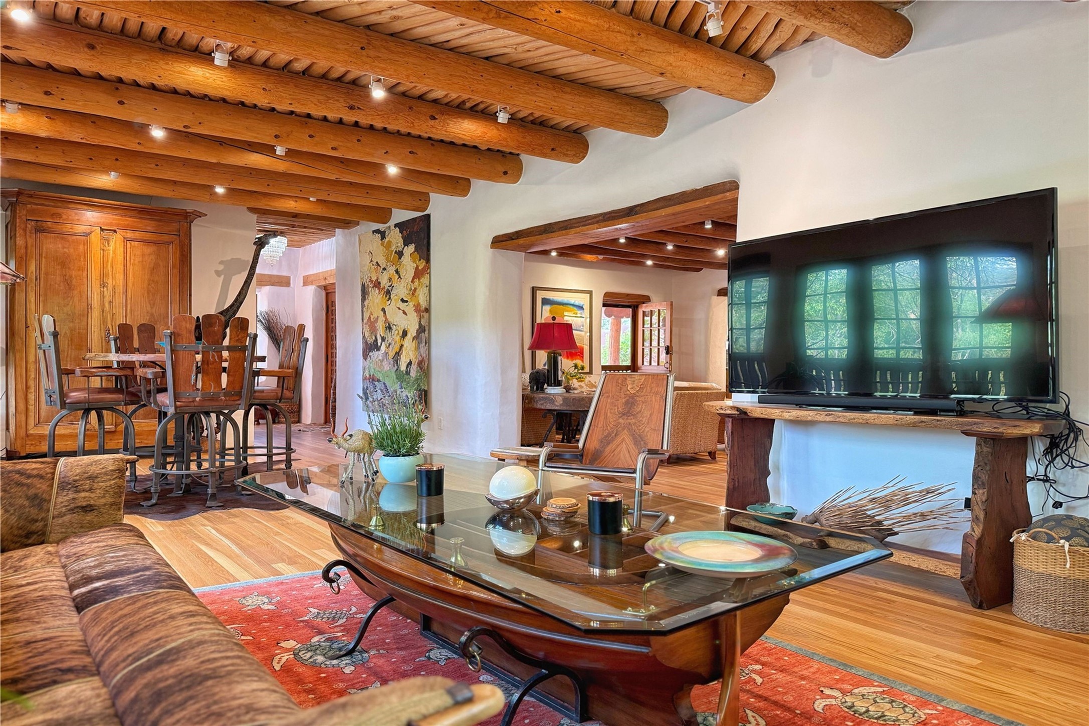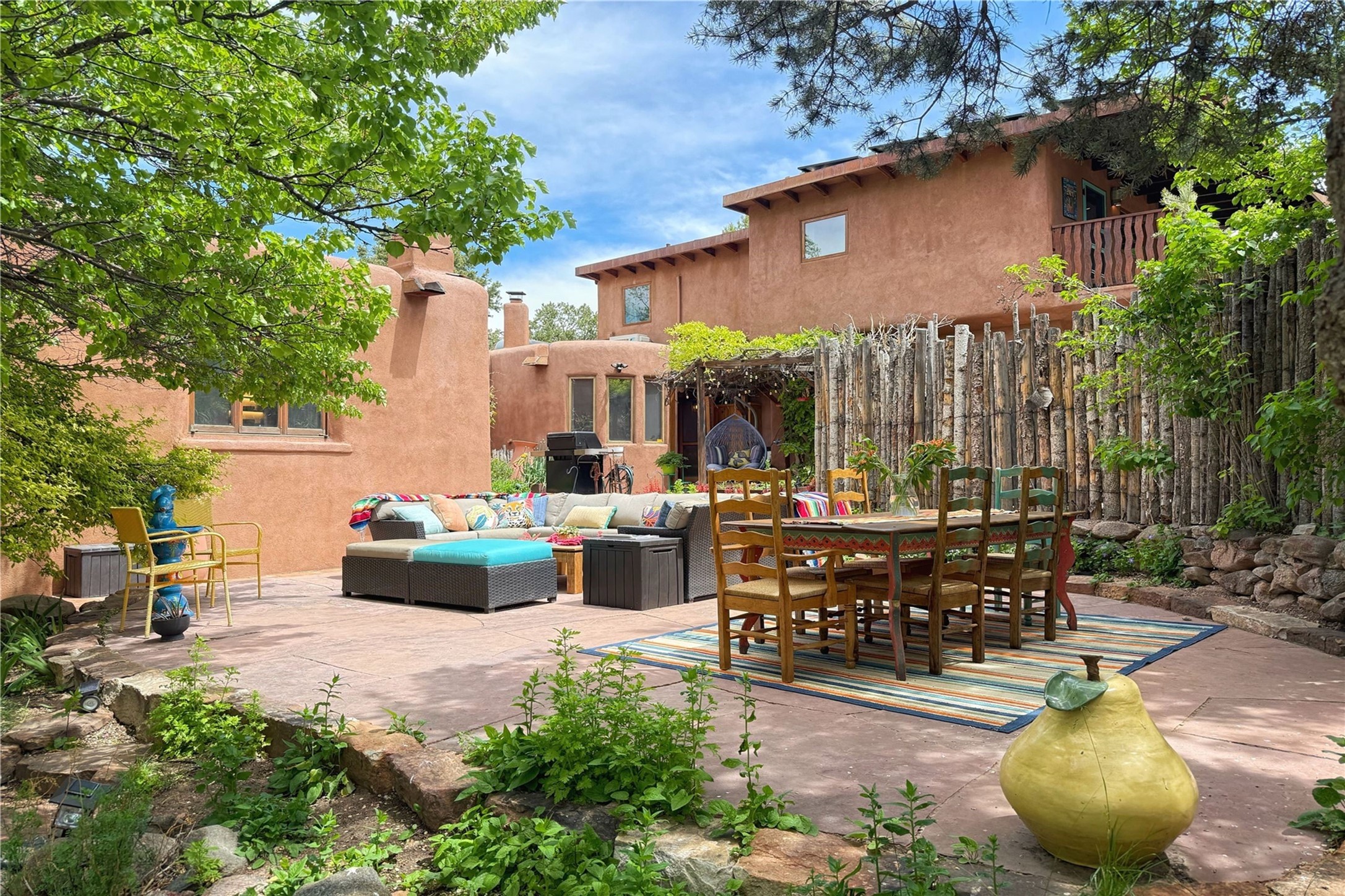 Exquisite Historic Compound with Modern Luxuries - Recent Extensive Renovation Creating a Truly Unique Lush Tesuque Oasis. Welcome to this extraordinary multi-residence estate nestled on a historic 100+ year-old property. Seamlessly blending Old Santa Fe charm with modern sophistication. From handcrafted elements to lush gardens, every detail of this property tells a story.Enter into a serene courtyard with water features, mature trees, and fruiting grapevines that leads to a warm sitting room and flows into the dining area and gourmet kitchen.Granite leather-finished countertops, a deep stone sink, open shelving, skylights, Liebherr fridge, and custom cabinetry complete a kitchen that is like no other. The main house features timeless design with 18 inch adobe walls, hardwood floors, original vigas, multiple kivas and custom cabinetry crafted on-site from 100-year-old wood.Downstairs, the primary suite is nestled below the main living area. Relax with a kiva fireplace, and a peaceful view of the back garden. Stunning Brazilian Aquamarine granite graces the primary bath. "Dancing Hare" casita offers Saltillo tile, two bedrooms, a full kitchen with Taj Mahal counters, turquoise cabinets, and a private patio and balcony. This casita has separate parking adding privacy. "Laughing Horse" casita features open-concept living with large glass doors opening to the garden with stable views, original exposed brick and wood stove, and a full kitchen. Additional Structures include large art studio with private entrance, an expansive gym, and two-stalled stables. This property boats multiple stunning outdoor spaces for dining, gardening and entertaining parties intimate or grand. Terraced levels, hot tub, fire-pit, a creek running at the back of the property and apricot trees complete this oasis. A rare opportunity to own a piece of history enhanced with artisanal craftsmanship and high-end modern finishes. A perfect personal sanctuary or family compound.