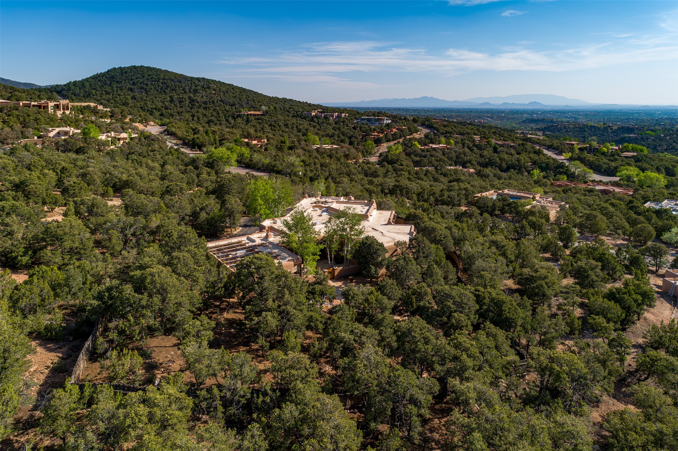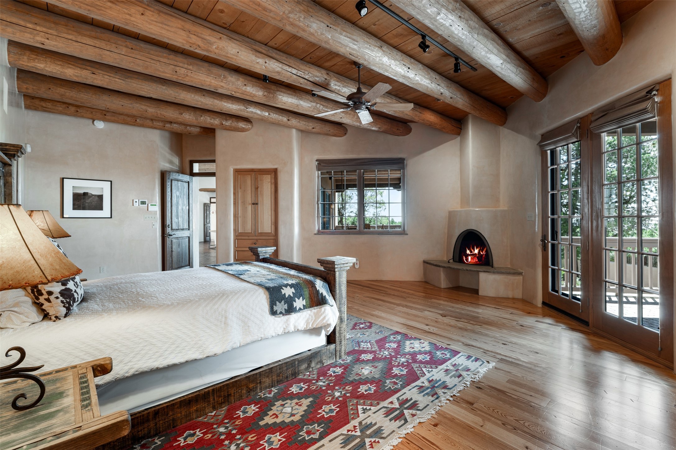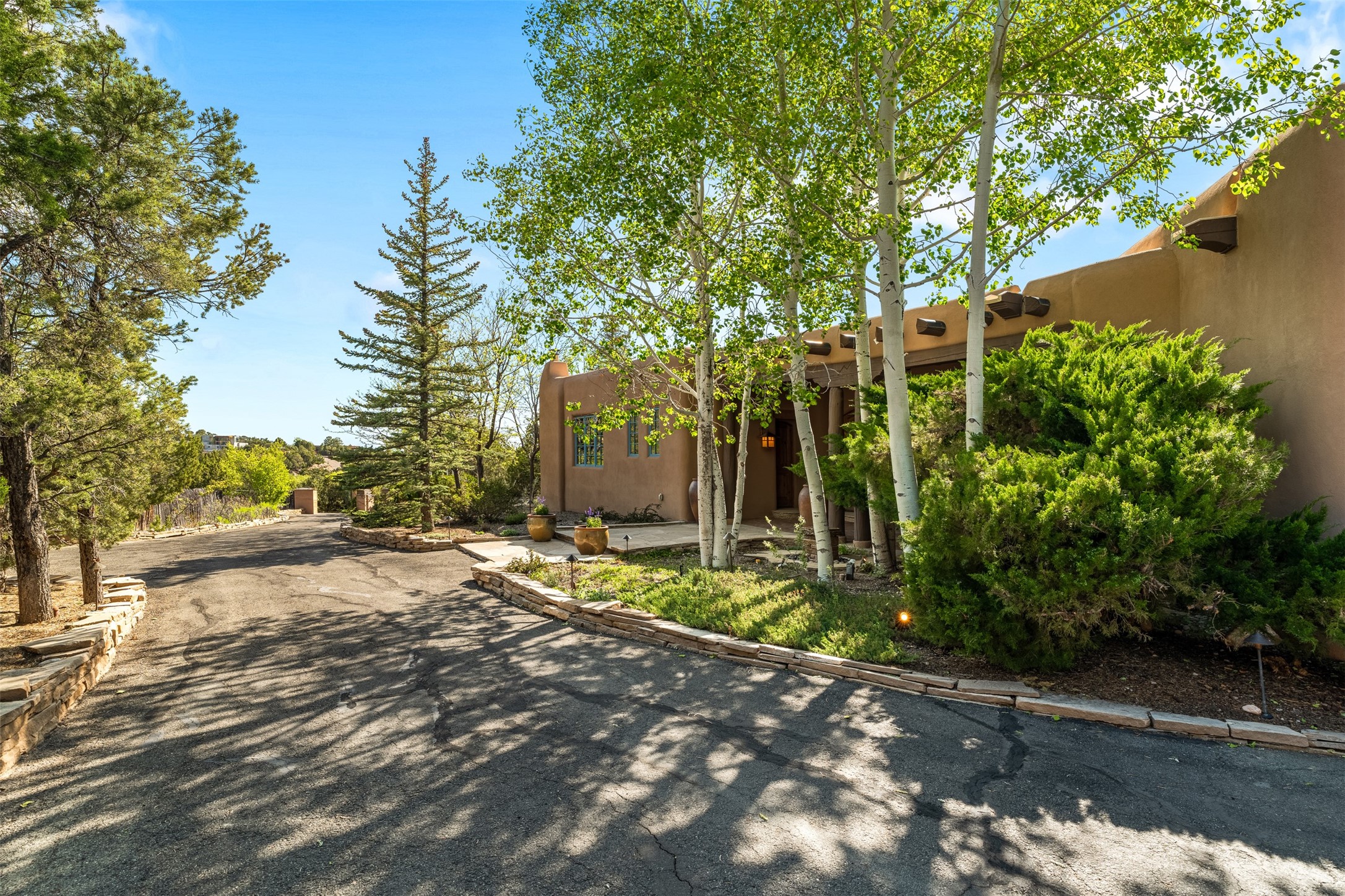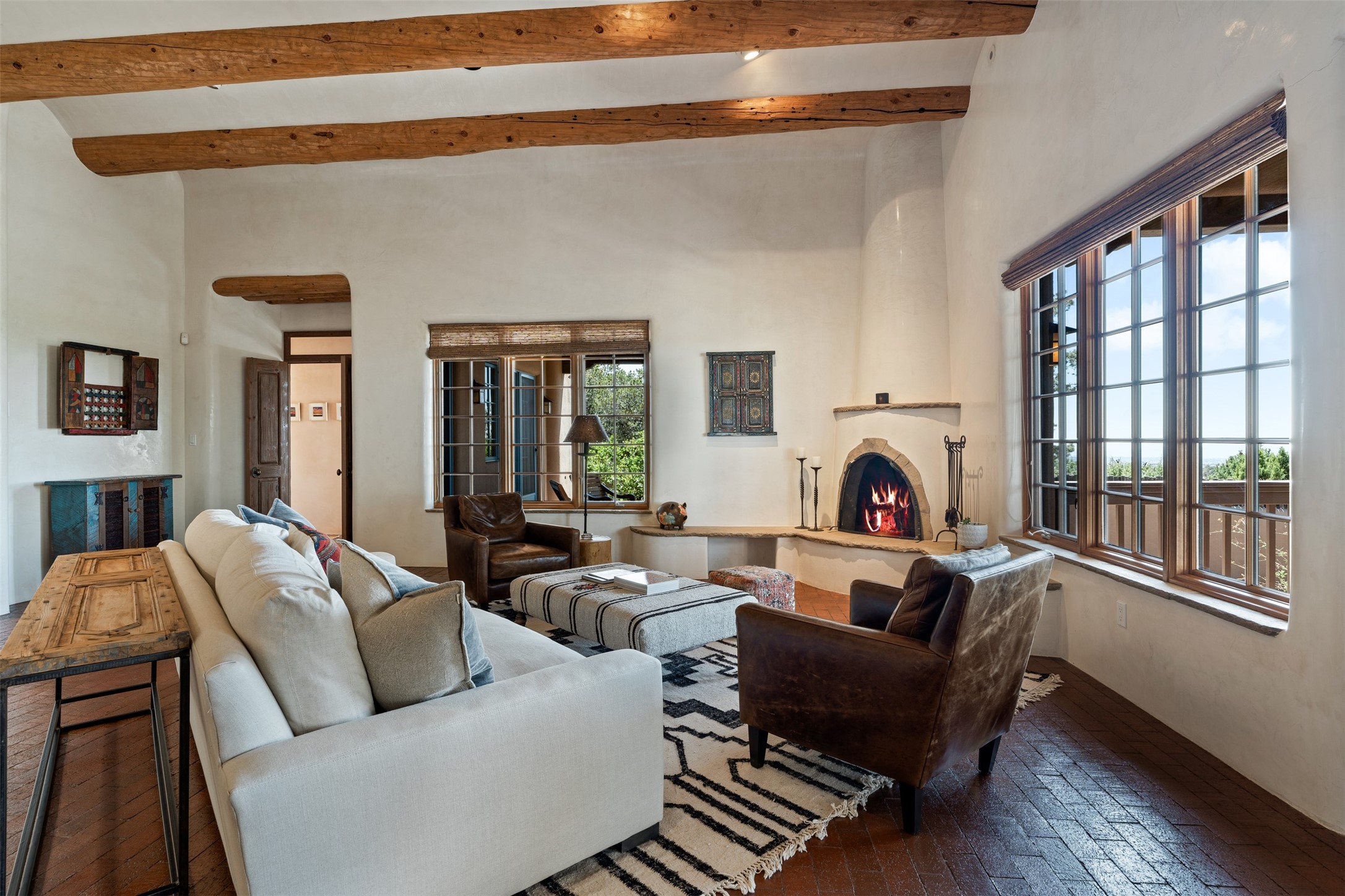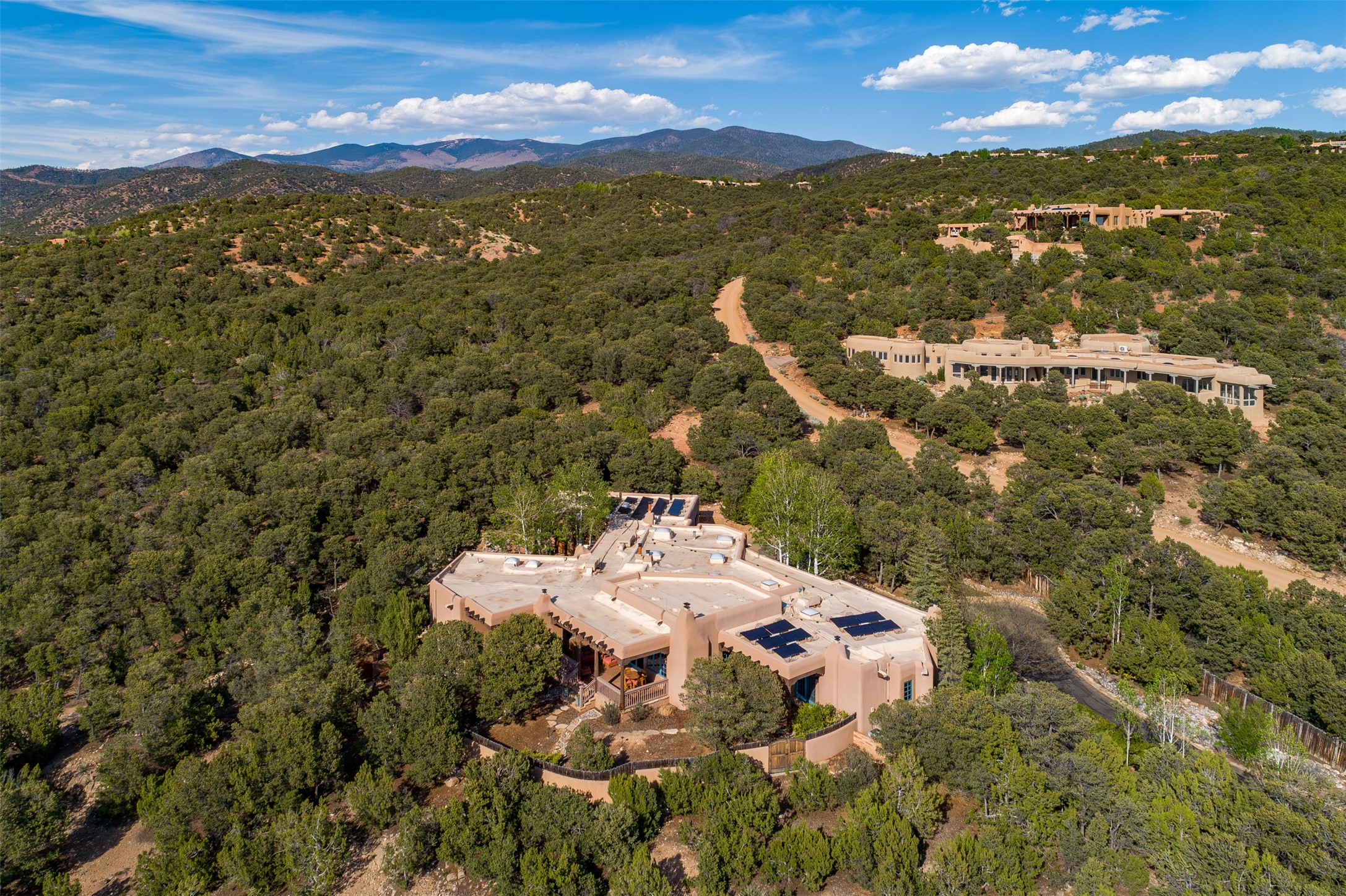 This, Rick Driscoll built, Sierra del Norte estate is perfectly located near the top of the subdivision. The 2.15 acre lot borders county open land, offers western views and can accommodate a casita. This home is a must see for the discerning buyer who wants quality, architectural excellence, privacy, views, and convenient access to the heart of Santa Fe and the ski area. Finishes include diamond polished plaster walls, vigas with coved ceilings, massive beams and reclaimed pine, brick and flagstone floors. The inviting floor plan has separated primary and guest bedrooms in addition to a private office. Each guest suite features, en-suite baths and wood burning fireplaces. The spacious kitchen was completely remodeled by the current owners and features top-notch appliances, Taj Mahal countertops and custom cabinetry. The kitchen is well placed in relation to the living/dining areas, den, and portals to allow for easy entertaining. The spacious primary suite with fireplace opens onto a private portal. The spa like bath features a large shower with separate steam shower, dual sinks, tub, dual toilets and a bidet. The home is fully air conditioned and has radiant in-floor heating, Multiple portals are thoughtfully attached to the various living spaces and bedrooms. The gated driveway leads to an oversized, heated four car garage with lots of storage and EV charger outlet. The grounds are landscaped with rock walls, mature trees, water features and are fenced. An owned photovoltaic system keeps electric bills very low. The membrane roof is under warranty. This is a wonderful, well maintained, home in one of Santa Fe's most sought after neighborhoods. Just move in and enjoy.