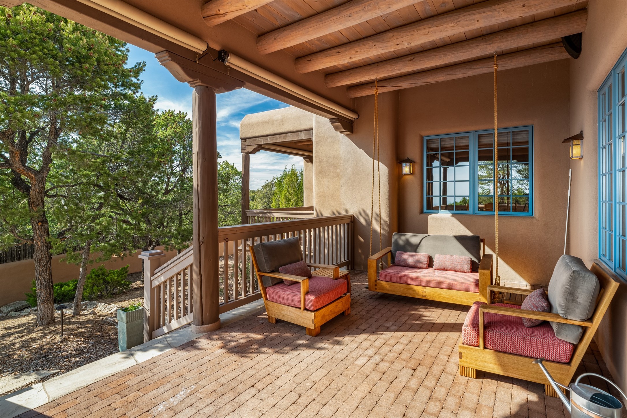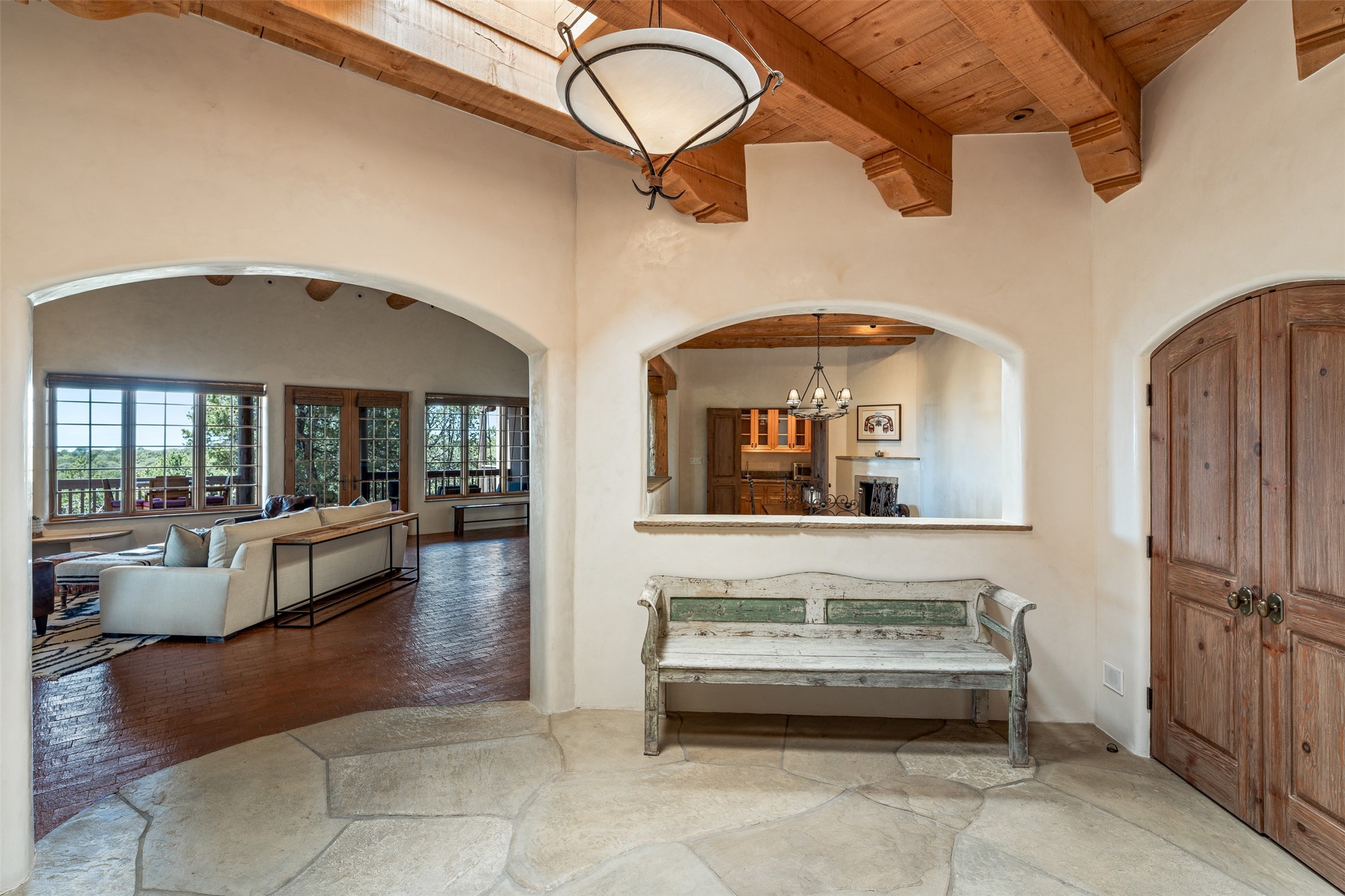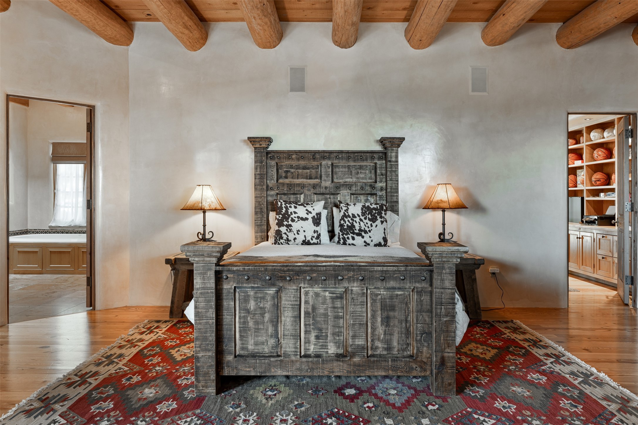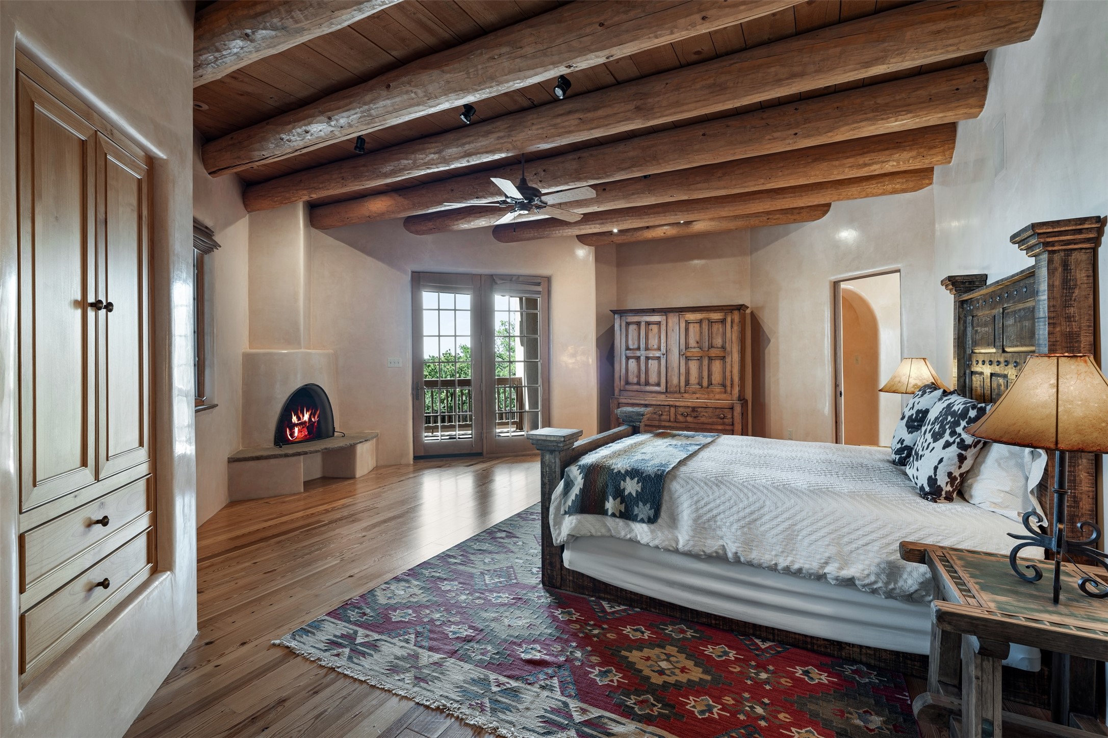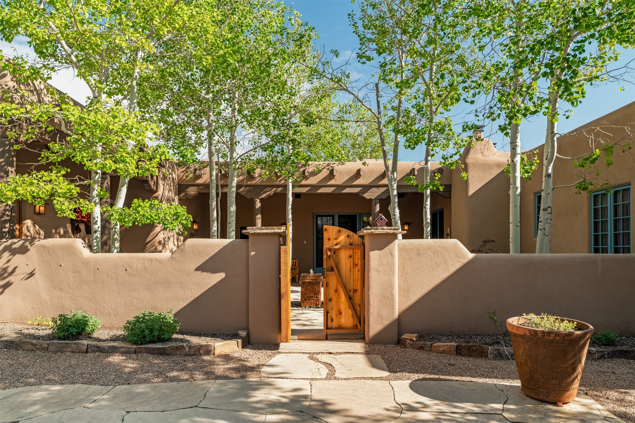 This, Rick Driscoll built, Sierra del Norte estate is perfectly located near the top of the subdivision. The 2.15 acre lot borders county open land, offers western views and can accommodate a casita. This home is a must see for the discerning buyer who wants quality, architectural excellence, privacy, views, and convenient access to the heart of Santa Fe and the ski area. Finishes include diamond polished plaster walls, vigas with coved ceilings, massive beams and reclaimed pine, brick and flagstone floors. The inviting floor plan has separated primary and guest bedrooms in addition to a private office. Each guest suite features, en-suite baths and wood burning fireplaces. The spacious kitchen was completely remodeled by the current owners and features top-notch appliances, Taj Mahal countertops and custom cabinetry. The kitchen is well placed in relation to the living/dining areas, den, and portals to allow for easy entertaining. The spacious primary suite with fireplace opens onto a private portal. The spa like bath features a large shower with separate steam shower, dual sinks, tub, dual toilets and a bidet. The home is fully air conditioned and has radiant in-floor heating, Multiple portals are thoughtfully attached to the various living spaces and bedrooms. The gated driveway leads to an oversized, heated four car garage with lots of storage and EV charger outlet. The grounds are landscaped with rock walls, mature trees, water features and are fenced. An owned photovoltaic system keeps electric bills very low. The membrane roof is under warranty. This is a wonderful, well maintained, home in one of Santa Fe's most sought after neighborhoods. Just move in and enjoy.