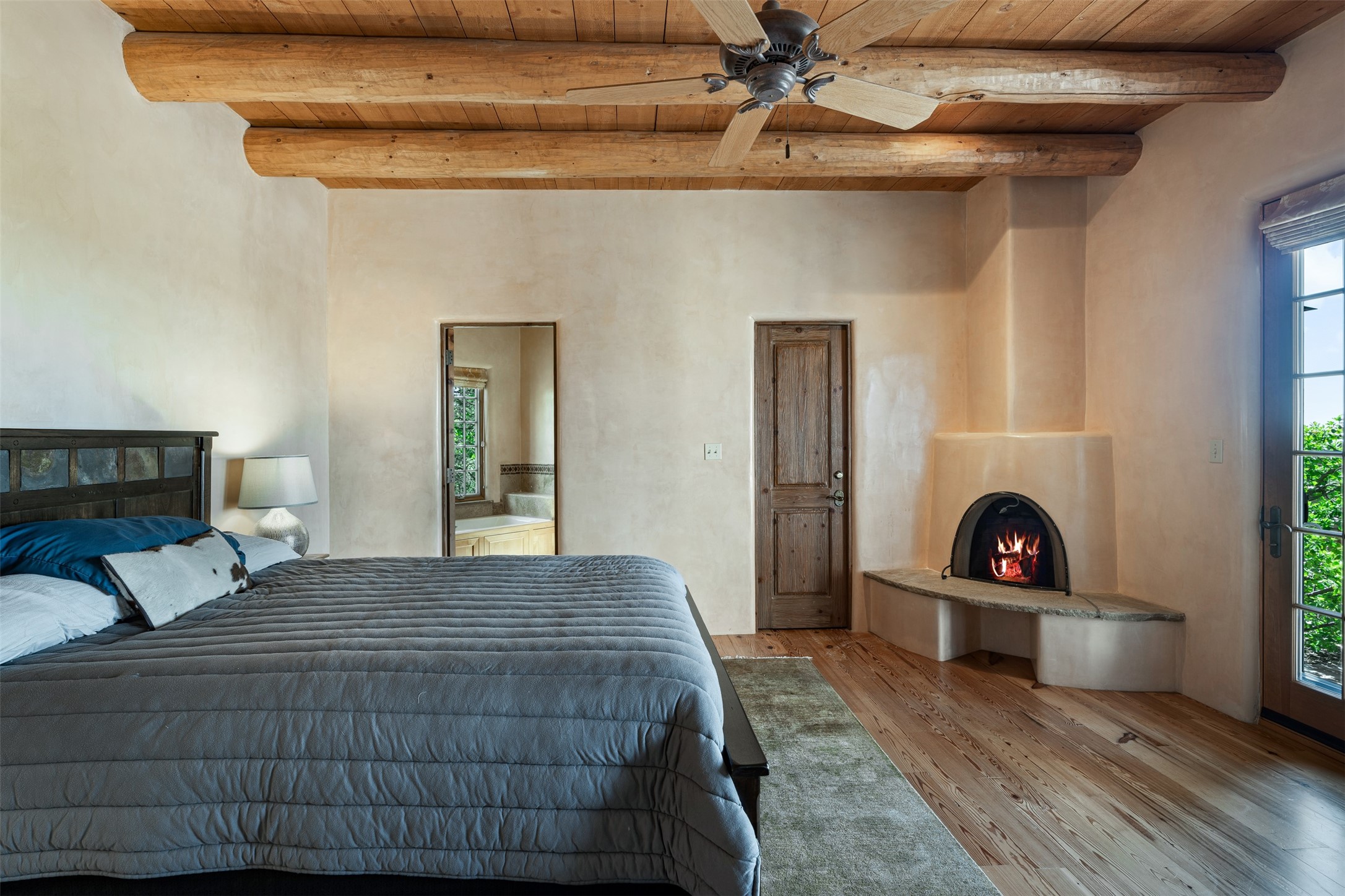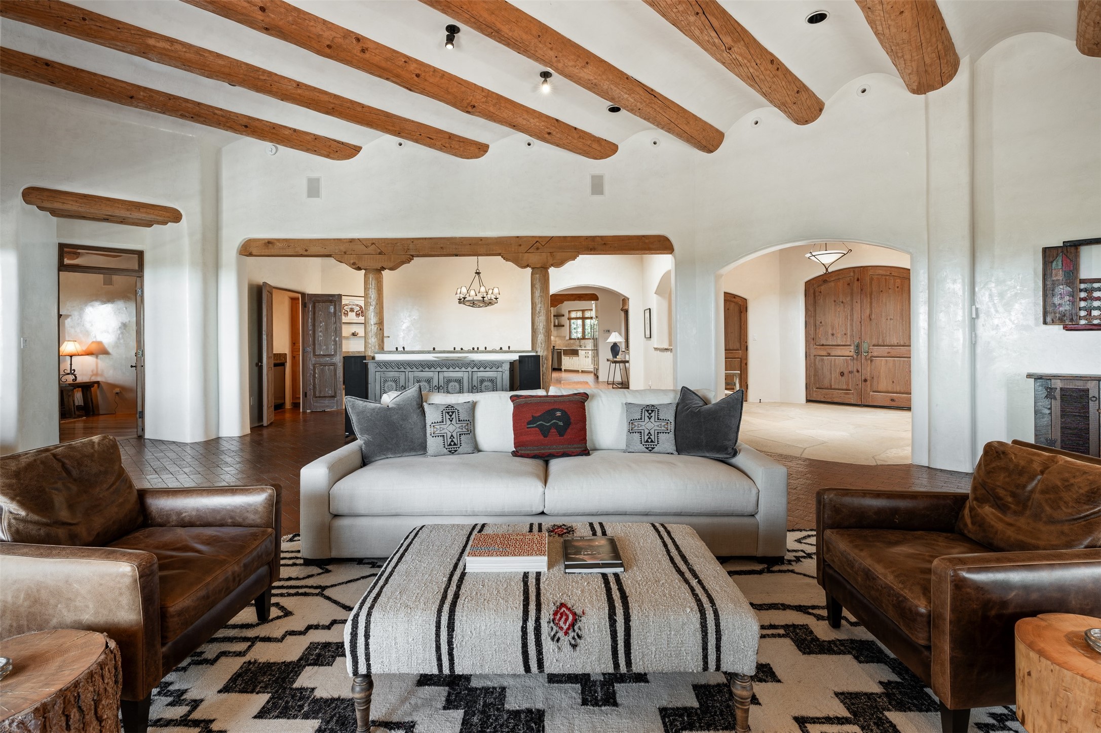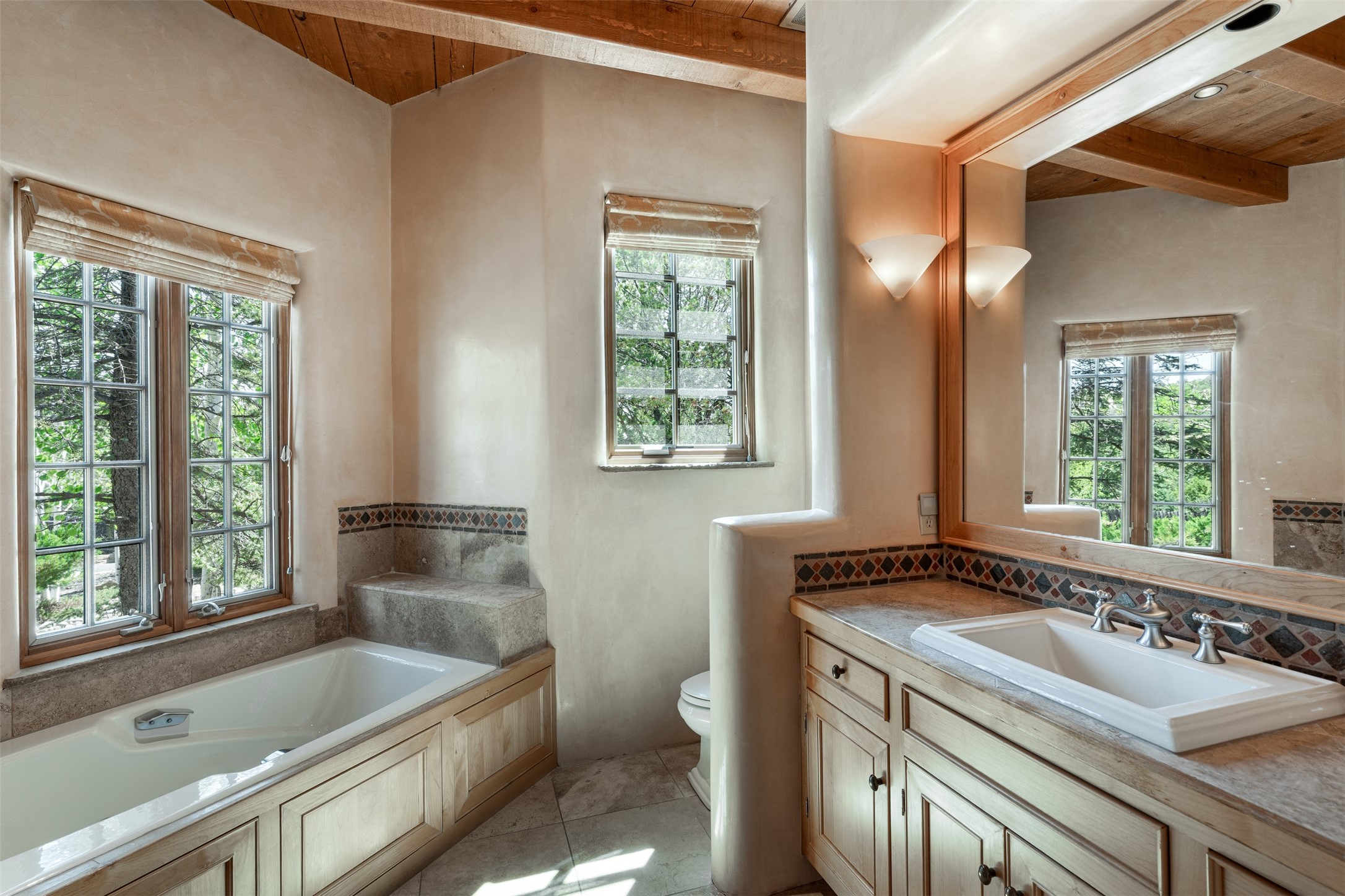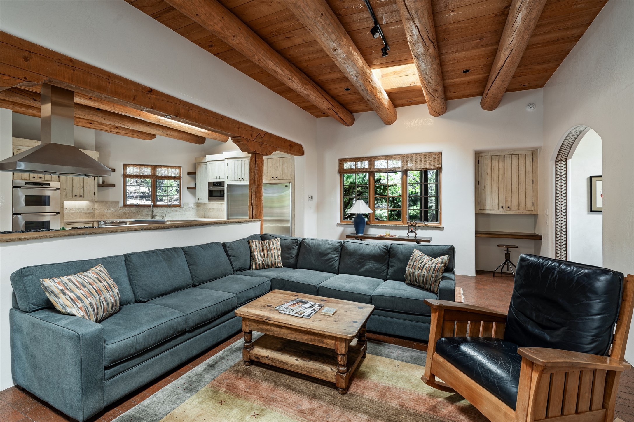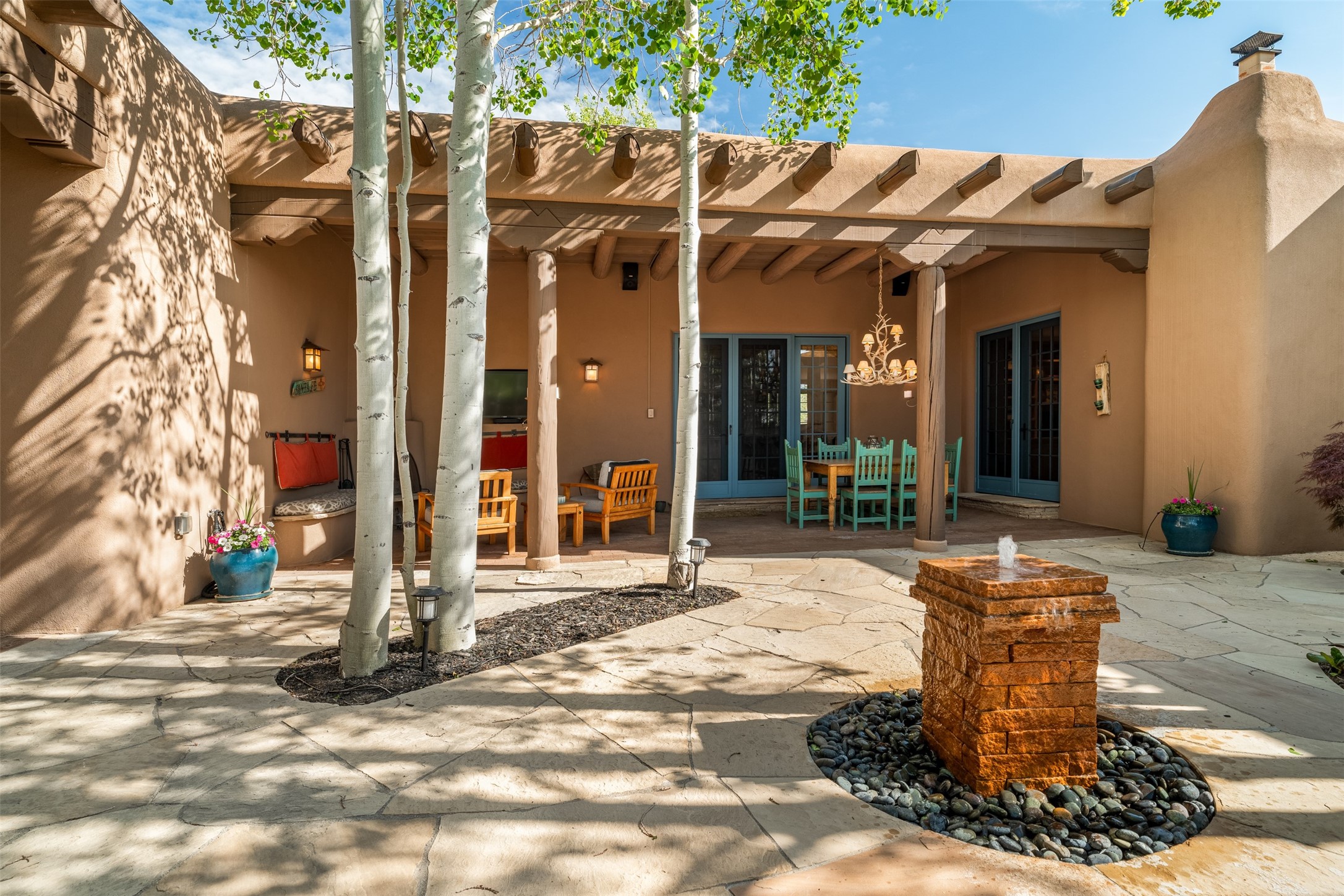 This, Rick Driscoll built, Sierra del Norte estate is perfectly located near the top of the subdivision. The 2.15 acre lot borders county open land, offers western views and can accommodate a casita. This home is a must see for the discerning buyer who wants quality, architectural excellence, privacy, views, and convenient access to the heart of Santa Fe and the ski area. Finishes include diamond polished plaster walls, vigas with coved ceilings, massive beams and reclaimed pine, brick and flagstone floors. The inviting floor plan has separated primary and guest bedrooms in addition to a private office. Each guest suite features, en-suite baths and wood burning fireplaces. The spacious kitchen was completely remodeled by the current owners and features top-notch appliances, Taj Mahal countertops and custom cabinetry. The kitchen is well placed in relation to the living/dining areas, den, and portals to allow for easy entertaining. The spacious primary suite with fireplace opens onto a private portal. The spa like bath features a large shower with separate steam shower, dual sinks, tub, dual toilets and a bidet. The home is fully air conditioned and has radiant in-floor heating, Multiple portals are thoughtfully attached to the various living spaces and bedrooms. The gated driveway leads to an oversized, heated four car garage with lots of storage and EV charger outlet. The grounds are landscaped with rock walls, mature trees, water features and are fenced. An owned photovoltaic system keeps electric bills very low. The membrane roof is under warranty. This is a wonderful, well maintained, home in one of Santa Fe's most sought after neighborhoods. Just move in and enjoy.