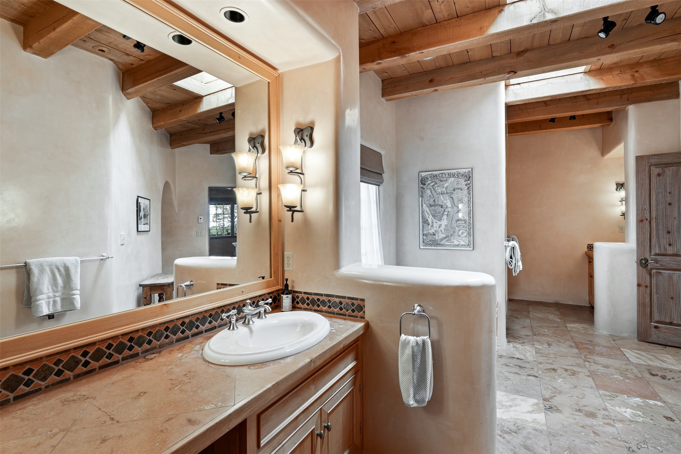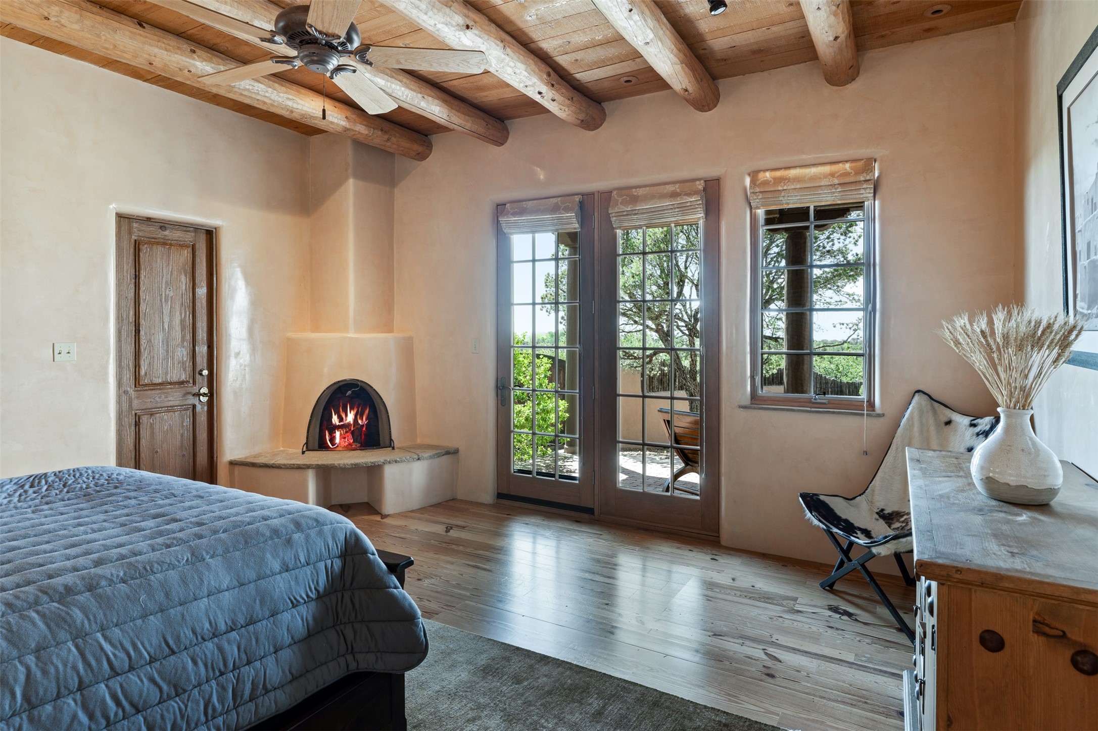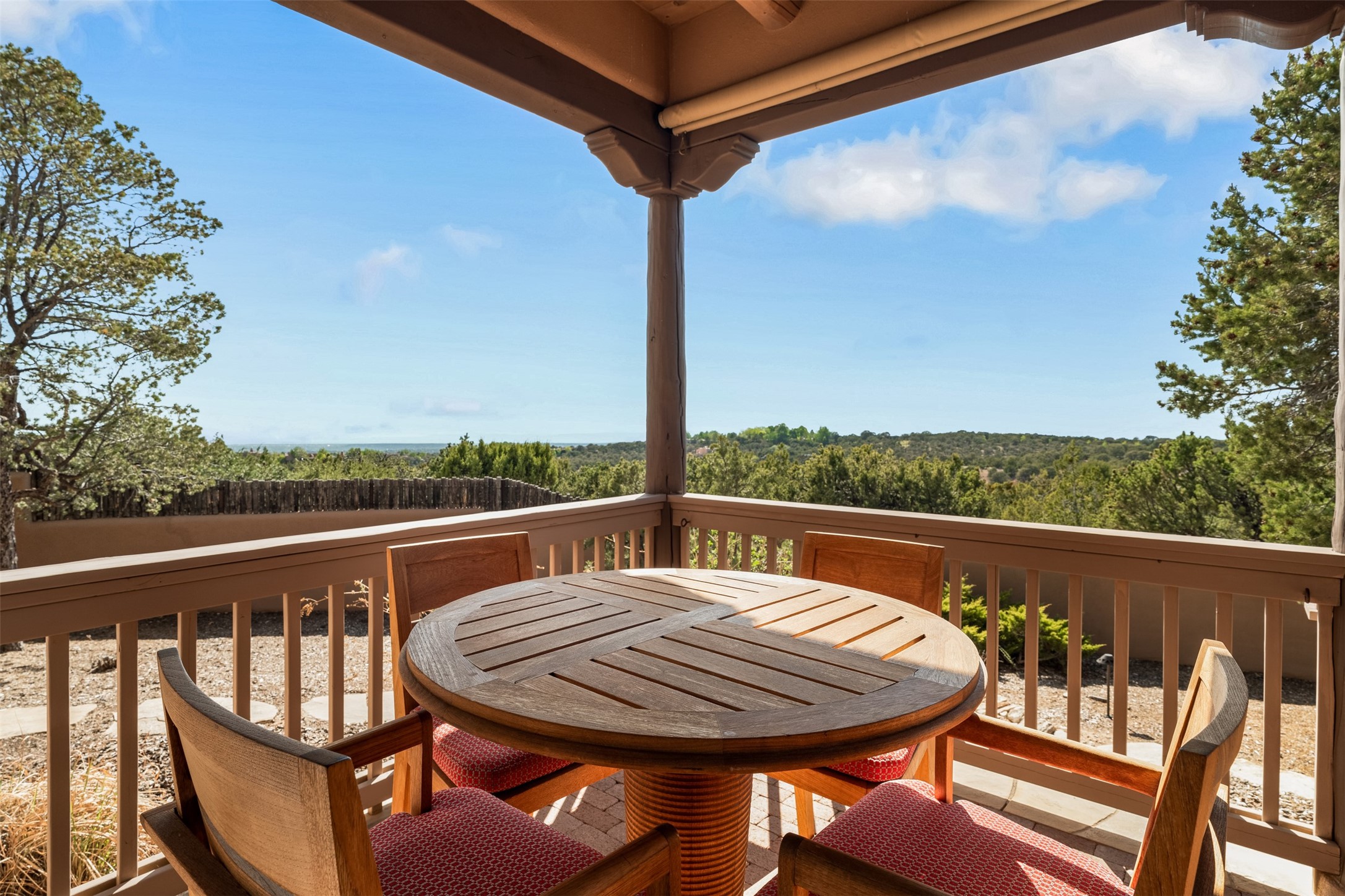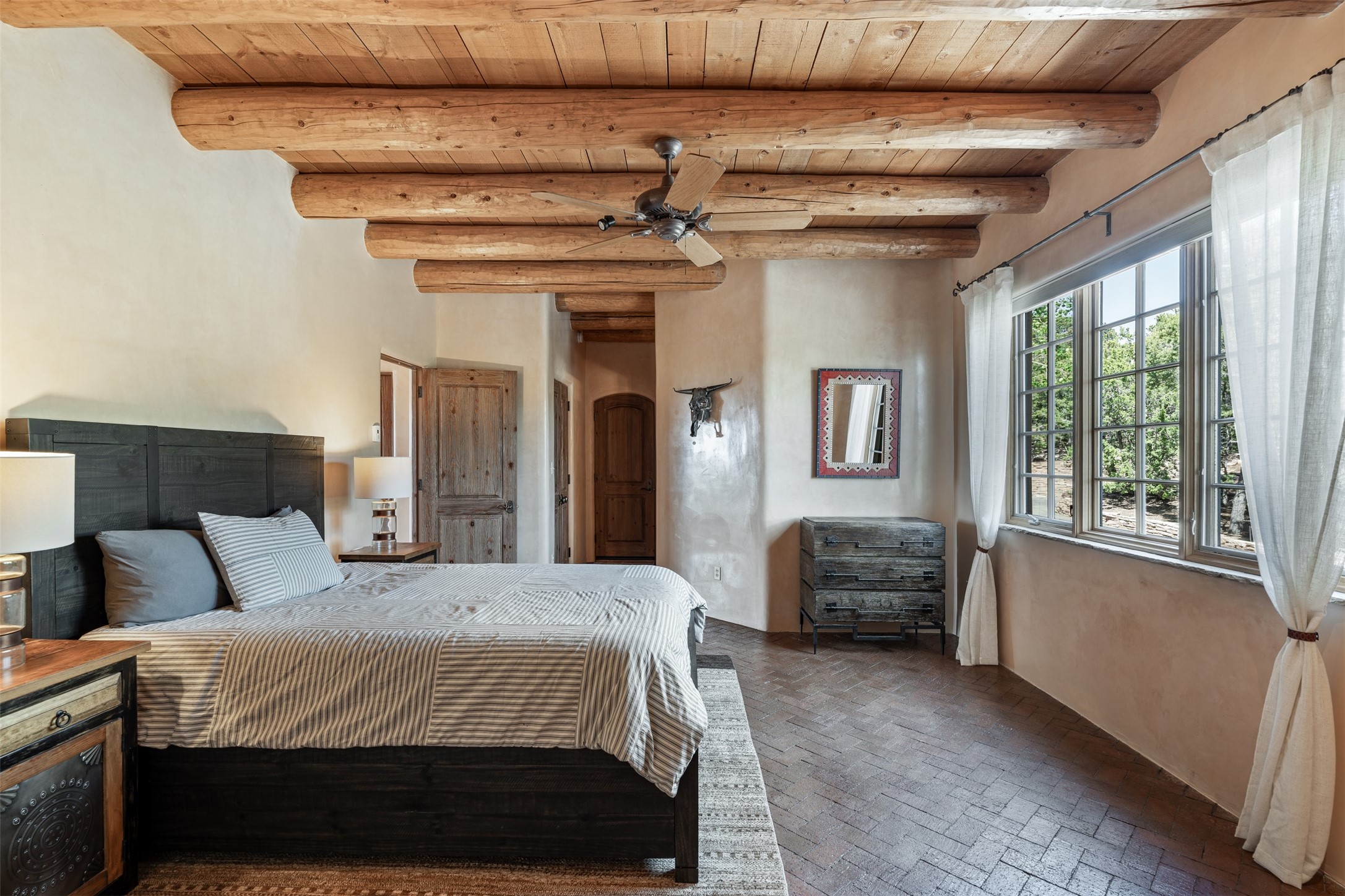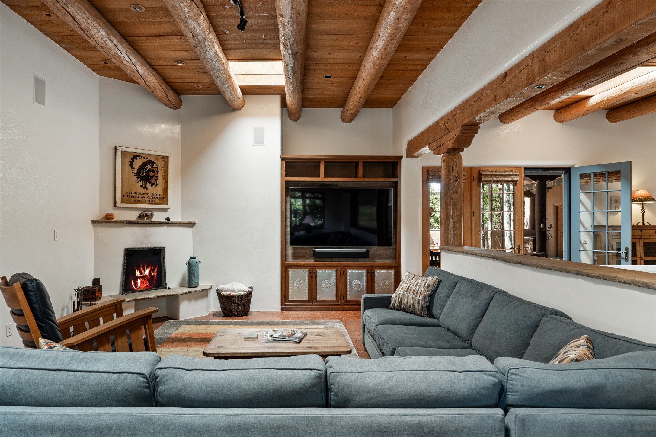 This, Rick Driscoll built, Sierra del Norte estate is perfectly located near the top of the subdivision. The 2.15 acre lot borders county open land, offers western views and can accommodate a casita. This home is a must see for the discerning buyer who wants quality, architectural excellence, privacy, views, and convenient access to the heart of Santa Fe and the ski area. Finishes include diamond polished plaster walls, vigas with coved ceilings, massive beams and reclaimed pine, brick and flagstone floors. The inviting floor plan has separated primary and guest bedrooms in addition to a private office. Each guest suite features, en-suite baths and wood burning fireplaces. The spacious kitchen was completely remodeled by the current owners and features top-notch appliances, Taj Mahal countertops and custom cabinetry. The kitchen is well placed in relation to the living/dining areas, den, and portals to allow for easy entertaining. The spacious primary suite with fireplace opens onto a private portal. The spa like bath features a large shower with separate steam shower, dual sinks, tub, dual toilets and a bidet. The home is fully air conditioned and has radiant in-floor heating, Multiple portals are thoughtfully attached to the various living spaces and bedrooms. The gated driveway leads to an oversized, heated four car garage with lots of storage and EV charger outlet. The grounds are landscaped with rock walls, mature trees, water features and are fenced. An owned photovoltaic system keeps electric bills very low. The membrane roof is under warranty. This is a wonderful, well maintained, home in one of Santa Fe's most sought after neighborhoods. Just move in and enjoy.
