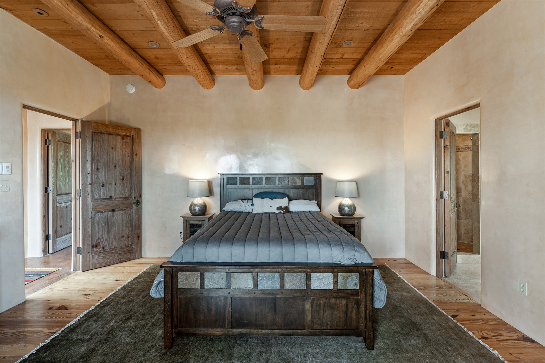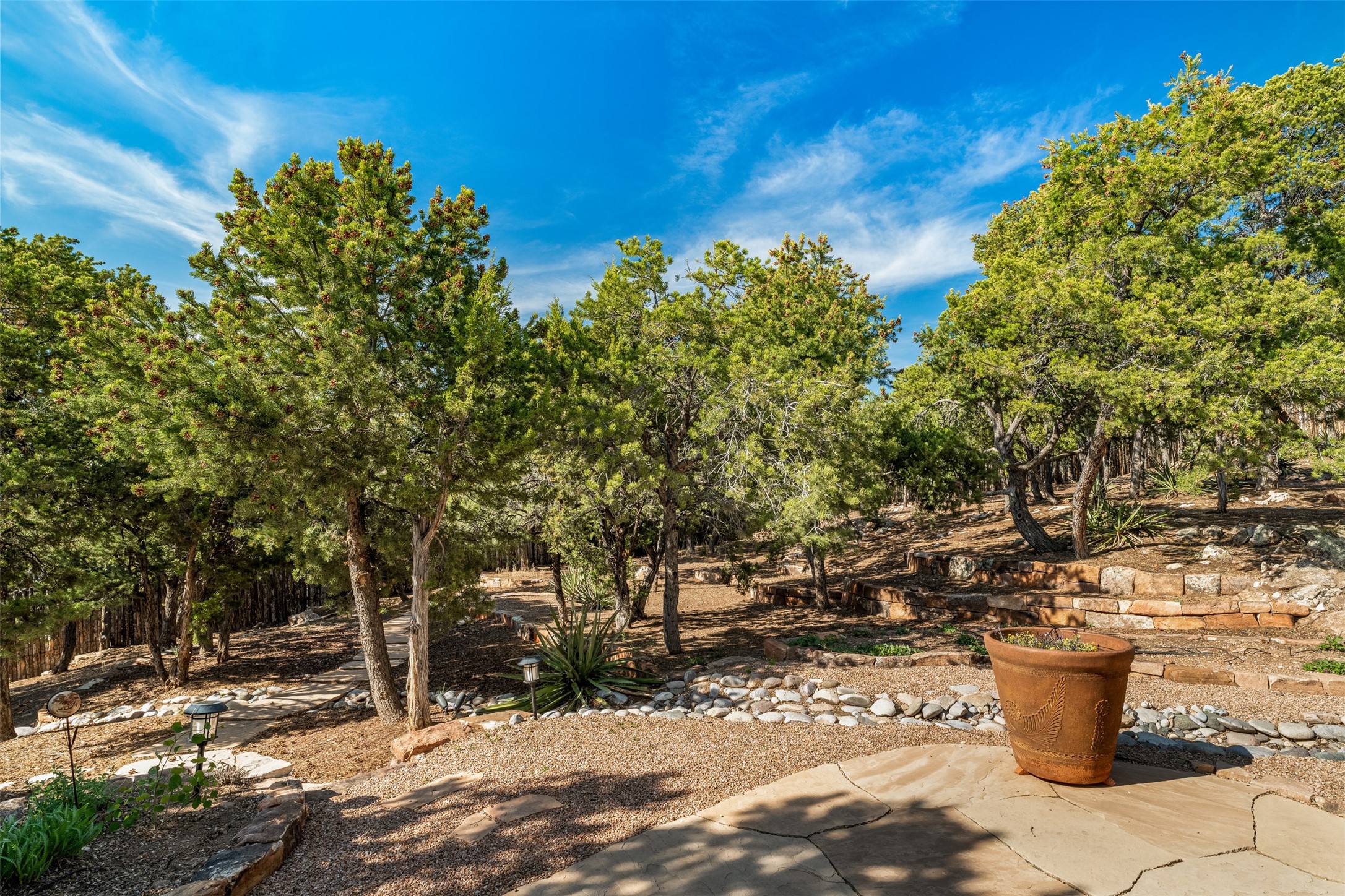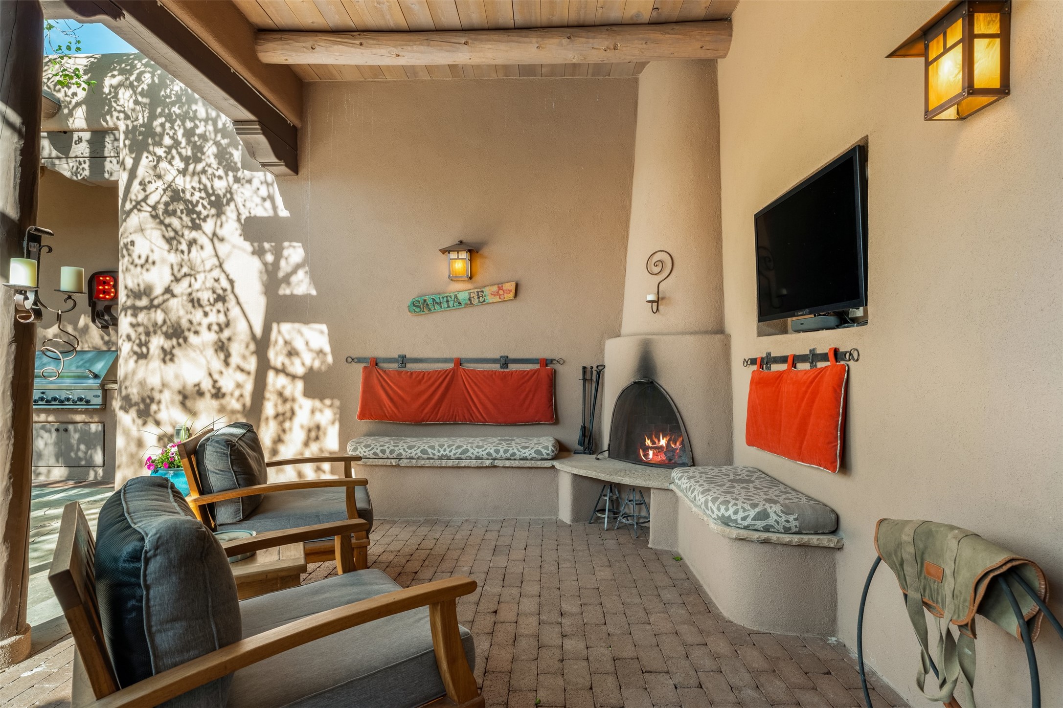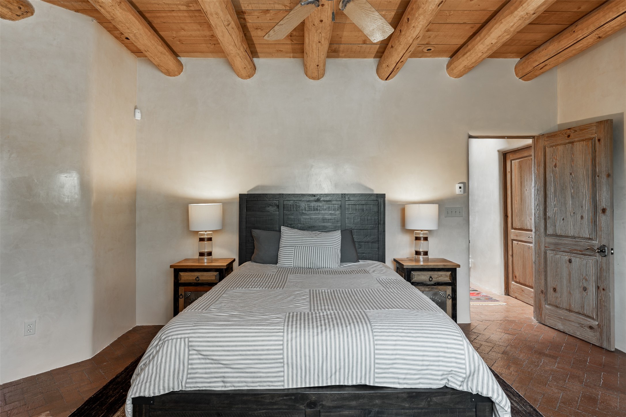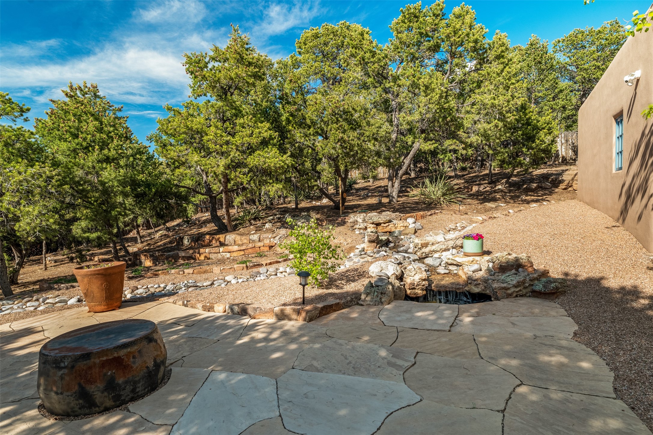 This, Rick Driscoll built, Sierra del Norte estate is perfectly located near the top of the subdivision. The 2.15 acre lot borders county open land, offers western views and can accommodate a casita. This home is a must see for the discerning buyer who wants quality, architectural excellence, privacy, views, and convenient access to the heart of Santa Fe and the ski area. Finishes include diamond polished plaster walls, vigas with coved ceilings, massive beams and reclaimed pine, brick and flagstone floors. The inviting floor plan has separated primary and guest bedrooms in addition to a private office. Each guest suite features, en-suite baths and wood burning fireplaces. The spacious kitchen was completely remodeled by the current owners and features top-notch appliances, Taj Mahal countertops and custom cabinetry. The kitchen is well placed in relation to the living/dining areas, den, and portals to allow for easy entertaining. The spacious primary suite with fireplace opens onto a private portal. The spa like bath features a large shower with separate steam shower, dual sinks, tub, dual toilets and a bidet. The home is fully air conditioned and has radiant in-floor heating, Multiple portals are thoughtfully attached to the various living spaces and bedrooms. The gated driveway leads to an oversized, heated four car garage with lots of storage and EV charger outlet. The grounds are landscaped with rock walls, mature trees, water features and are fenced. An owned photovoltaic system keeps electric bills very low. The membrane roof is under warranty. This is a wonderful, well maintained, home in one of Santa Fe's most sought after neighborhoods. Just move in and enjoy.