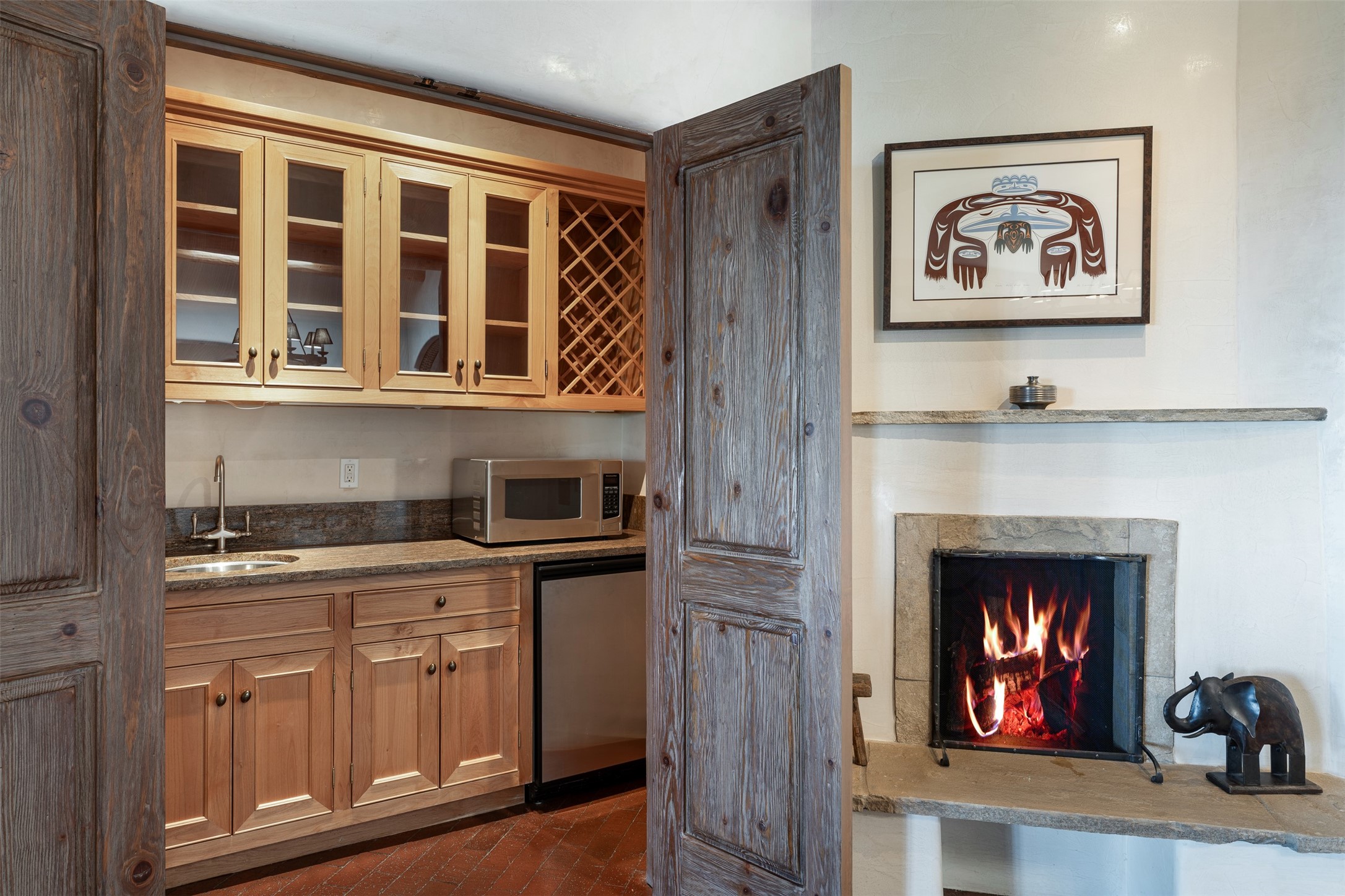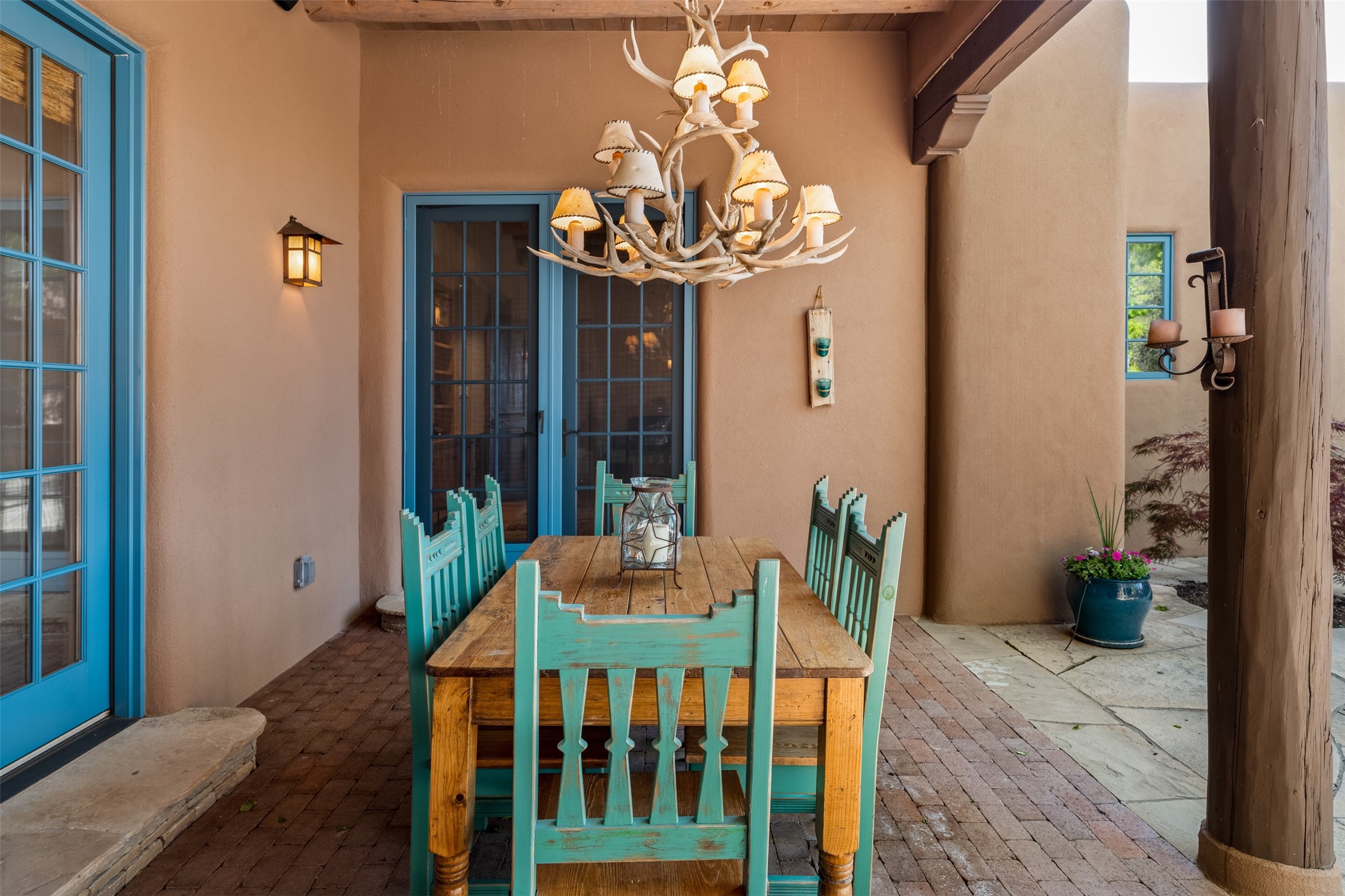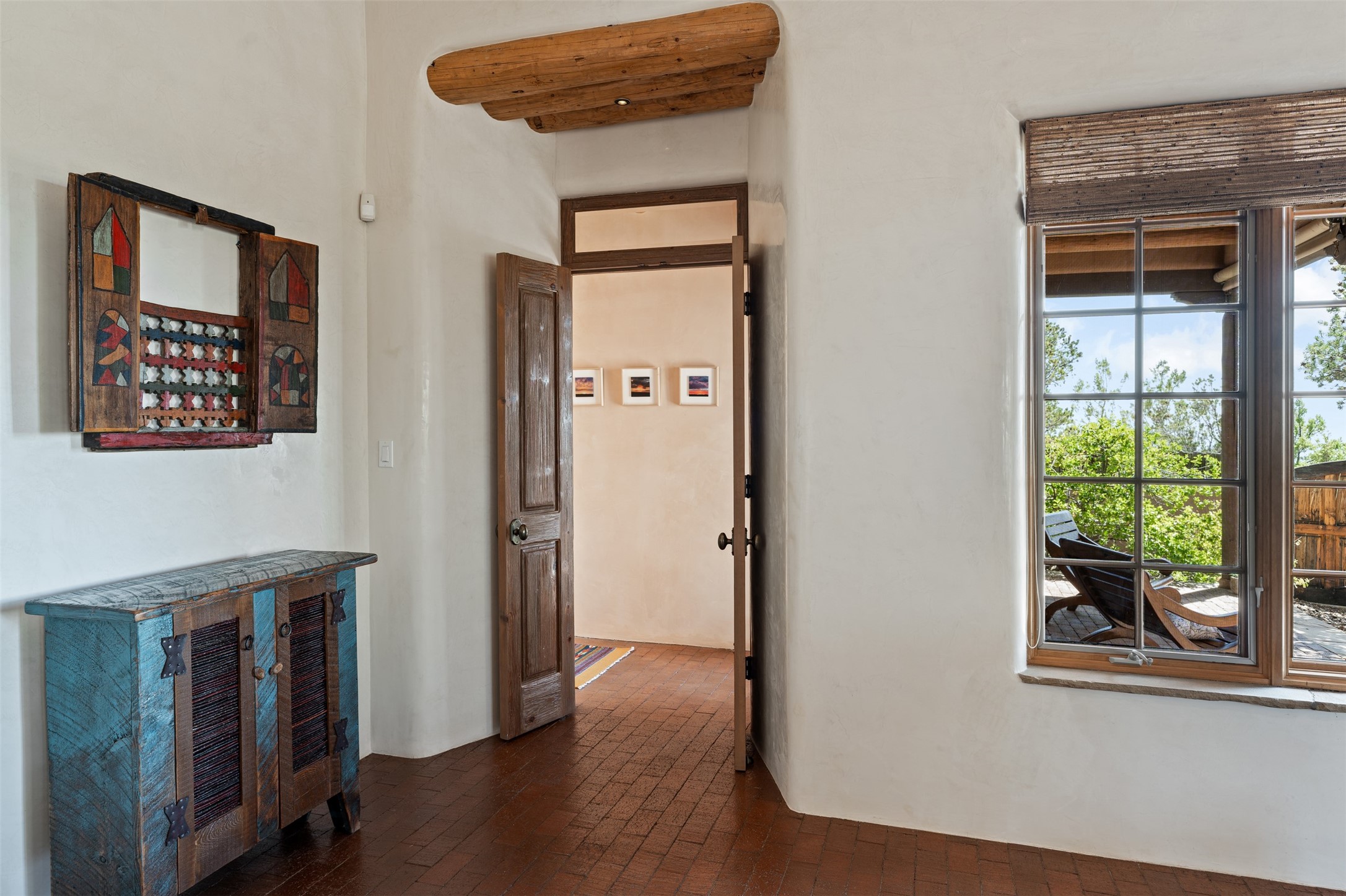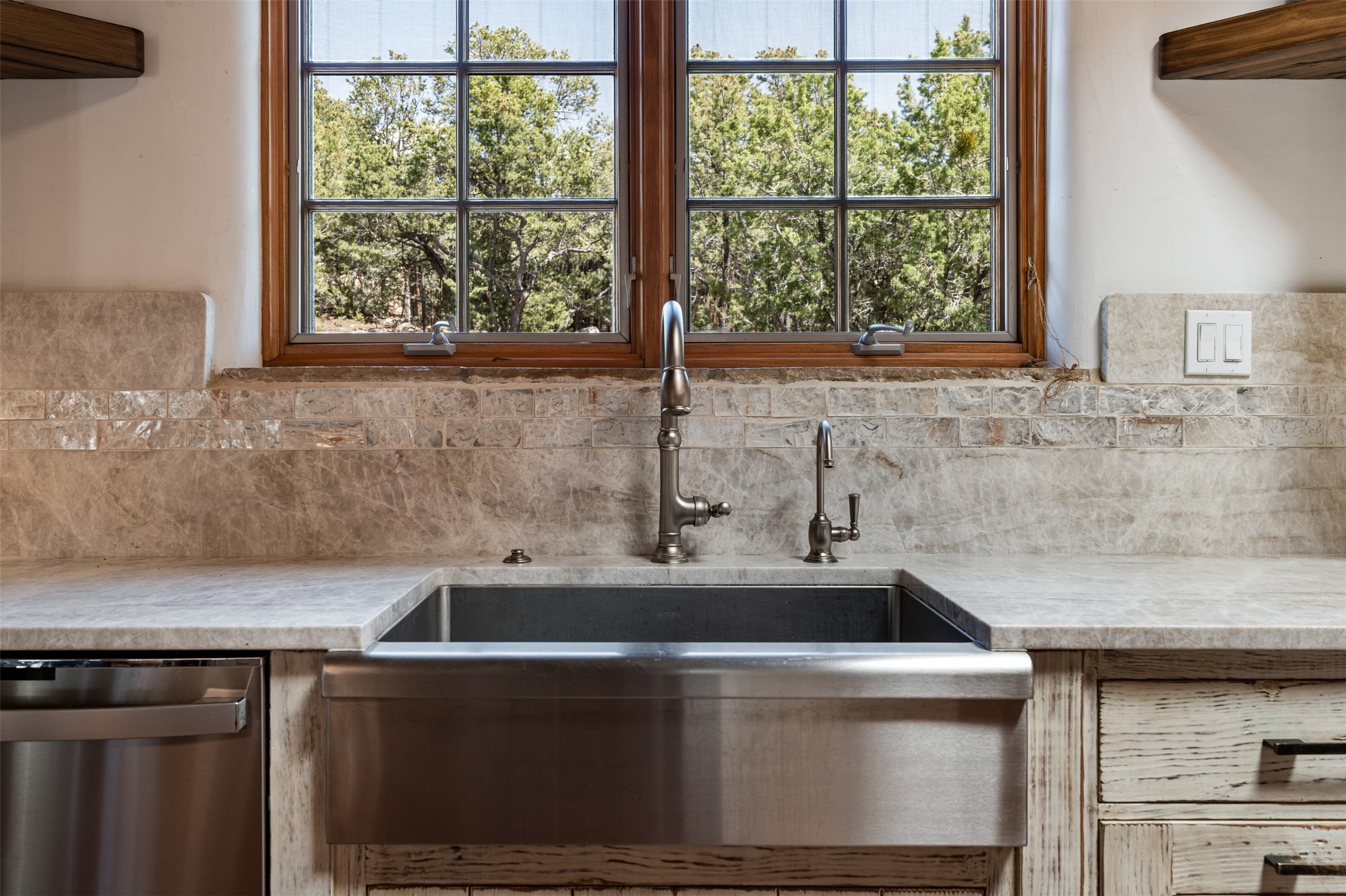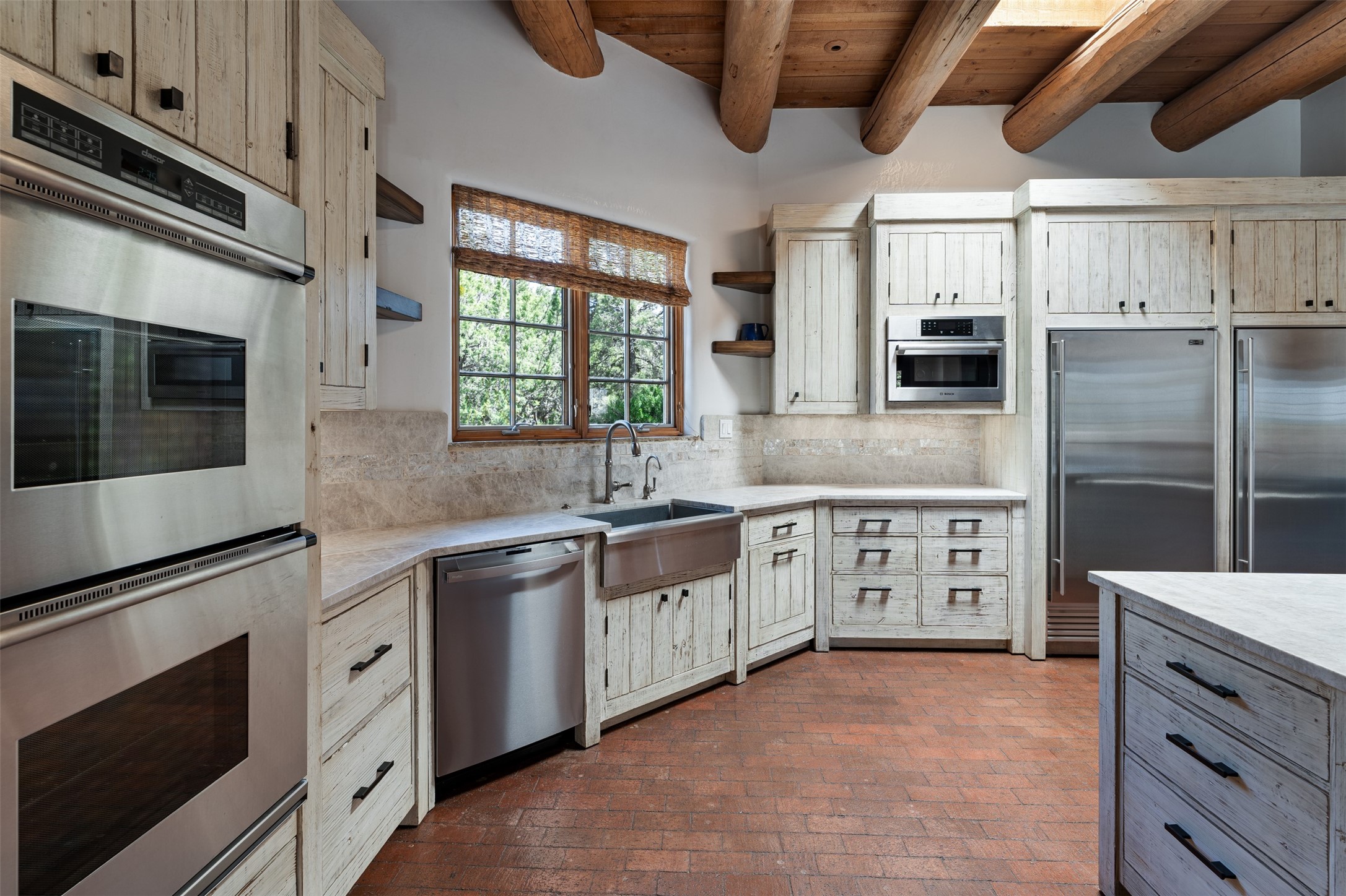 This, Rick Driscoll built, Sierra del Norte estate is perfectly located near the top of the subdivision. The 2.15 acre lot borders county open land, offers western views and can accommodate a casita. This home is a must see for the discerning buyer who wants quality, architectural excellence, privacy, views, and convenient access to the heart of Santa Fe and the ski area. Finishes include diamond polished plaster walls, vigas with coved ceilings, massive beams and reclaimed pine, brick and flagstone floors. The inviting floor plan has separated primary and guest bedrooms in addition to a private office. Each guest suite features, en-suite baths and wood burning fireplaces. The spacious kitchen was completely remodeled by the current owners and features top-notch appliances, Taj Mahal countertops and custom cabinetry. The kitchen is well placed in relation to the living/dining areas, den, and portals to allow for easy entertaining. The spacious primary suite with fireplace opens onto a private portal. The spa like bath features a large shower with separate steam shower, dual sinks, tub, dual toilets and a bidet. The home is fully air conditioned and has radiant in-floor heating, Multiple portals are thoughtfully attached to the various living spaces and bedrooms. The gated driveway leads to an oversized, heated four car garage with lots of storage and EV charger outlet. The grounds are landscaped with rock walls, mature trees, water features and are fenced. An owned photovoltaic system keeps electric bills very low. The membrane roof is under warranty. This is a wonderful, well maintained, home in one of Santa Fe's most sought after neighborhoods. Just move in and enjoy.