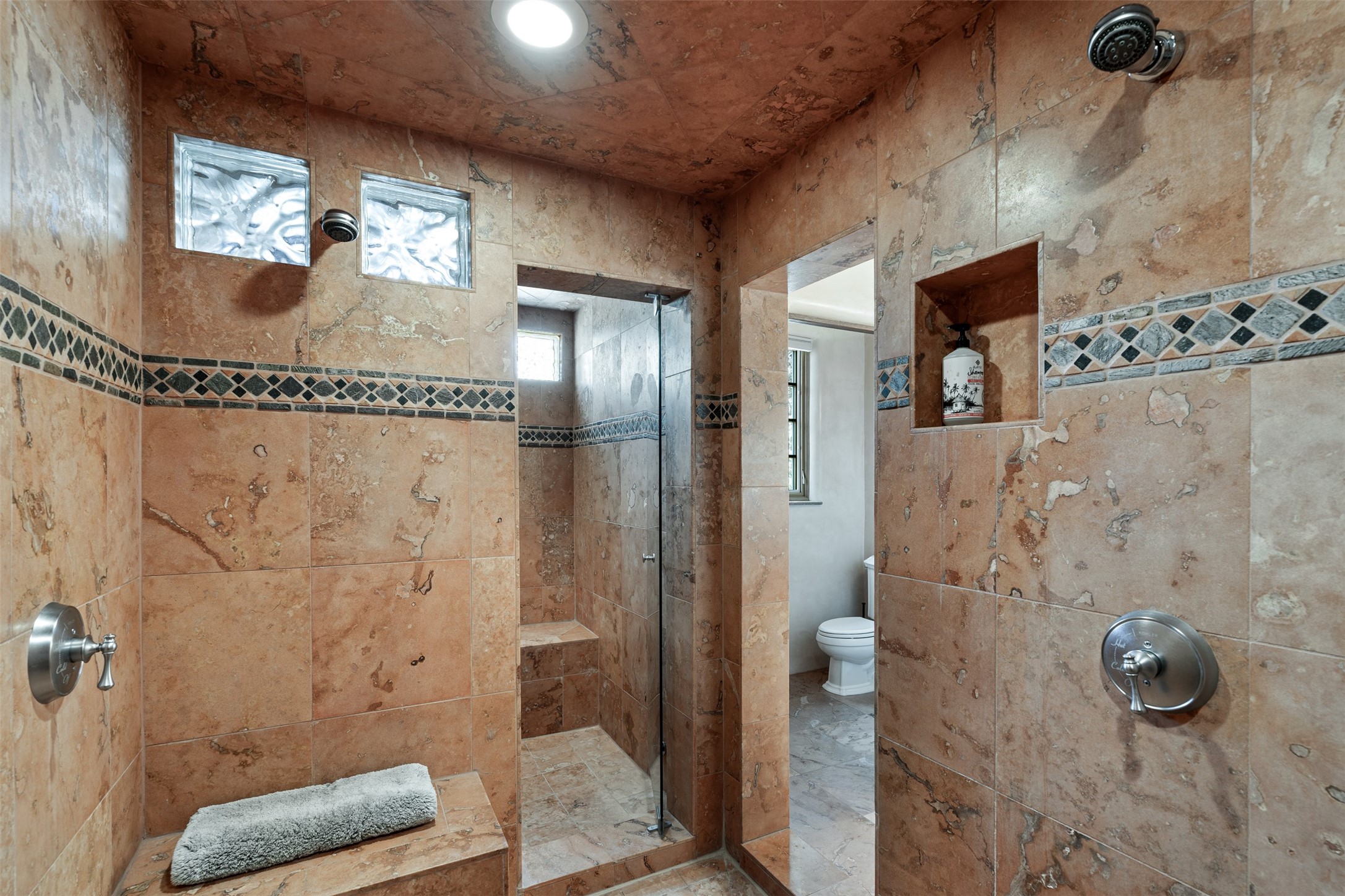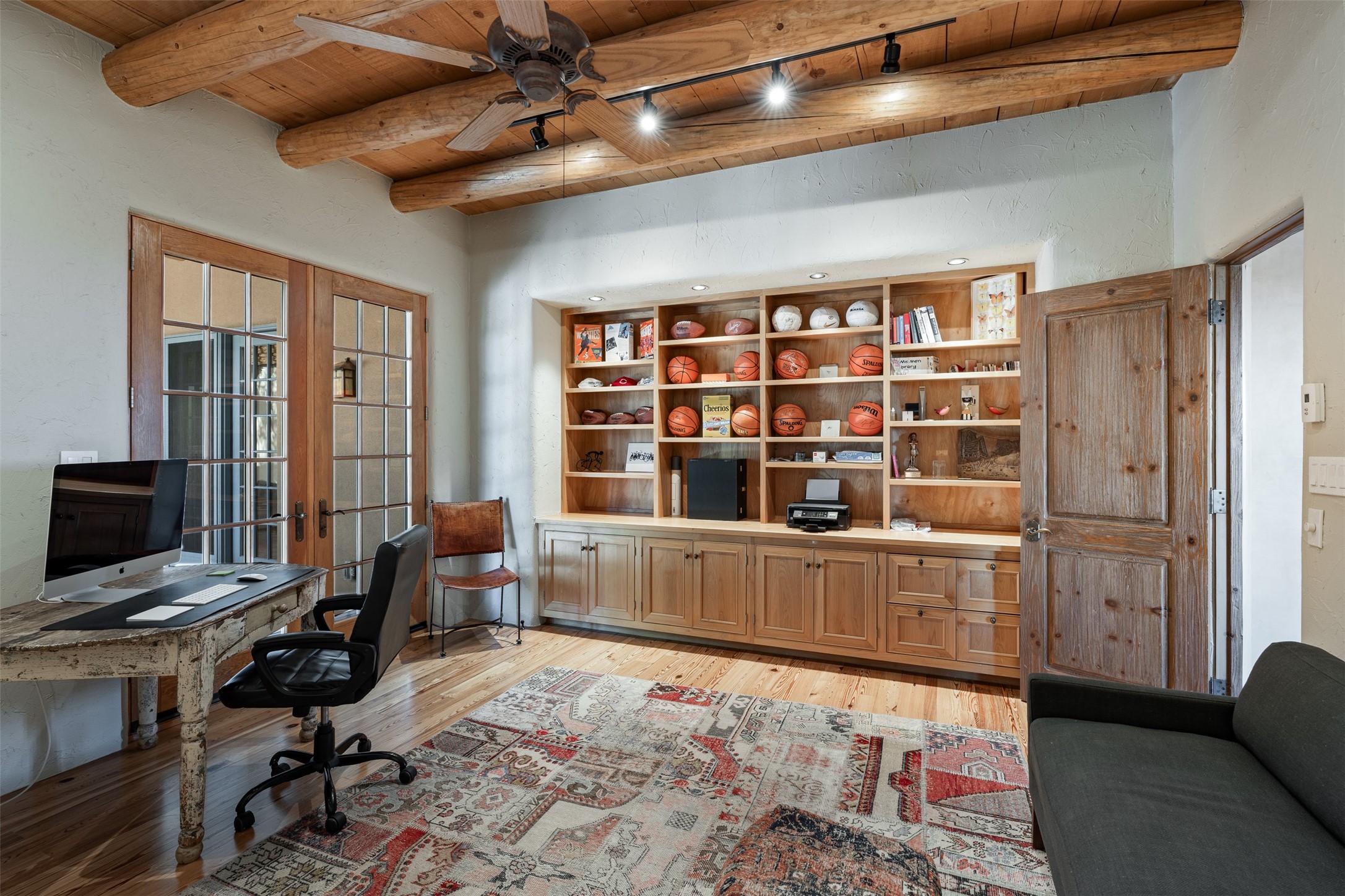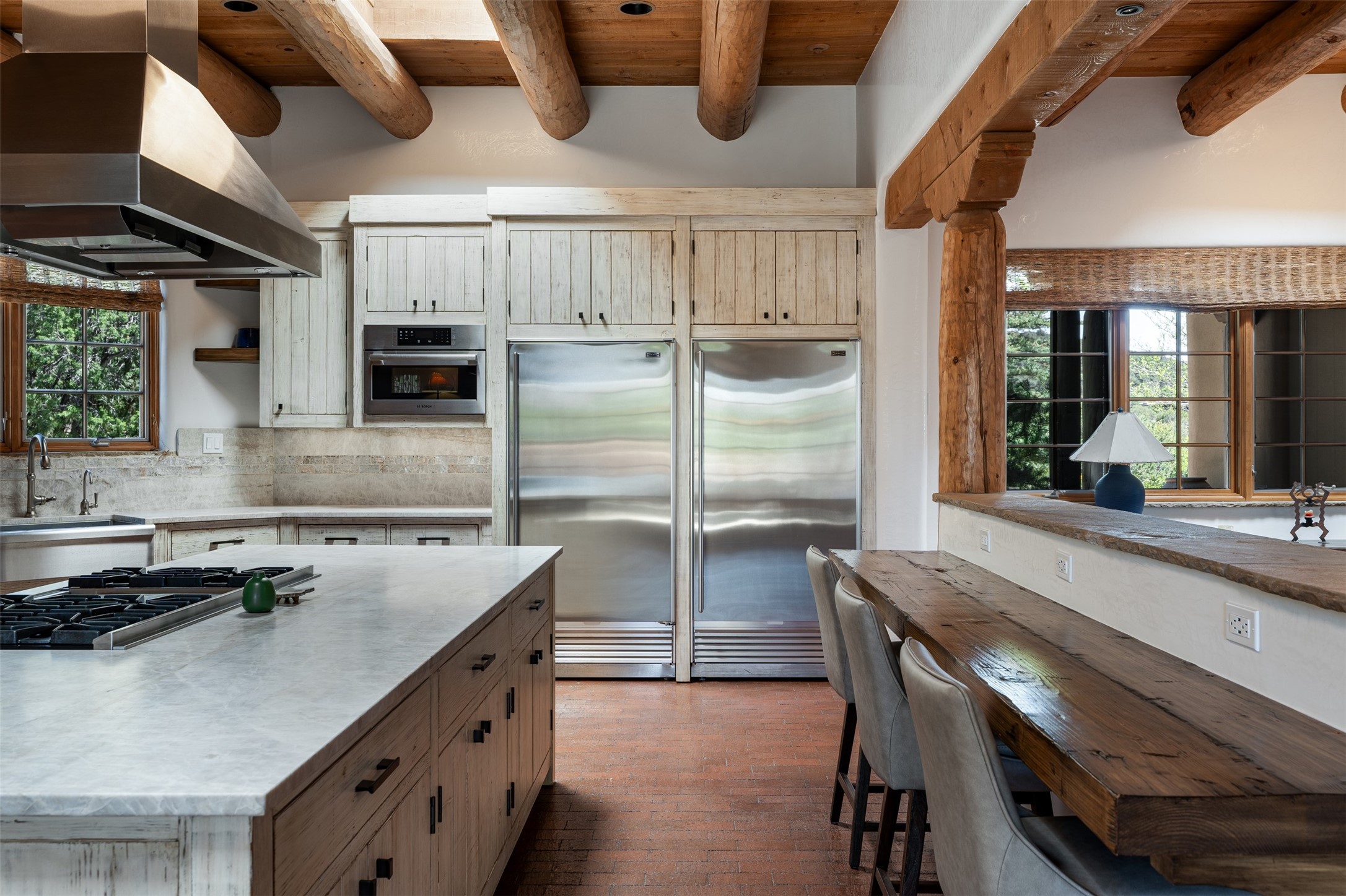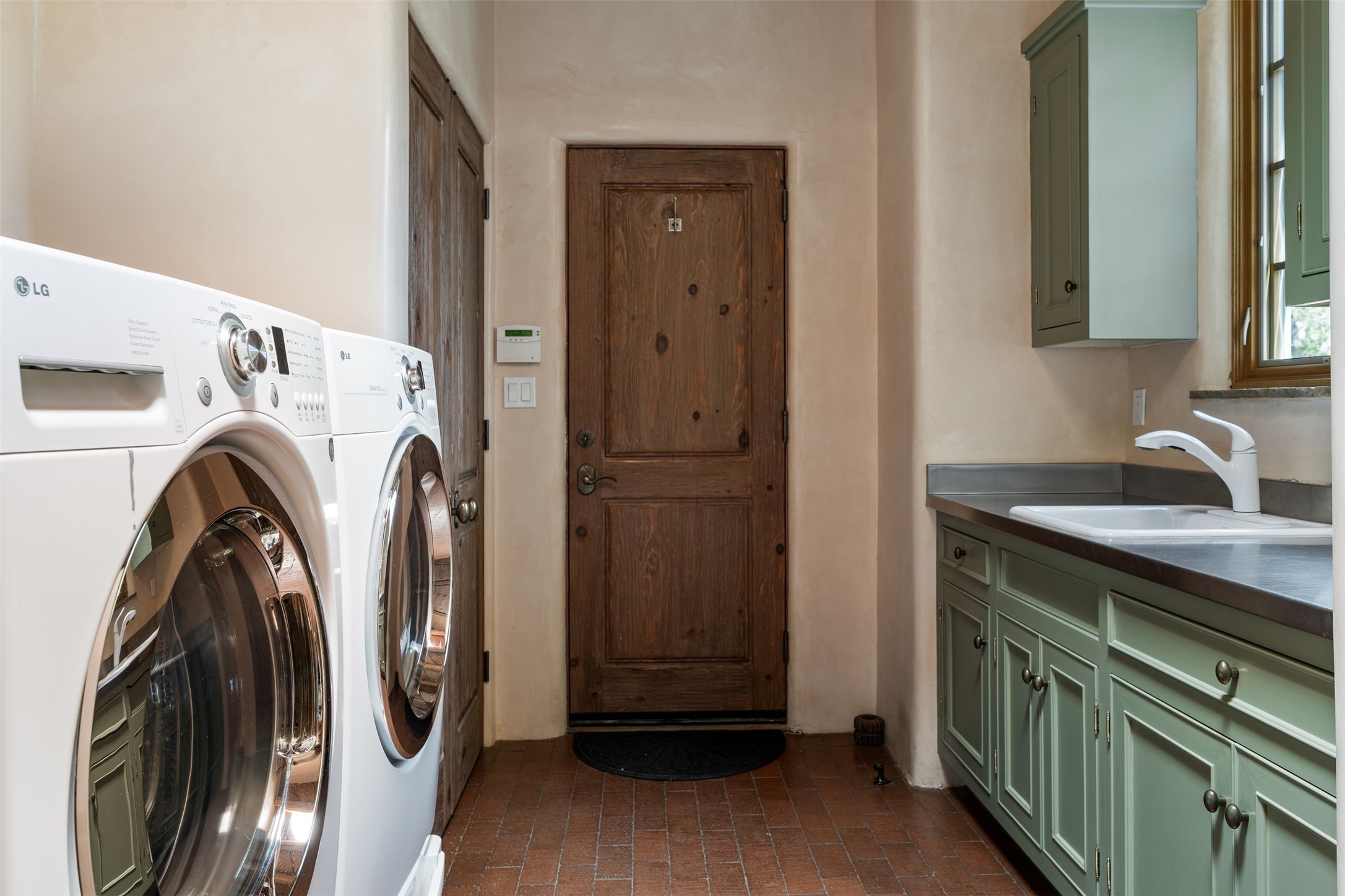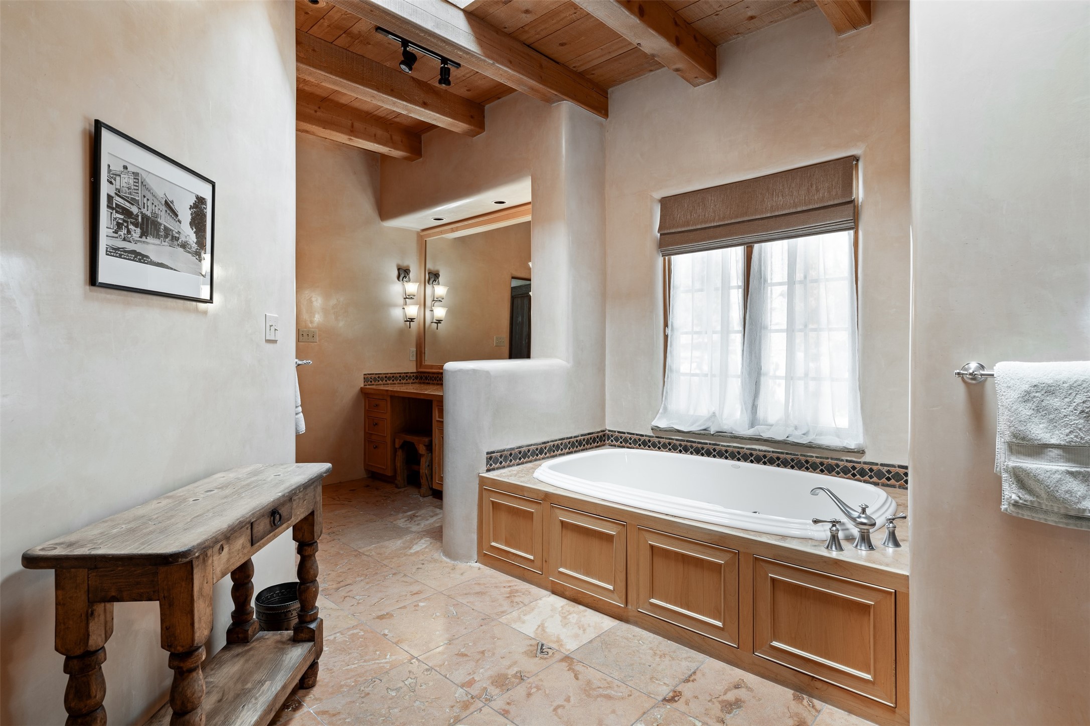 This, Rick Driscoll built, Sierra del Norte estate is perfectly located near the top of the subdivision. The 2.15 acre lot borders county open land, offers western views and can accommodate a casita. This home is a must see for the discerning buyer who wants quality, architectural excellence, privacy, views, and convenient access to the heart of Santa Fe and the ski area. Finishes include diamond polished plaster walls, vigas with coved ceilings, massive beams and reclaimed pine, brick and flagstone floors. The inviting floor plan has separated primary and guest bedrooms in addition to a private office. Each guest suite features, en-suite baths and wood burning fireplaces. The spacious kitchen was completely remodeled by the current owners and features top-notch appliances, Taj Mahal countertops and custom cabinetry. The kitchen is well placed in relation to the living/dining areas, den, and portals to allow for easy entertaining. The spacious primary suite with fireplace opens onto a private portal. The spa like bath features a large shower with separate steam shower, dual sinks, tub, dual toilets and a bidet. The home is fully air conditioned and has radiant in-floor heating, Multiple portals are thoughtfully attached to the various living spaces and bedrooms. The gated driveway leads to an oversized, heated four car garage with lots of storage and EV charger outlet. The grounds are landscaped with rock walls, mature trees, water features and are fenced. An owned photovoltaic system keeps electric bills very low. The membrane roof is under warranty. This is a wonderful, well maintained, home in one of Santa Fe's most sought after neighborhoods. Just move in and enjoy.