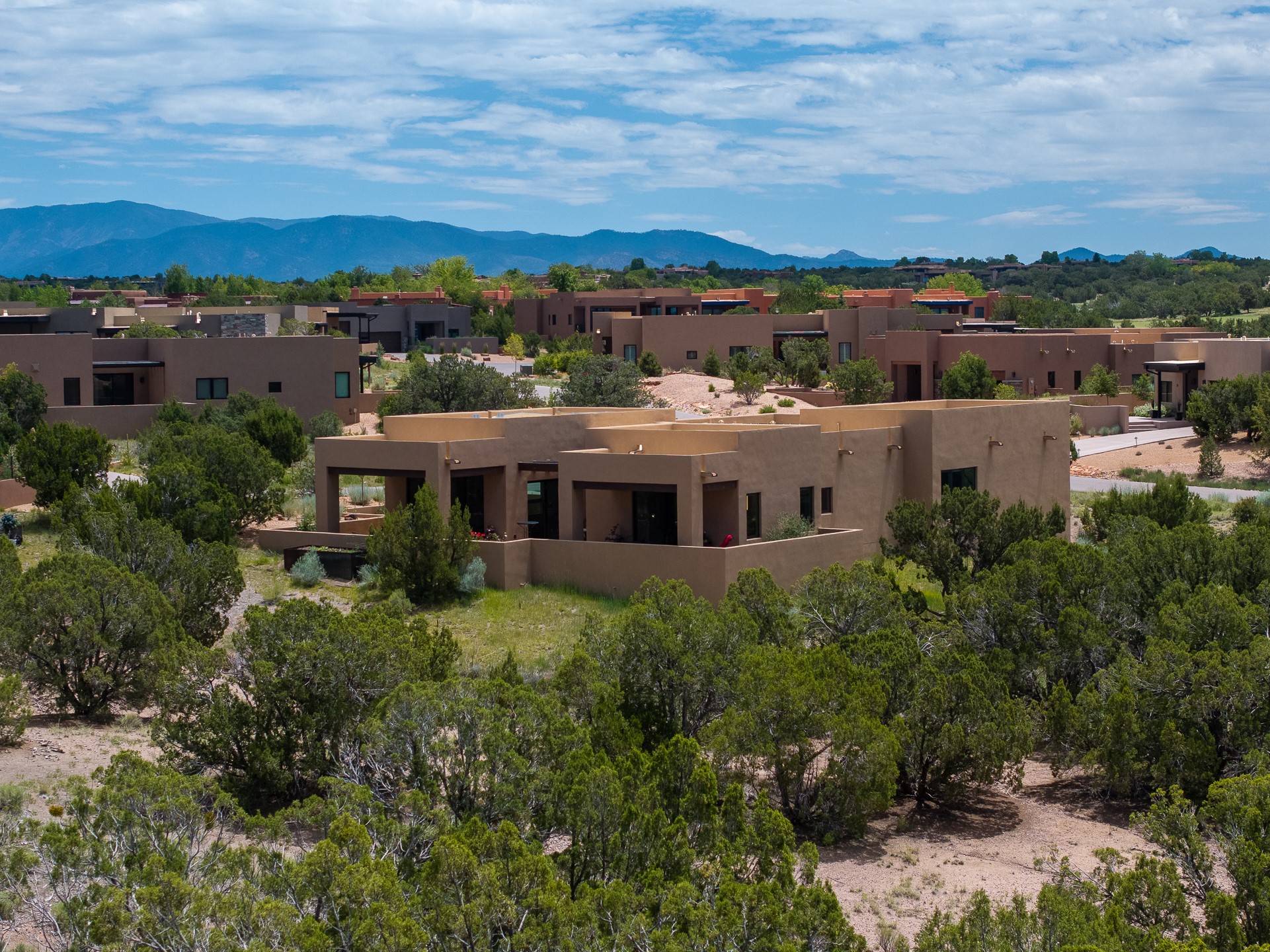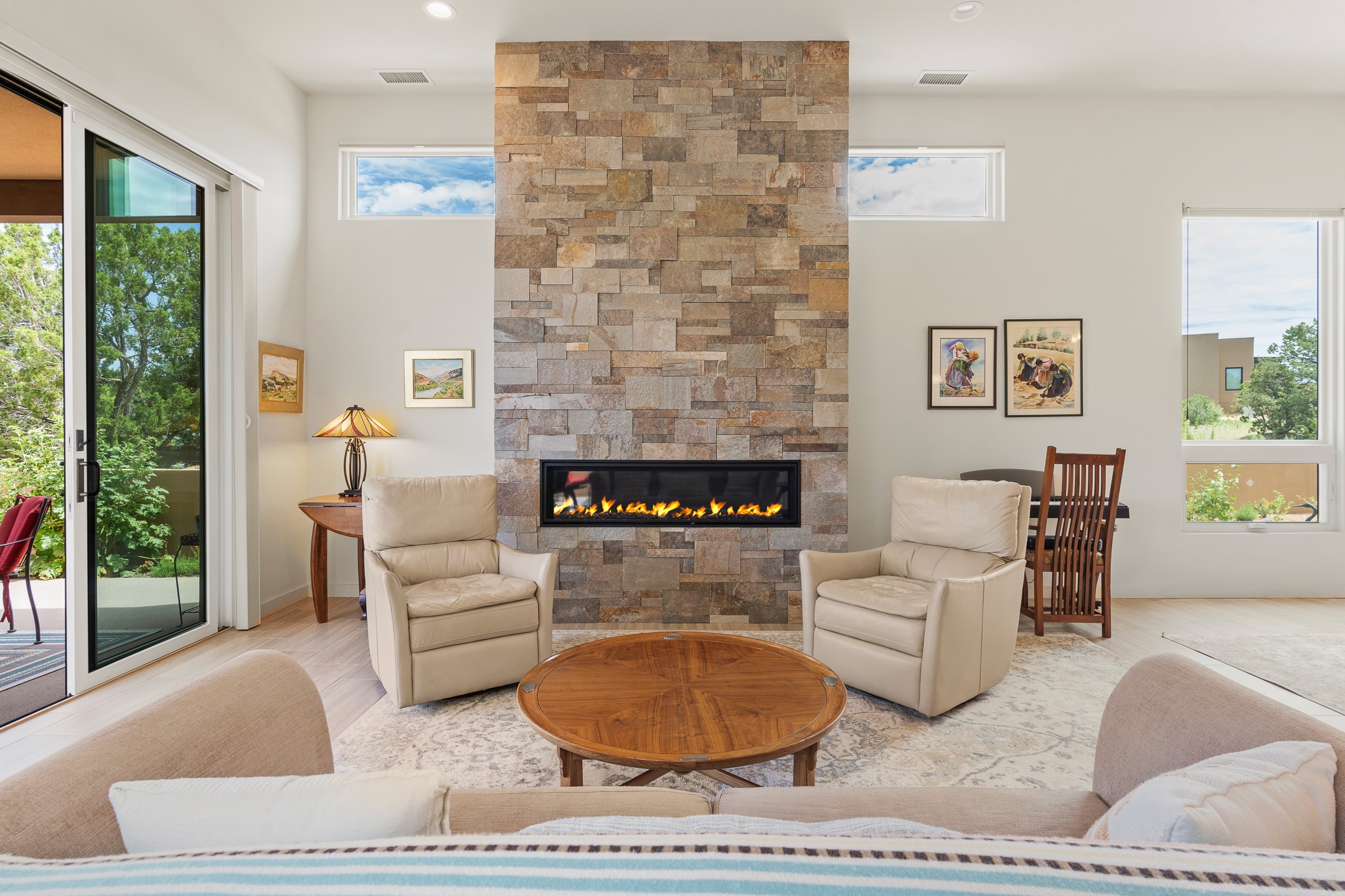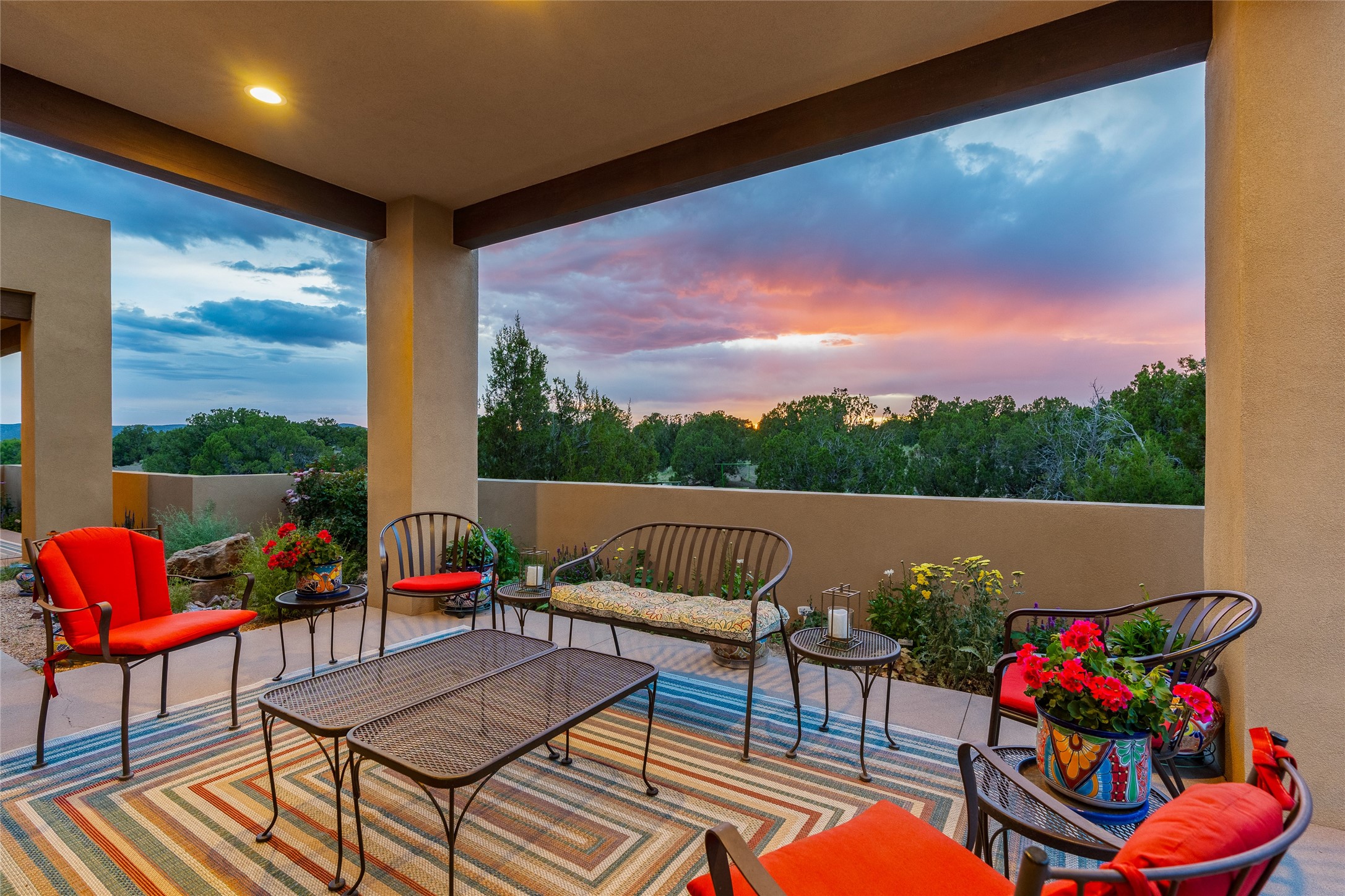 This recently constructed, open concept design residence elegantly combines Pueblo Revival and Contemporary architectural styles. It features three outdoor living areas, including a sheltered courtyard perfect for al fresco dining, and a spacious covered portal, making it an inviting space to enjoy the serene water features, meticulously landscaped gardens with flowers galore, and breathtaking sunset vistas. The gourmet kitchen is equipped with exquisite solid wood cabinetry, stainless-steel Viking appliances, quartz countertops, and a walk-in pantry, seamlessly connecting to the dining and gathering areas. The gathering space boasts a substantial gas fireplace adorned with custom stonework. This Energy efficient Home has Solar panels that cover household electricity plus 2 electric vehicles! The primary suite includes a private portal and a generously sized bathroom featuring a curbless walk-in shower, a soaking tub, dual sinks, and a large walk-in closet with convenient access to the laundry room. A shared bathroom serves the two additional bedrooms, one of which is ideally suited for a home office. The homeowners' association fees cover road and common area maintenance, 24-hour roaming security, and on-site emergency medical technicians. Membership to The Club at Las Campanas is optional, offering amenities such as indoor and outdoor swimming pools, tennis courts, a fitness center, equestrian facilities, fine dining options, and two Jack Nicklaus Signature Golf Courses.