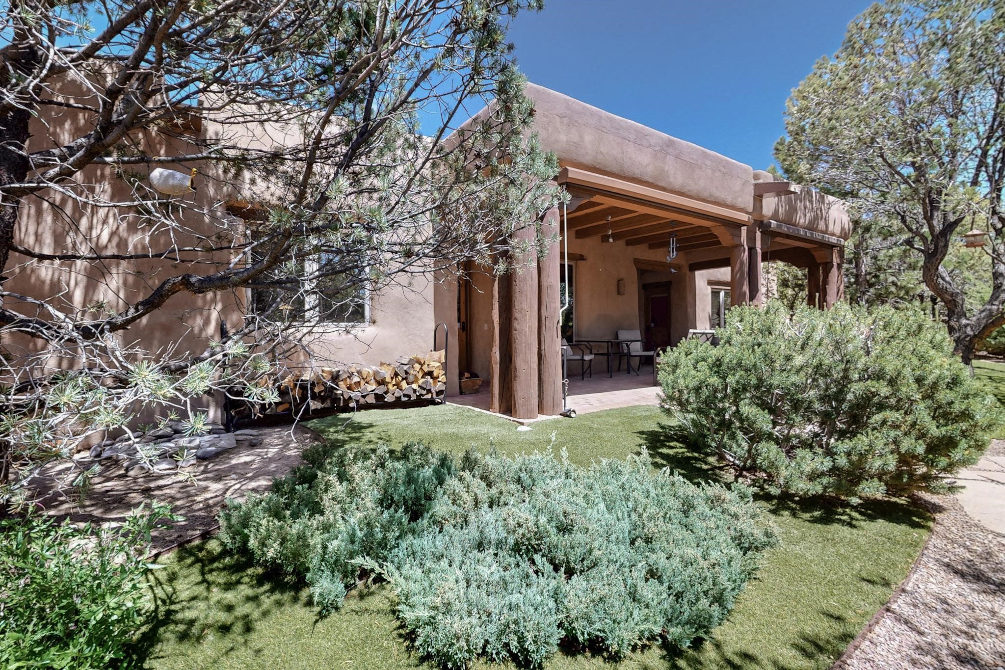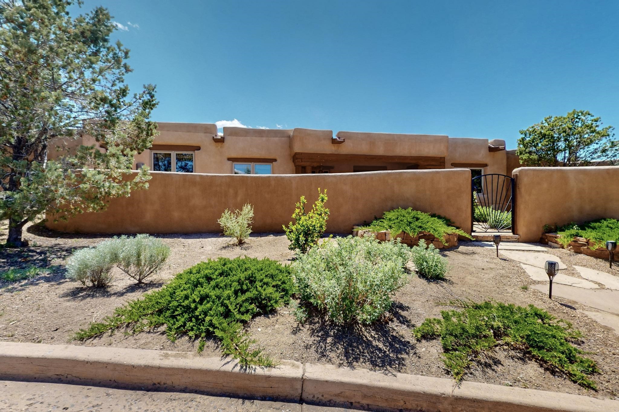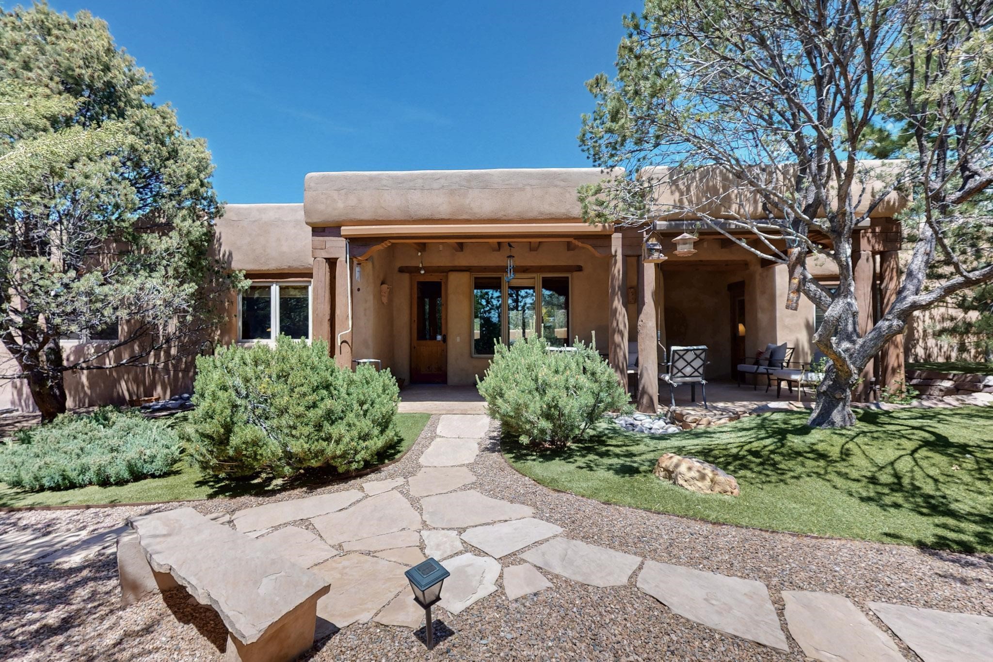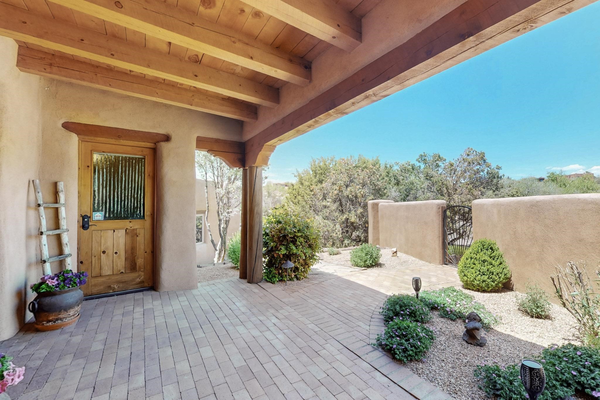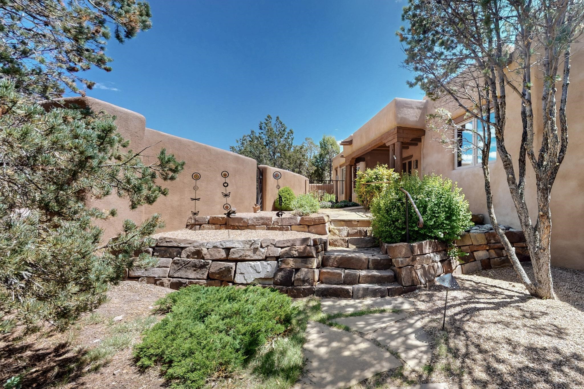 This exceptional Adobe home, a testament to the artistry of Jim Hays, offers a rare blend of exquisite design and superior construction. Upon entering, you'll immediately appreciate the distinguished details that define a Hays-built residence, including graceful curved hard plaster walls, authentic Saltillo tile flooring, thoughtfully placed nichos, hand-carved corbels, substantial beams, and the inviting warmth of traditional Kiva fireplaces.The home's comfortable single-level floor plan is thoughtfully designed for ease of living. Envision starting your day in the delightful breakfast nook, a perfect spot to savor your morning coffee while taking in the views of the majestic Sangre de Cristo Mountains. Adjacent, the separate dining room provides an elegant space for more formal gatherings. A versatile Office/Library further enhances the home's casual yet refined ambiance, offering a quiet retreat for work or relaxation. The open and welcoming layout flows seamlessly into a generously sized living room, which in turn opens onto a lovely rear portal. Here, you can unwind amidst beautiful native landscaping and enjoy the convenience of an astroturf lawn that maintains its appeal year-round. Located within the highly sought-after Estancia Primera community, residents benefit from access to fantastic amenities, including a refreshing summertime pool, tennis courts, and a comfortable clubhouse for social gatherings. The convenience of this location is truly unparalleled, with the historic Santa Fe Plaza just a short drive away, offering a wealth of cultural attractions, dining, and shopping. Additionally, the renowned 10,000 Waves Japanese Bathhouse is within easy reach for a tranquil escape. For those who enjoy the outdoors, a nearby hiking trail provides a scenic route to downtown, allowing you to immerse yourself in the natural beauty of the area. NOTE: there are seven steps leading from the garage to the main living level.