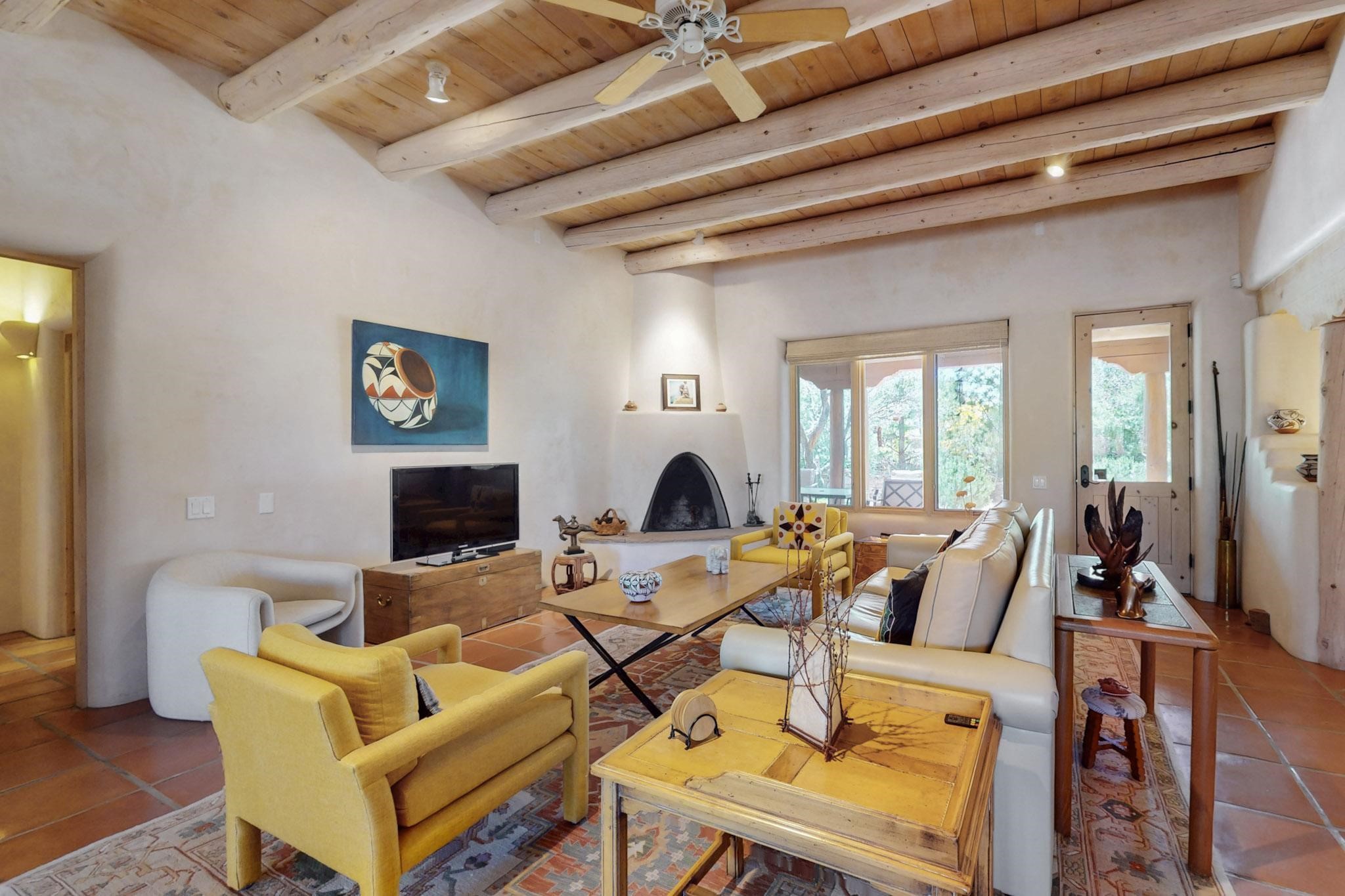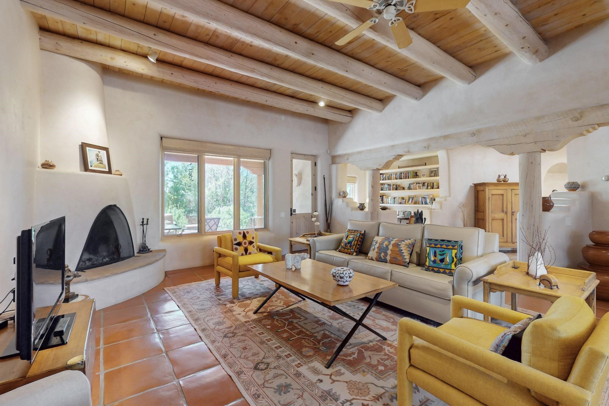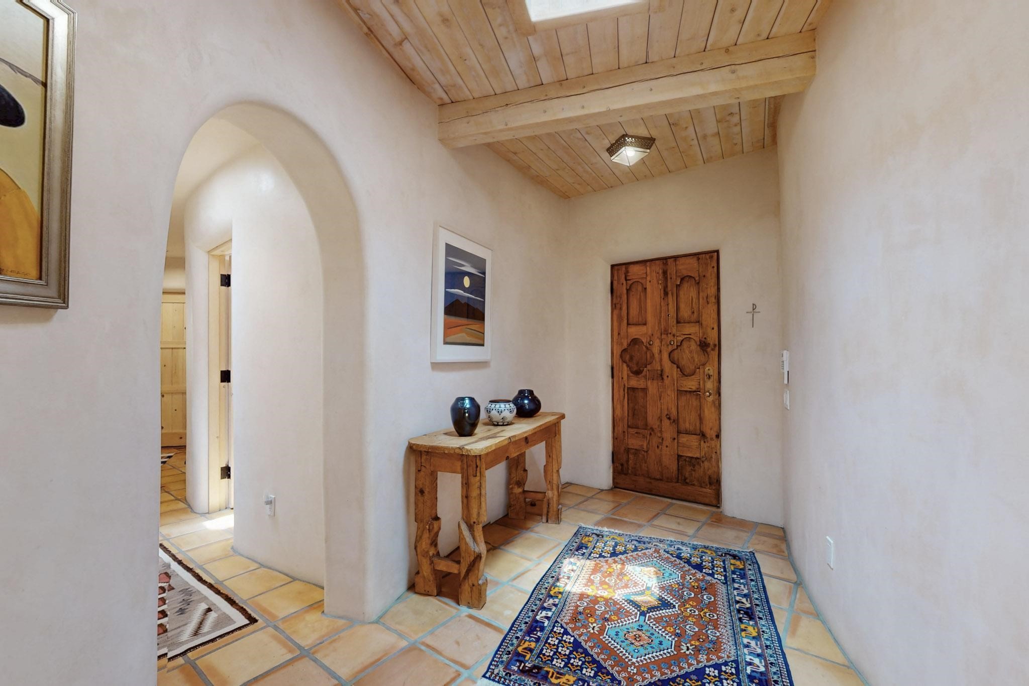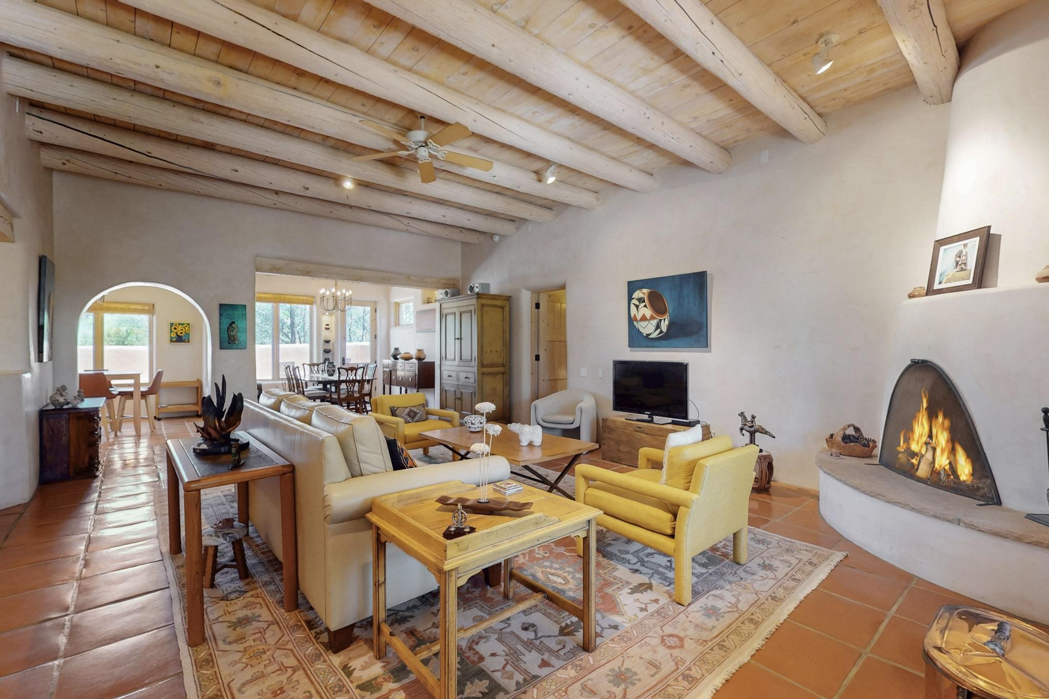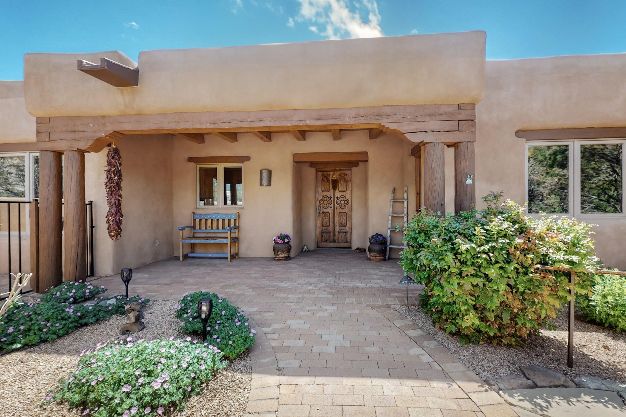 This exceptional Adobe home, a testament to the artistry of Jim Hays, offers a rare blend of exquisite design and superior construction. Upon entering, you'll immediately appreciate the distinguished details that define a Hays-built residence, including graceful curved hard plaster walls, authentic Saltillo tile flooring, thoughtfully placed nichos, hand-carved corbels, substantial beams, and the inviting warmth of traditional Kiva fireplaces.The home's comfortable single-level floor plan is thoughtfully designed for ease of living. Envision starting your day in the delightful breakfast nook, a perfect spot to savor your morning coffee while taking in the views of the majestic Sangre de Cristo Mountains. Adjacent, the separate dining room provides an elegant space for more formal gatherings. A versatile Office/Library further enhances the home's casual yet refined ambiance, offering a quiet retreat for work or relaxation. The open and welcoming layout flows seamlessly into a generously sized living room, which in turn opens onto a lovely rear portal. Here, you can unwind amidst beautiful native landscaping and enjoy the convenience of an astroturf lawn that maintains its appeal year-round. Located within the highly sought-after Estancia Primera community, residents benefit from access to fantastic amenities, including a refreshing summertime pool, tennis courts, and a comfortable clubhouse for social gatherings. The convenience of this location is truly unparalleled, with the historic Santa Fe Plaza just a short drive away, offering a wealth of cultural attractions, dining, and shopping. Additionally, the renowned 10,000 Waves Japanese Bathhouse is within easy reach for a tranquil escape. For those who enjoy the outdoors, a nearby hiking trail provides a scenic route to downtown, allowing you to immerse yourself in the natural beauty of the area. NOTE: there are seven steps leading from the garage to the main living level.
