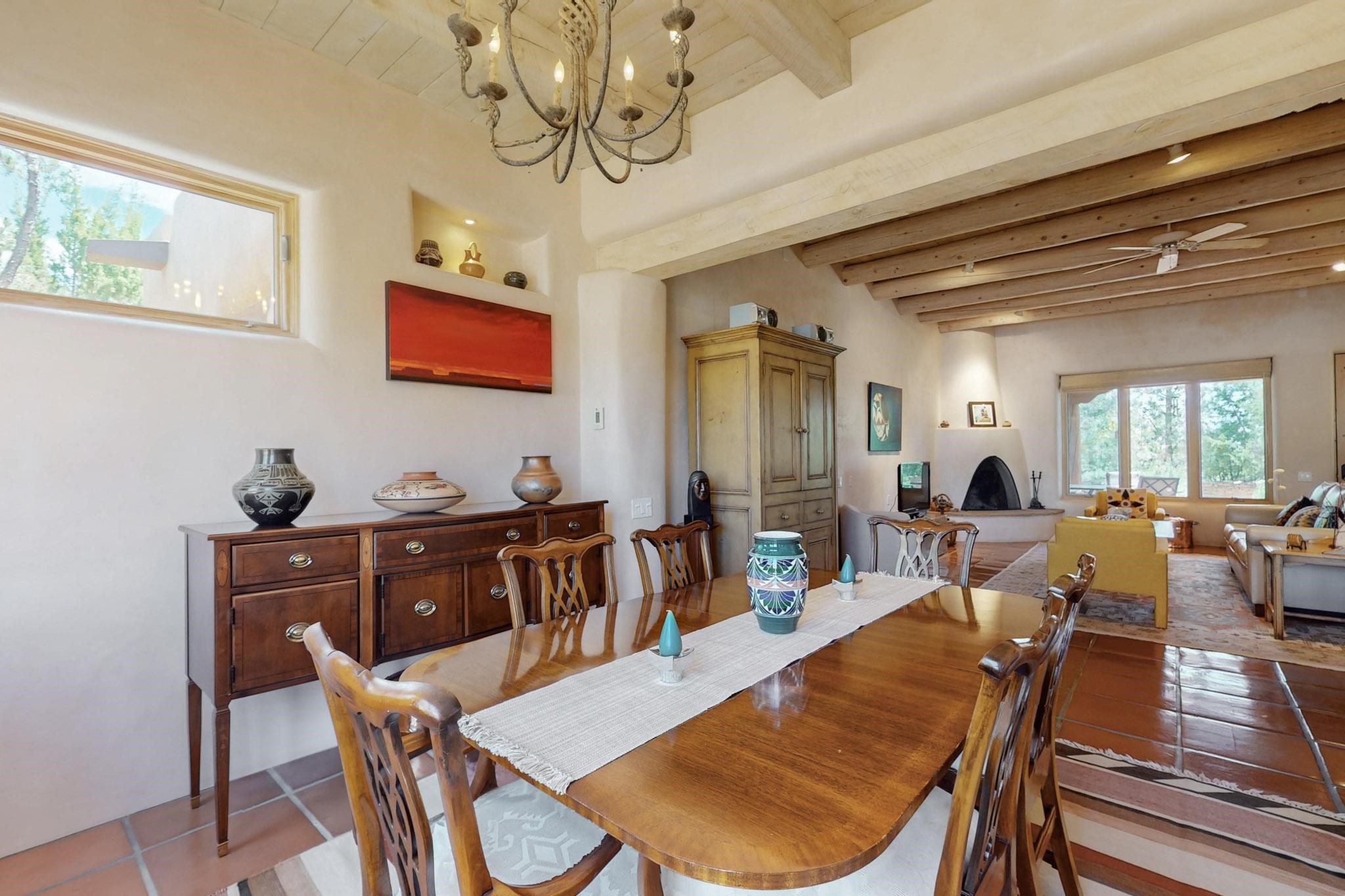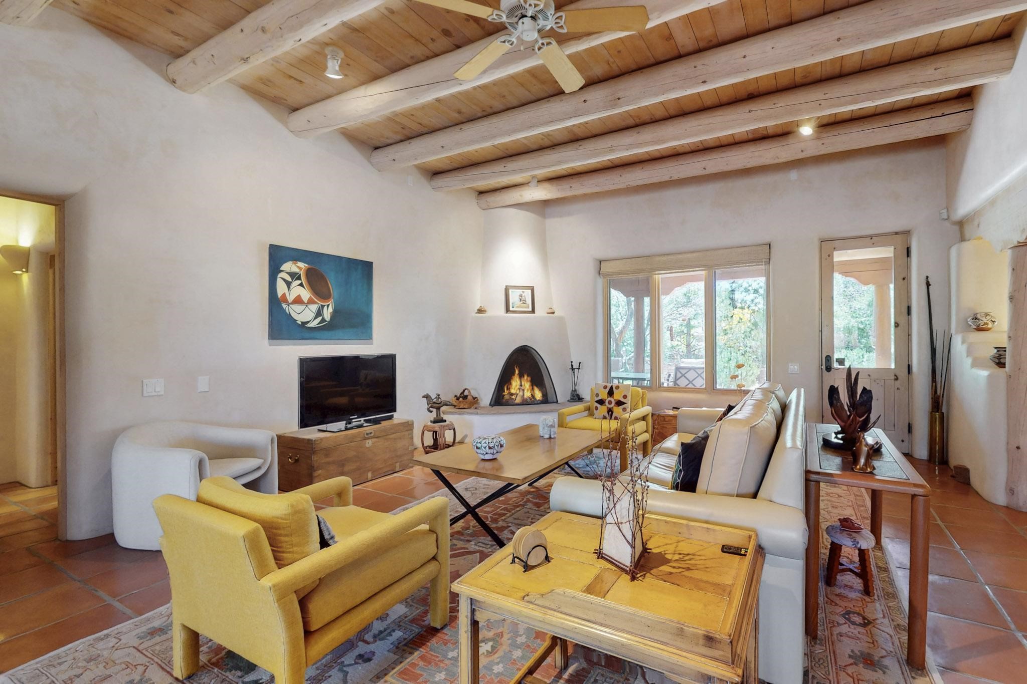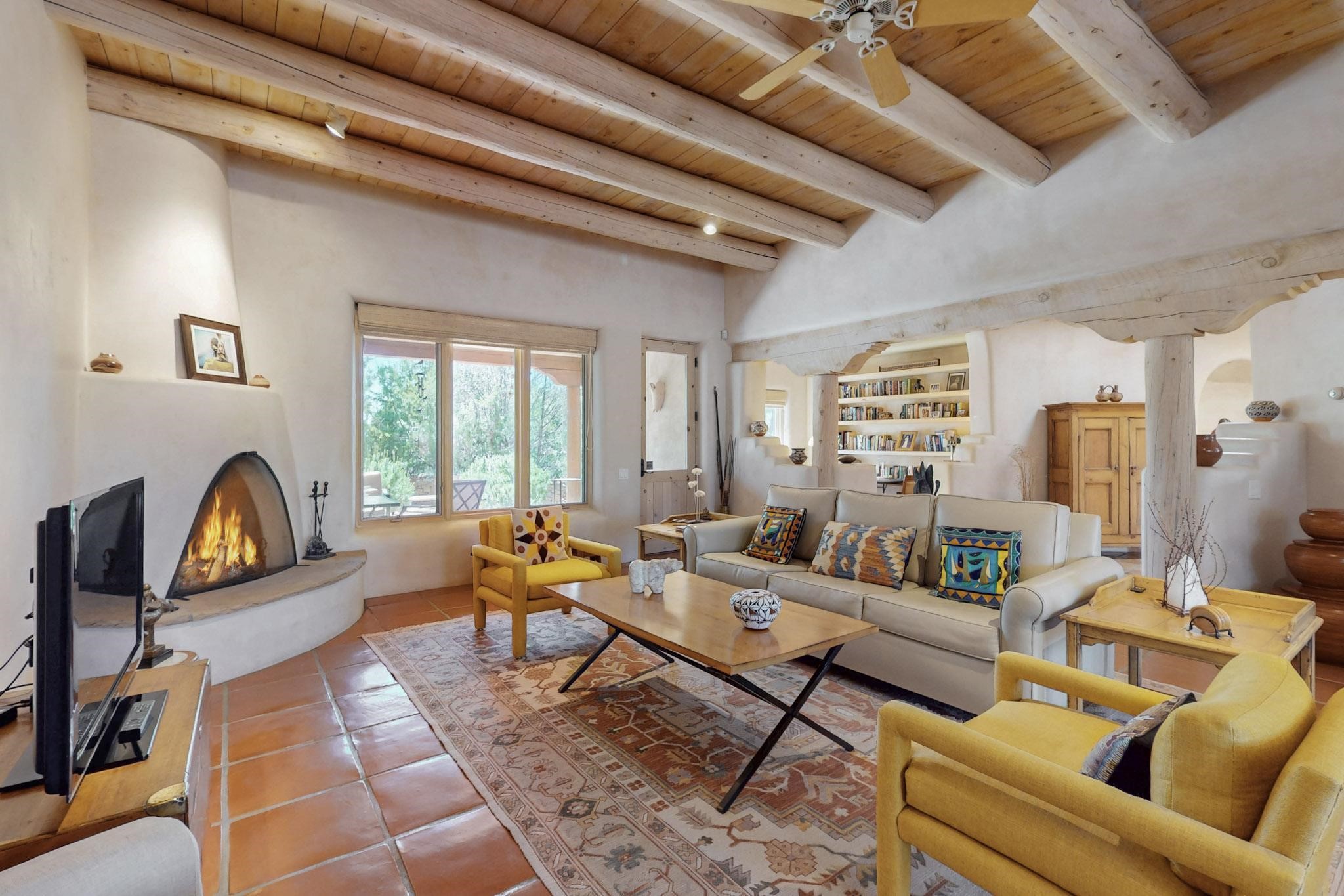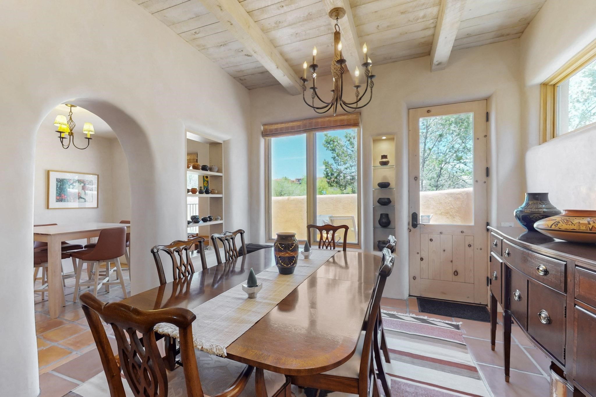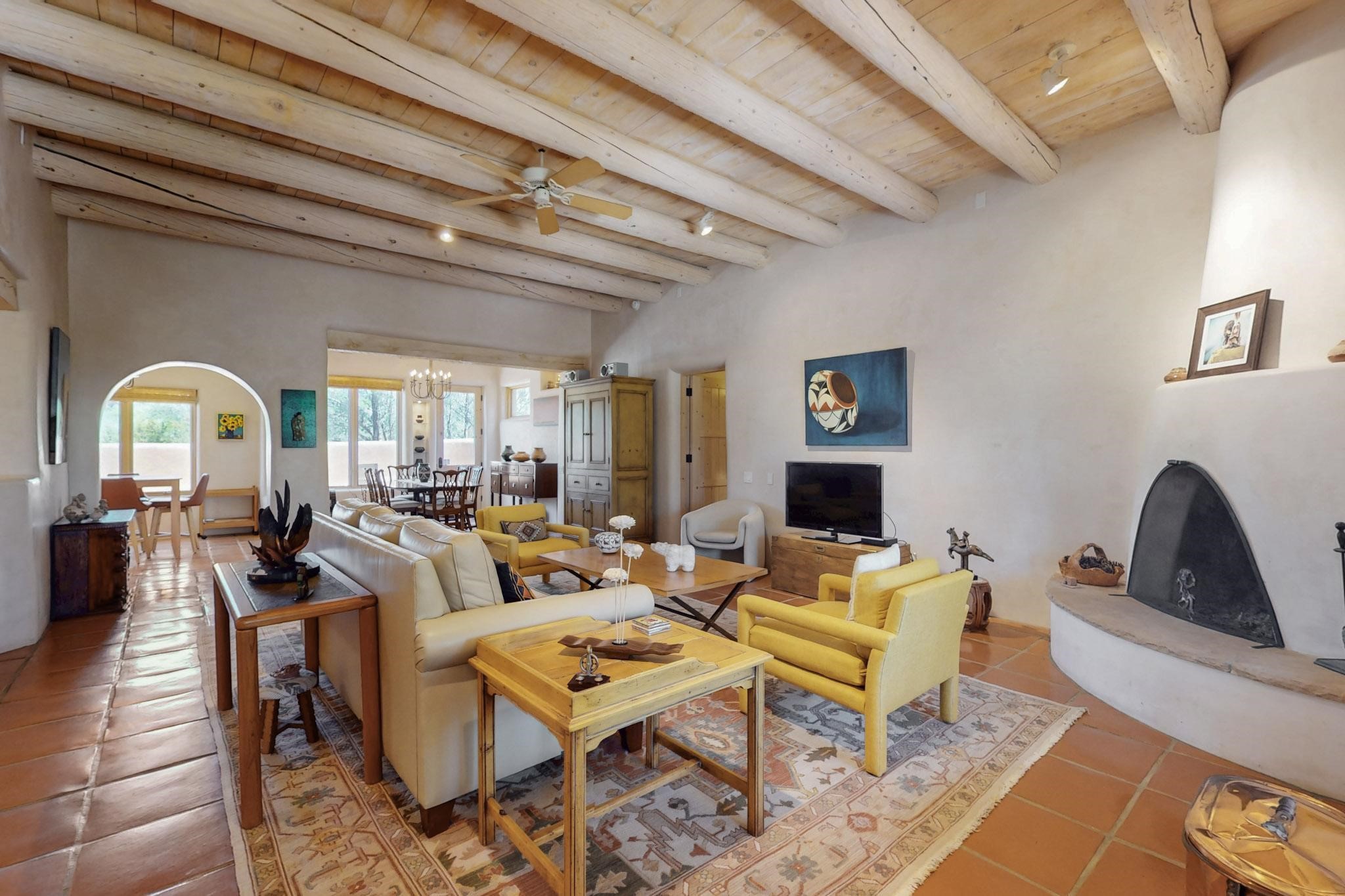 This exceptional Adobe home, a testament to the artistry of Jim Hays, offers a rare blend of exquisite design and superior construction. Upon entering, you'll immediately appreciate the distinguished details that define a Hays-built residence, including graceful curved hard plaster walls, authentic Saltillo tile flooring, thoughtfully placed nichos, hand-carved corbels, substantial beams, and the inviting warmth of traditional Kiva fireplaces.The home's comfortable single-level floor plan is thoughtfully designed for ease of living. Envision starting your day in the delightful breakfast nook, a perfect spot to savor your morning coffee while taking in the views of the majestic Sangre de Cristo Mountains. Adjacent, the separate dining room provides an elegant space for more formal gatherings. A versatile Office/Library further enhances the home's casual yet refined ambiance, offering a quiet retreat for work or relaxation. The open and welcoming layout flows seamlessly into a generously sized living room, which in turn opens onto a lovely rear portal. Here, you can unwind amidst beautiful native landscaping and enjoy the convenience of an astroturf lawn that maintains its appeal year-round. Located within the highly sought-after Estancia Primera community, residents benefit from access to fantastic amenities, including a refreshing summertime pool, tennis courts, and a comfortable clubhouse for social gatherings. The convenience of this location is truly unparalleled, with the historic Santa Fe Plaza just a short drive away, offering a wealth of cultural attractions, dining, and shopping. Additionally, the renowned 10,000 Waves Japanese Bathhouse is within easy reach for a tranquil escape. For those who enjoy the outdoors, a nearby hiking trail provides a scenic route to downtown, allowing you to immerse yourself in the natural beauty of the area. NOTE: there are seven steps leading from the garage to the main living level.
