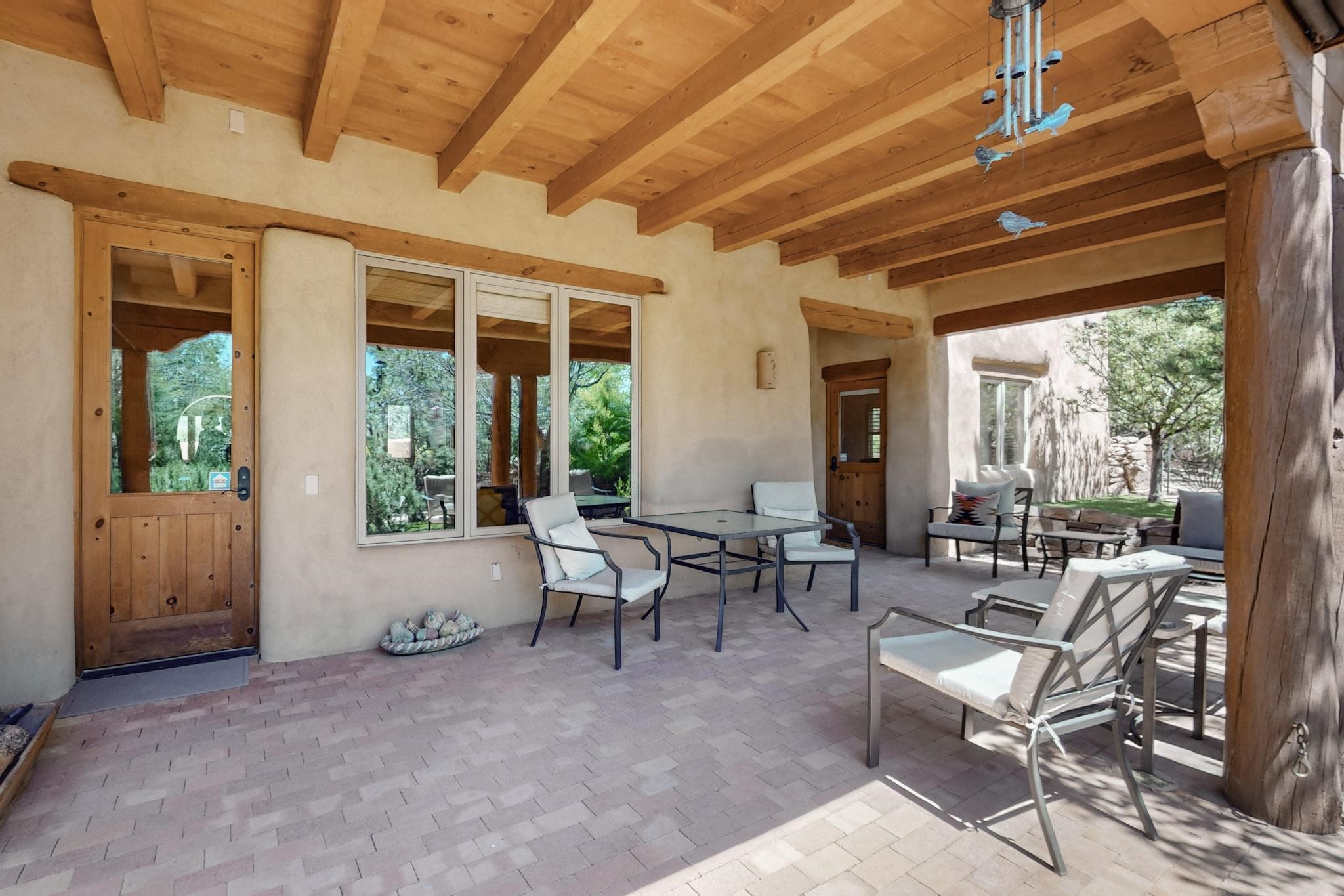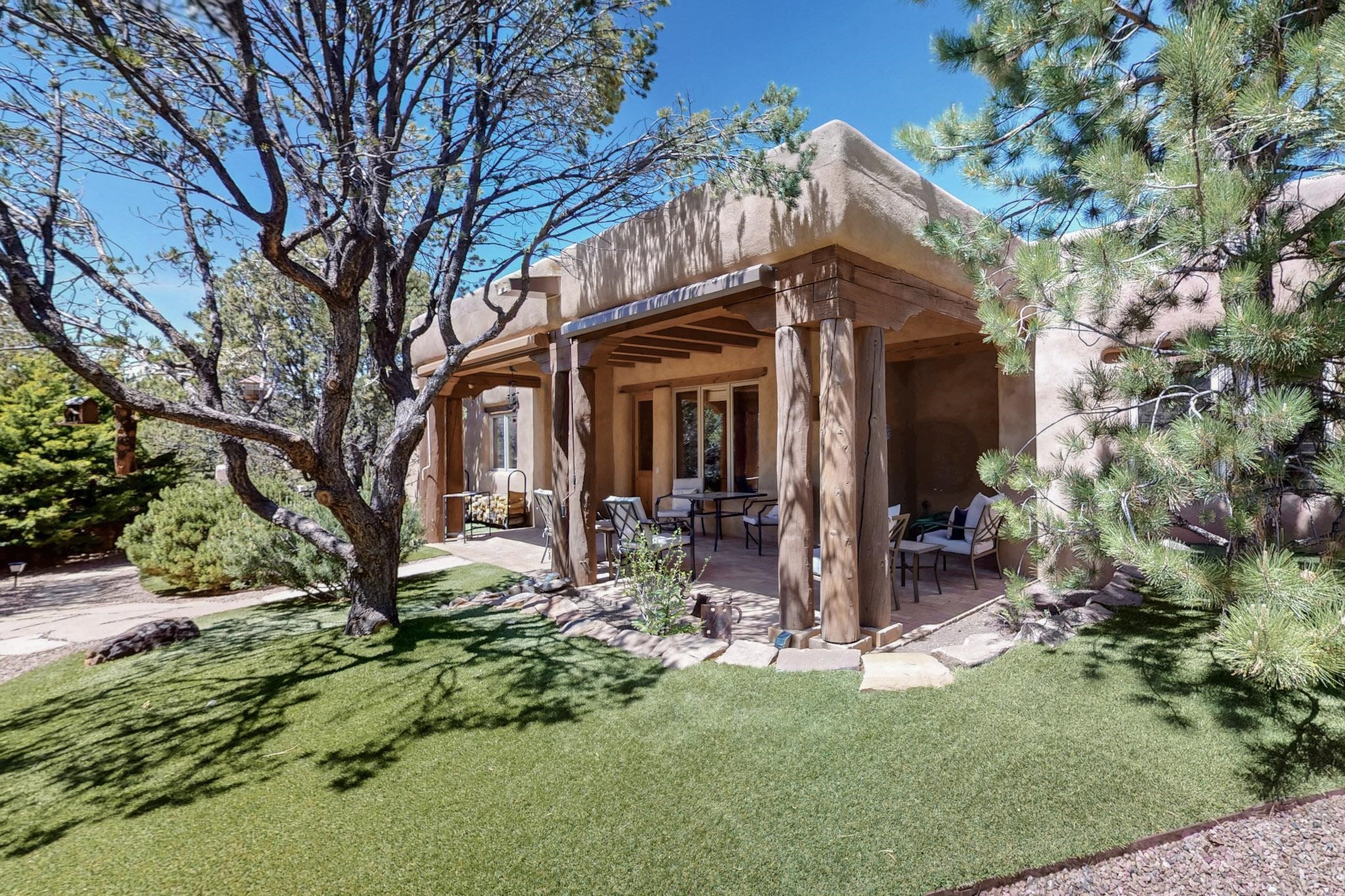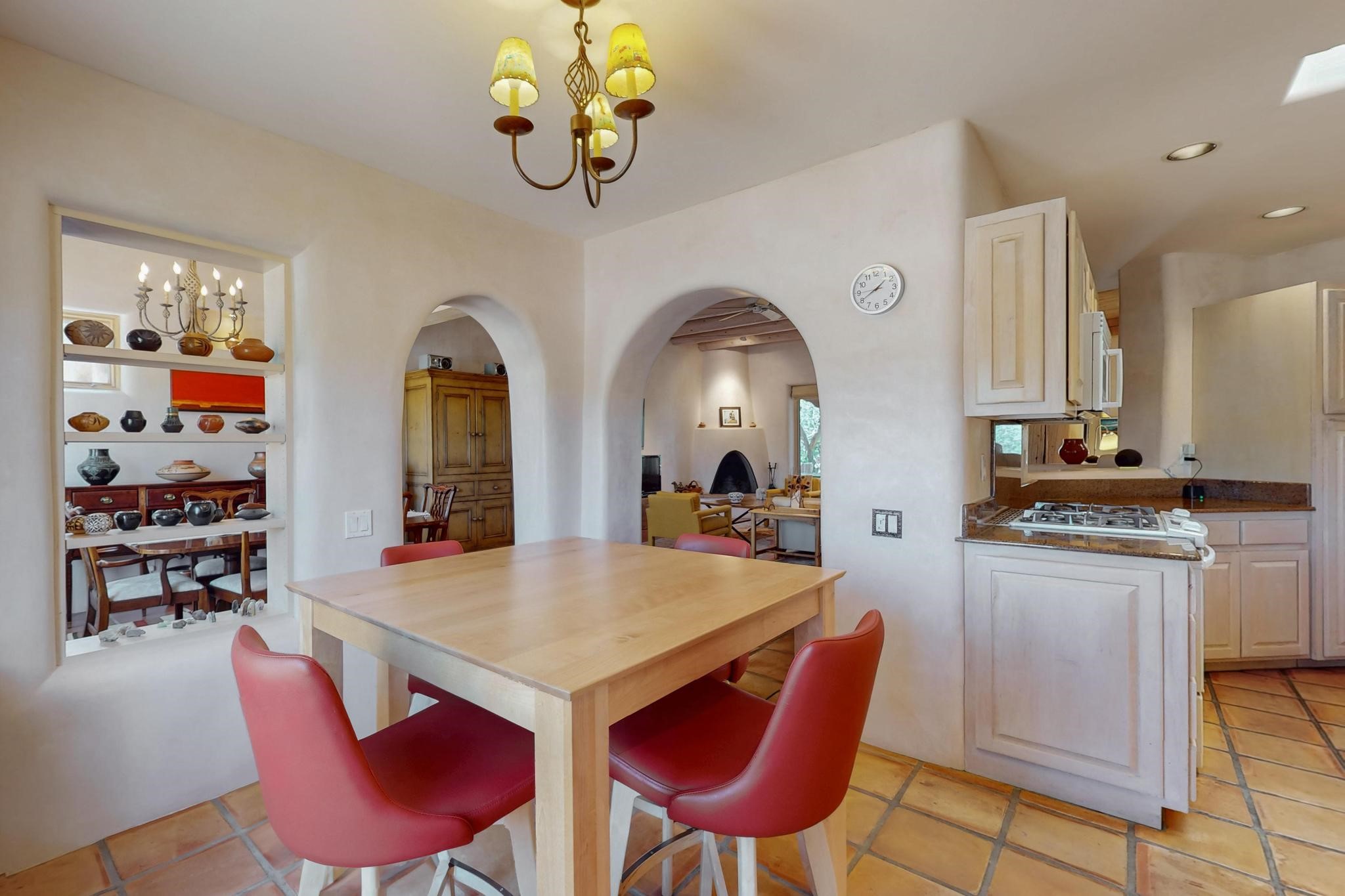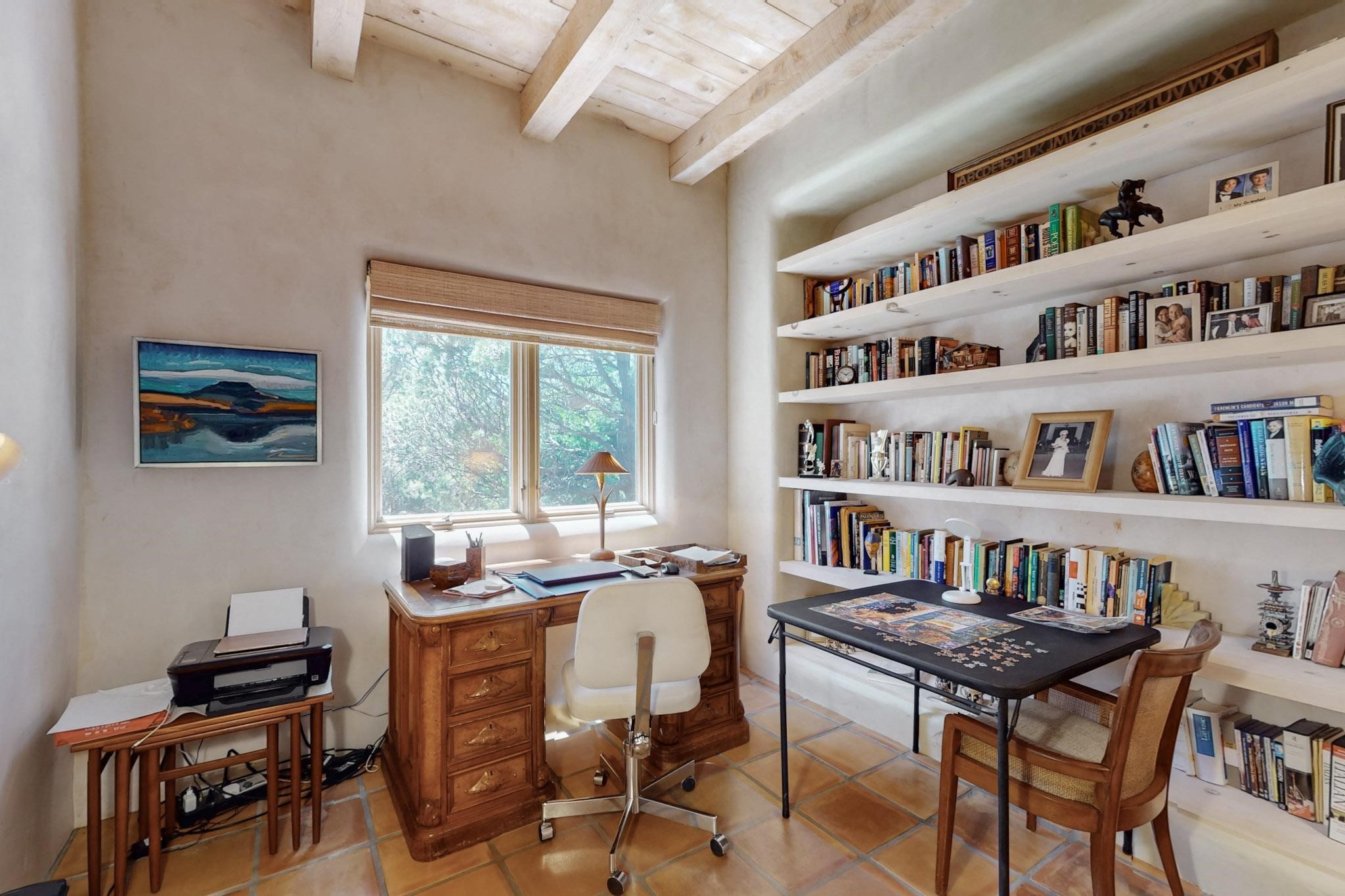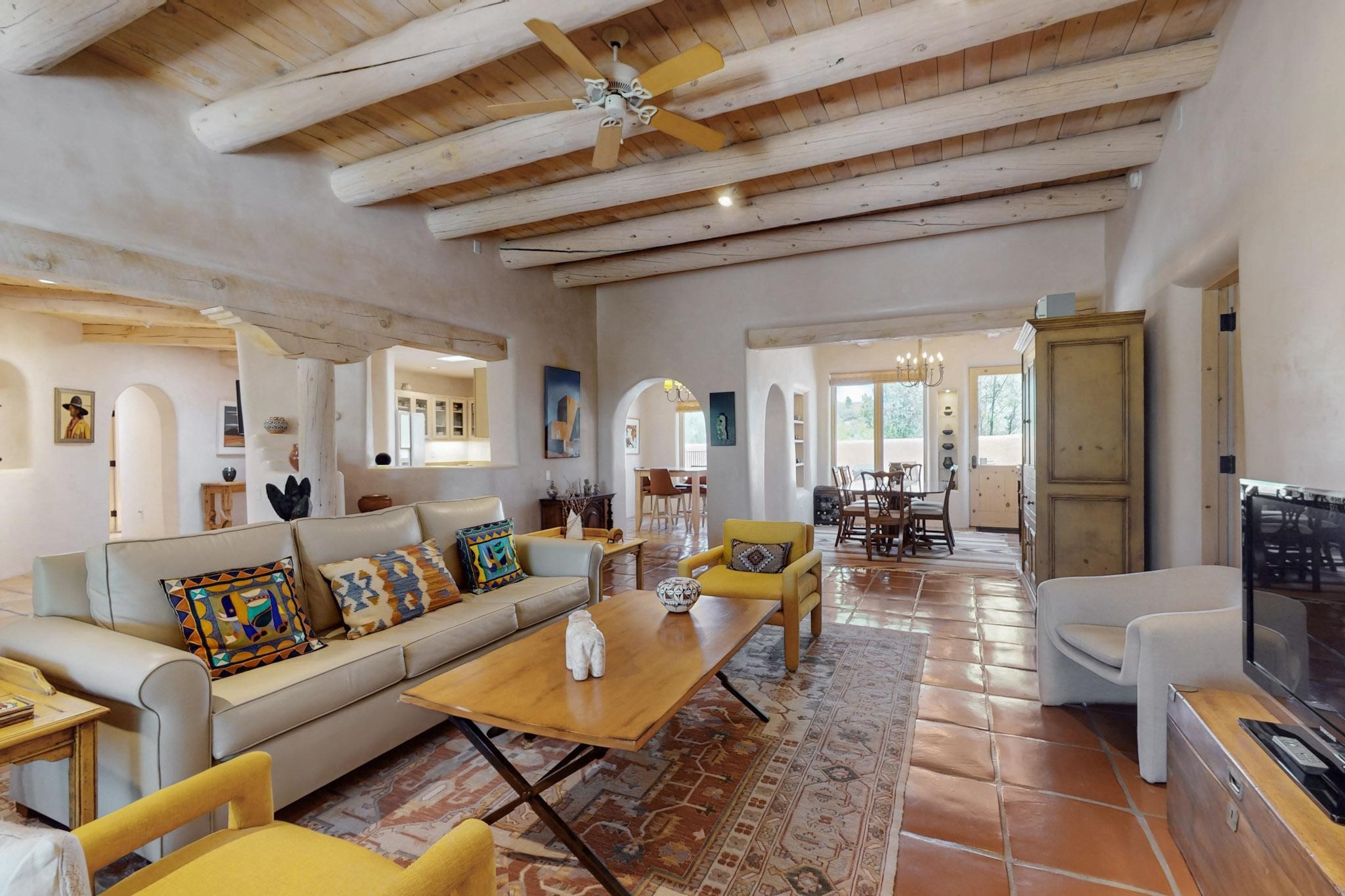 This exceptional Adobe home, a testament to the artistry of Jim Hays, offers a rare blend of exquisite design and superior construction. Upon entering, you'll immediately appreciate the distinguished details that define a Hays-built residence, including graceful curved hard plaster walls, authentic Saltillo tile flooring, thoughtfully placed nichos, hand-carved corbels, substantial beams, and the inviting warmth of traditional Kiva fireplaces.The home's comfortable single-level floor plan is thoughtfully designed for ease of living. Envision starting your day in the delightful breakfast nook, a perfect spot to savor your morning coffee while taking in the views of the majestic Sangre de Cristo Mountains. Adjacent, the separate dining room provides an elegant space for more formal gatherings. A versatile Office/Library further enhances the home's casual yet refined ambiance, offering a quiet retreat for work or relaxation. The open and welcoming layout flows seamlessly into a generously sized living room, which in turn opens onto a lovely rear portal. Here, you can unwind amidst beautiful native landscaping and enjoy the convenience of an astroturf lawn that maintains its appeal year-round. Located within the highly sought-after Estancia Primera community, residents benefit from access to fantastic amenities, including a refreshing summertime pool, tennis courts, and a comfortable clubhouse for social gatherings. The convenience of this location is truly unparalleled, with the historic Santa Fe Plaza just a short drive away, offering a wealth of cultural attractions, dining, and shopping. Additionally, the renowned 10,000 Waves Japanese Bathhouse is within easy reach for a tranquil escape. For those who enjoy the outdoors, a nearby hiking trail provides a scenic route to downtown, allowing you to immerse yourself in the natural beauty of the area. NOTE: there are seven steps leading from the garage to the main living level.