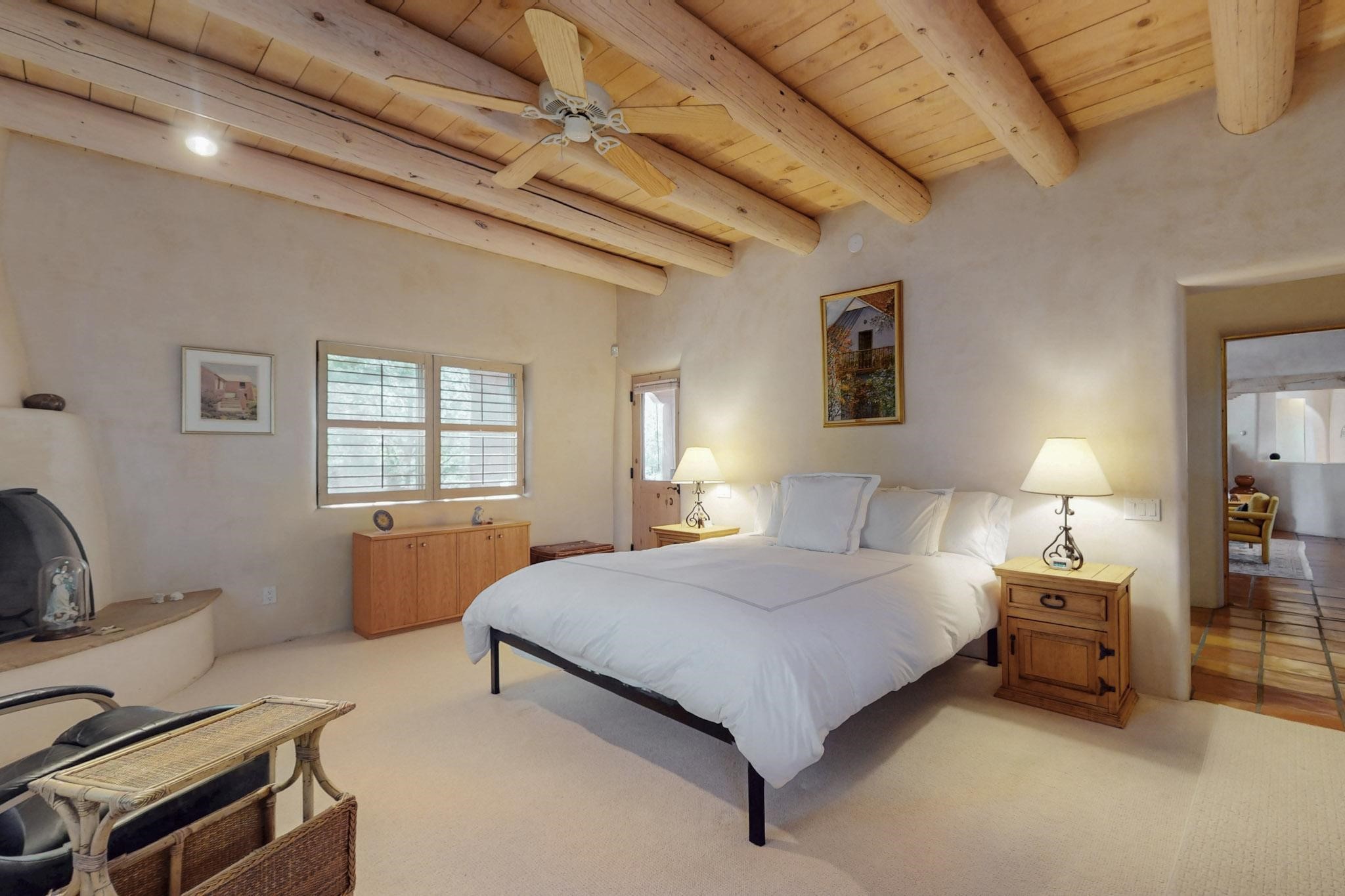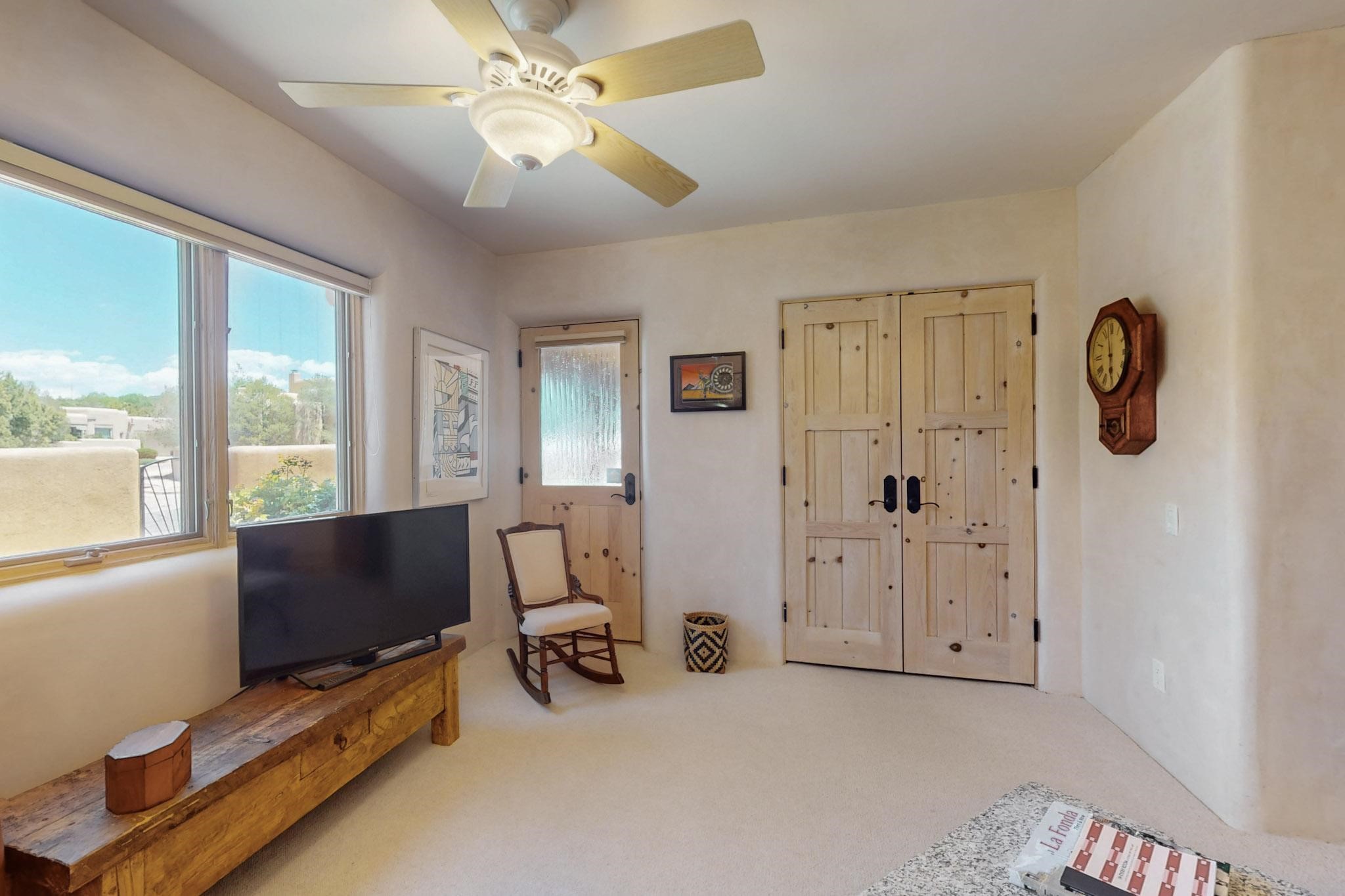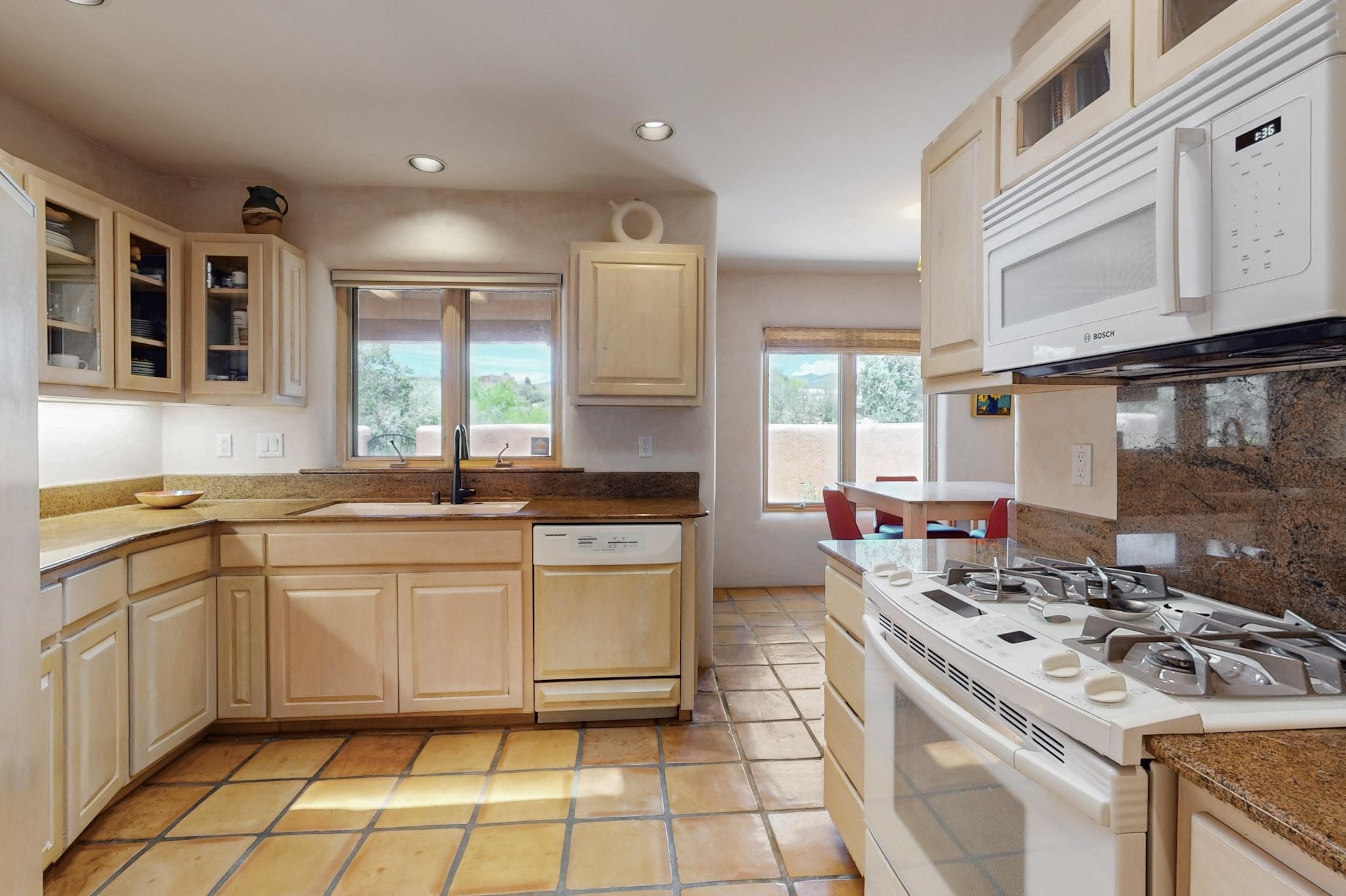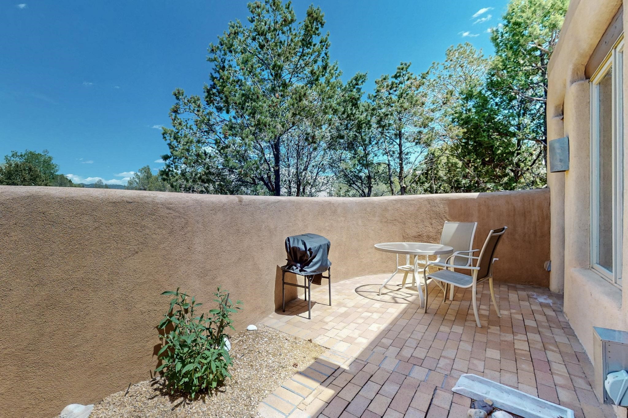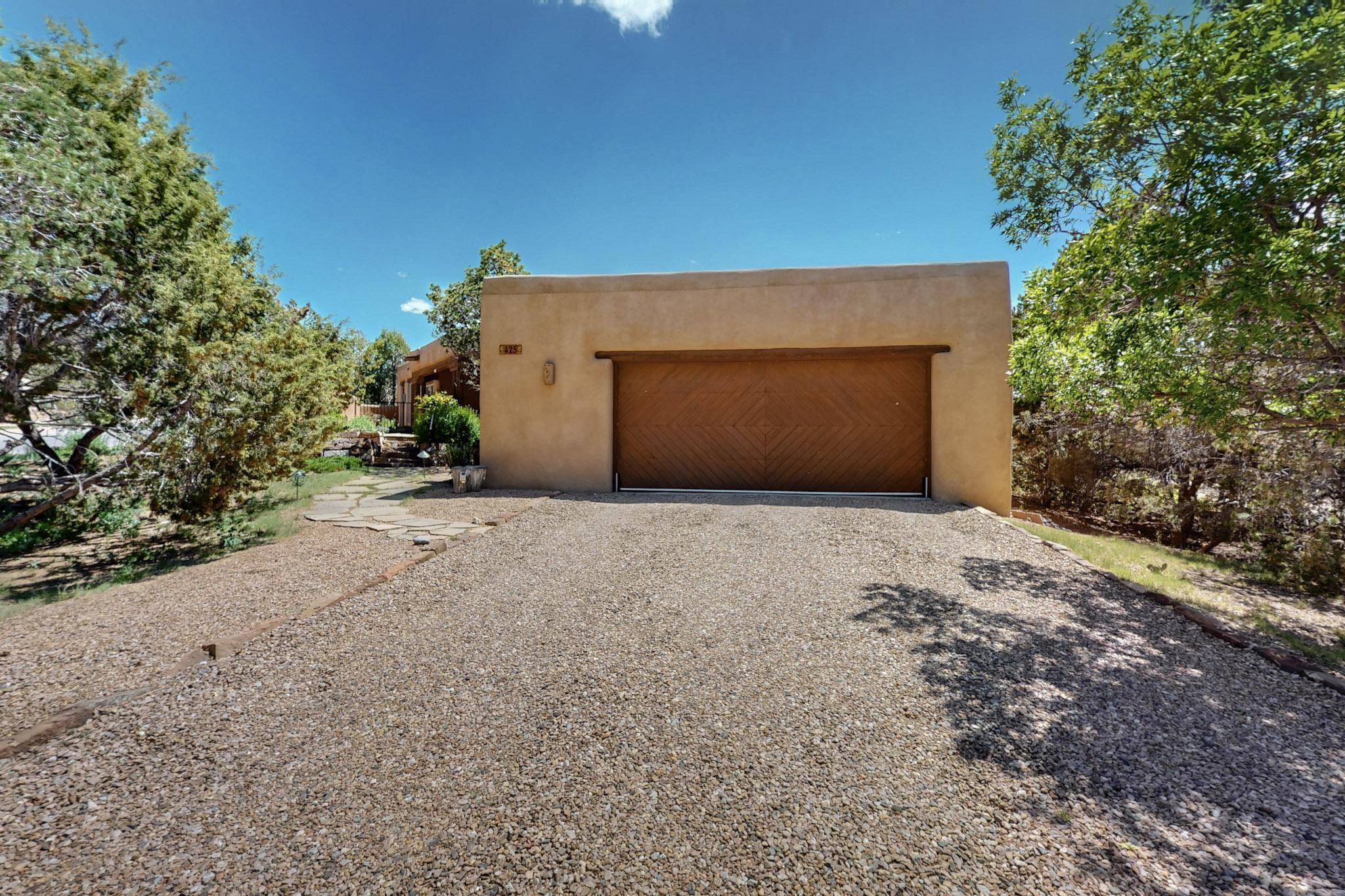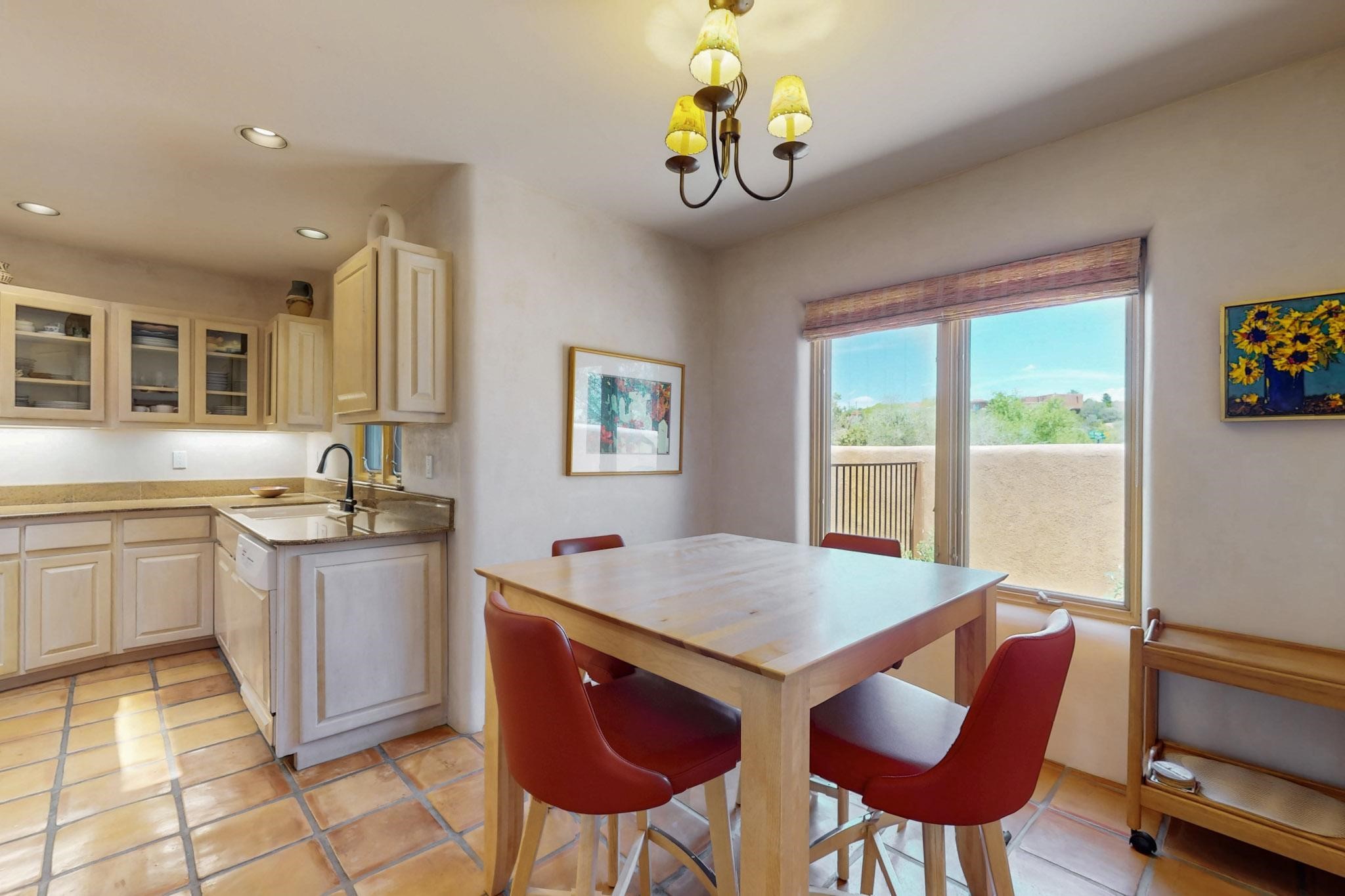 This exceptional Adobe home, a testament to the artistry of Jim Hays, offers a rare blend of exquisite design and superior construction. Upon entering, you'll immediately appreciate the distinguished details that define a Hays-built residence, including graceful curved hard plaster walls, authentic Saltillo tile flooring, thoughtfully placed nichos, hand-carved corbels, substantial beams, and the inviting warmth of traditional Kiva fireplaces.The home's comfortable single-level floor plan is thoughtfully designed for ease of living. Envision starting your day in the delightful breakfast nook, a perfect spot to savor your morning coffee while taking in the views of the majestic Sangre de Cristo Mountains. Adjacent, the separate dining room provides an elegant space for more formal gatherings. A versatile Office/Library further enhances the home's casual yet refined ambiance, offering a quiet retreat for work or relaxation. The open and welcoming layout flows seamlessly into a generously sized living room, which in turn opens onto a lovely rear portal. Here, you can unwind amidst beautiful native landscaping and enjoy the convenience of an astroturf lawn that maintains its appeal year-round. Located within the highly sought-after Estancia Primera community, residents benefit from access to fantastic amenities, including a refreshing summertime pool, tennis courts, and a comfortable clubhouse for social gatherings. The convenience of this location is truly unparalleled, with the historic Santa Fe Plaza just a short drive away, offering a wealth of cultural attractions, dining, and shopping. Additionally, the renowned 10,000 Waves Japanese Bathhouse is within easy reach for a tranquil escape. For those who enjoy the outdoors, a nearby hiking trail provides a scenic route to downtown, allowing you to immerse yourself in the natural beauty of the area. NOTE: there are seven steps leading from the garage to the main living level.