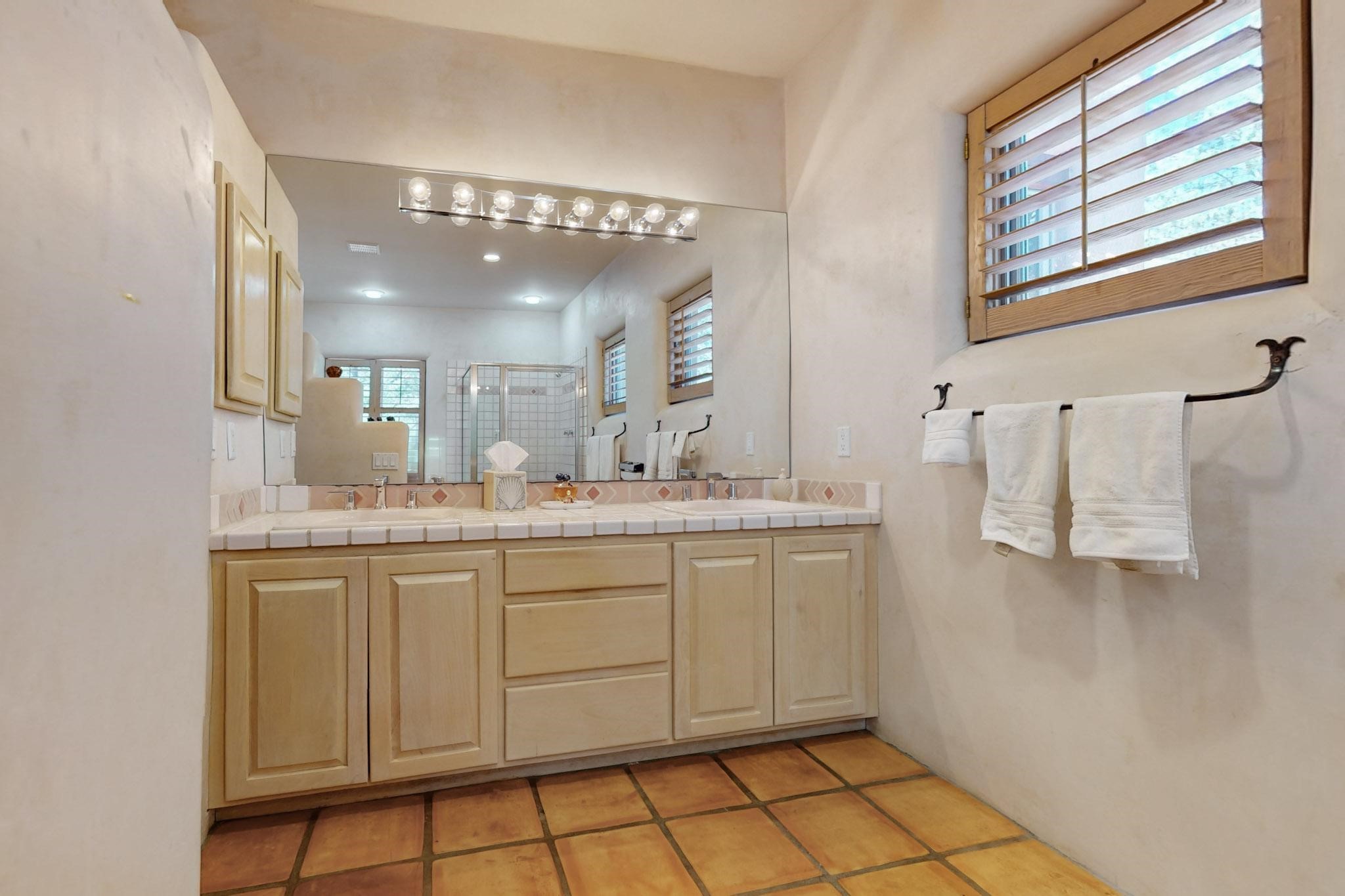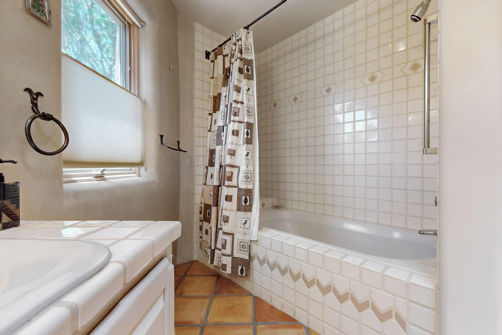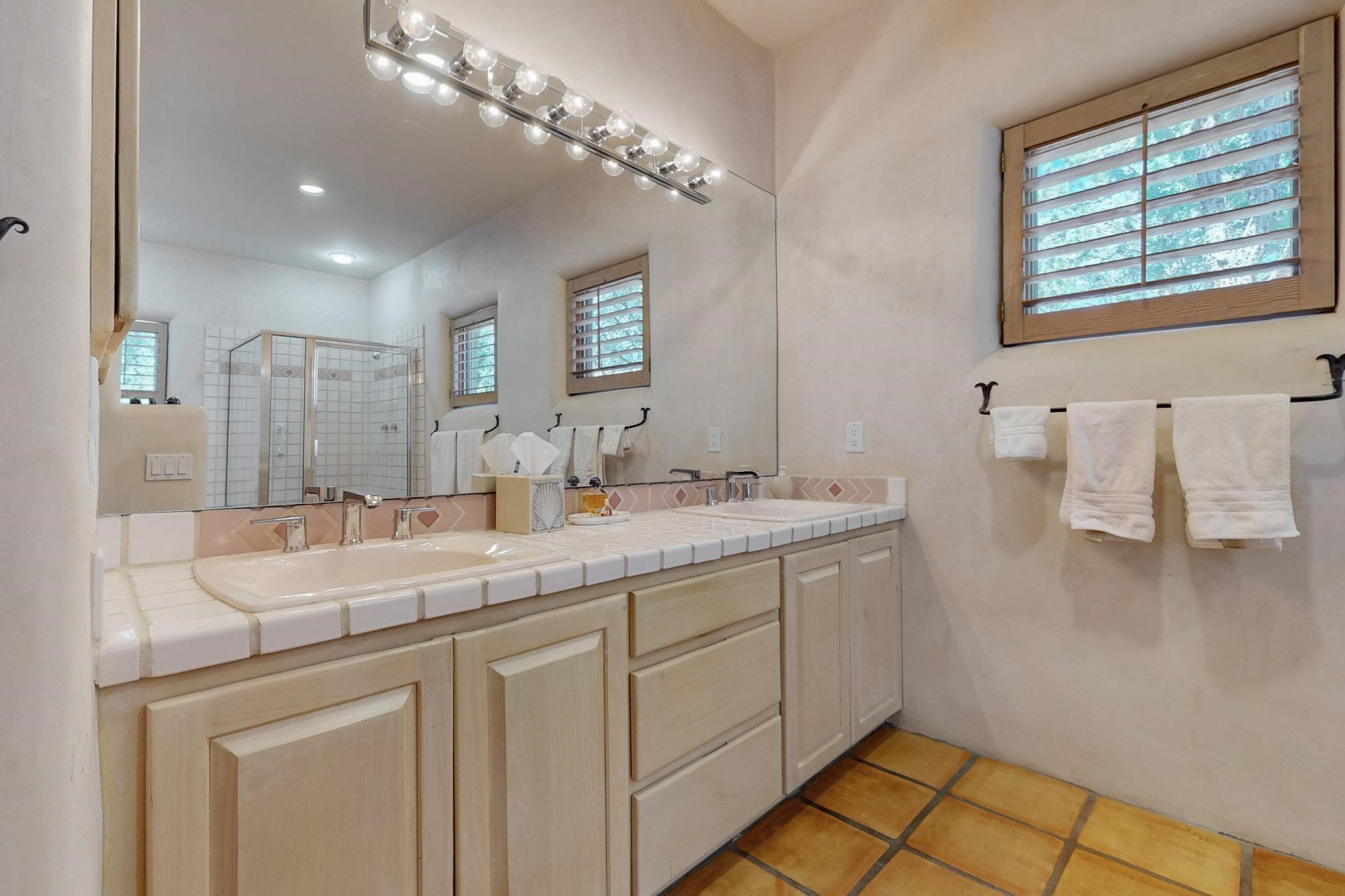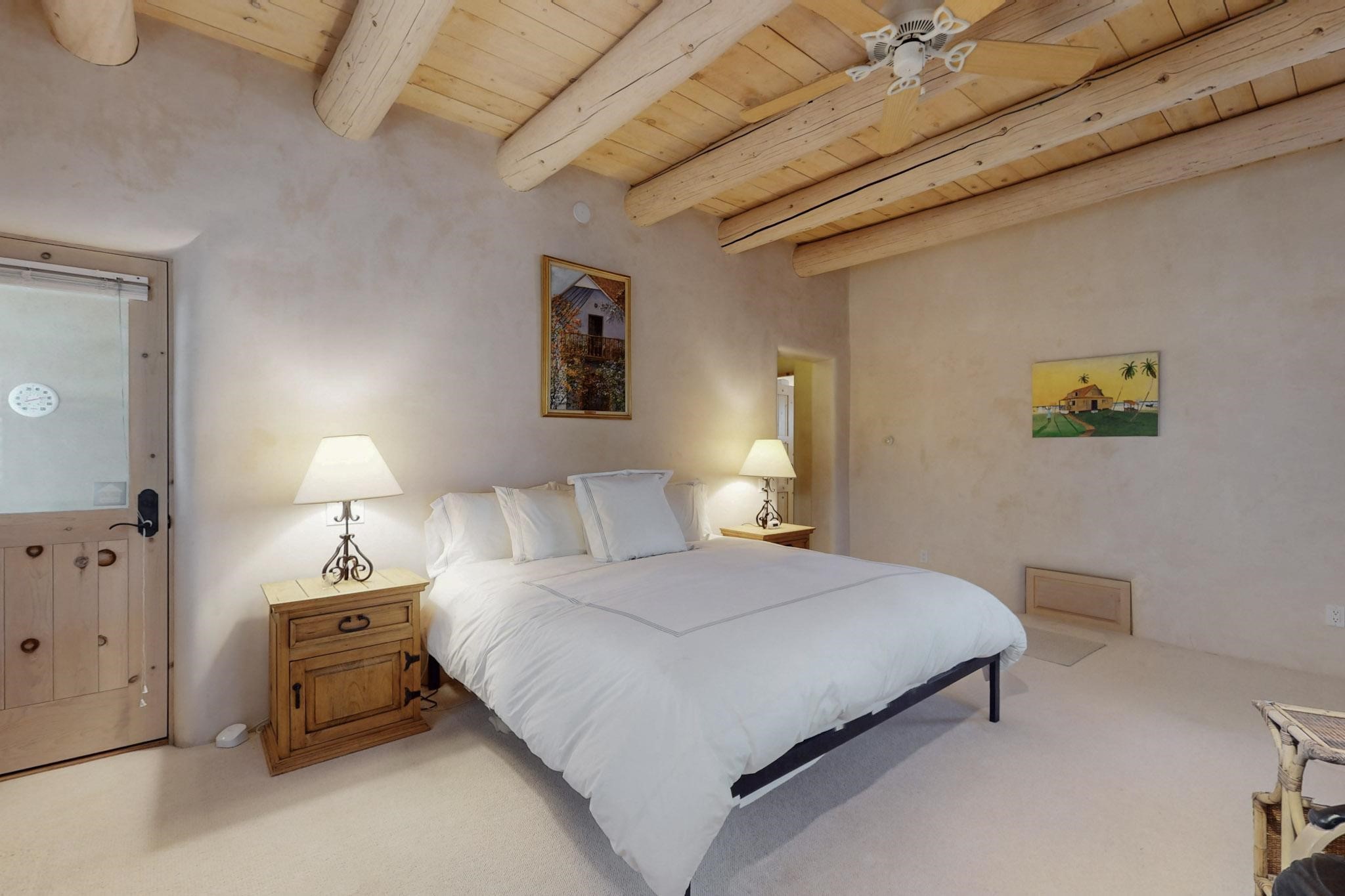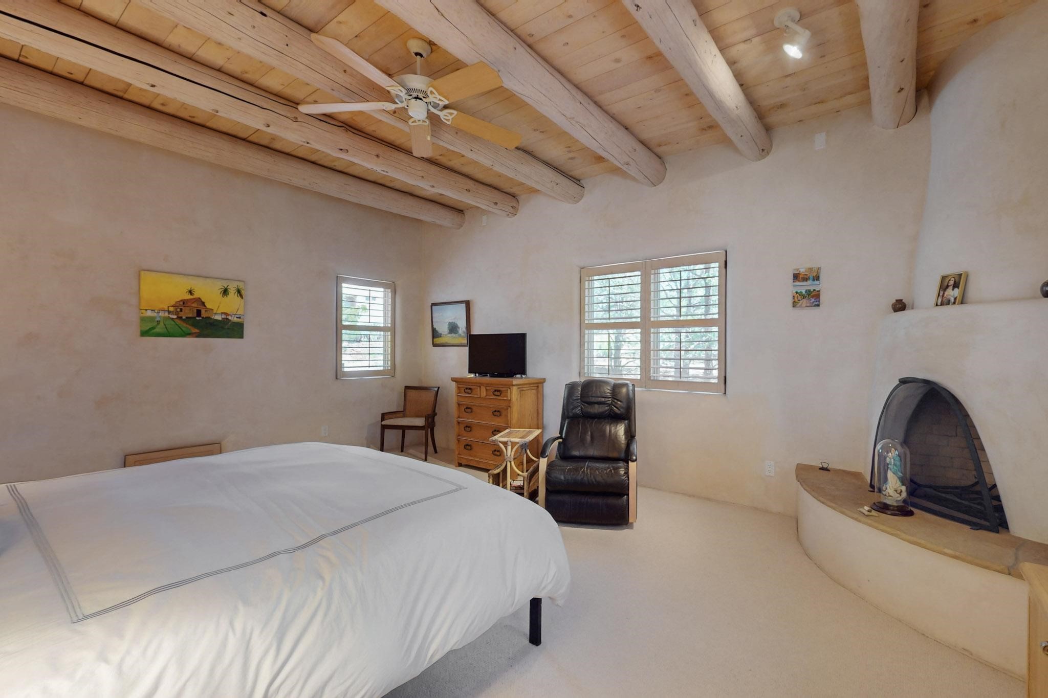 This exceptional Adobe home, a testament to the artistry of Jim Hays, offers a rare blend of exquisite design and superior construction. Upon entering, you'll immediately appreciate the distinguished details that define a Hays-built residence, including graceful curved hard plaster walls, authentic Saltillo tile flooring, thoughtfully placed nichos, hand-carved corbels, substantial beams, and the inviting warmth of traditional Kiva fireplaces.The home's comfortable single-level floor plan is thoughtfully designed for ease of living. Envision starting your day in the delightful breakfast nook, a perfect spot to savor your morning coffee while taking in the views of the majestic Sangre de Cristo Mountains. Adjacent, the separate dining room provides an elegant space for more formal gatherings. A versatile Office/Library further enhances the home's casual yet refined ambiance, offering a quiet retreat for work or relaxation. The open and welcoming layout flows seamlessly into a generously sized living room, which in turn opens onto a lovely rear portal. Here, you can unwind amidst beautiful native landscaping and enjoy the convenience of an astroturf lawn that maintains its appeal year-round. Located within the highly sought-after Estancia Primera community, residents benefit from access to fantastic amenities, including a refreshing summertime pool, tennis courts, and a comfortable clubhouse for social gatherings. The convenience of this location is truly unparalleled, with the historic Santa Fe Plaza just a short drive away, offering a wealth of cultural attractions, dining, and shopping. Additionally, the renowned 10,000 Waves Japanese Bathhouse is within easy reach for a tranquil escape. For those who enjoy the outdoors, a nearby hiking trail provides a scenic route to downtown, allowing you to immerse yourself in the natural beauty of the area. NOTE: there are seven steps leading from the garage to the main living level.