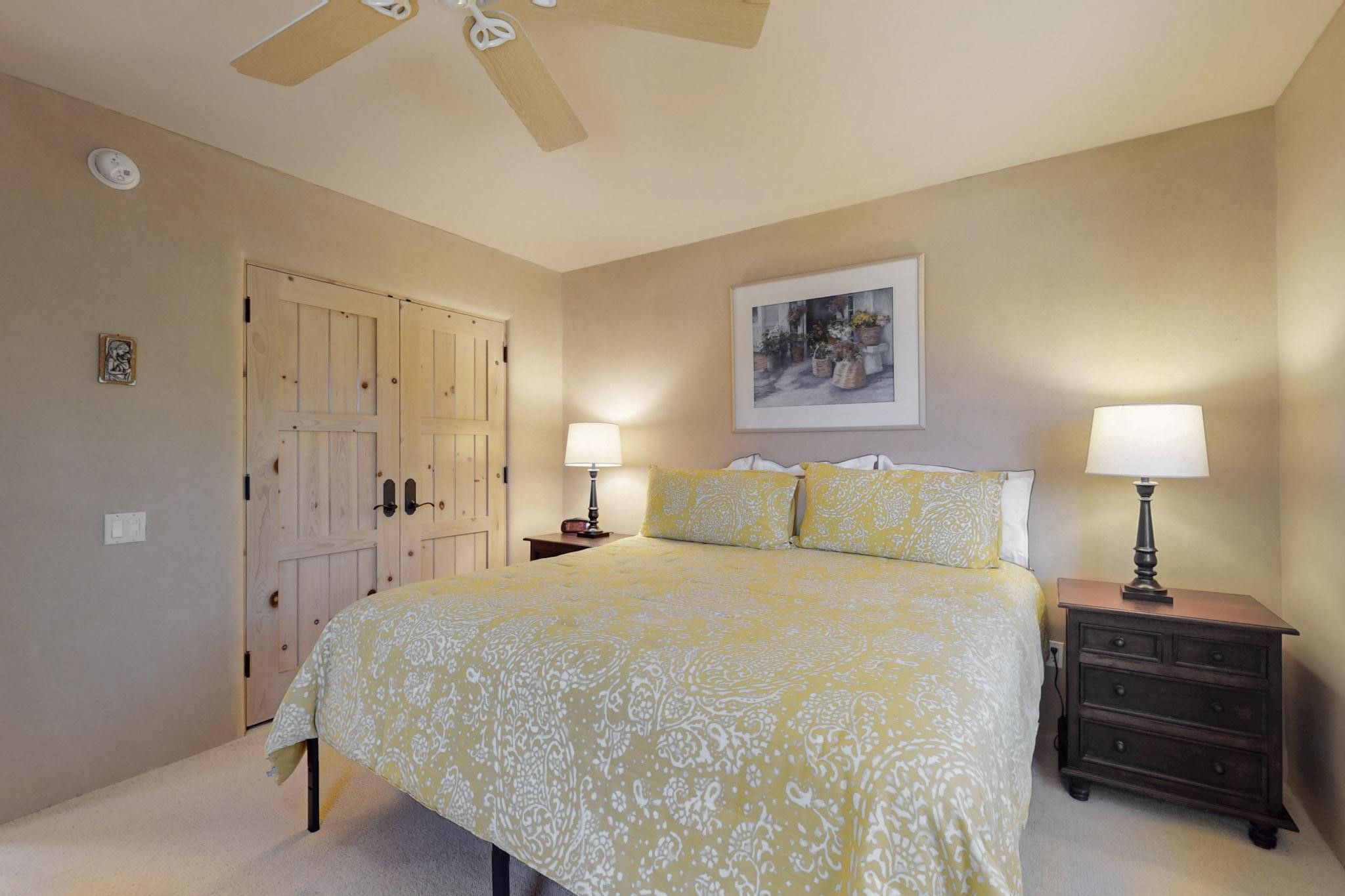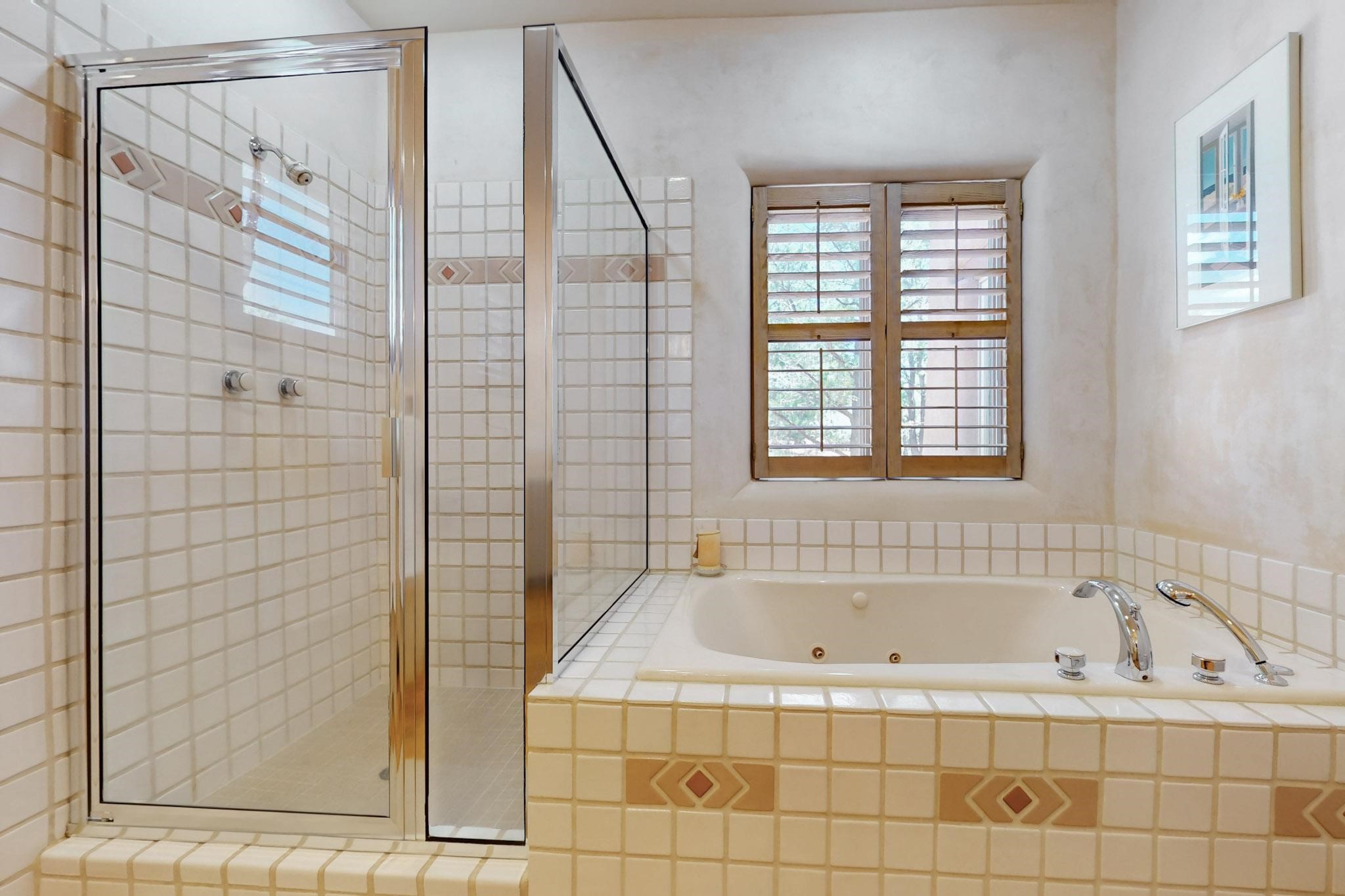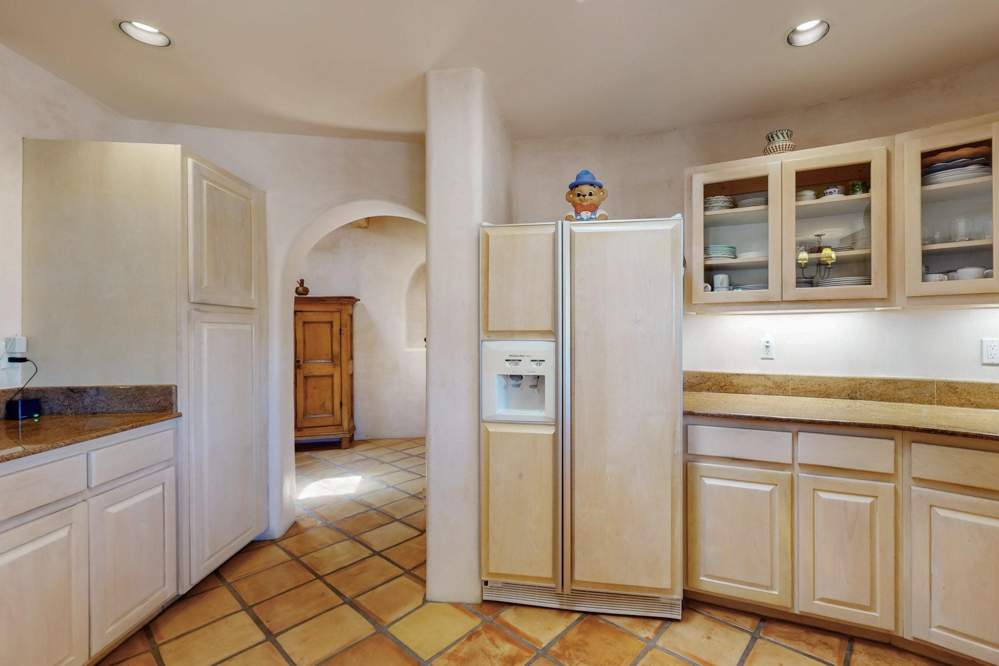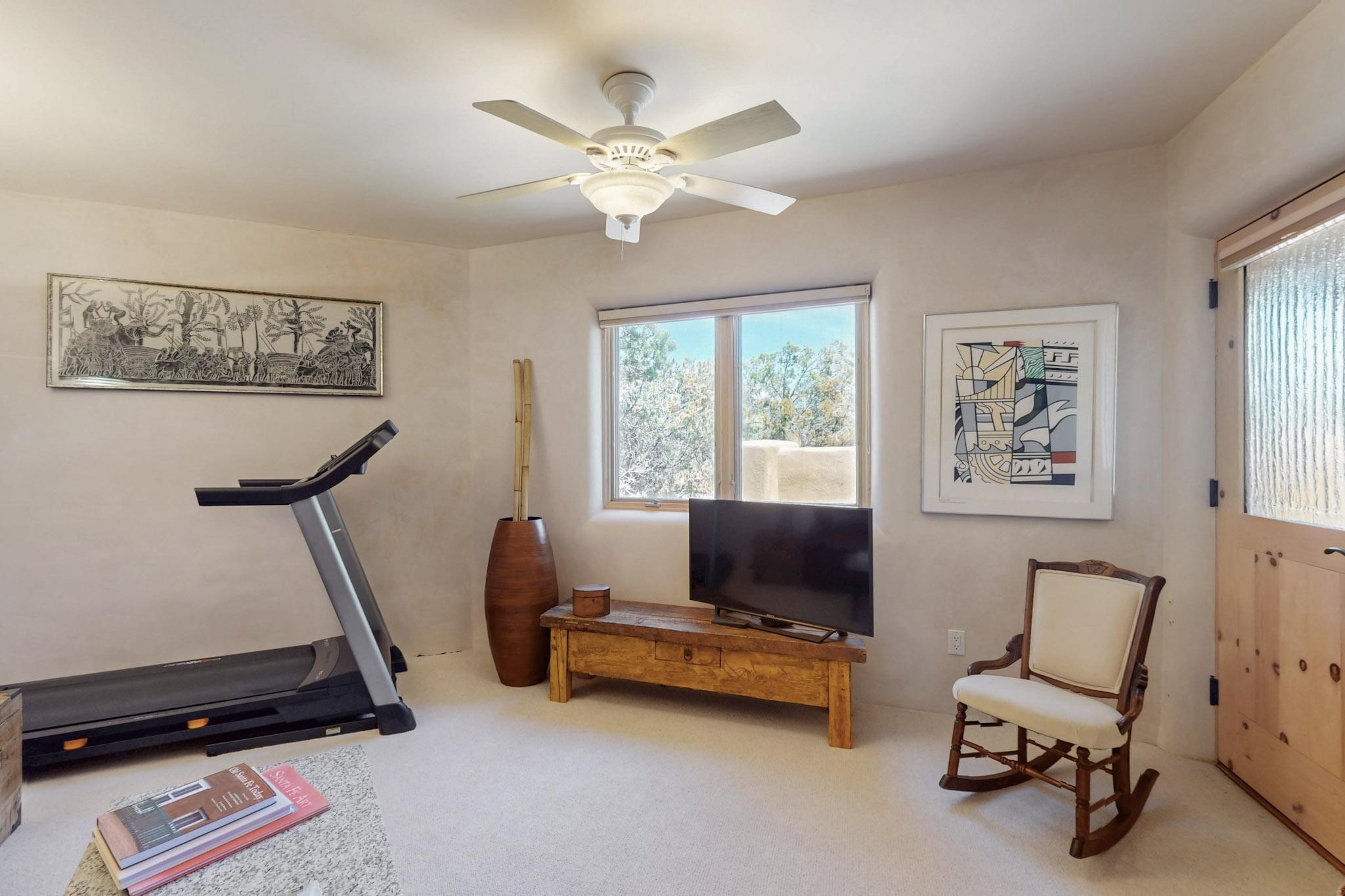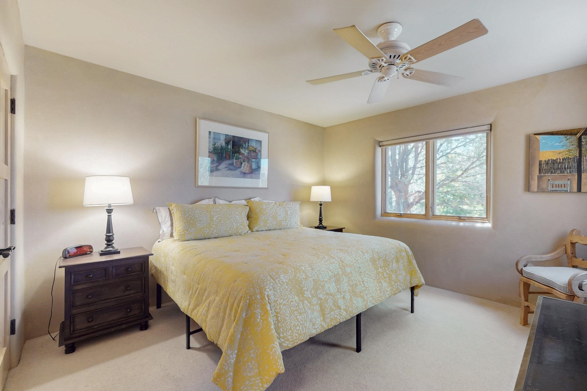 This exceptional Adobe home, a testament to the artistry of Jim Hays, offers a rare blend of exquisite design and superior construction. Upon entering, you'll immediately appreciate the distinguished details that define a Hays-built residence, including graceful curved hard plaster walls, authentic Saltillo tile flooring, thoughtfully placed nichos, hand-carved corbels, substantial beams, and the inviting warmth of traditional Kiva fireplaces.The home's comfortable single-level floor plan is thoughtfully designed for ease of living. Envision starting your day in the delightful breakfast nook, a perfect spot to savor your morning coffee while taking in the views of the majestic Sangre de Cristo Mountains. Adjacent, the separate dining room provides an elegant space for more formal gatherings. A versatile Office/Library further enhances the home's casual yet refined ambiance, offering a quiet retreat for work or relaxation. The open and welcoming layout flows seamlessly into a generously sized living room, which in turn opens onto a lovely rear portal. Here, you can unwind amidst beautiful native landscaping and enjoy the convenience of an astroturf lawn that maintains its appeal year-round. Located within the highly sought-after Estancia Primera community, residents benefit from access to fantastic amenities, including a refreshing summertime pool, tennis courts, and a comfortable clubhouse for social gatherings. The convenience of this location is truly unparalleled, with the historic Santa Fe Plaza just a short drive away, offering a wealth of cultural attractions, dining, and shopping. Additionally, the renowned 10,000 Waves Japanese Bathhouse is within easy reach for a tranquil escape. For those who enjoy the outdoors, a nearby hiking trail provides a scenic route to downtown, allowing you to immerse yourself in the natural beauty of the area. NOTE: there are seven steps leading from the garage to the main living level.