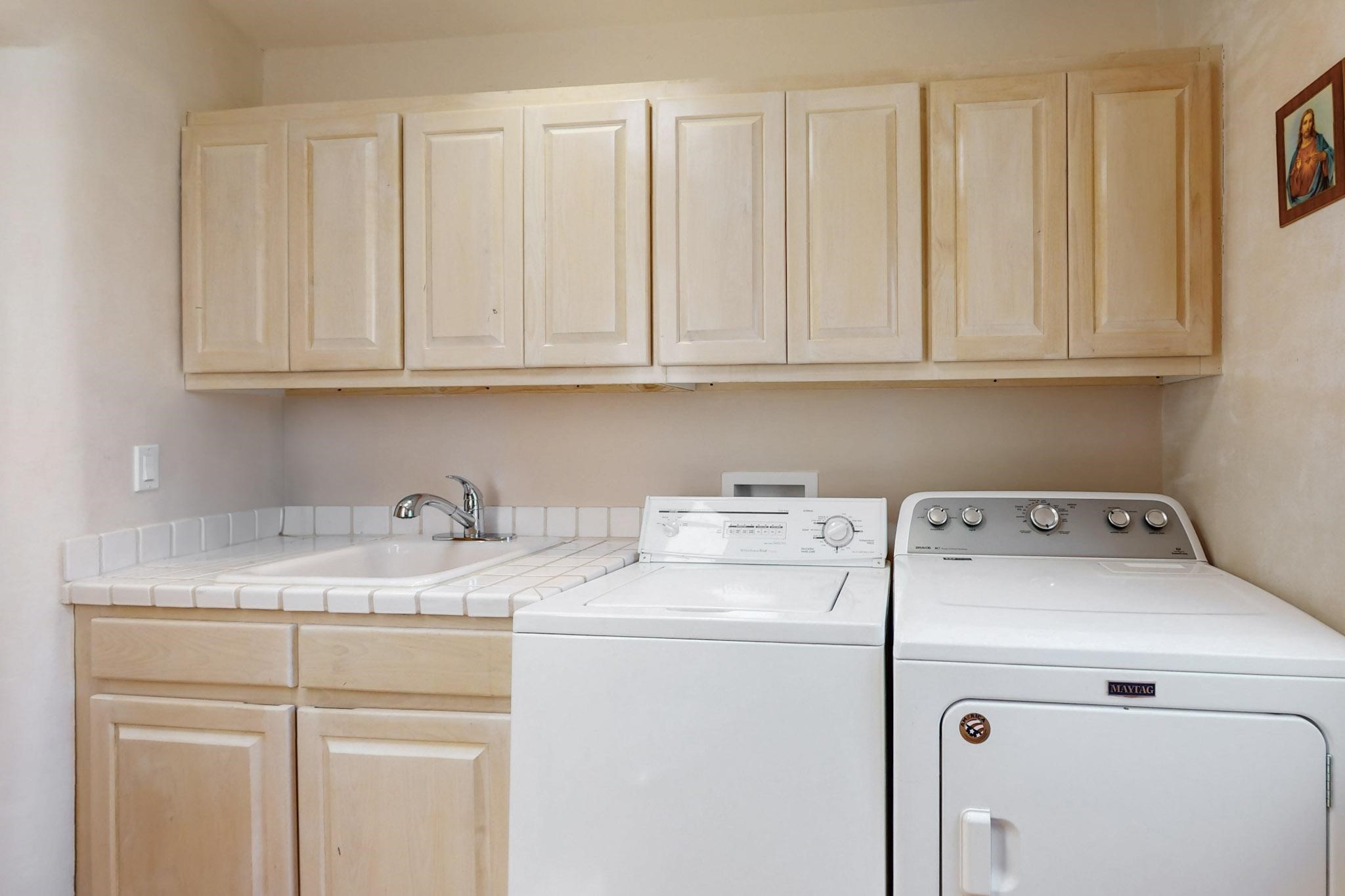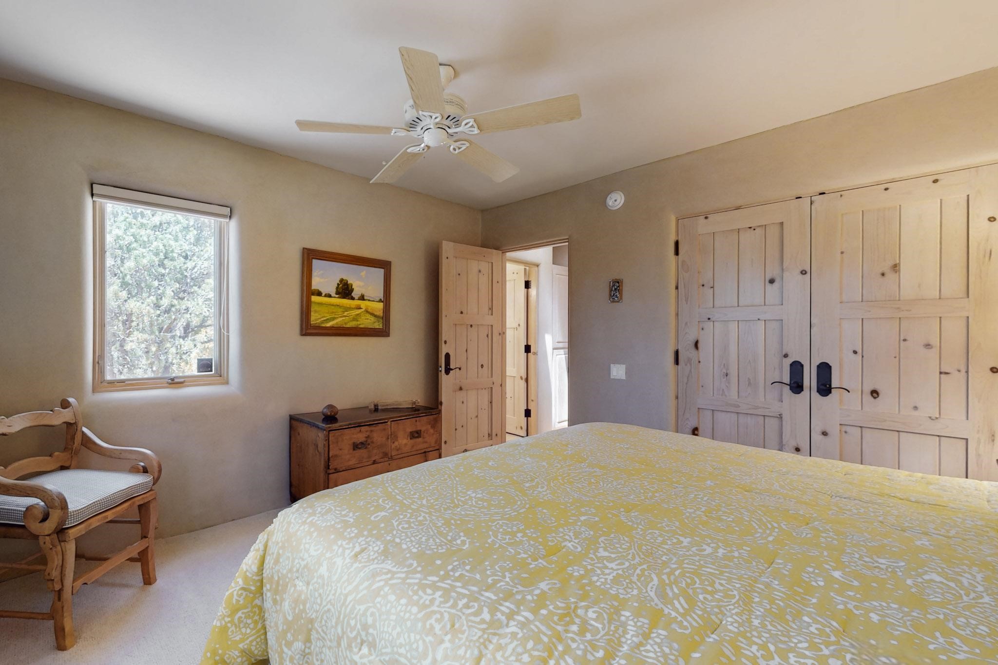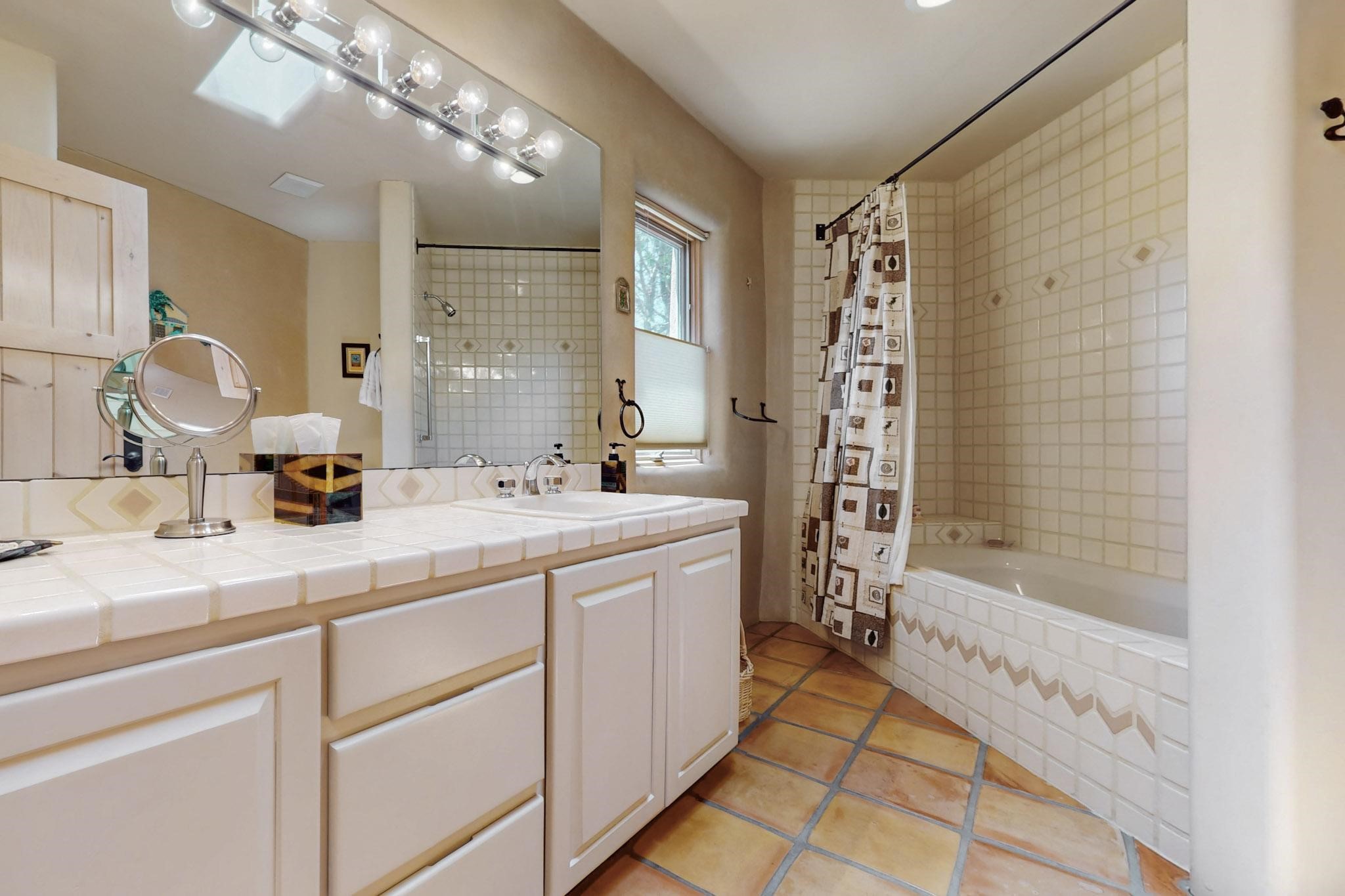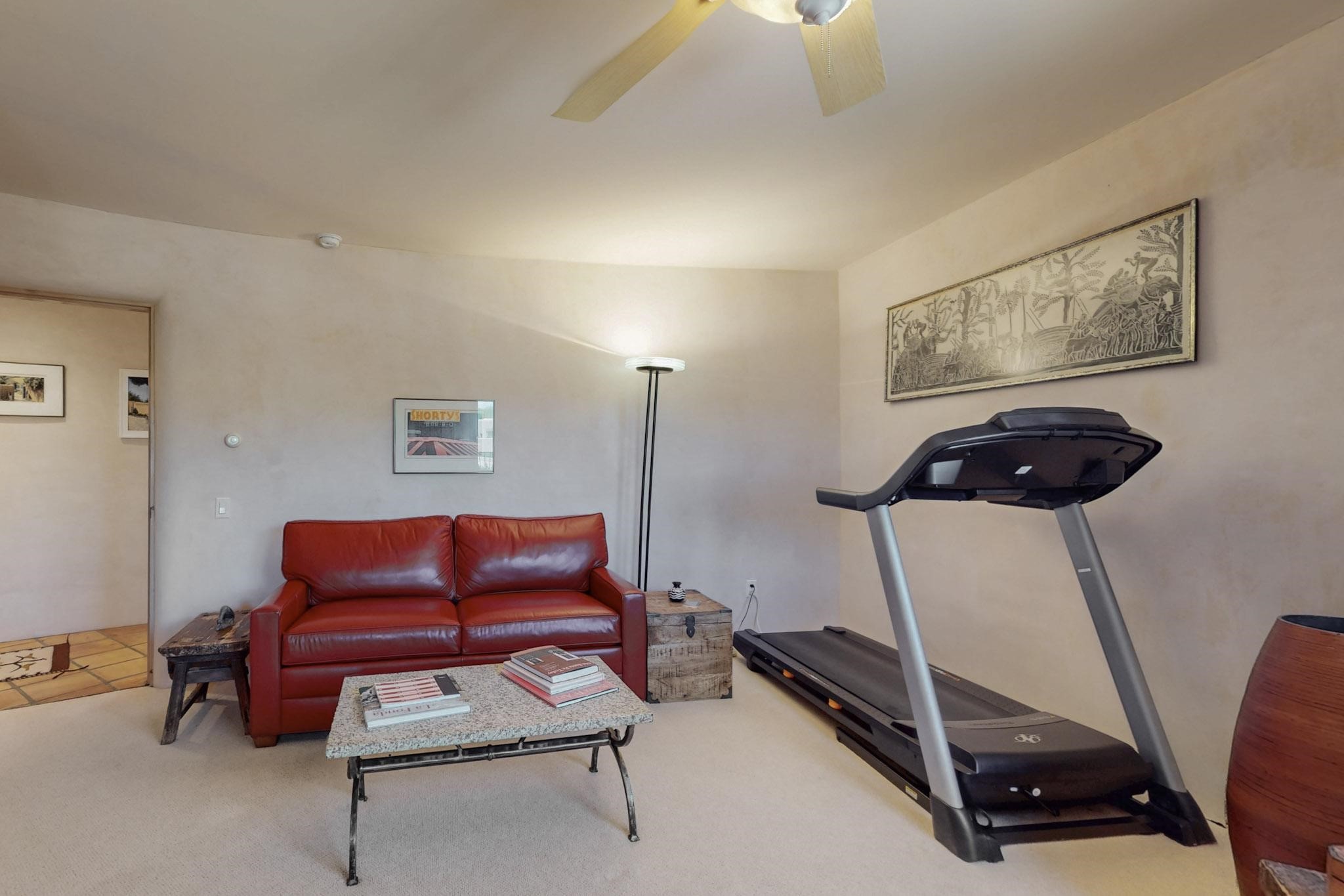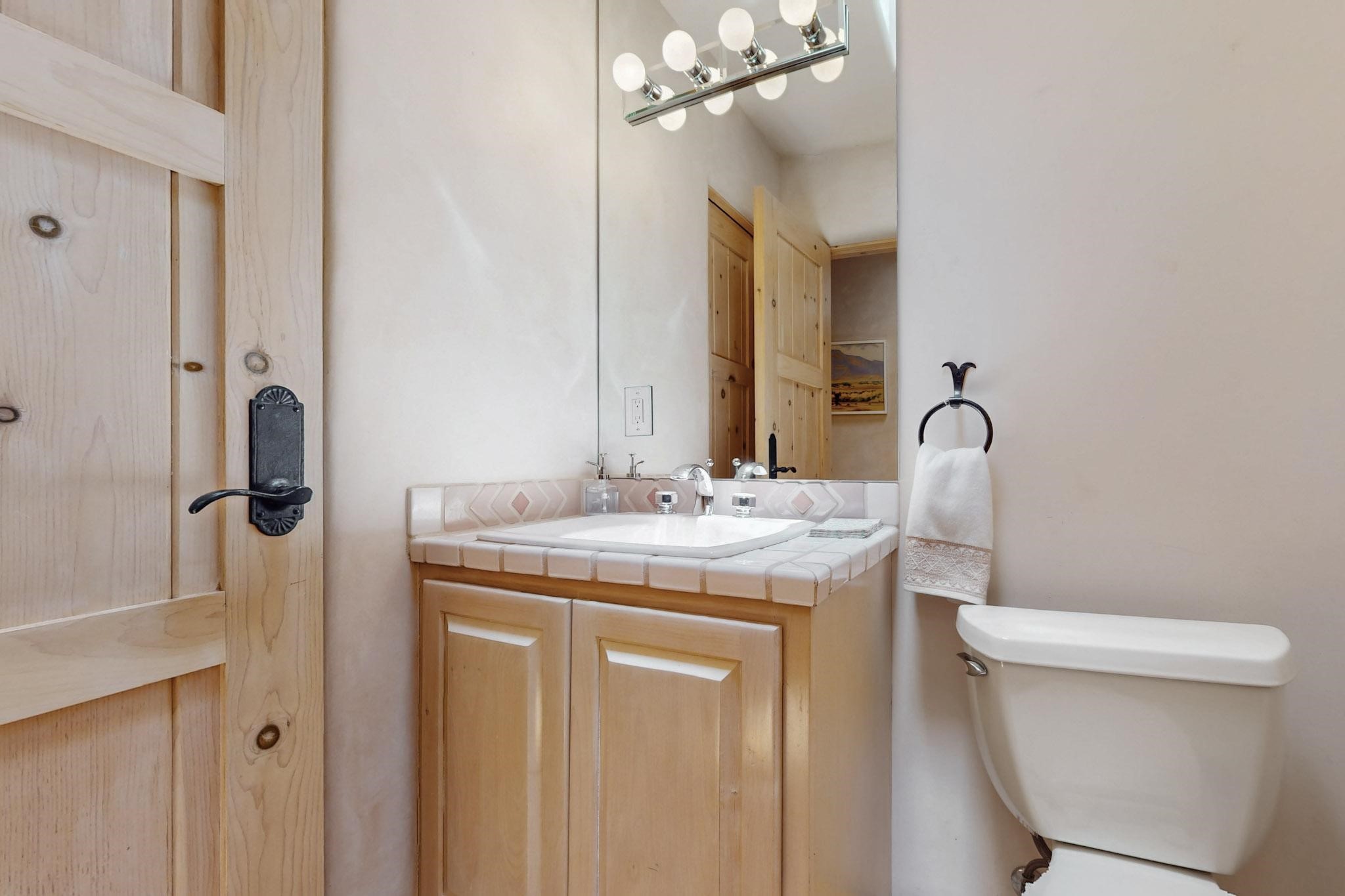 This exceptional Adobe home, a testament to the artistry of Jim Hays, offers a rare blend of exquisite design and superior construction. Upon entering, you'll immediately appreciate the distinguished details that define a Hays-built residence, including graceful curved hard plaster walls, authentic Saltillo tile flooring, thoughtfully placed nichos, hand-carved corbels, substantial beams, and the inviting warmth of traditional Kiva fireplaces.The home's comfortable single-level floor plan is thoughtfully designed for ease of living. Envision starting your day in the delightful breakfast nook, a perfect spot to savor your morning coffee while taking in the views of the majestic Sangre de Cristo Mountains. Adjacent, the separate dining room provides an elegant space for more formal gatherings. A versatile Office/Library further enhances the home's casual yet refined ambiance, offering a quiet retreat for work or relaxation. The open and welcoming layout flows seamlessly into a generously sized living room, which in turn opens onto a lovely rear portal. Here, you can unwind amidst beautiful native landscaping and enjoy the convenience of an astroturf lawn that maintains its appeal year-round. Located within the highly sought-after Estancia Primera community, residents benefit from access to fantastic amenities, including a refreshing summertime pool, tennis courts, and a comfortable clubhouse for social gatherings. The convenience of this location is truly unparalleled, with the historic Santa Fe Plaza just a short drive away, offering a wealth of cultural attractions, dining, and shopping. Additionally, the renowned 10,000 Waves Japanese Bathhouse is within easy reach for a tranquil escape. For those who enjoy the outdoors, a nearby hiking trail provides a scenic route to downtown, allowing you to immerse yourself in the natural beauty of the area. NOTE: there are seven steps leading from the garage to the main living level.